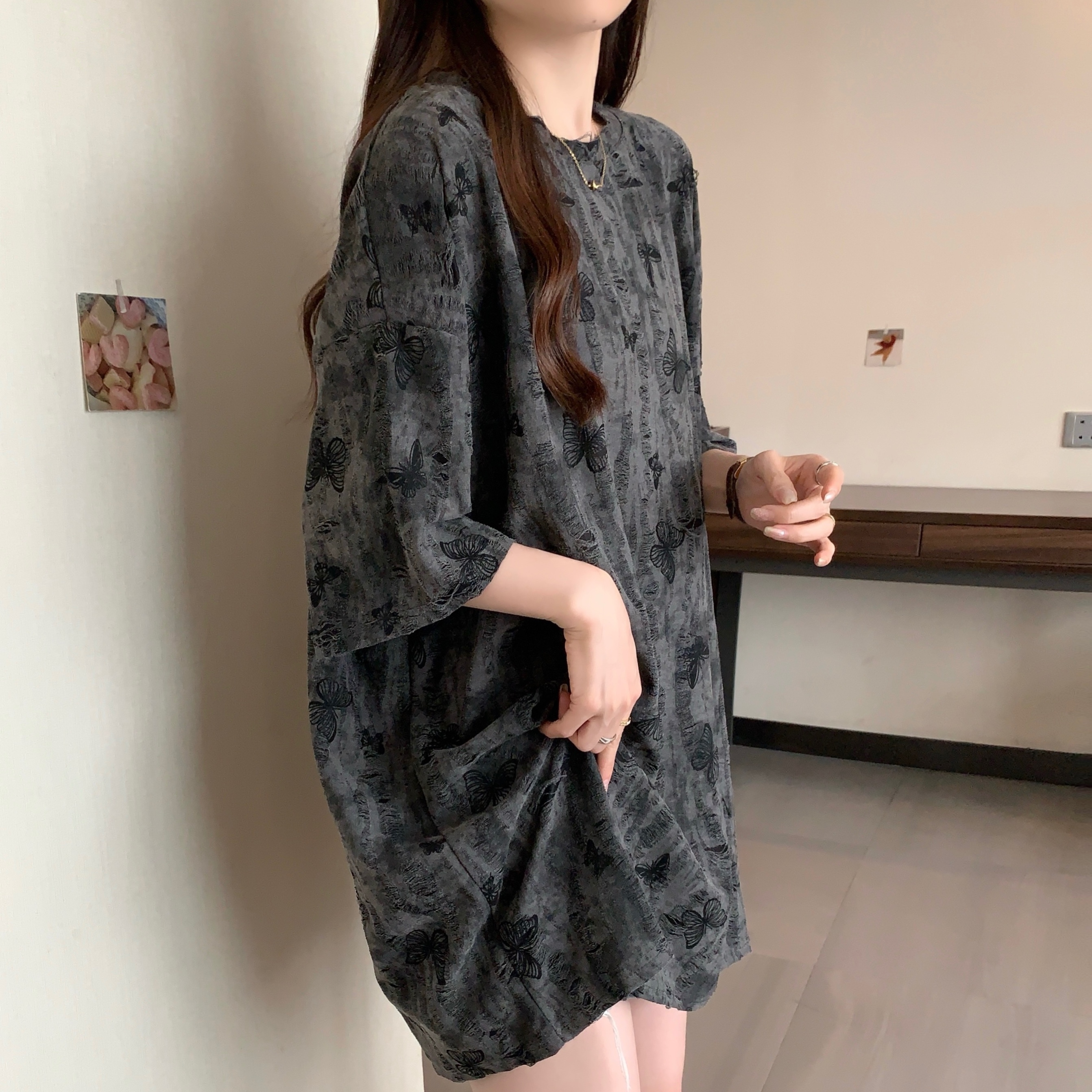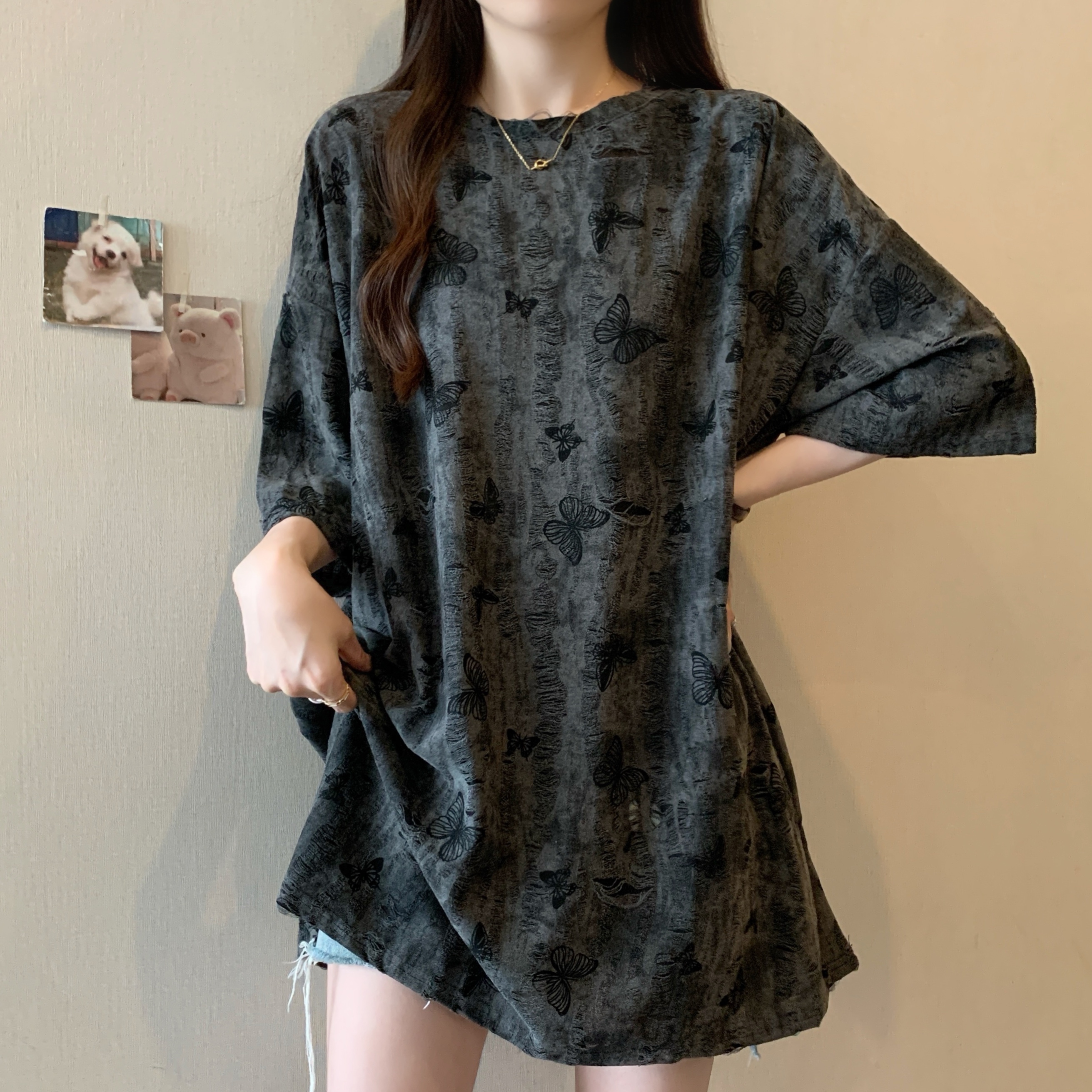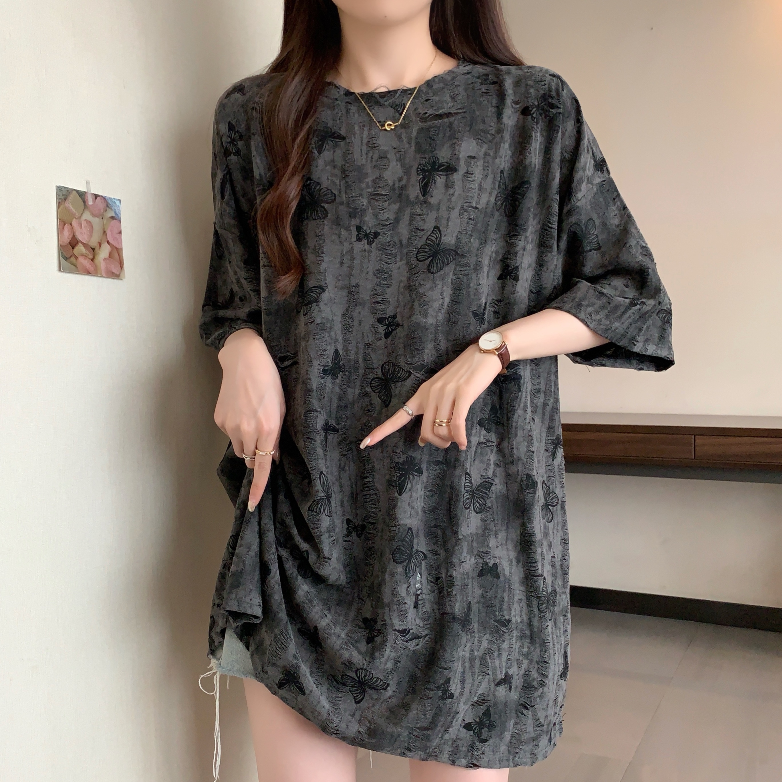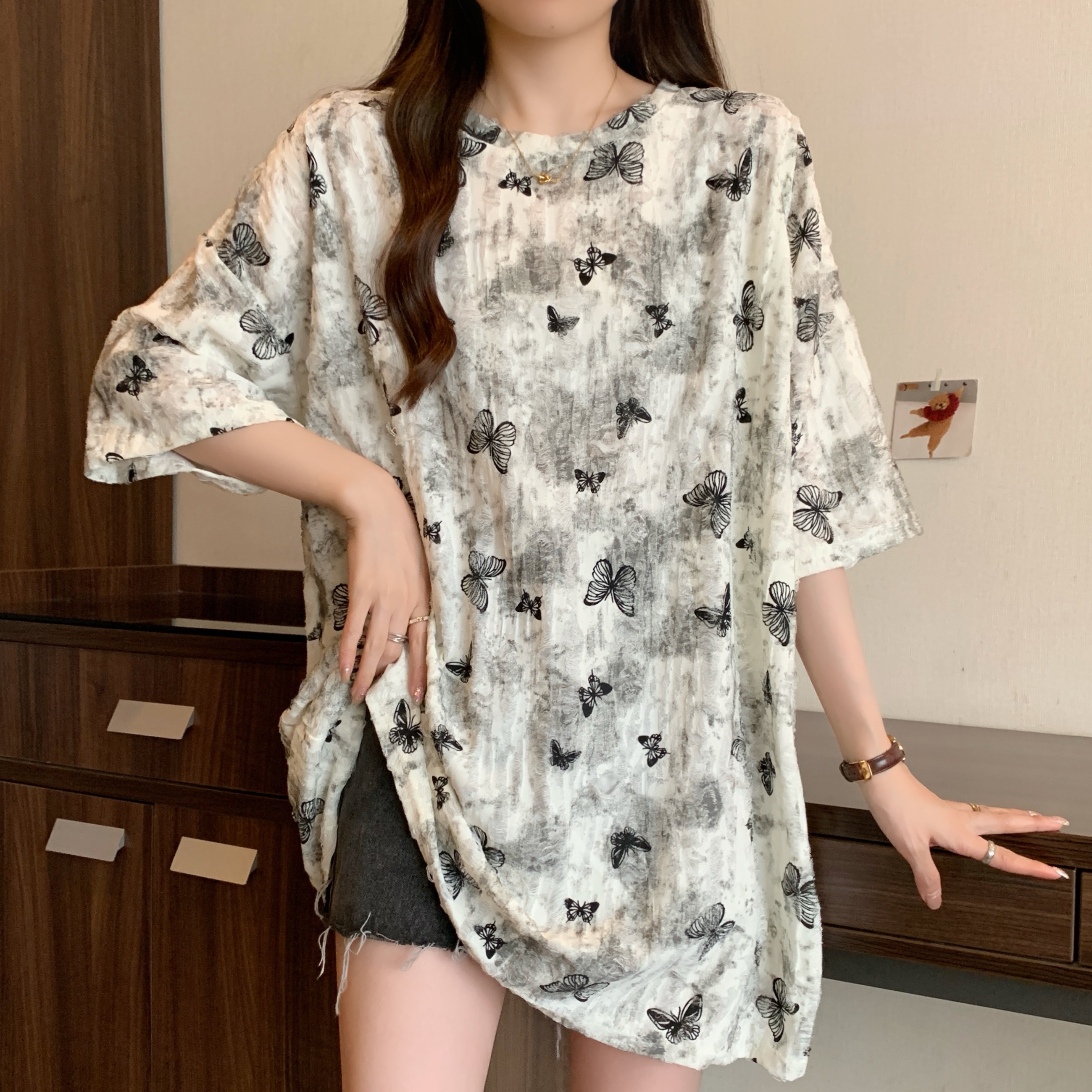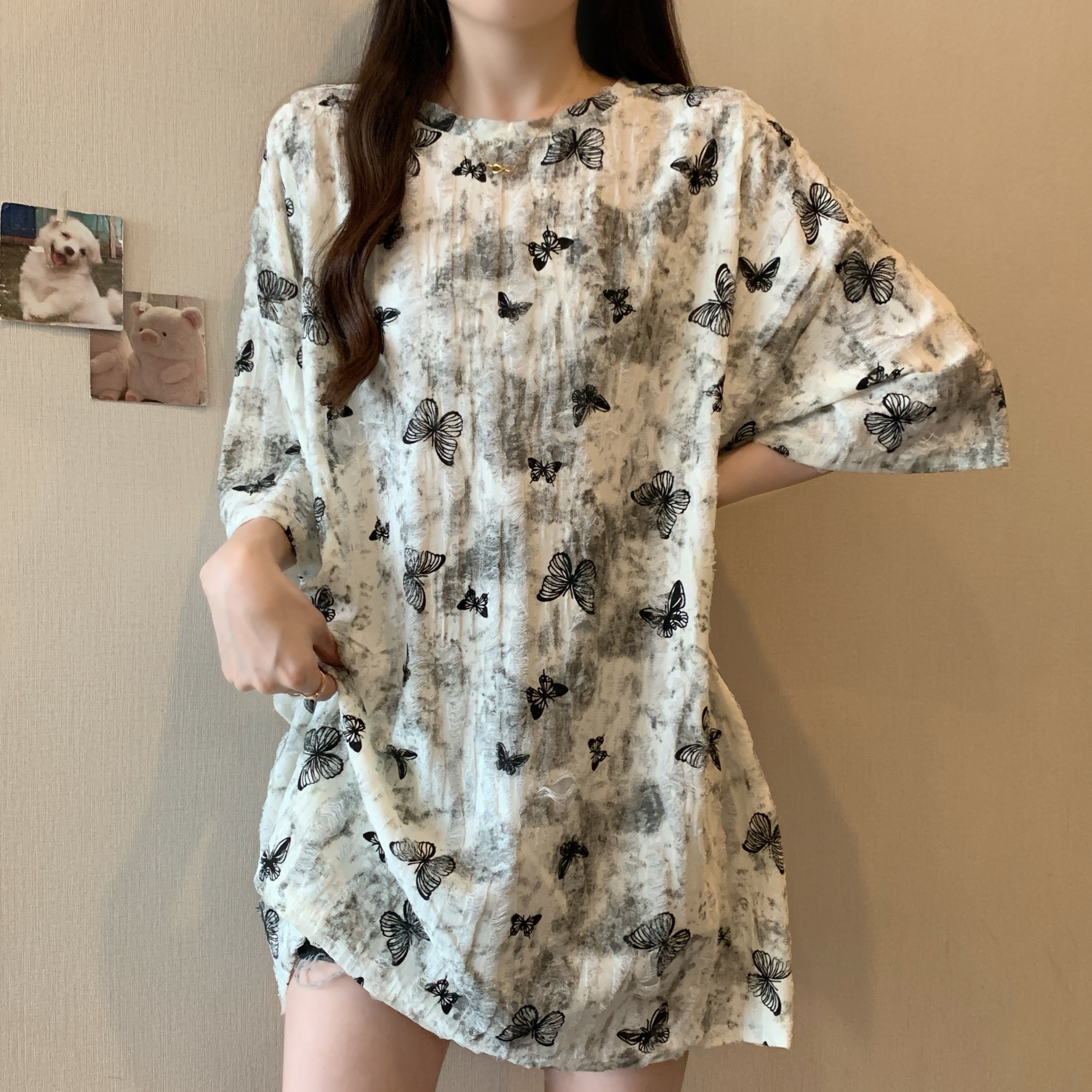 실사 2191# 빅 사이즈 지방 mm 루즈핏 슬림해 보이는 홀치기 염색 중간 길이 반팔 티셔츠 품격 미니멀리즘 다용도 맨위
