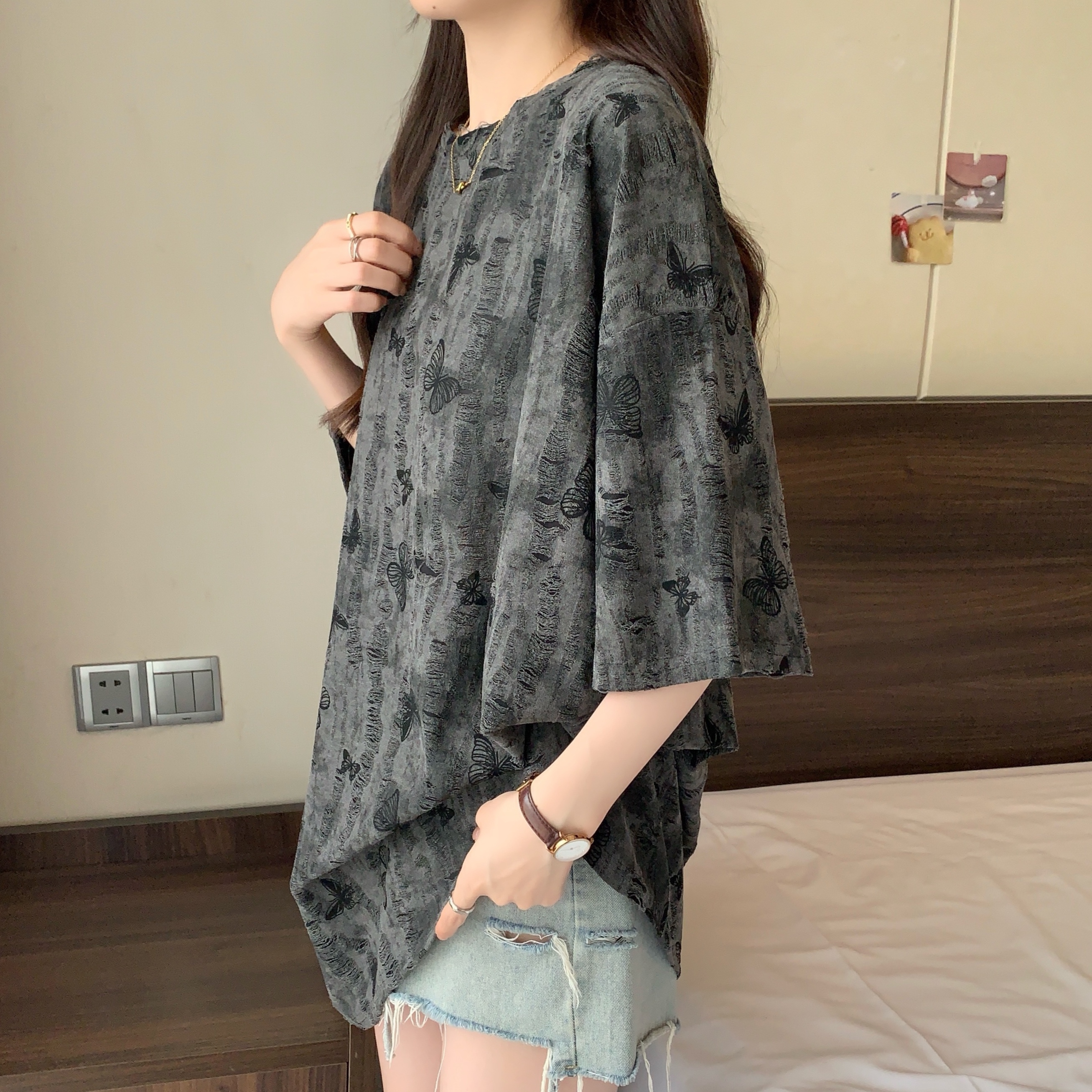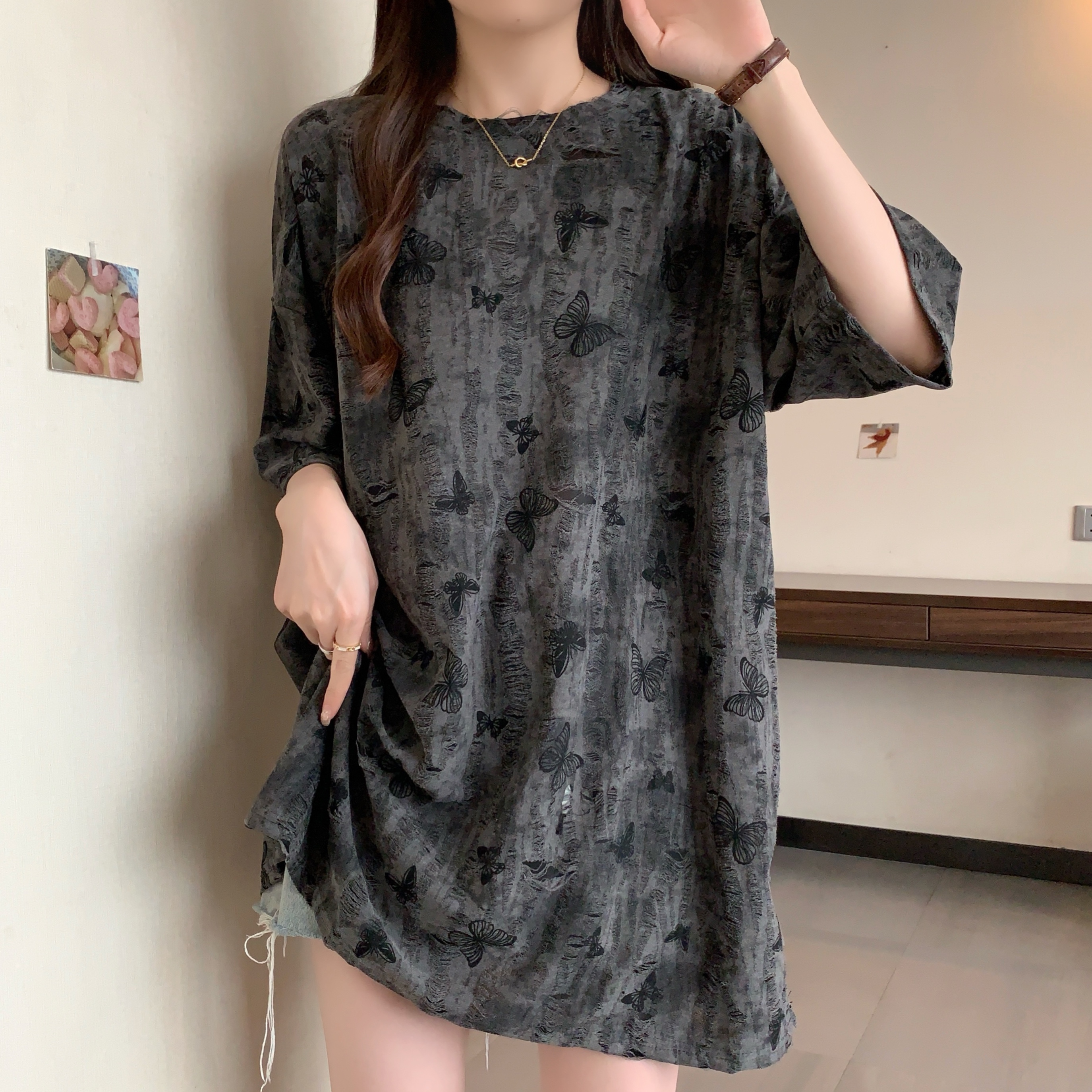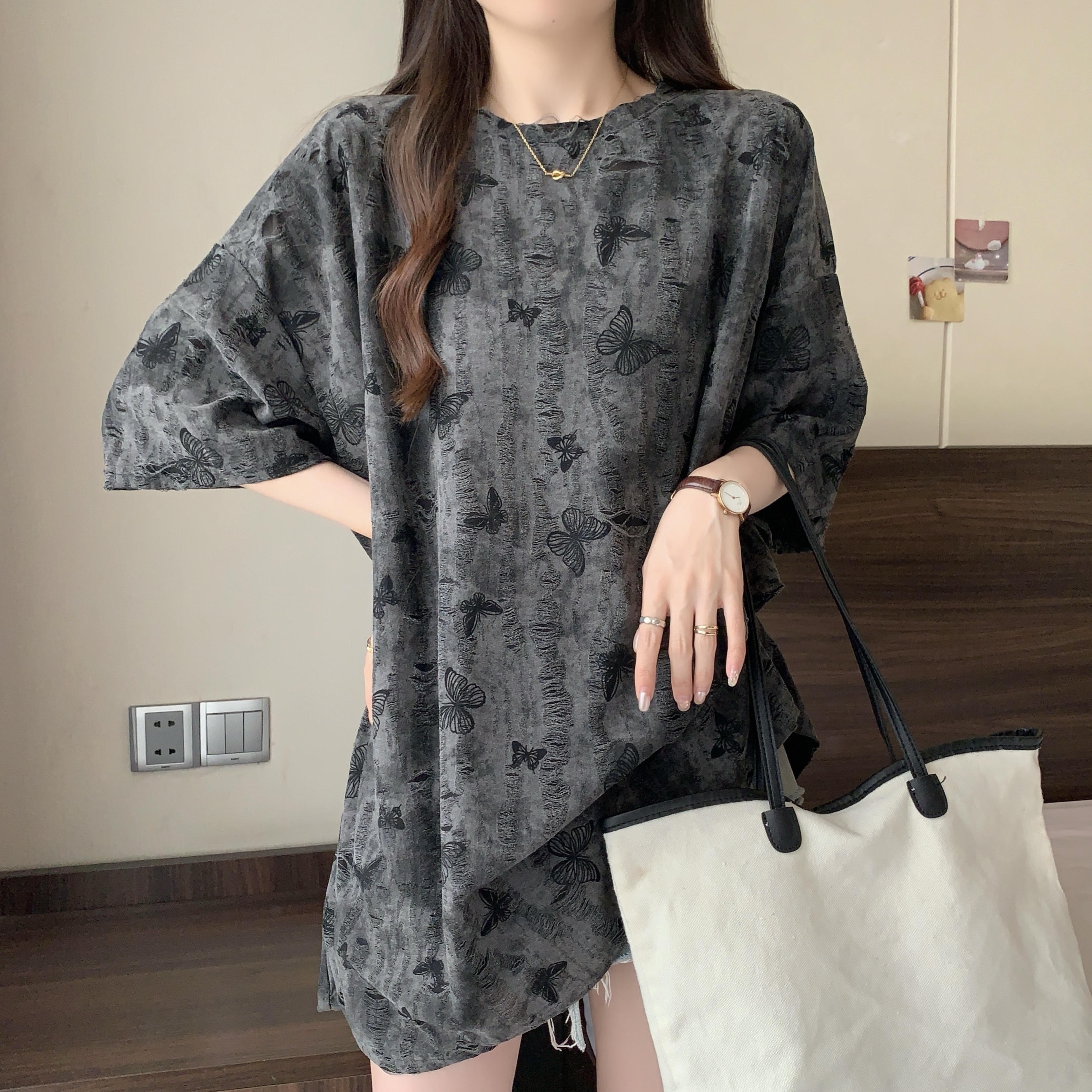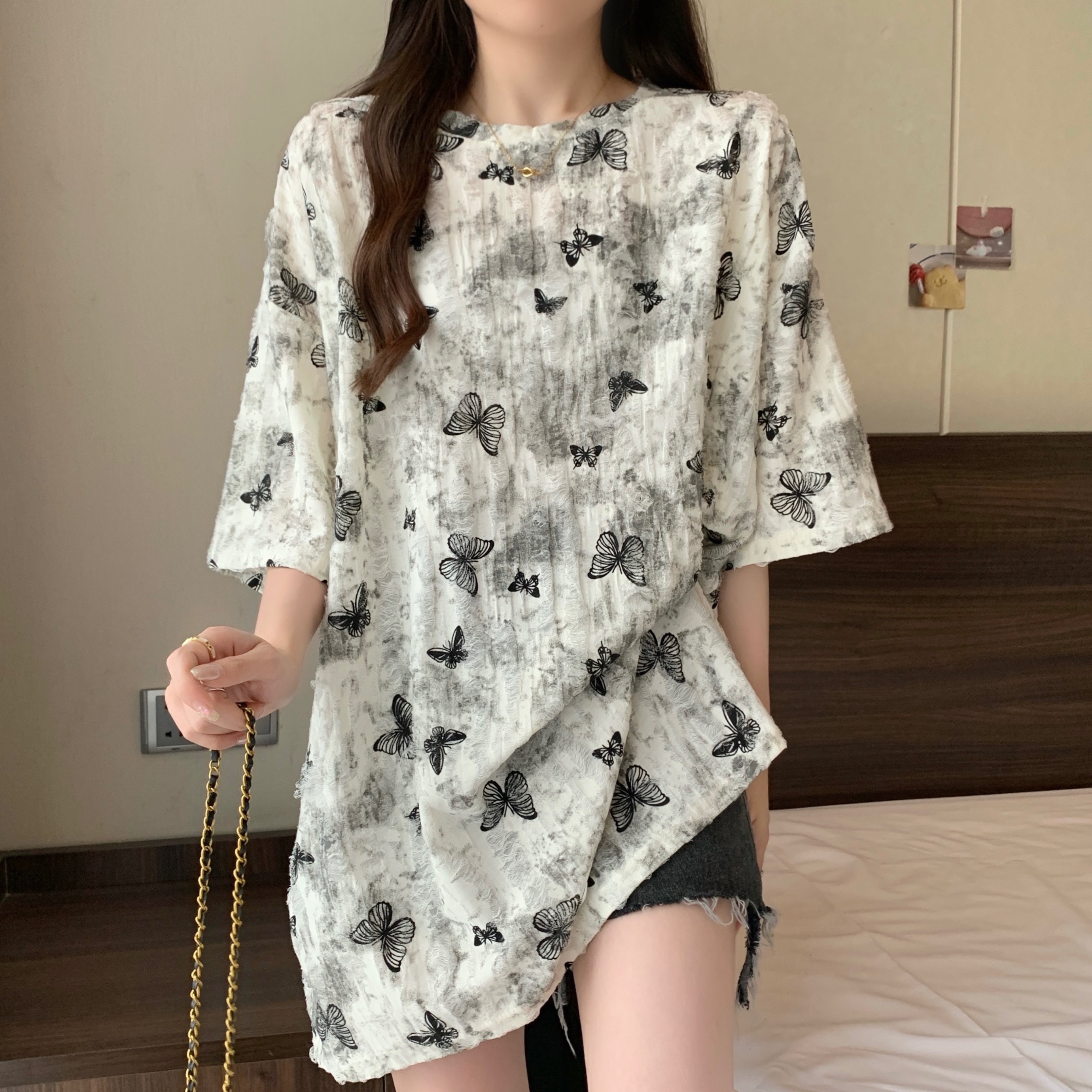 실사 2191# 빅 사이즈 지방 mm 루즈핏 슬림해 보이는 홀치기 염색 중간 길이 반팔 티셔츠 품격 미니멀리즘 다용도 맨위