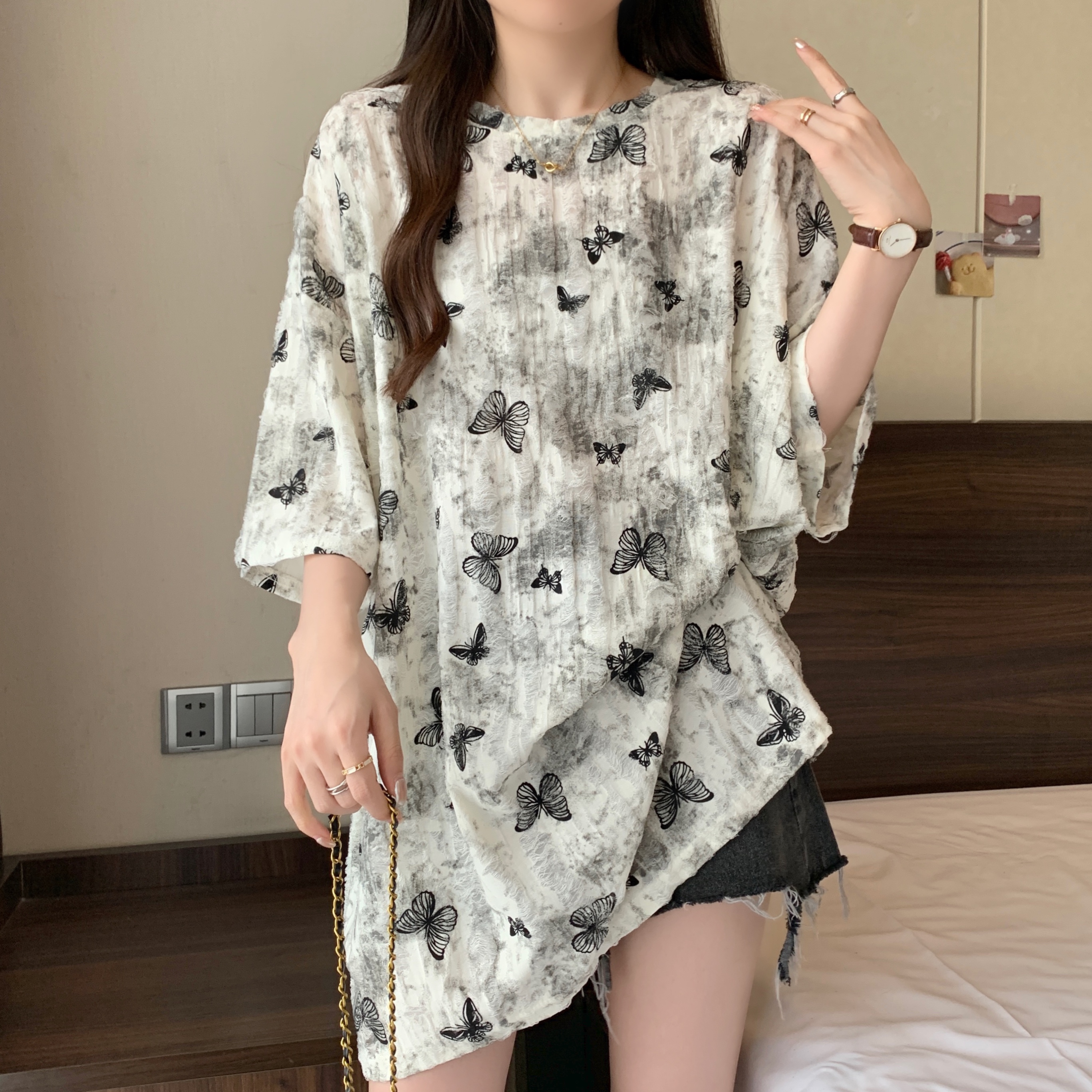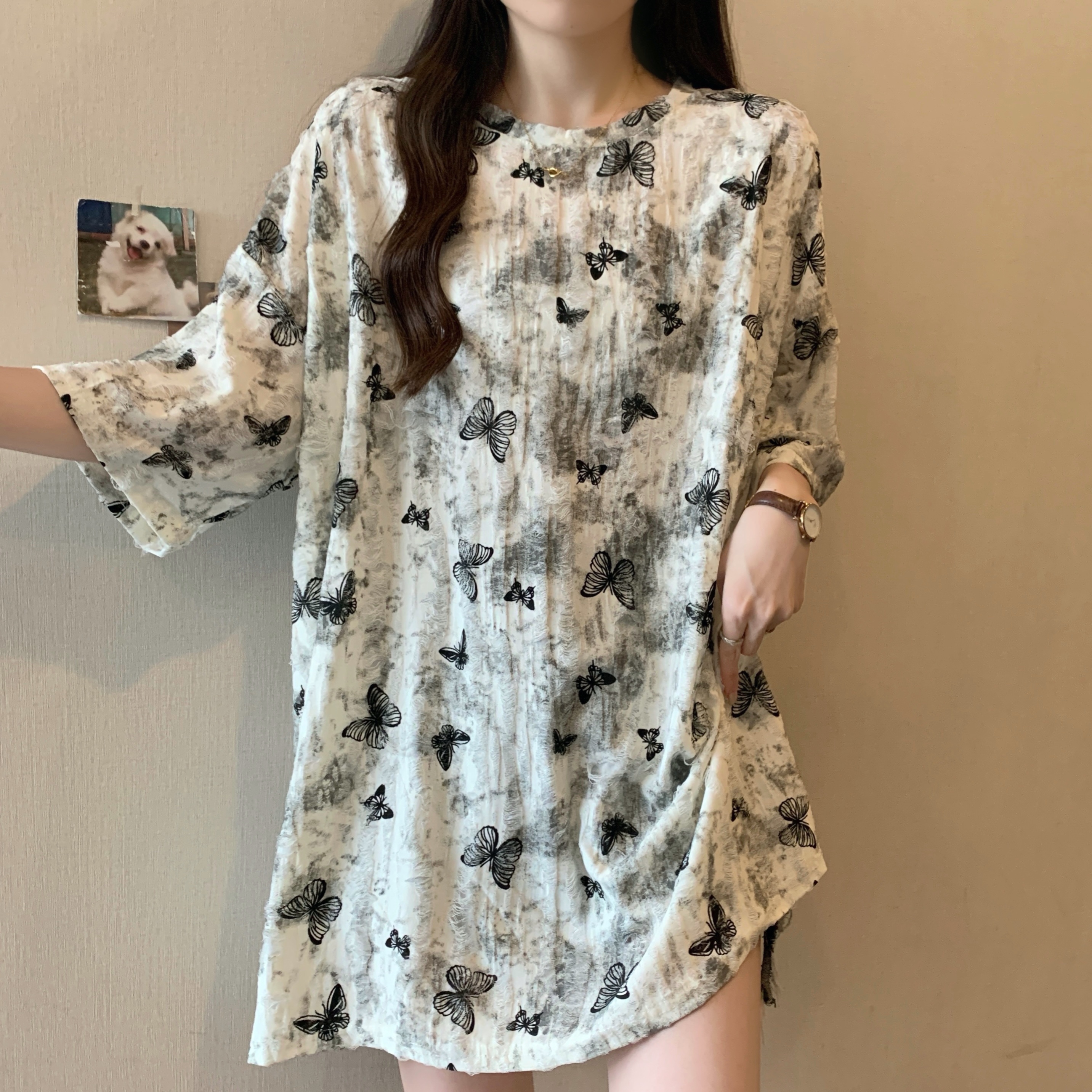 실사 2207# 빅 사이즈 여성 의류 미니멀리즘 부드러운 바람 도트 무늬 라운드 넥 버블 반팔 품격 슬림해 보이는 맨위