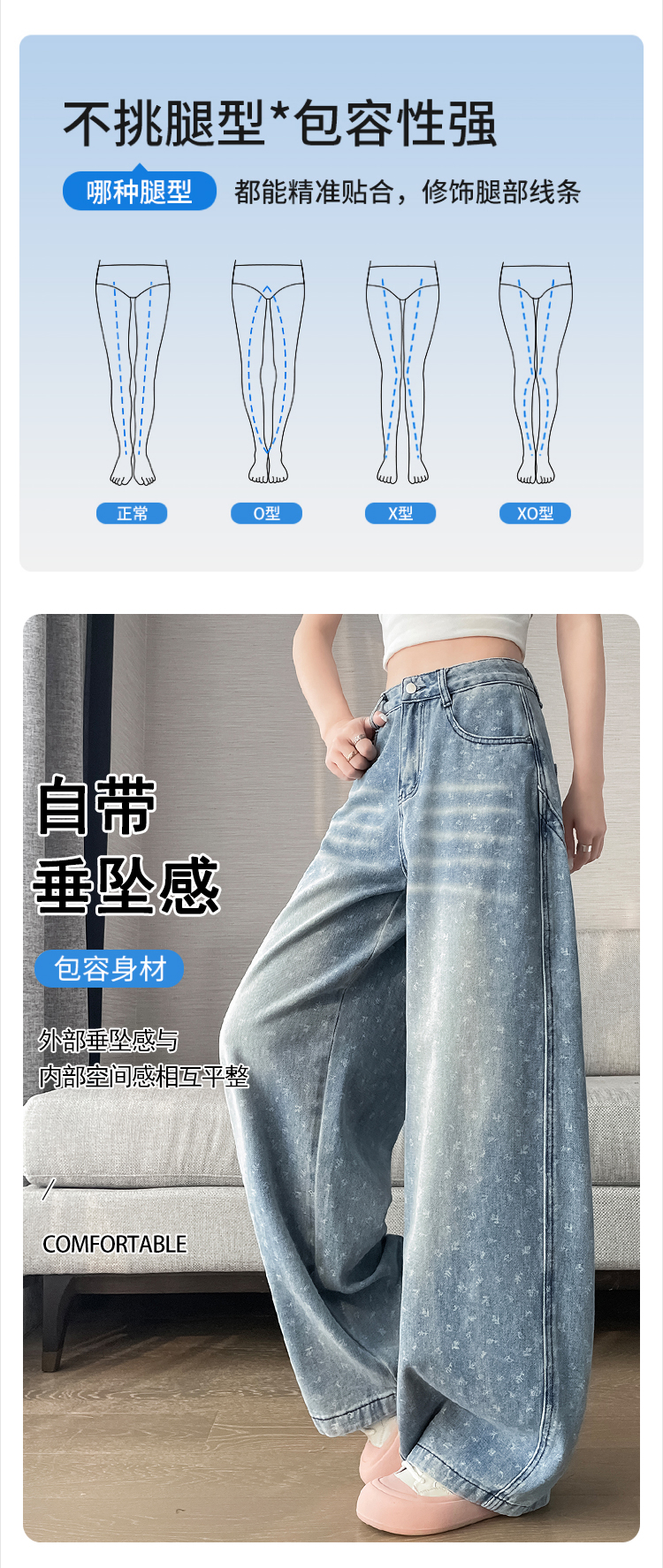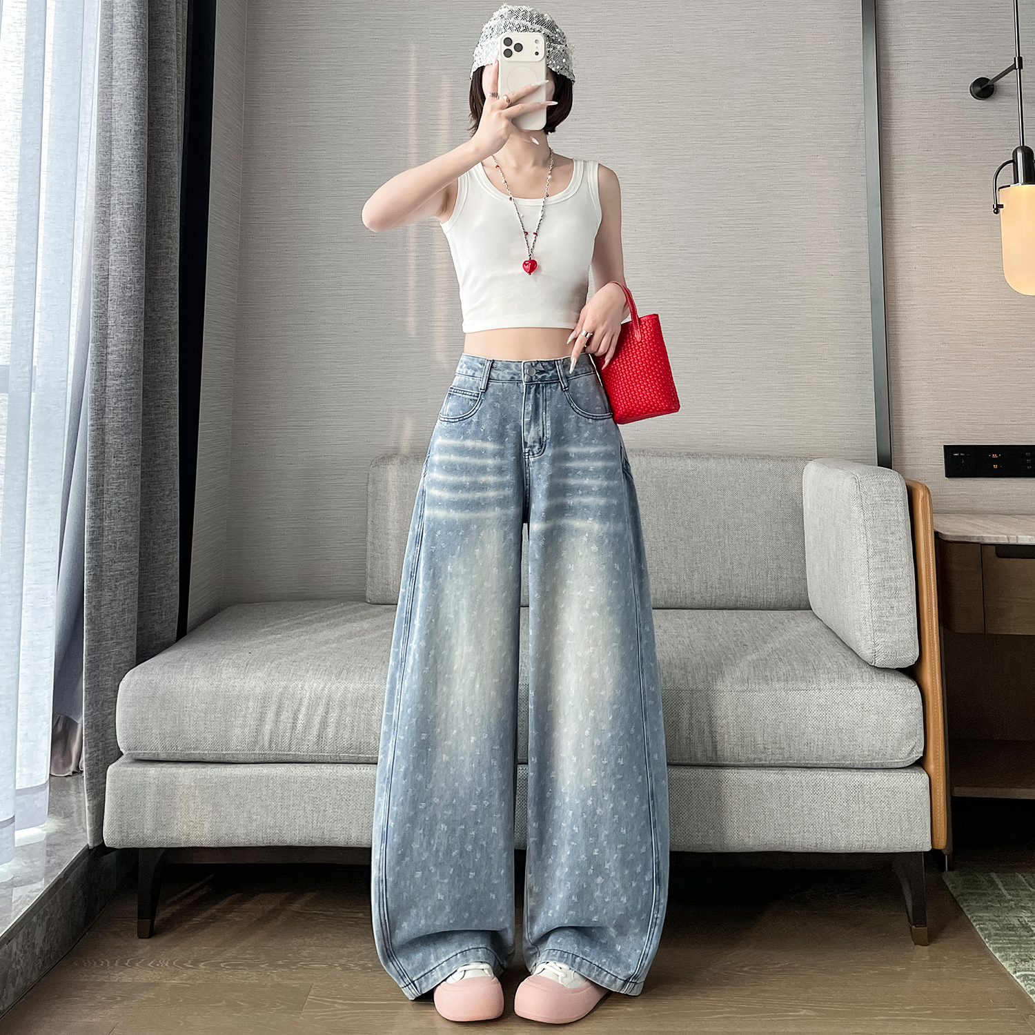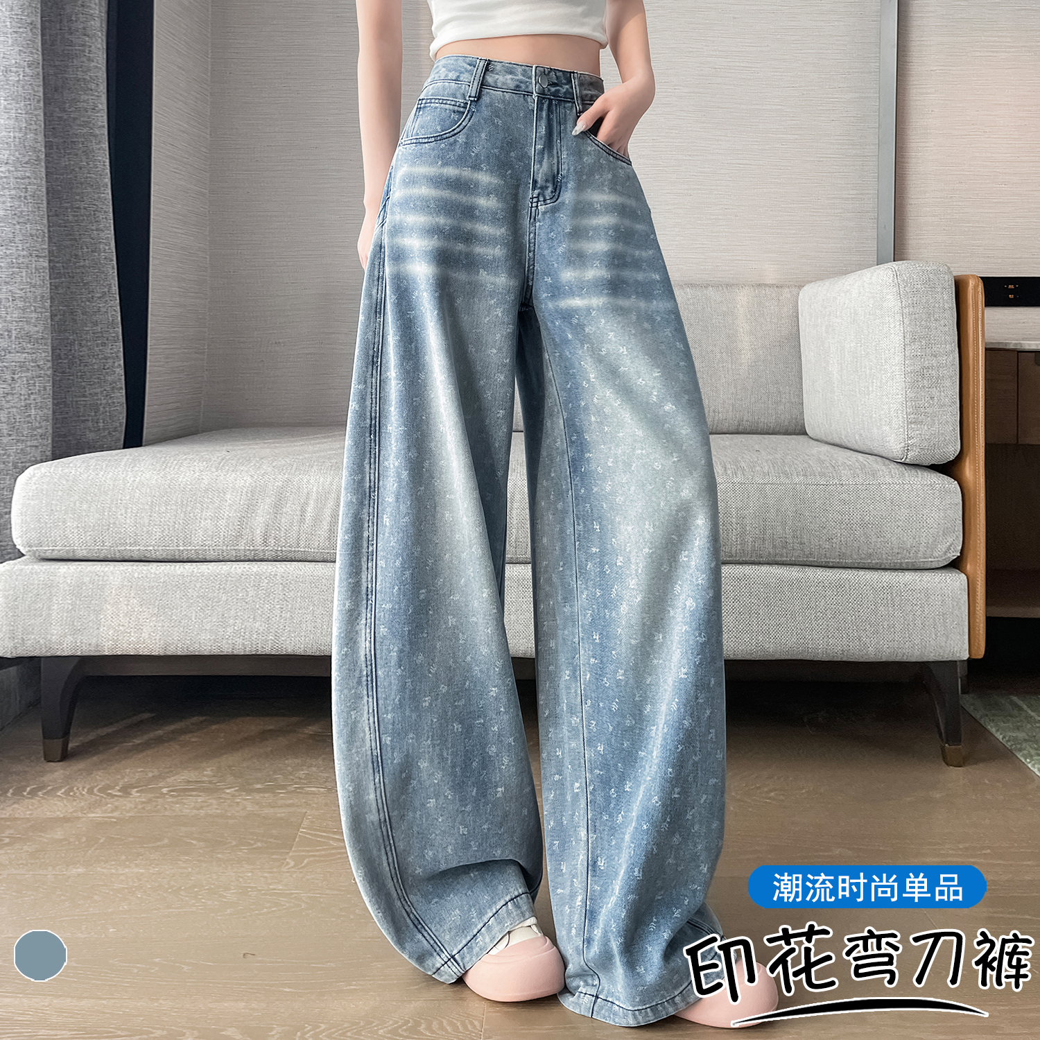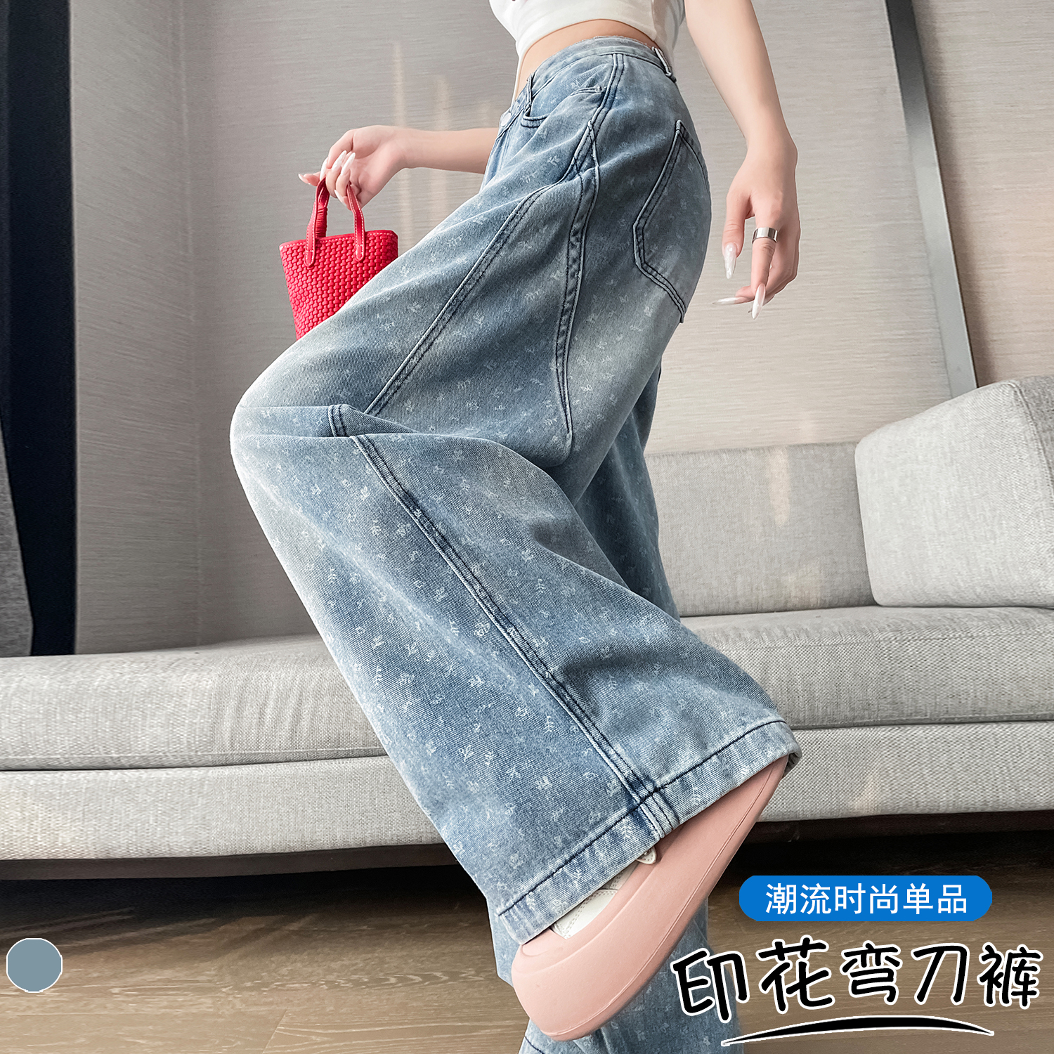 실사 디자인 센스 프린트 청바지 2026 봄 여름 루즈핏 슬림해 보이는 모통이 칼 와이드 레그 팬츠 하이웨이스트 다용도 긴 바지