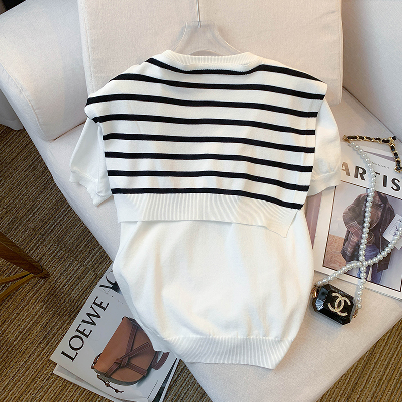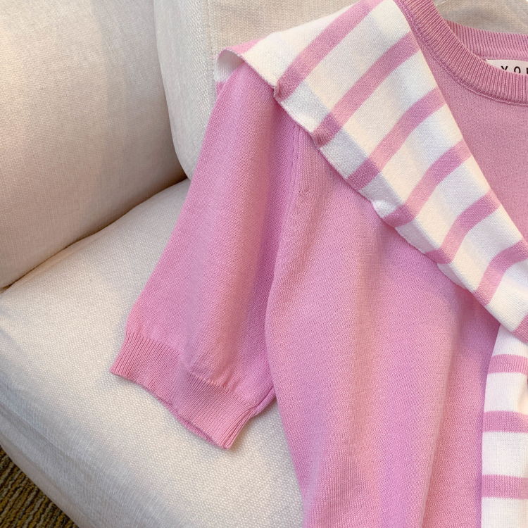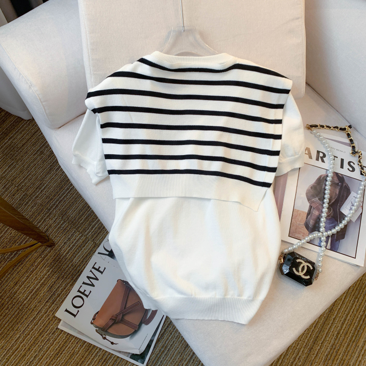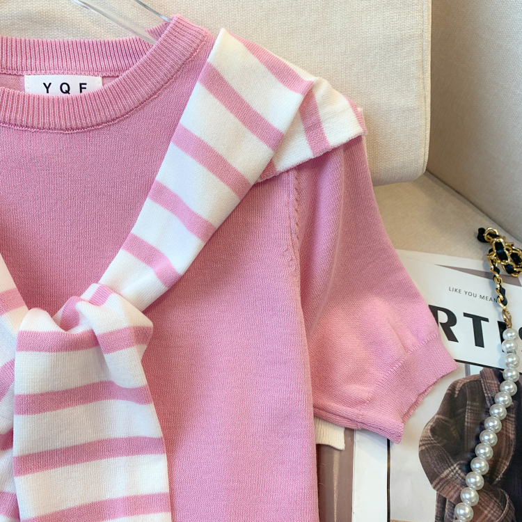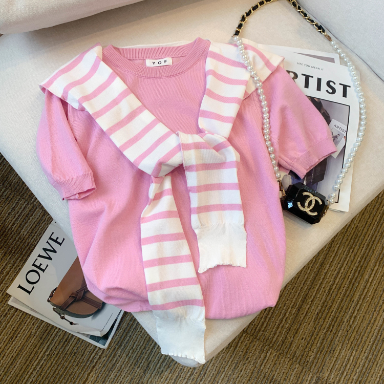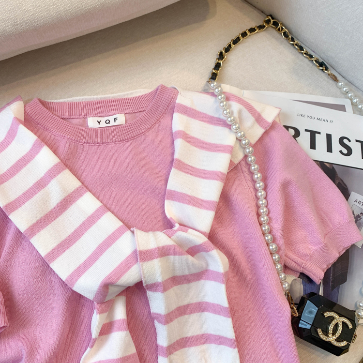 실사 대 물품 2026 여름 새로운 디자인 센스 스트라이프 하프 오픈 가디건 반팔 맨위 티셔츠 얼음 실크 니트 스웨터 여성