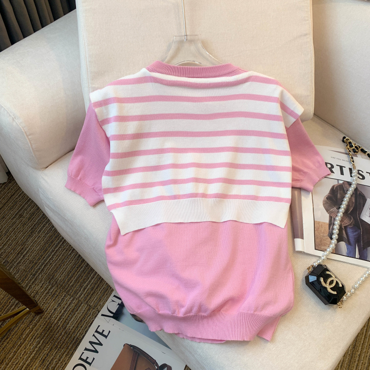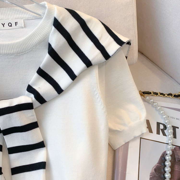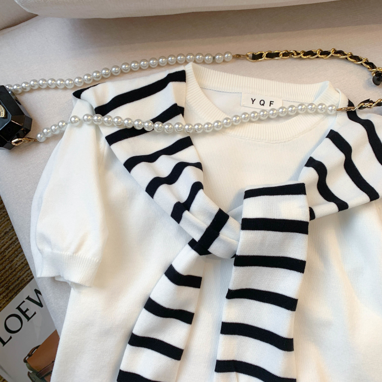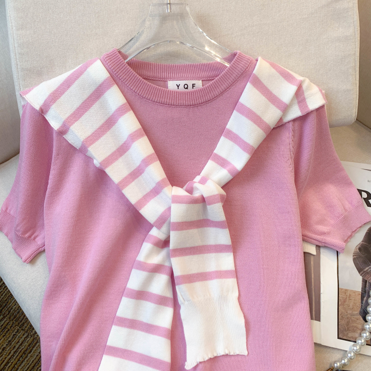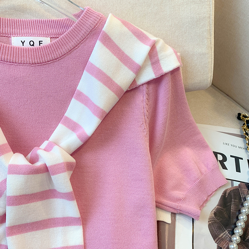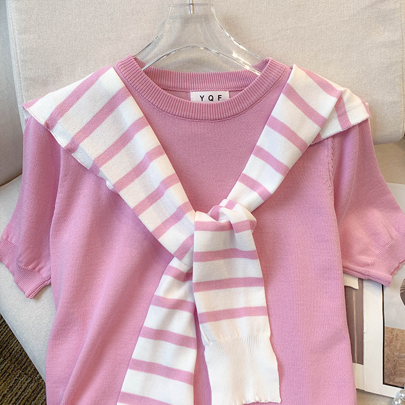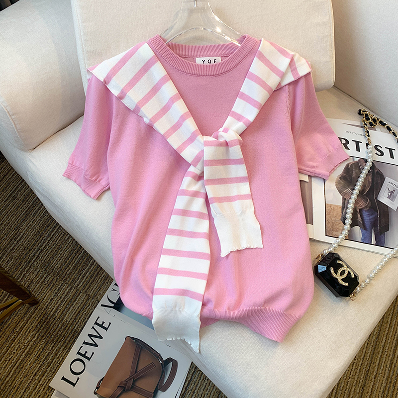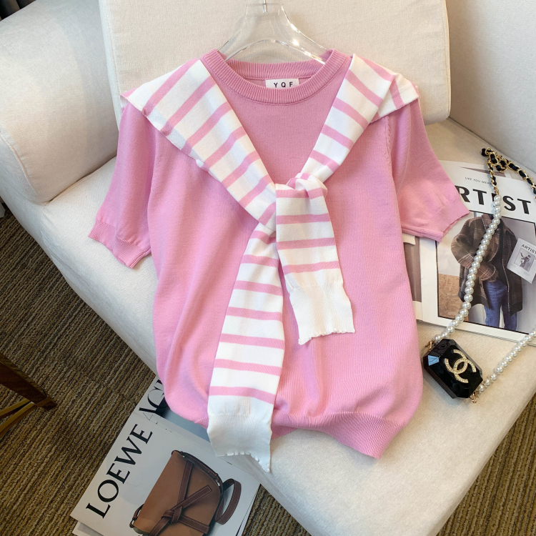 실사 대 물품 2026 여름 새로운 디자인 센스 배색 라운드 넥 반팔 티셔츠 품격 얼음 실크 니트 여성