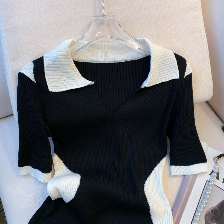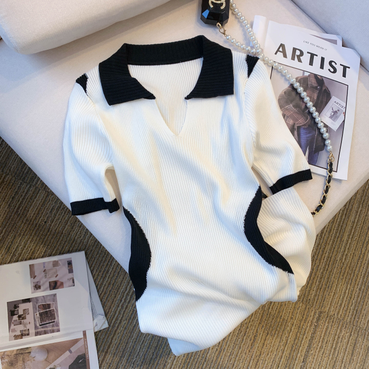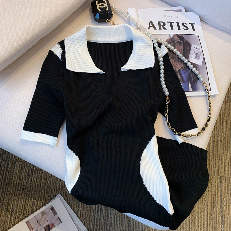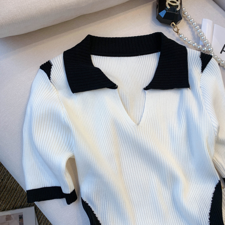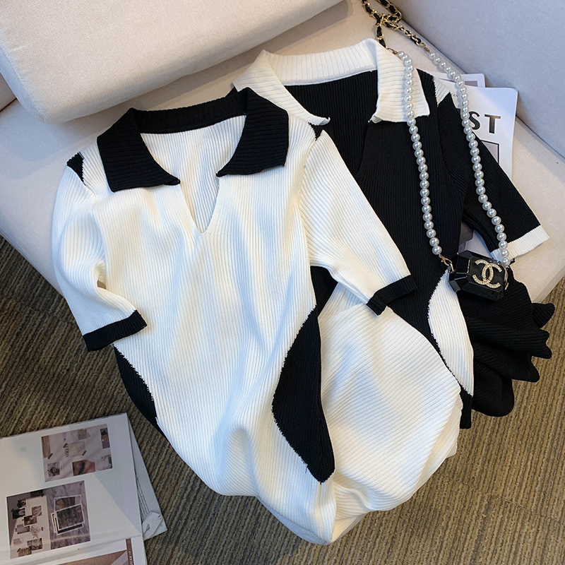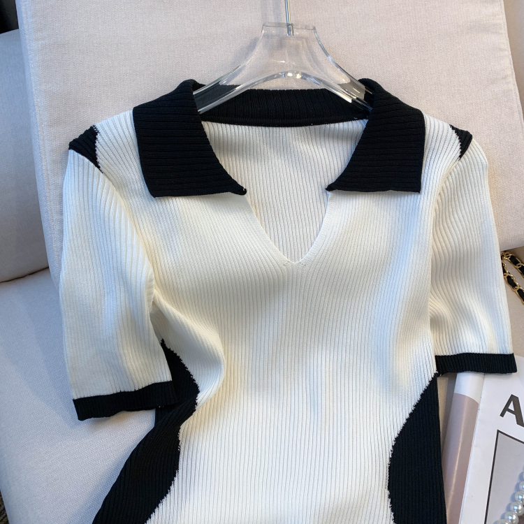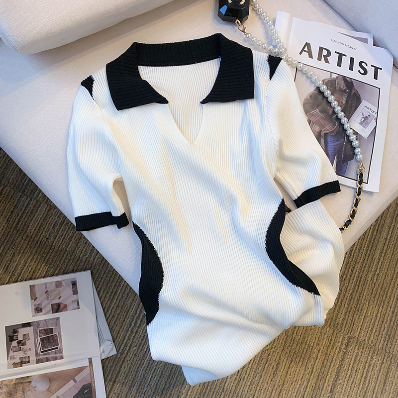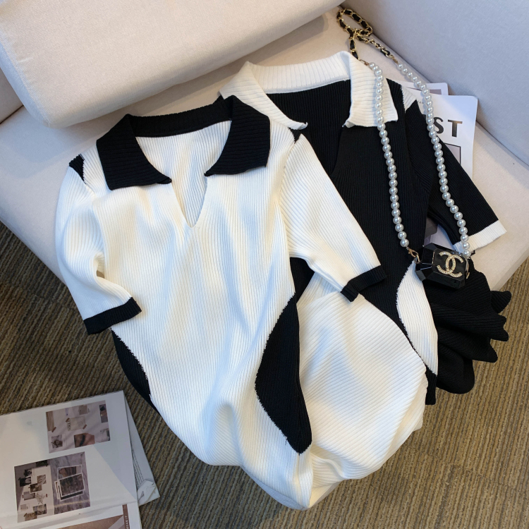 실사 대 물품 2026 여름 새로운 디자인 센스 배색 라운드 넥 반팔 티셔츠 품격 얼음 실크 니트 여성