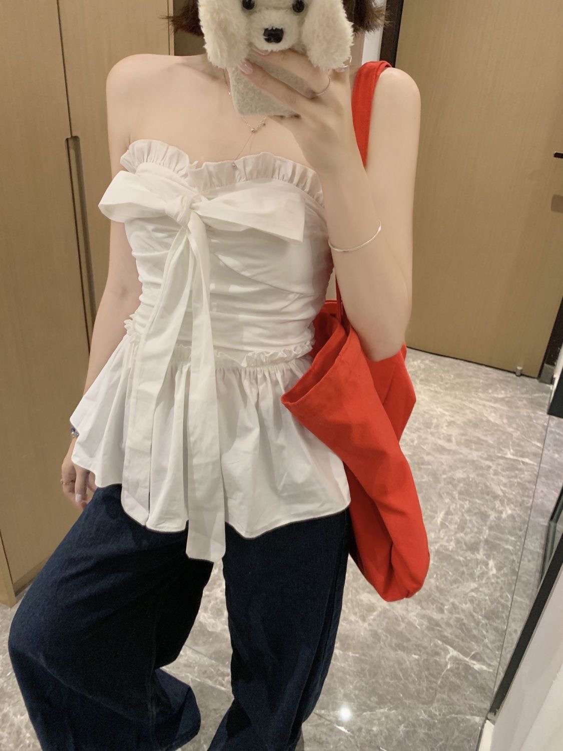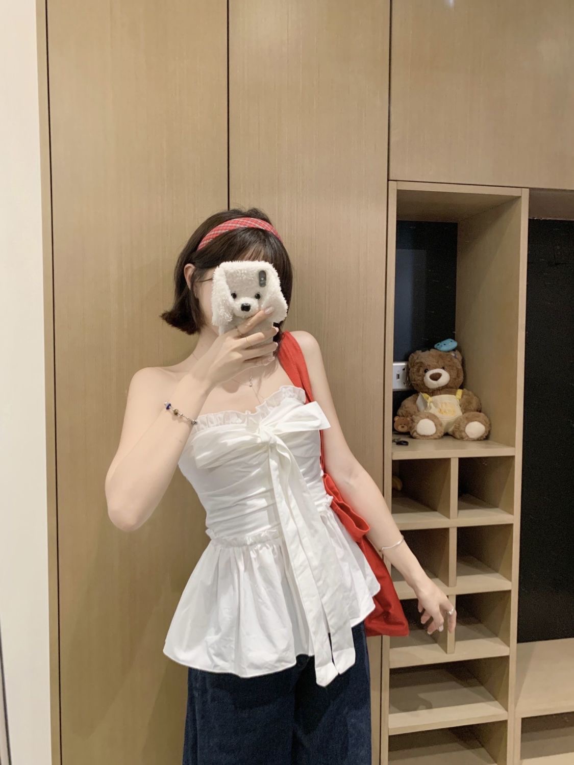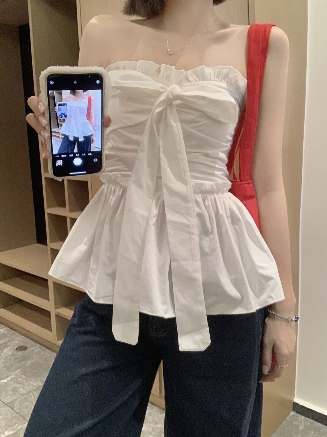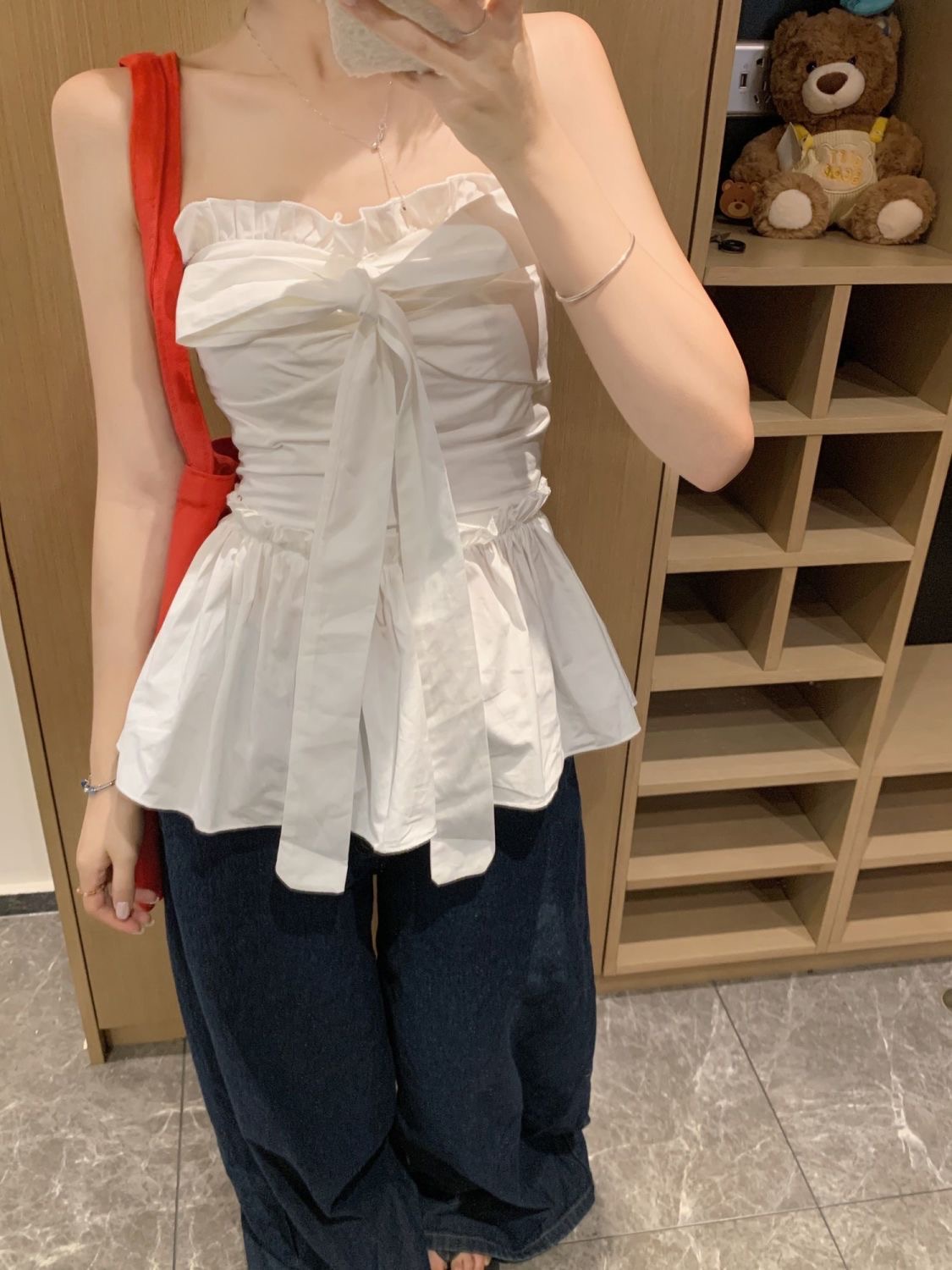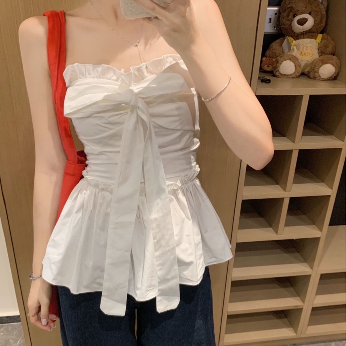 달콤한 스타일 화이트 나비 매듭 스트랩 허리 수축 슬림해 보이는 튜브탑 조끼 여성 여름 프랑스식 프릴 Chic 맨위