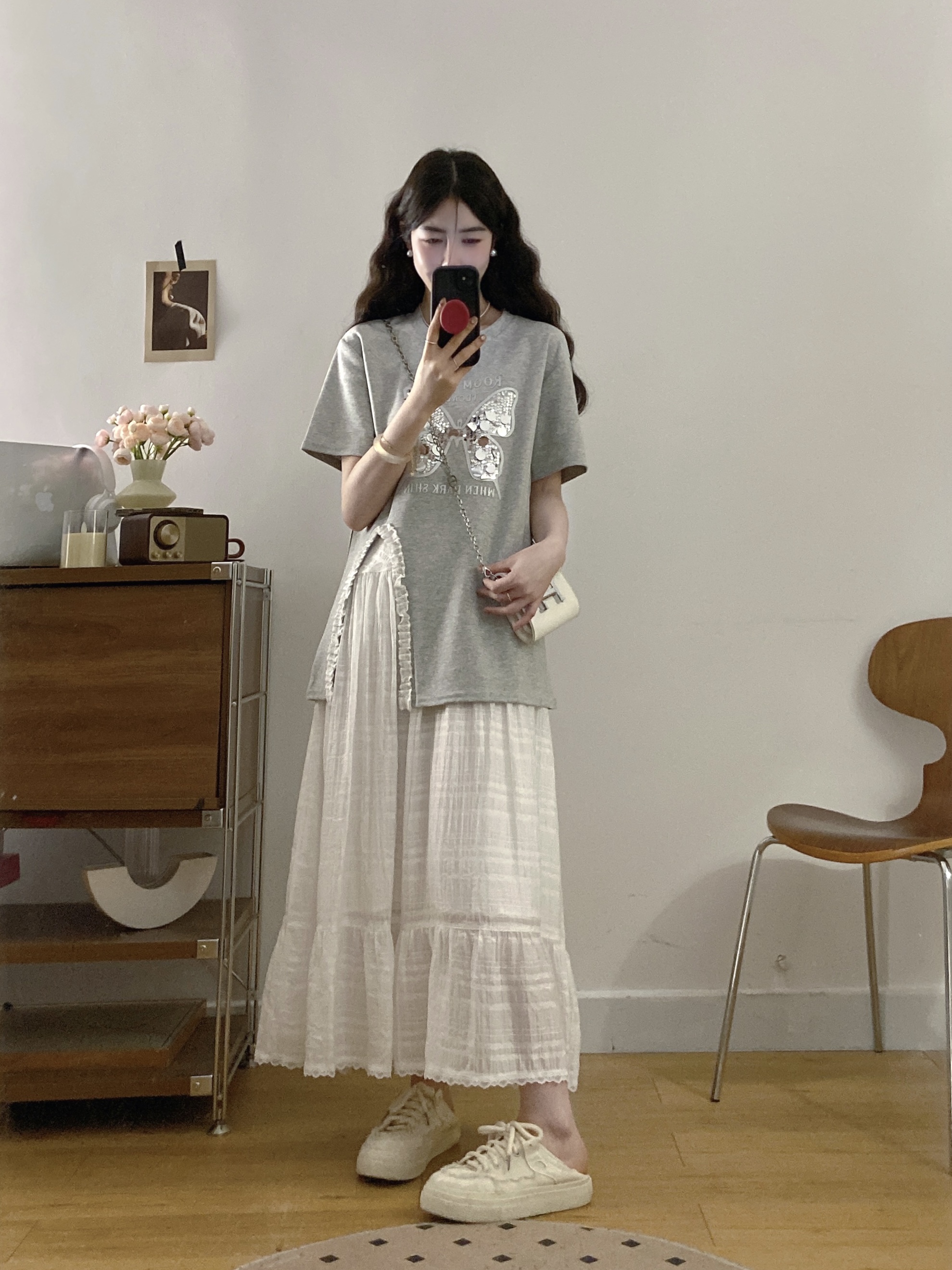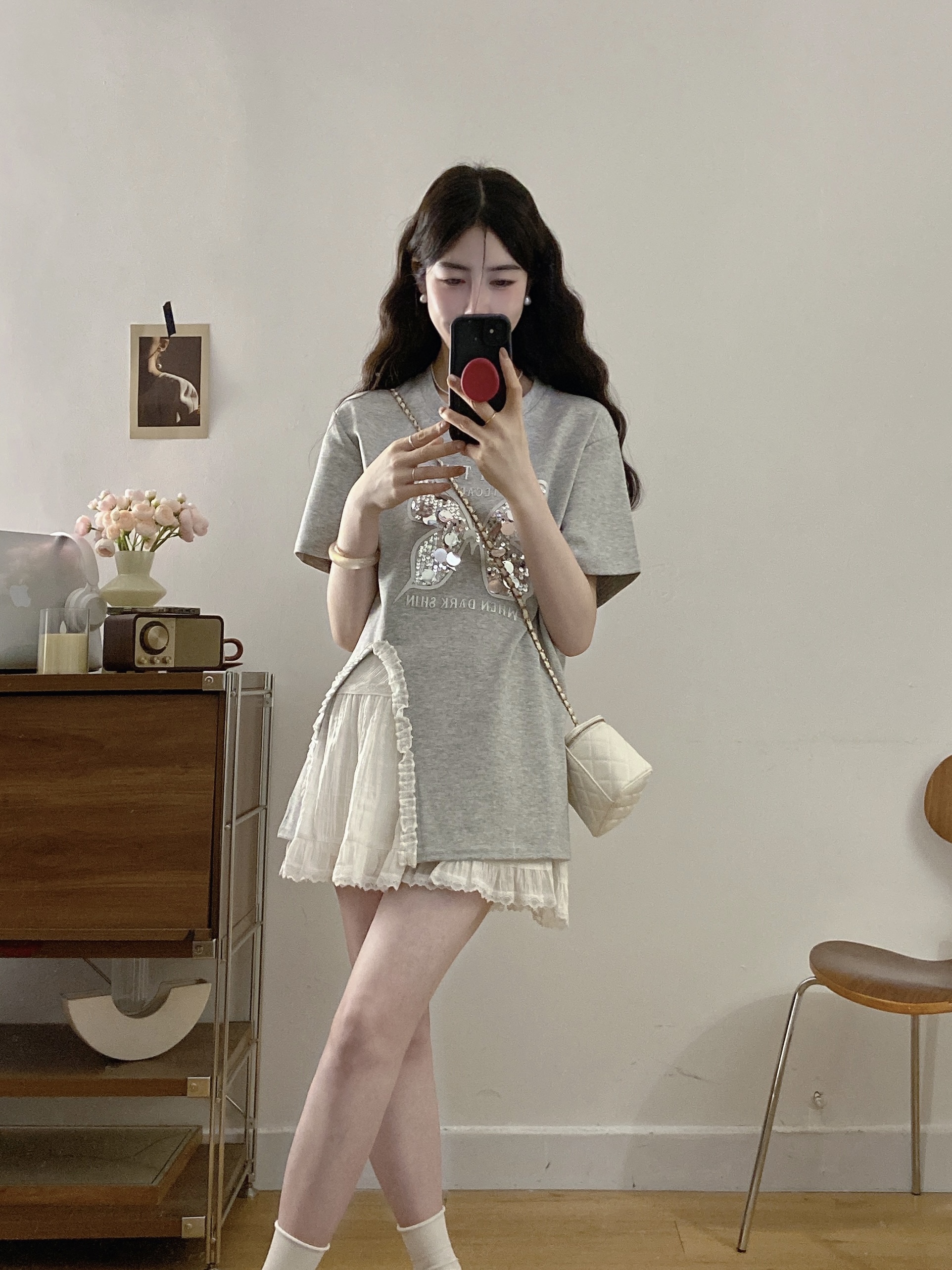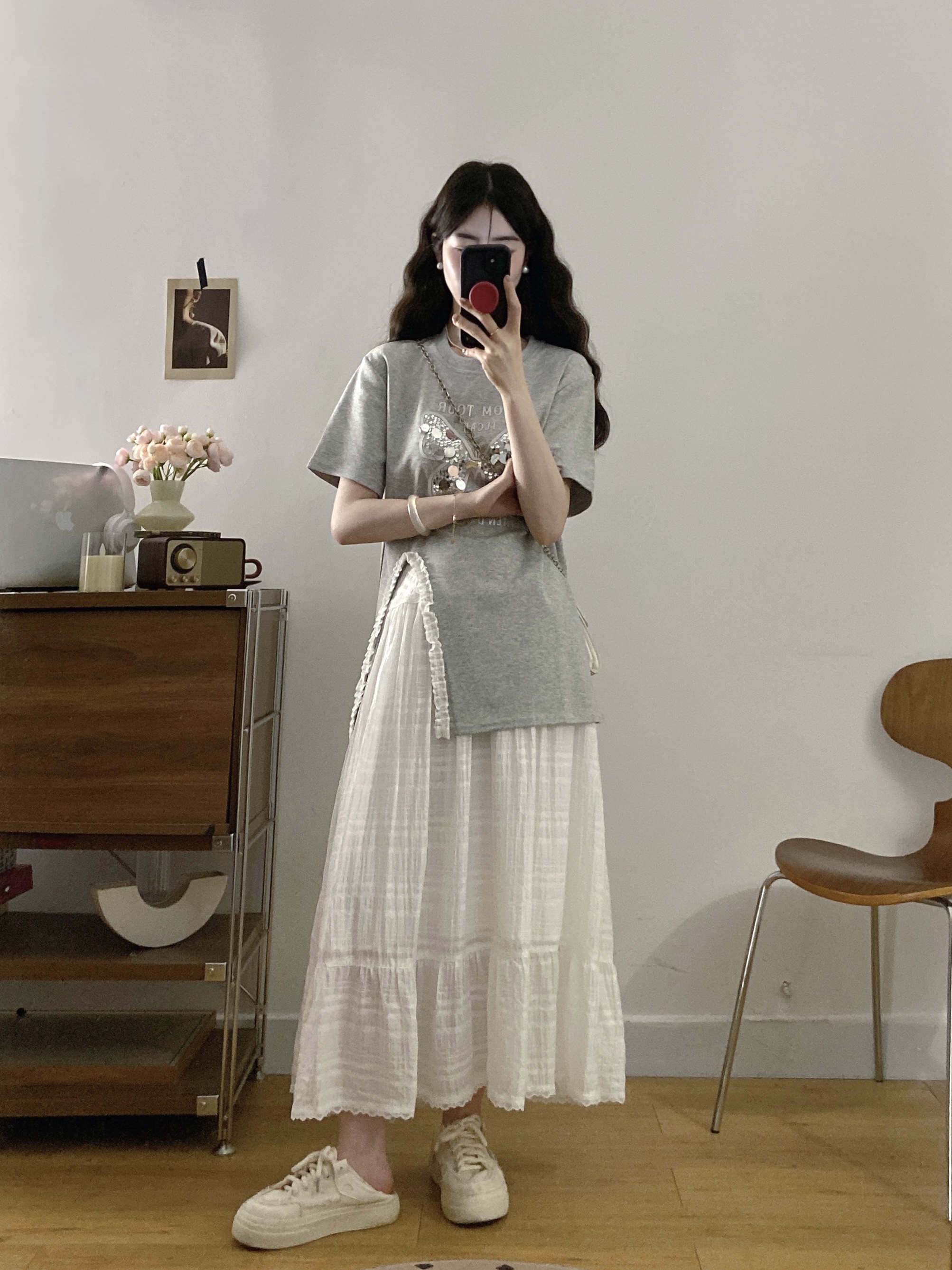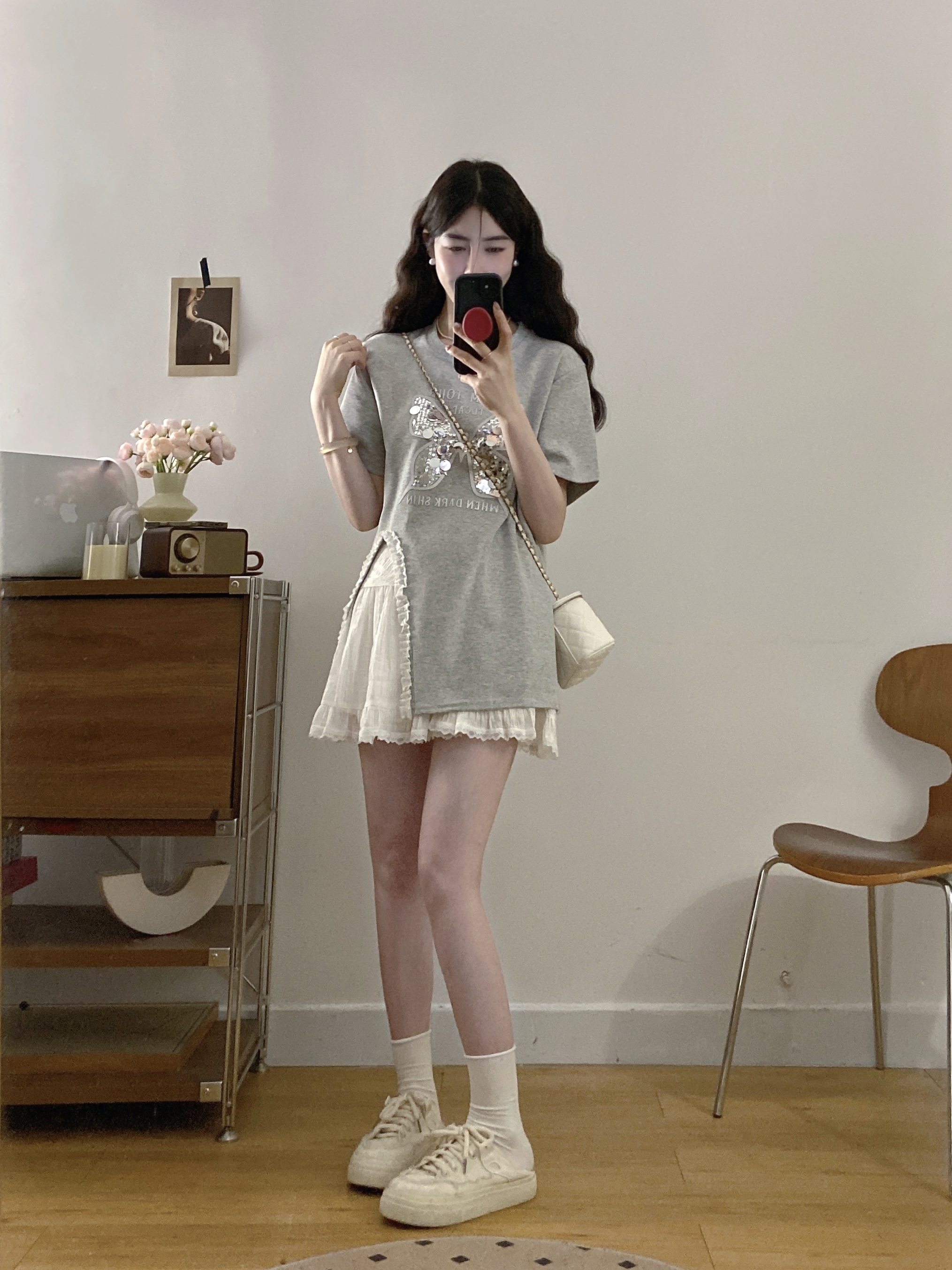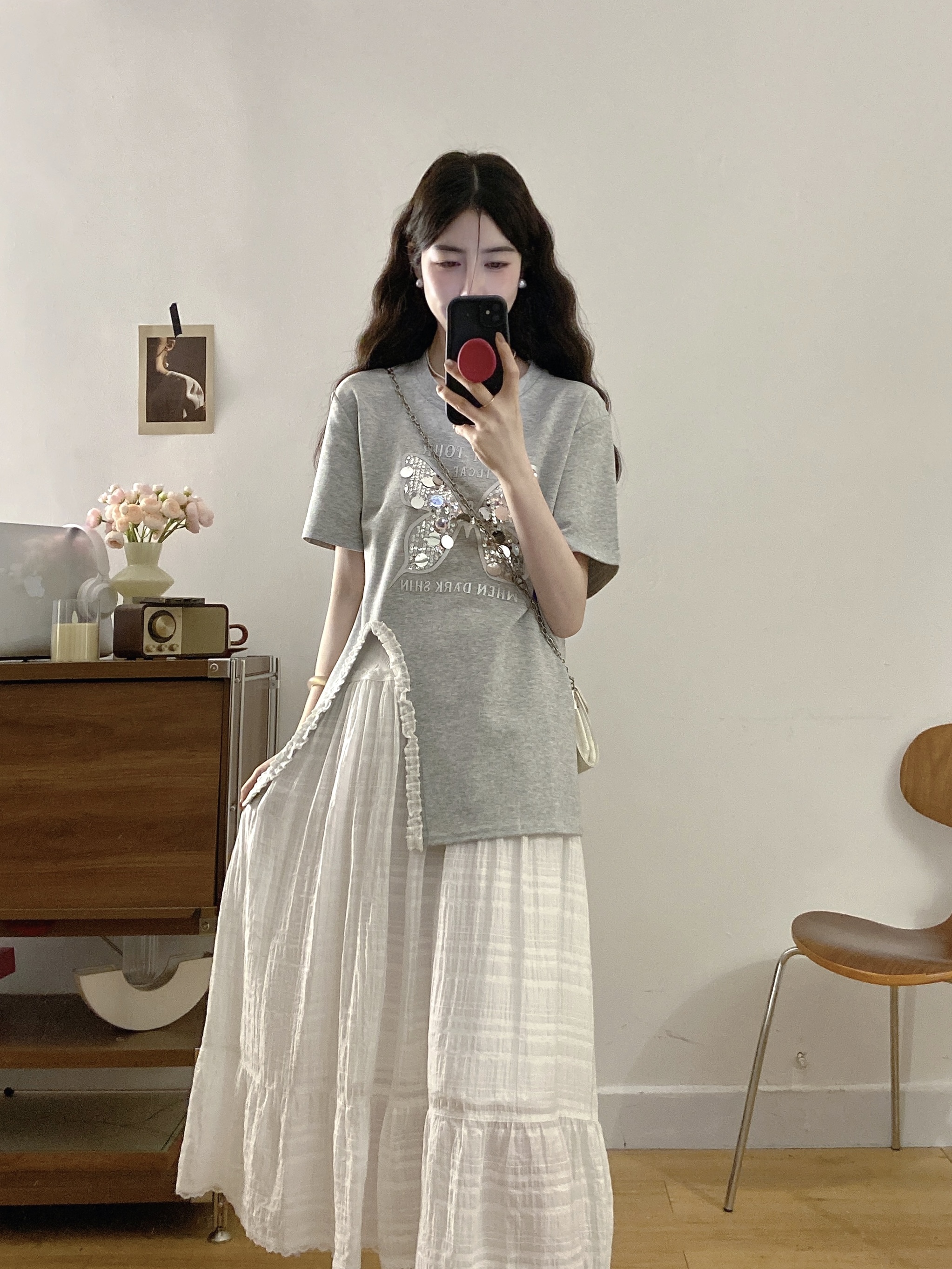 실사 빅 사이즈 여성 의류 2026 여름 새로운 고급 센스 라운드 넥 밝은 회색 색상 반팔 품격 술 치마 세트
