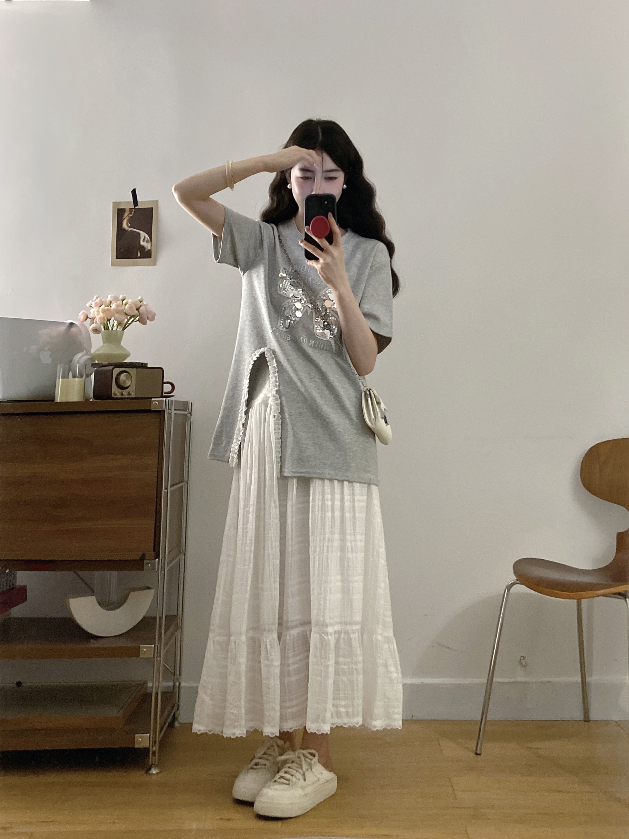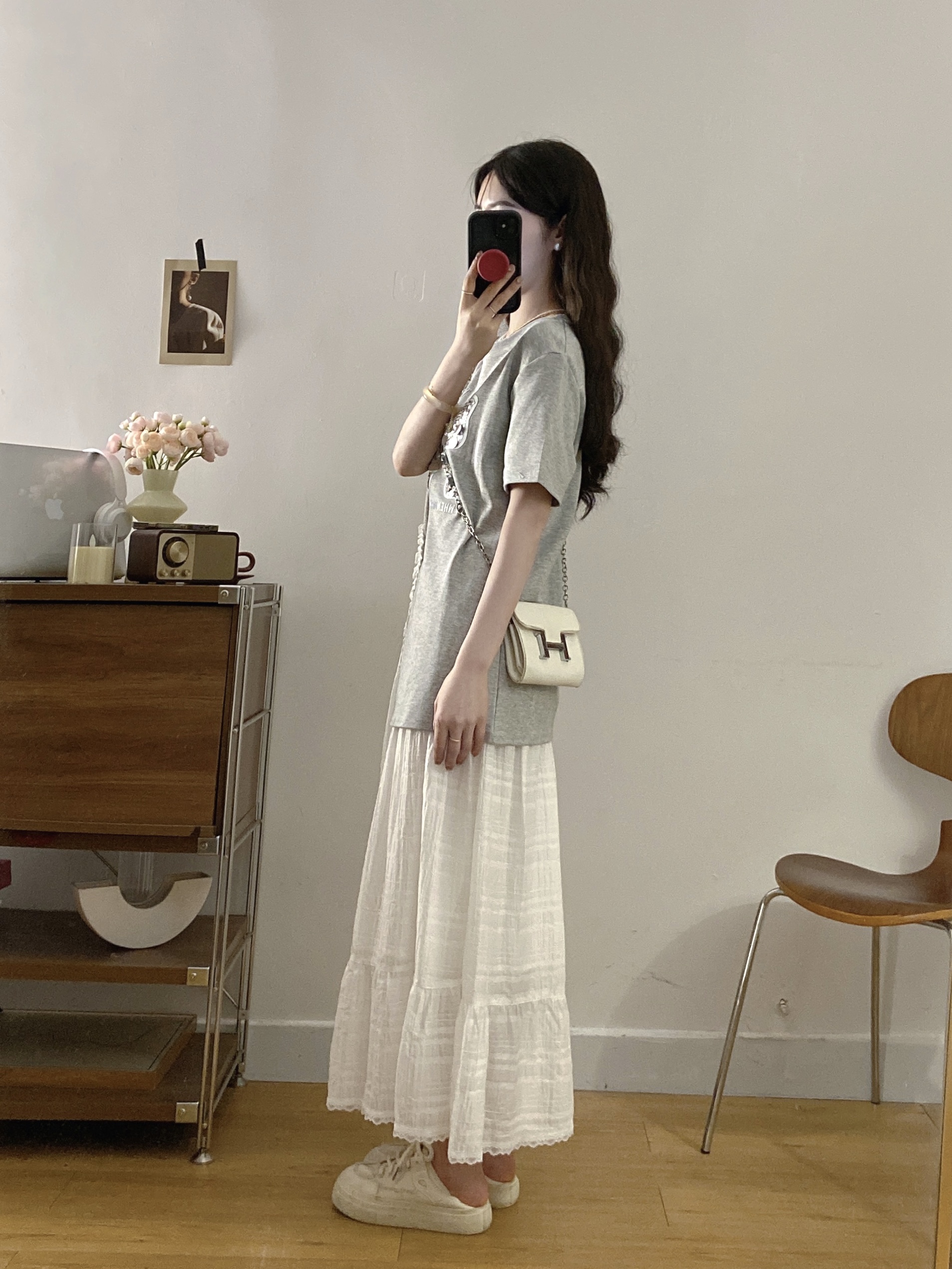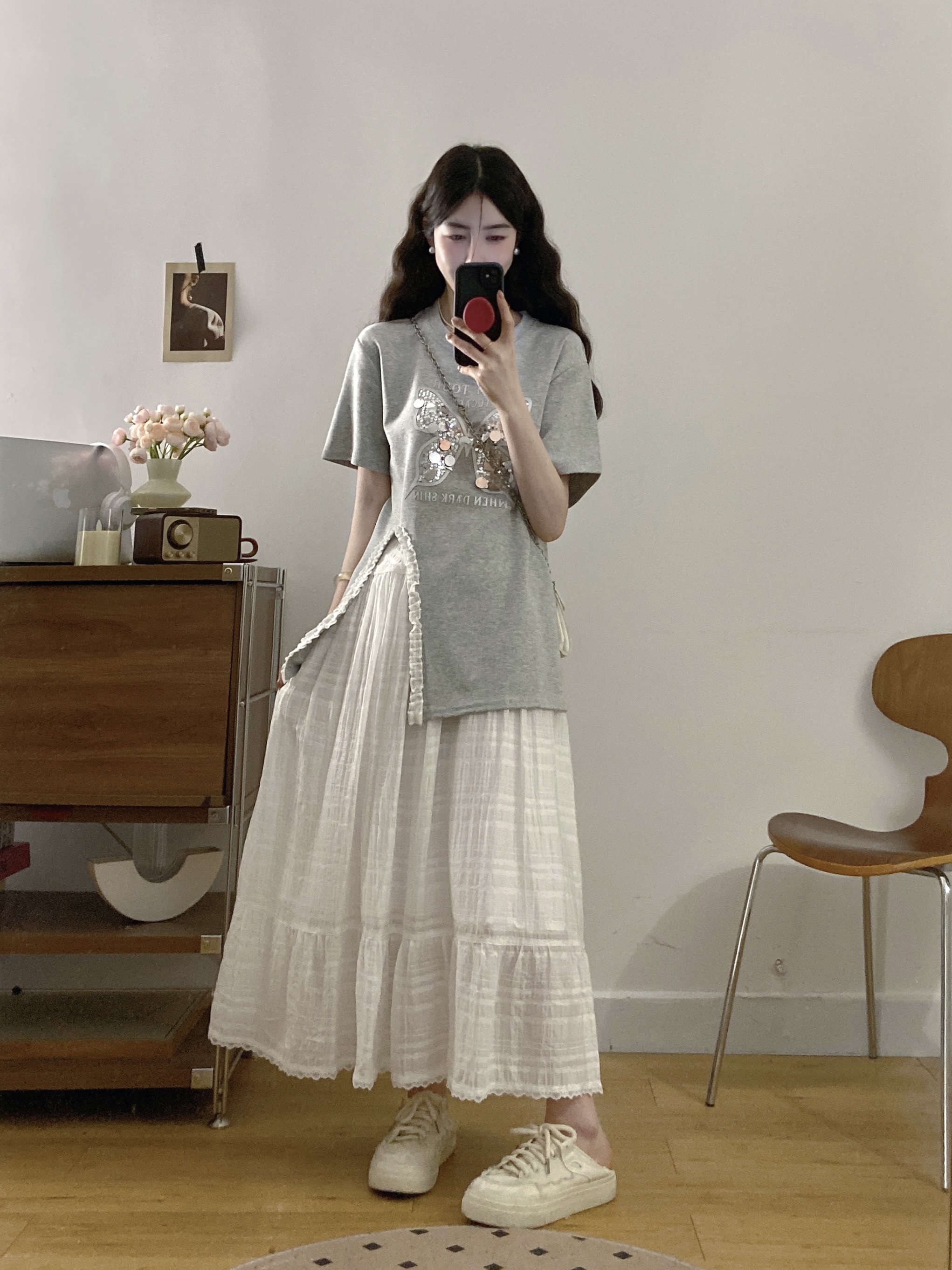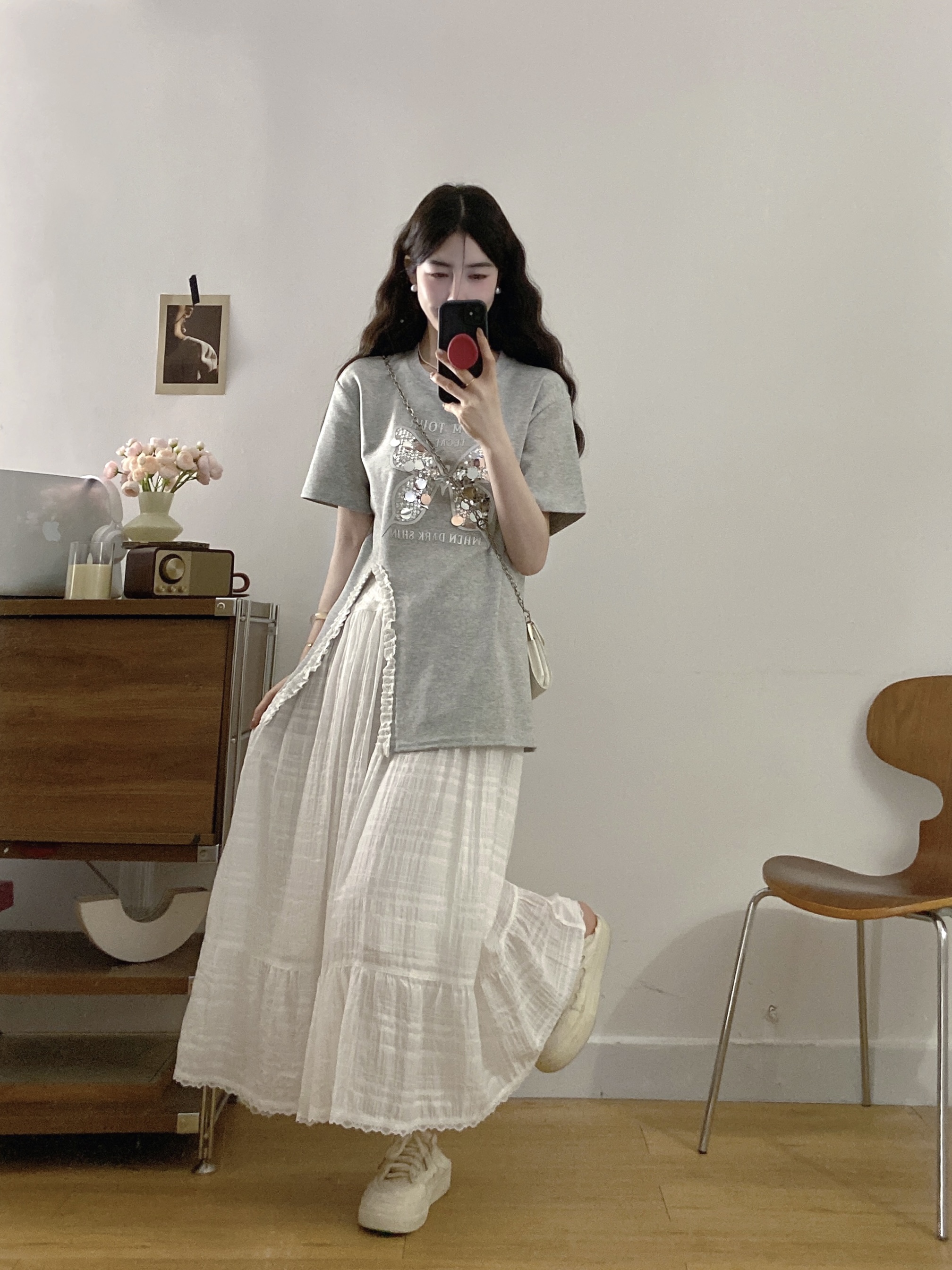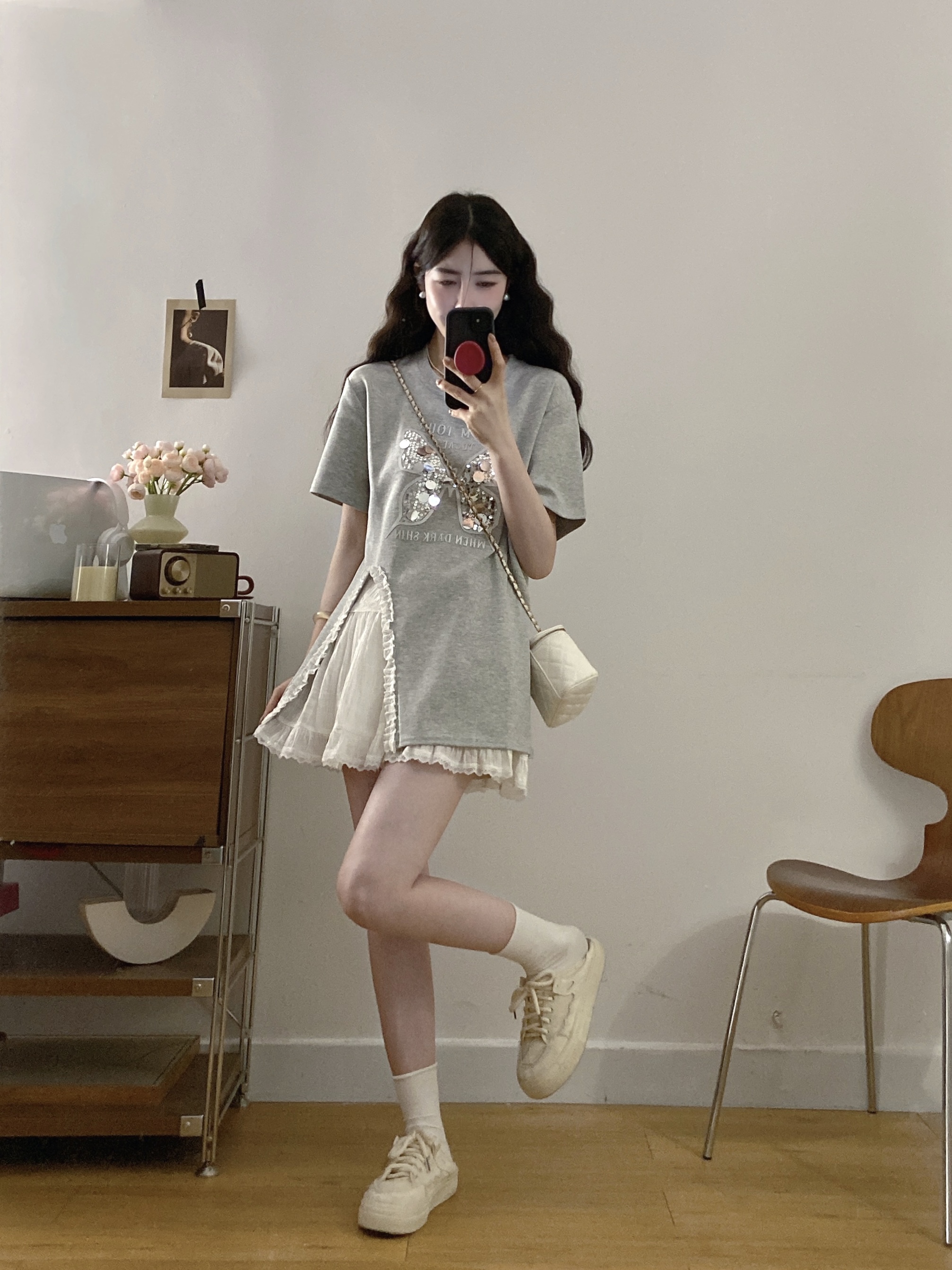 실사 빅 사이즈 여성 의류 2026 여름 새로운 고급 센스 라운드 넥 밝은 회색 색상 반팔 품격 술 치마 세트
