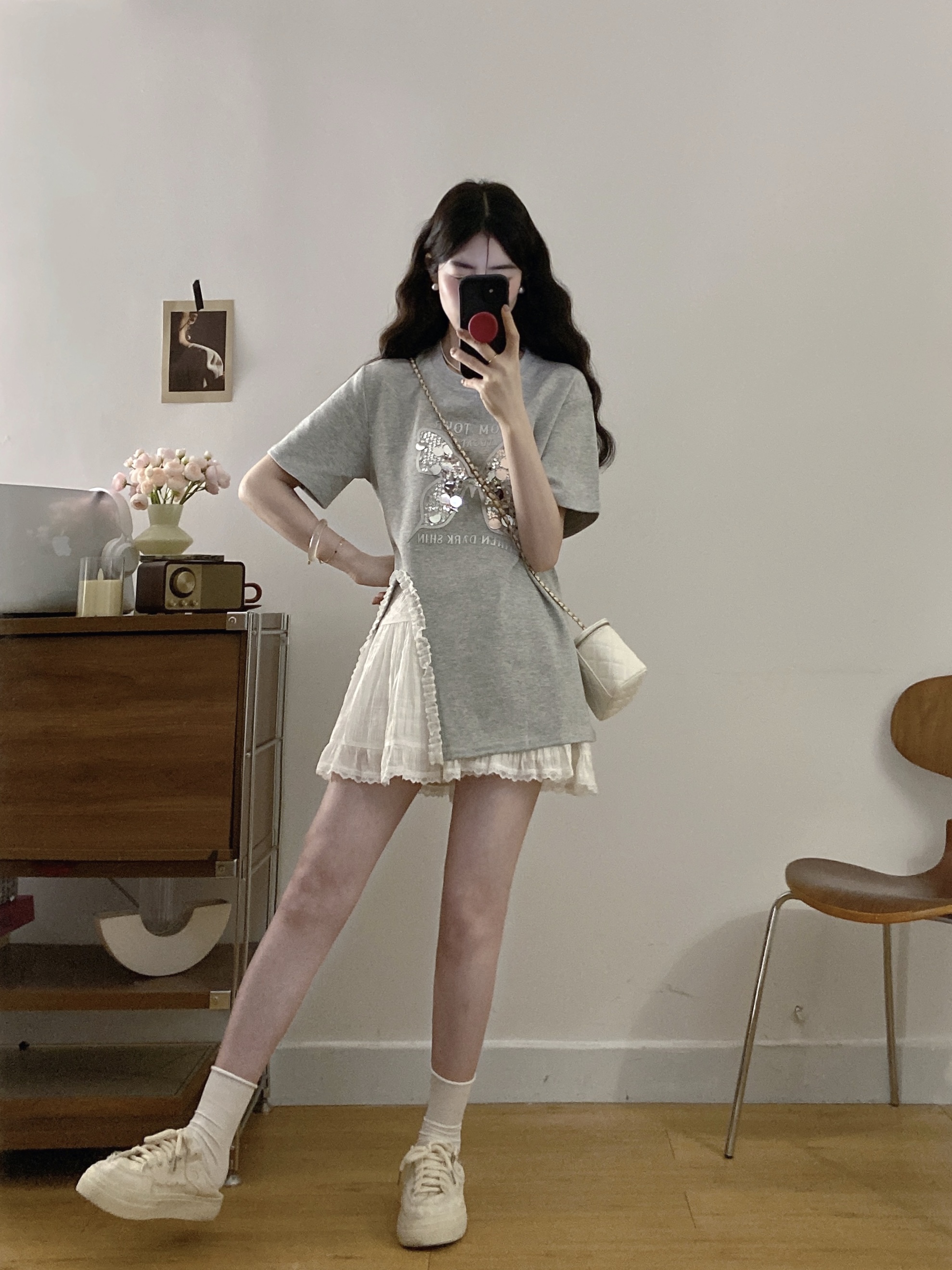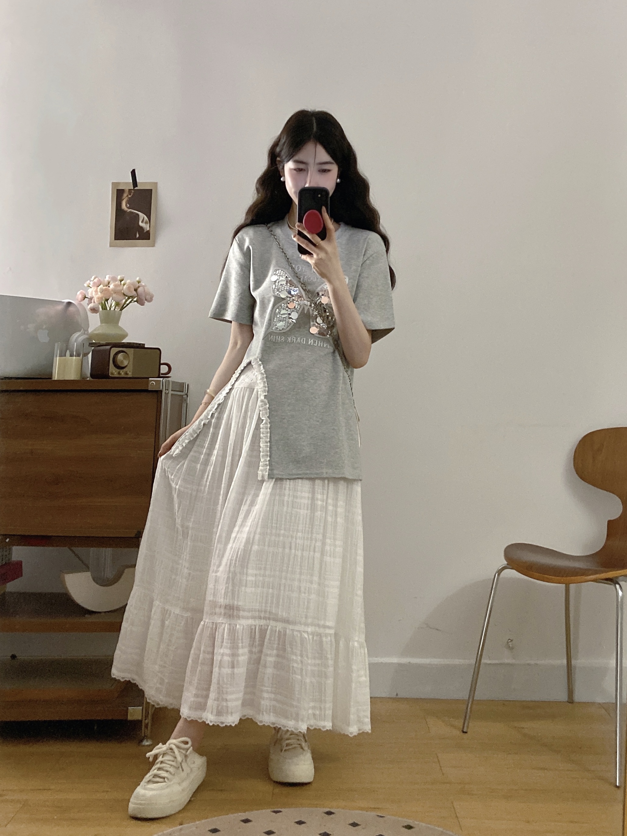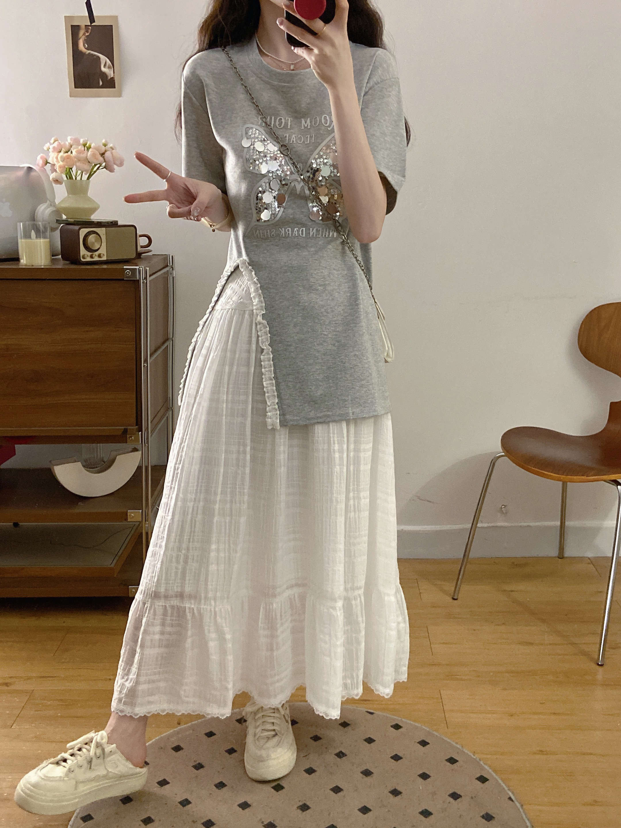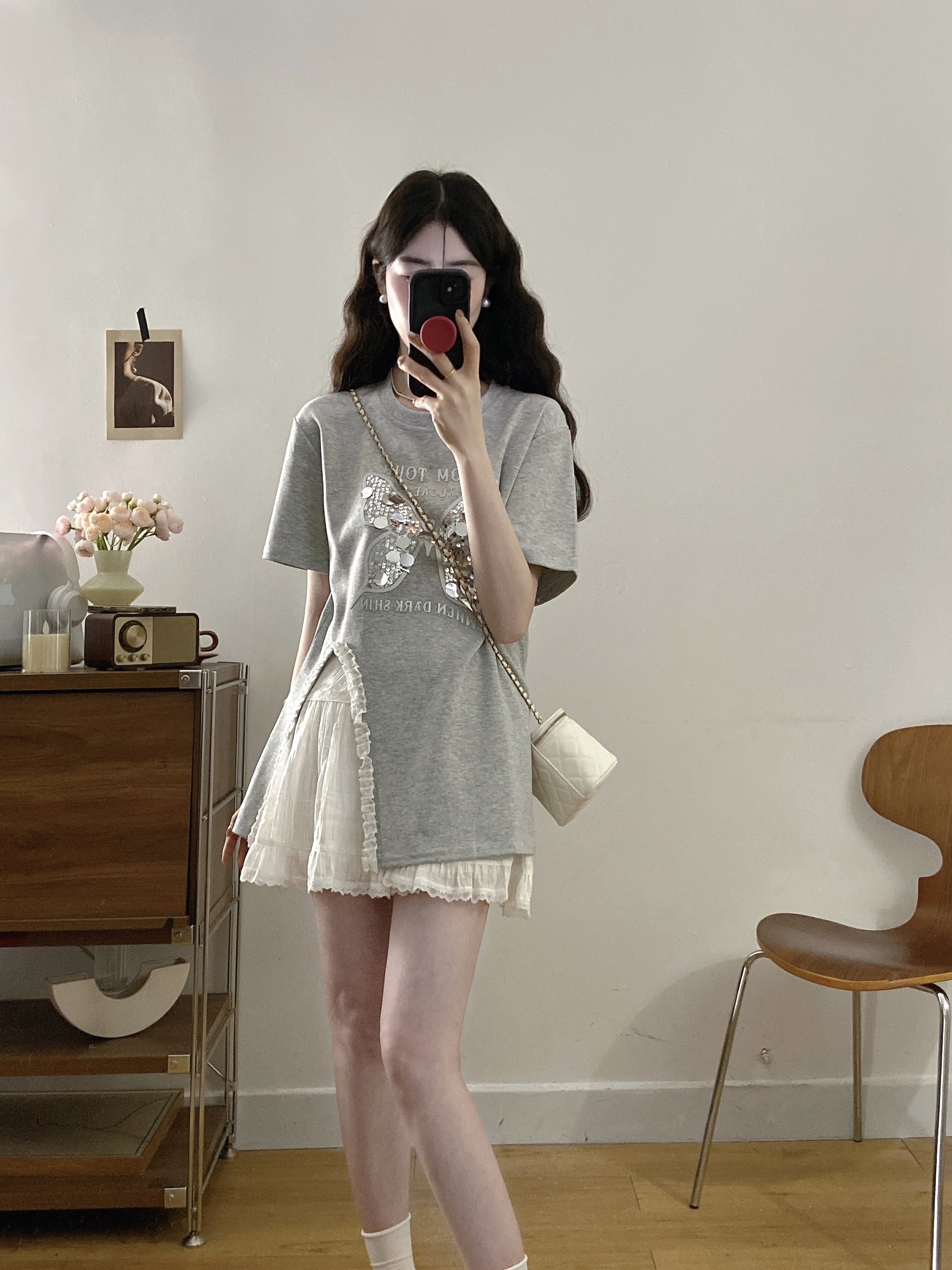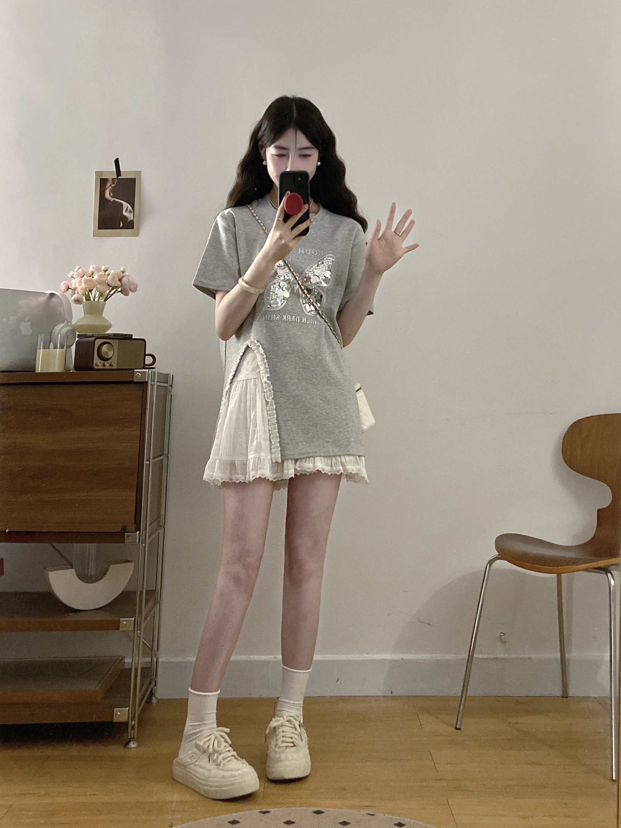 실사 빅 사이즈 여성 의류 2026 여름 새로운 고급 센스 라운드 넥 밝은 회색 색상 반팔 품격 술 치마 세트