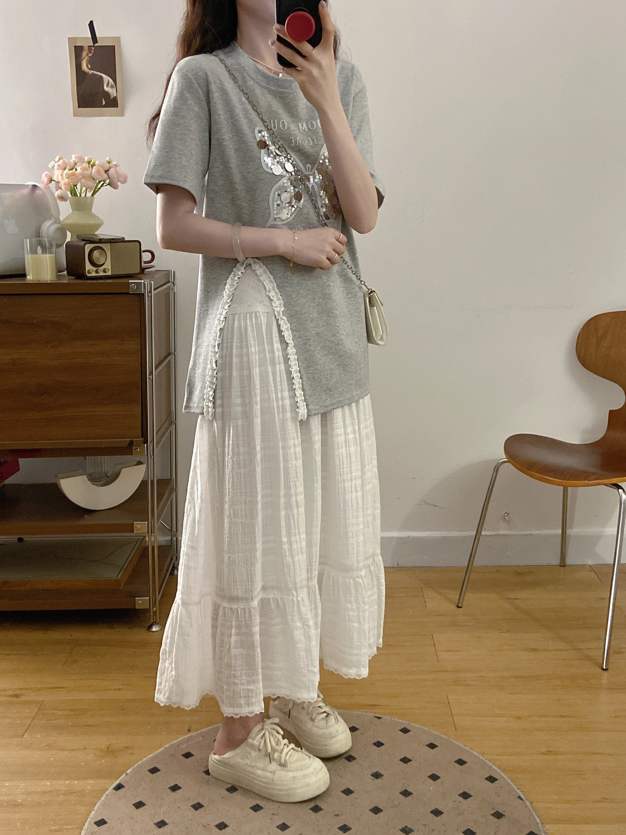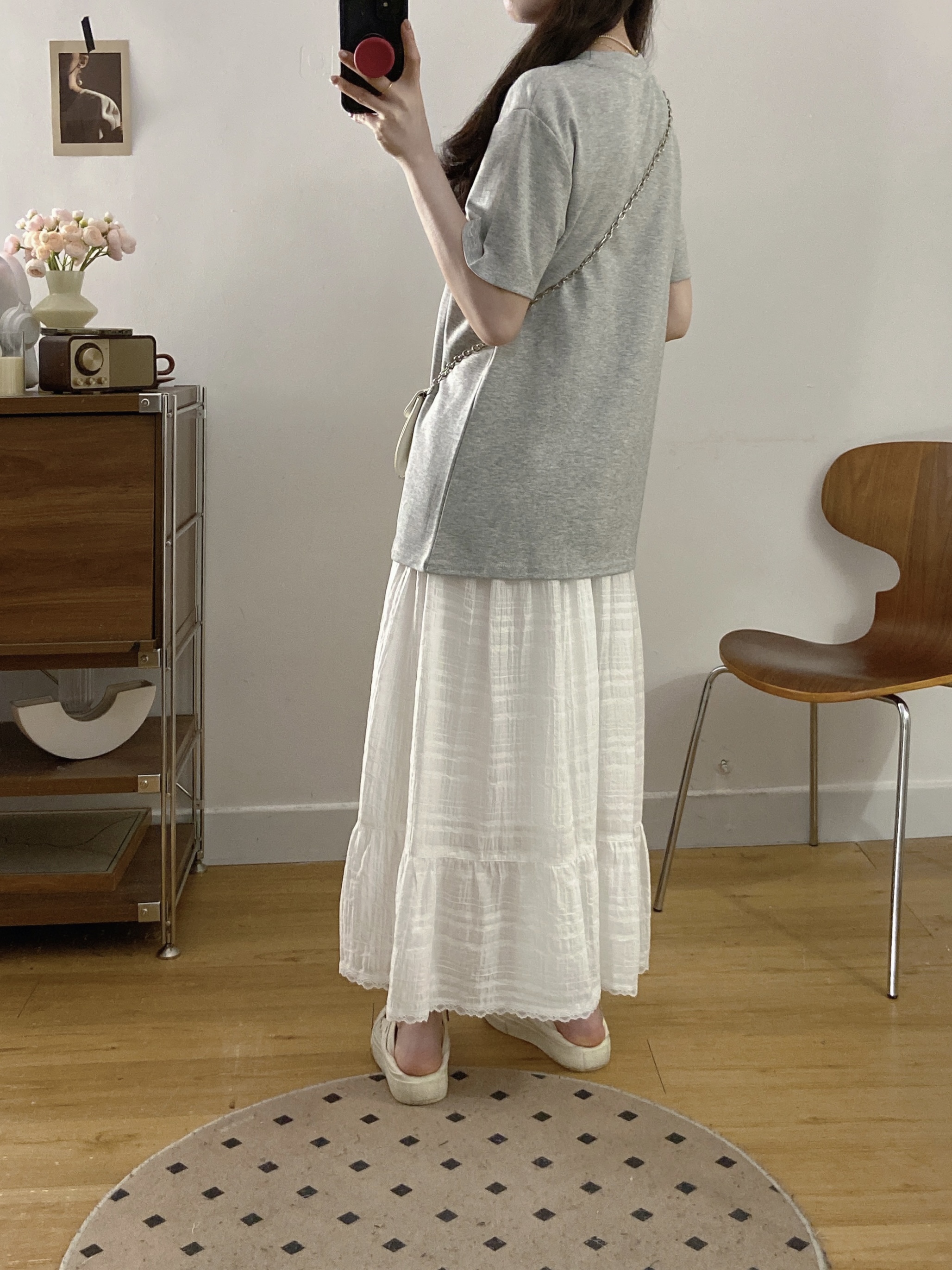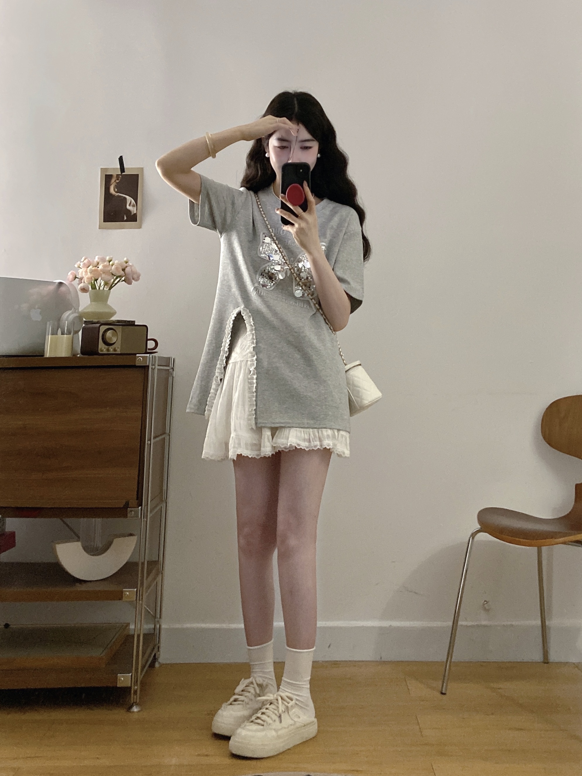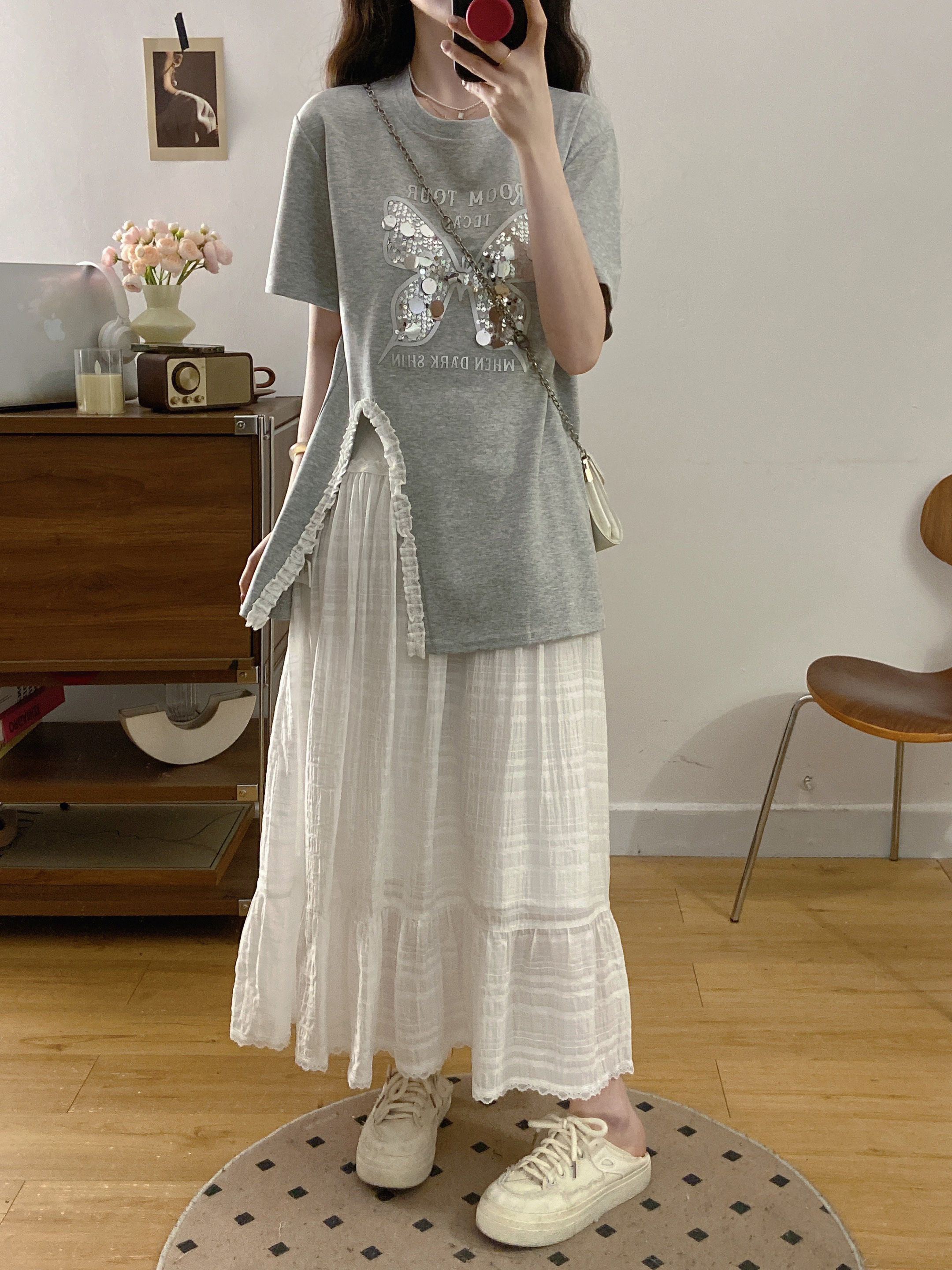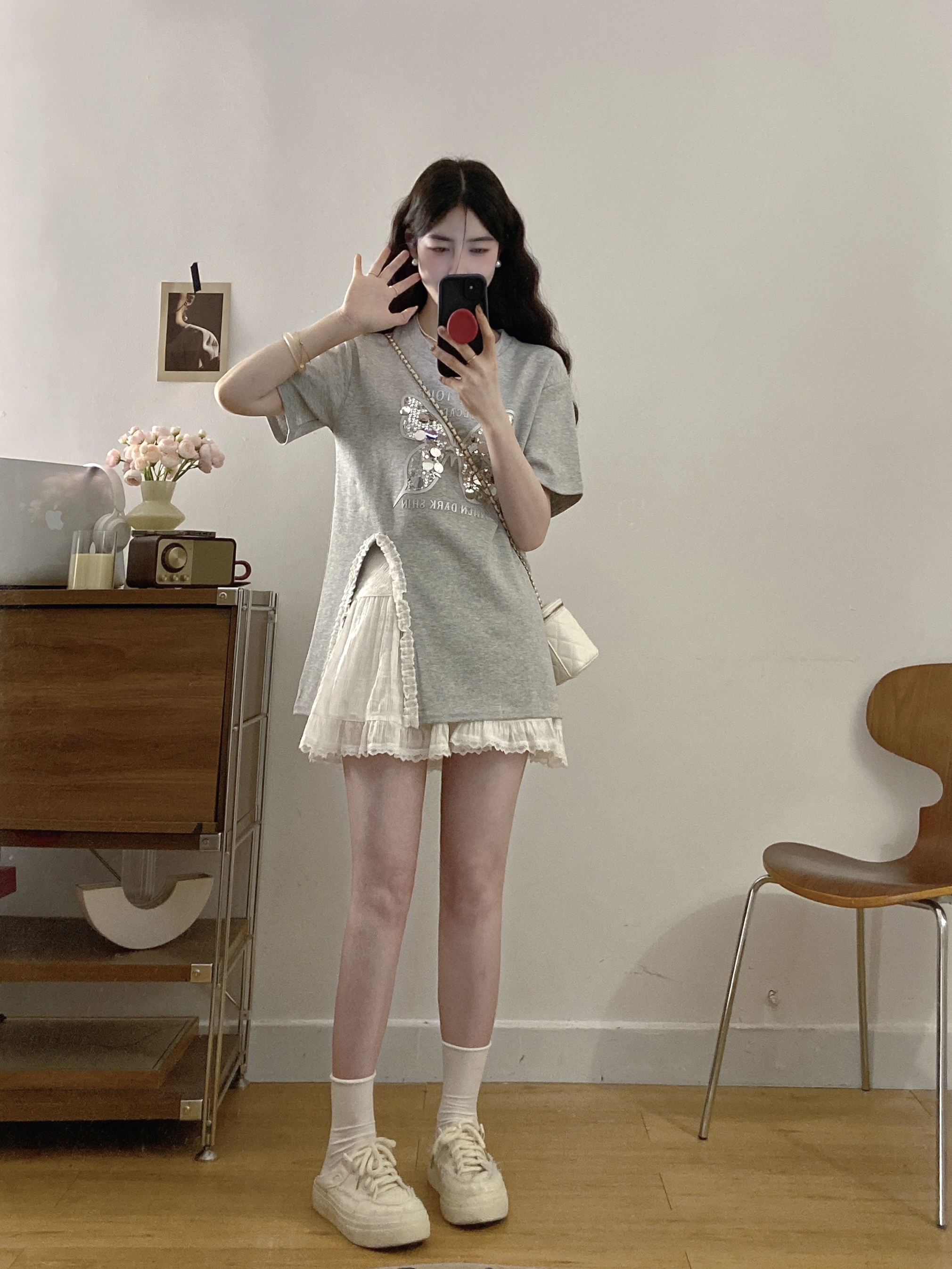 실사 빅 사이즈 여성 의류 2026 여름 새로운 고급 센스 라운드 넥 밝은 회색 색상 반팔 품격 술 치마 세트