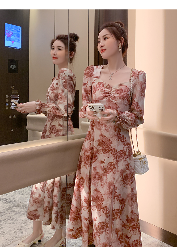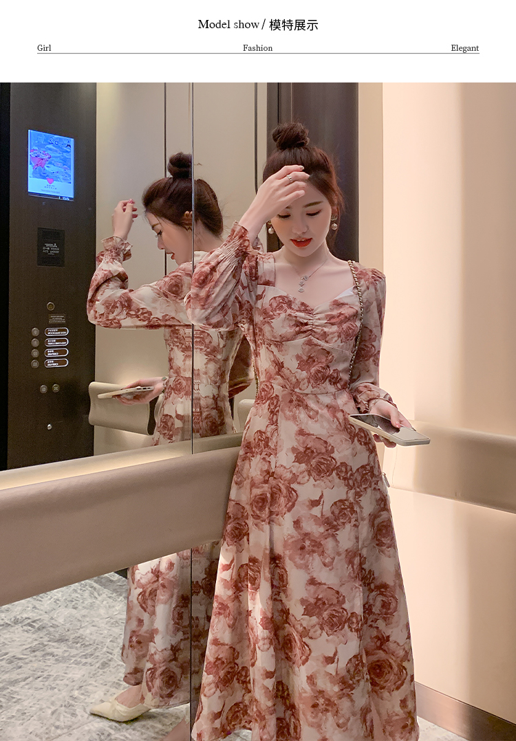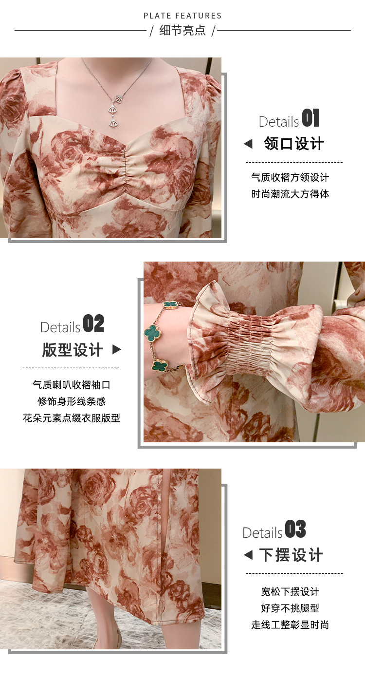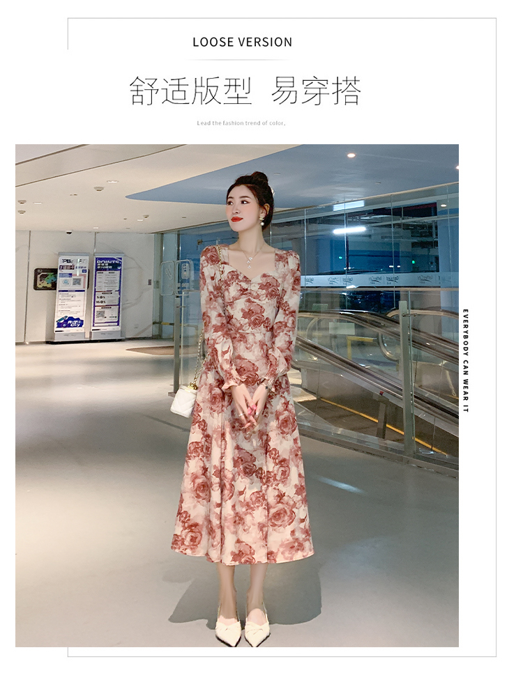 마이크로 지방 mm 봄 가을 빅 사이즈 프랑스식 장미 프린트 여성 드레스 디자인 센스 허리 수축 슬림해 보이는 꽃무늬 길다 치마