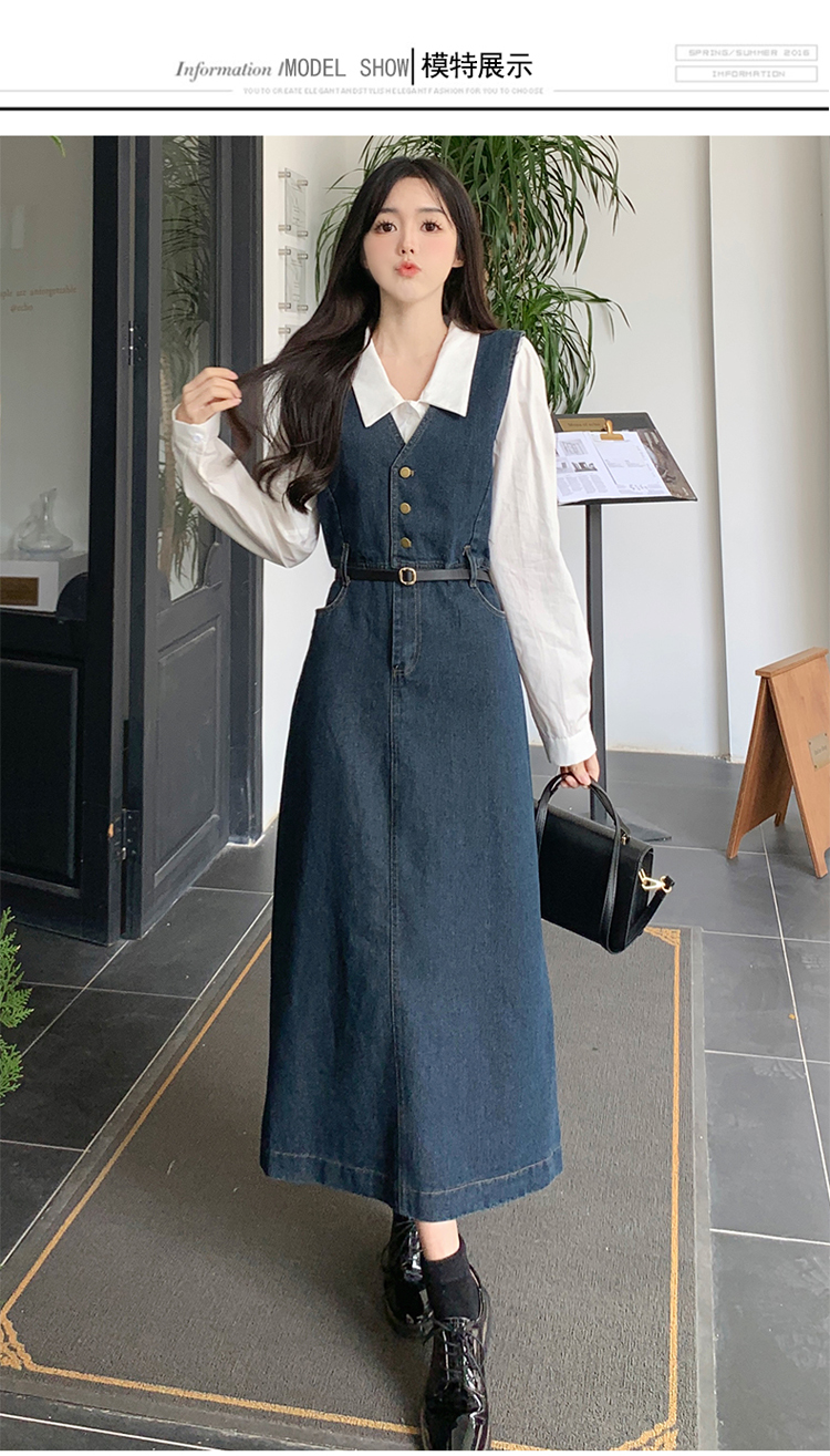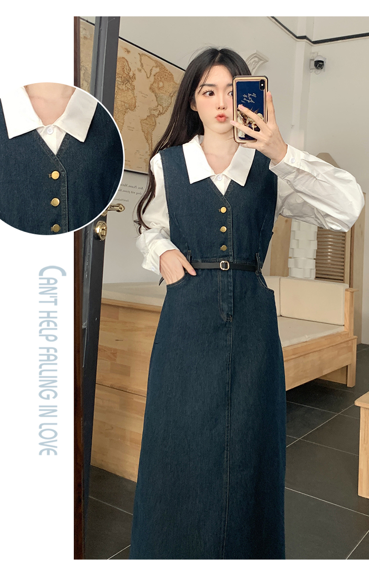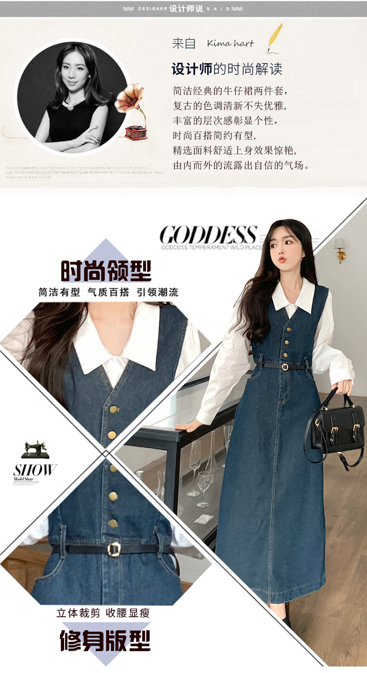 봄 드레스 코디 전체 집합 데님 슬립 드레스 마이크로 지방 mm 허리 수축 슬림해 보이는 품격 조끼 스커트 화이트 셔츠