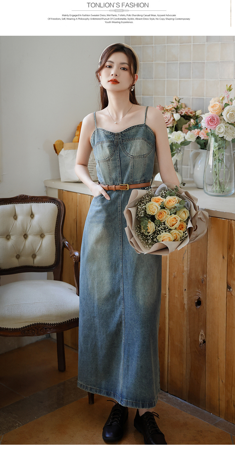 레트로 허리 수축 슬림해 보이는 데님 스커트 슬립 나비 매듭 드레스 품격 몸매 가꾸기 다용도 롱 스커트 여름 여성
