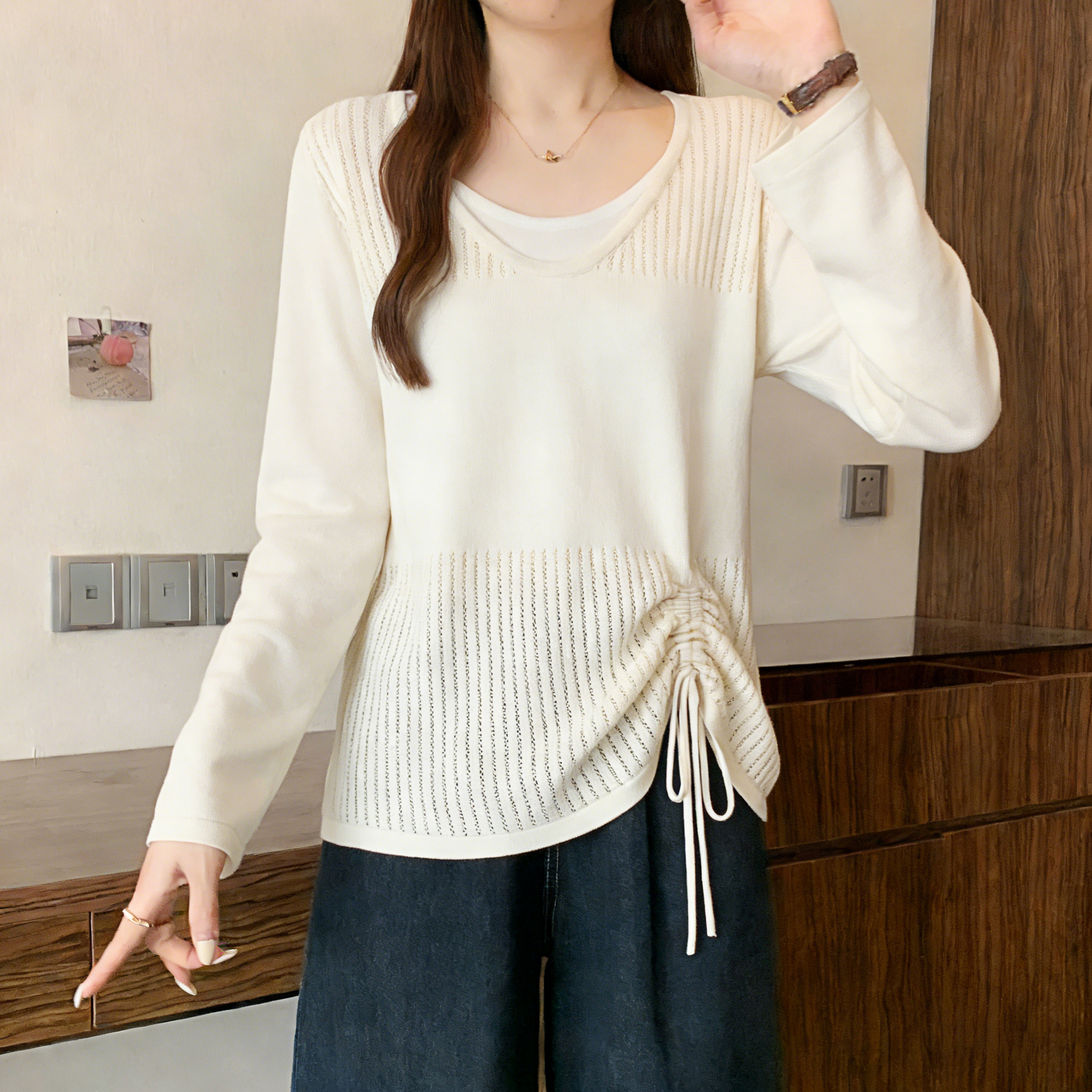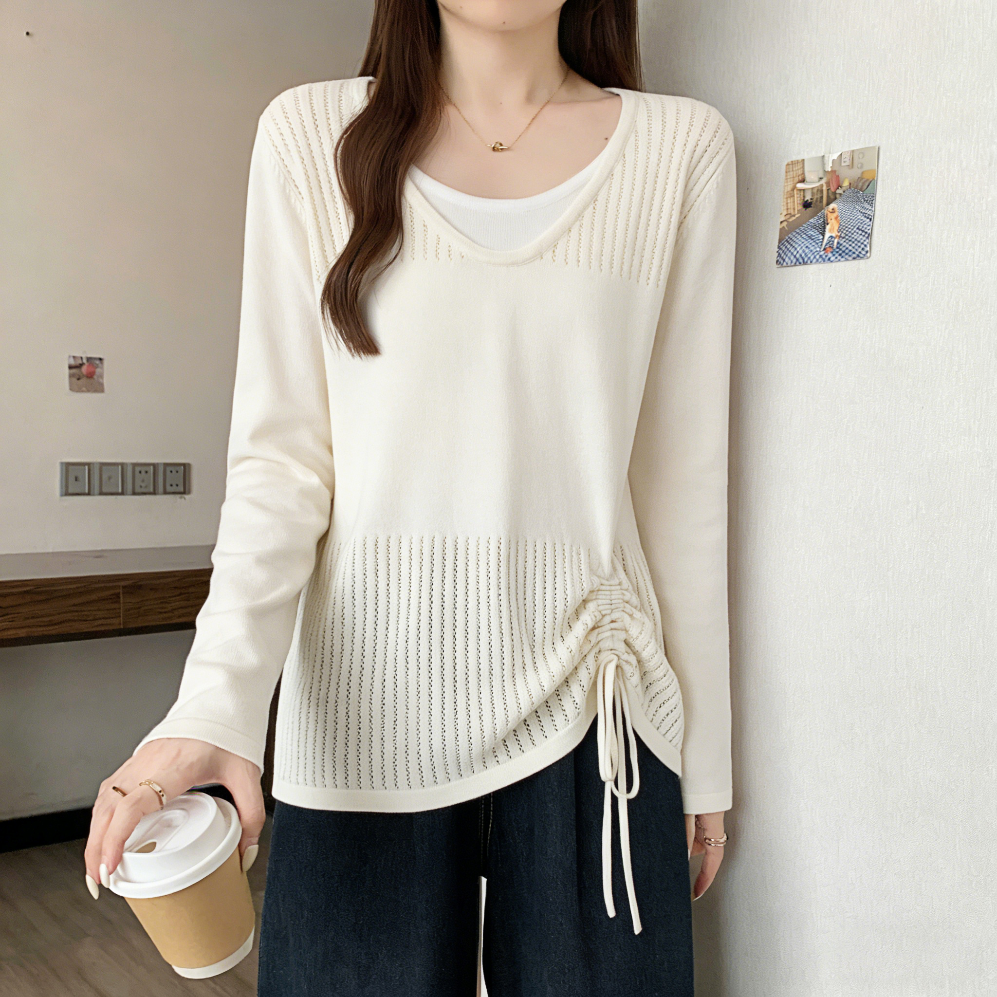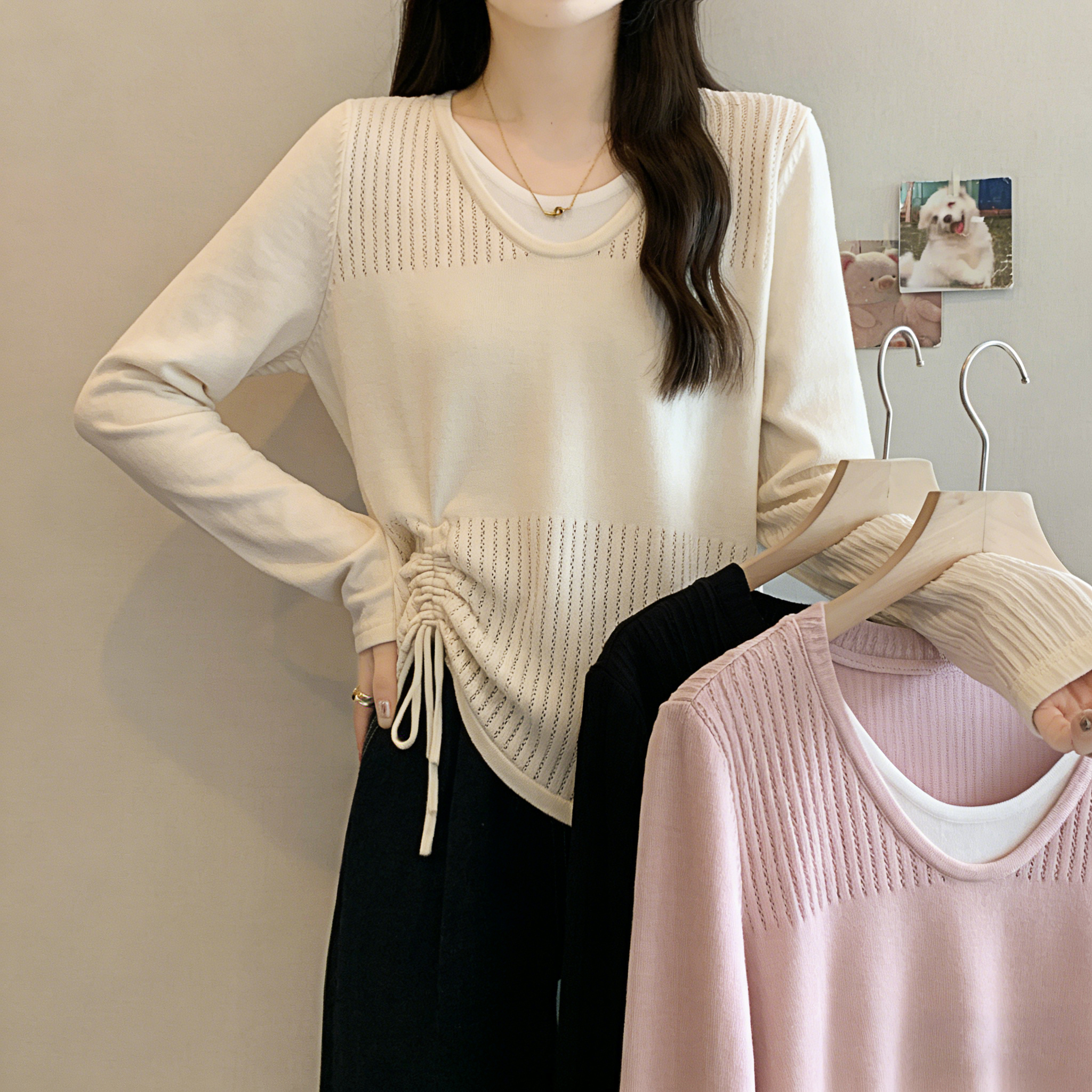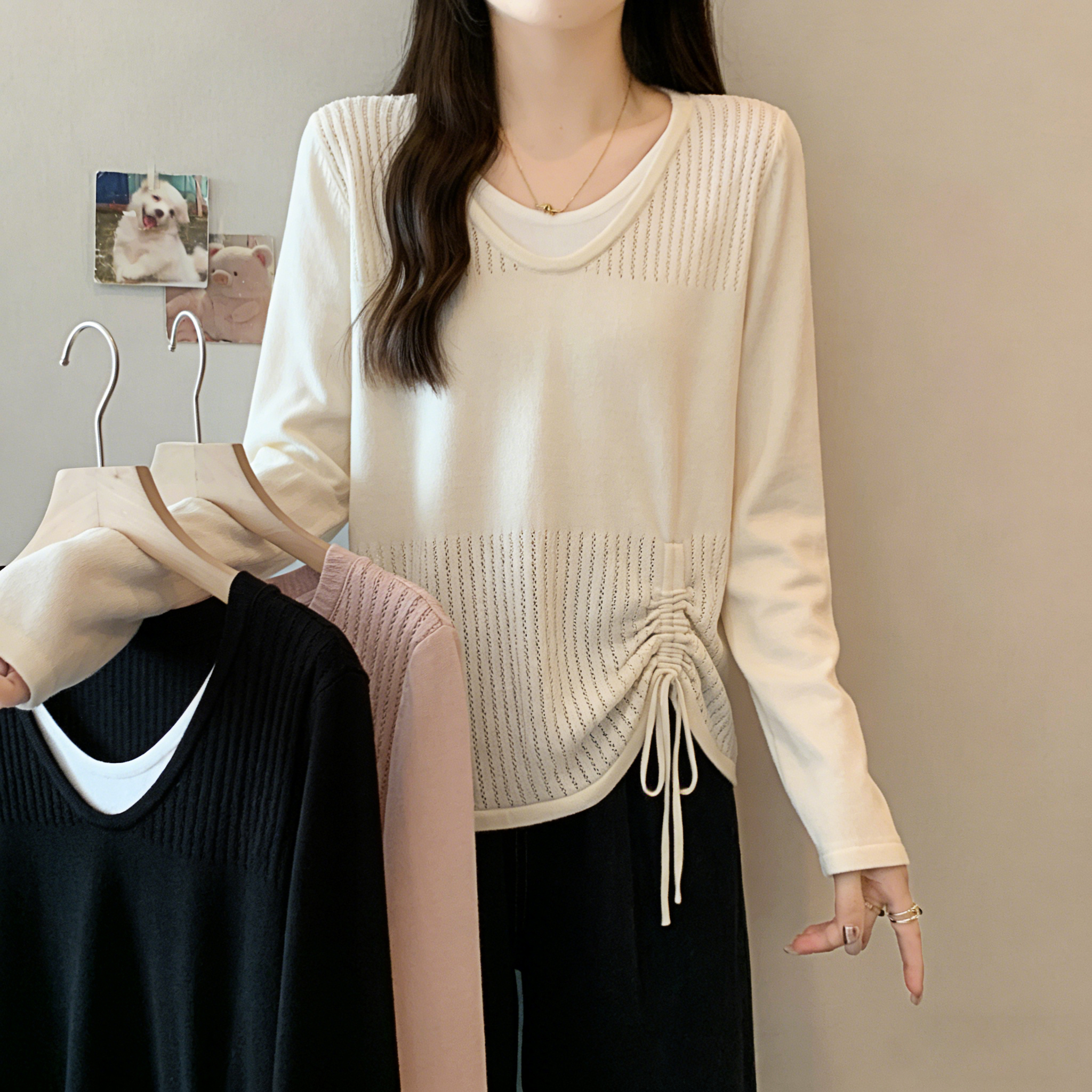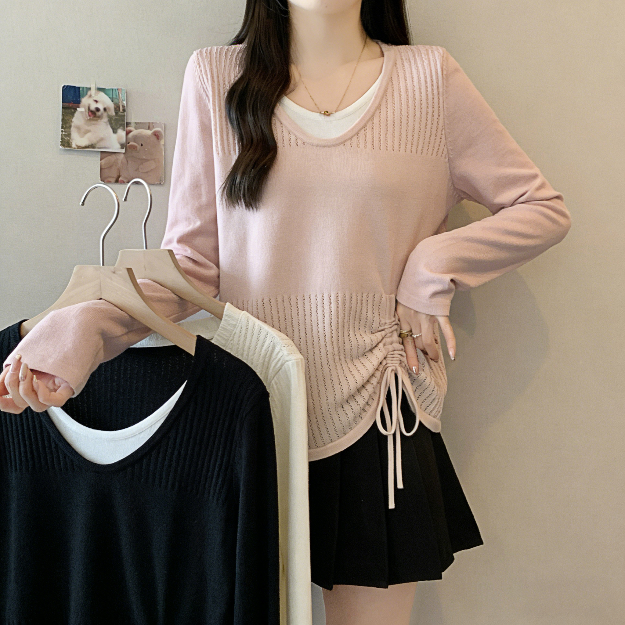실사 2026 봄 빅 사이즈 여성 의류 지방 mm 페이크 레이어드 니트 스웨터 디자인 센스 펌프 로프 표지 고기 슬림해 보이는 기본 셔츠