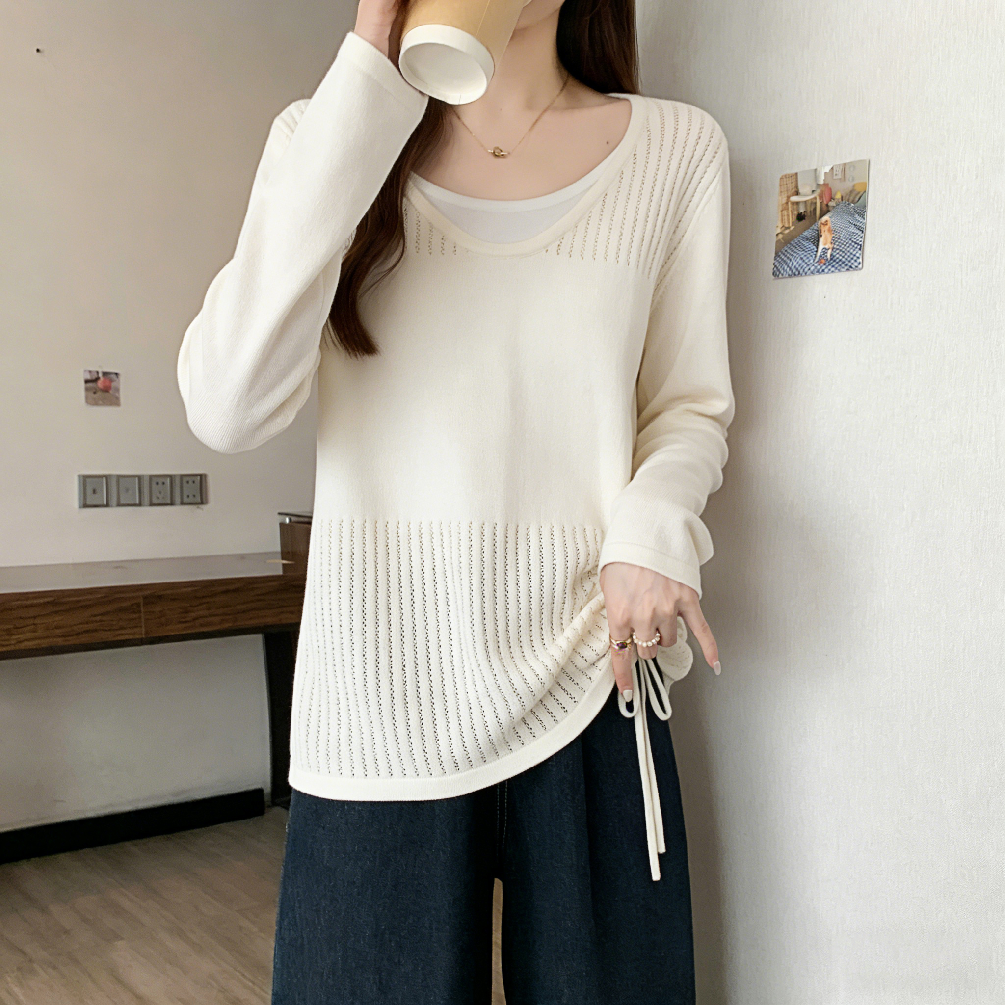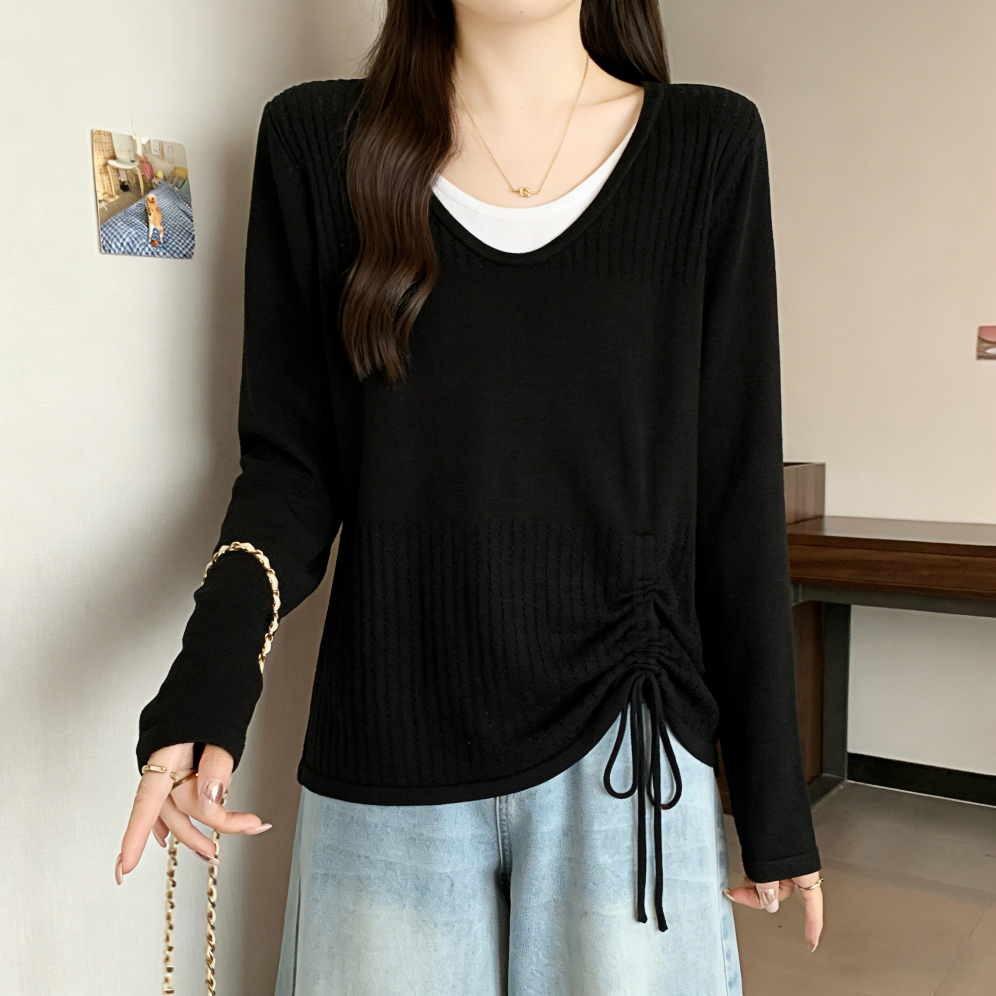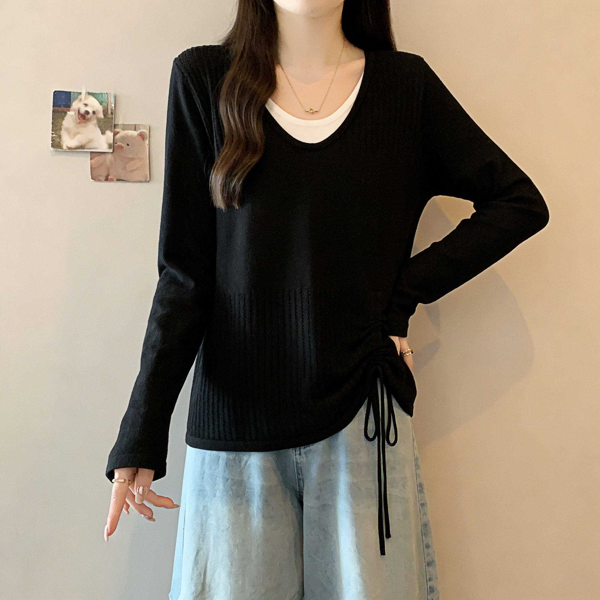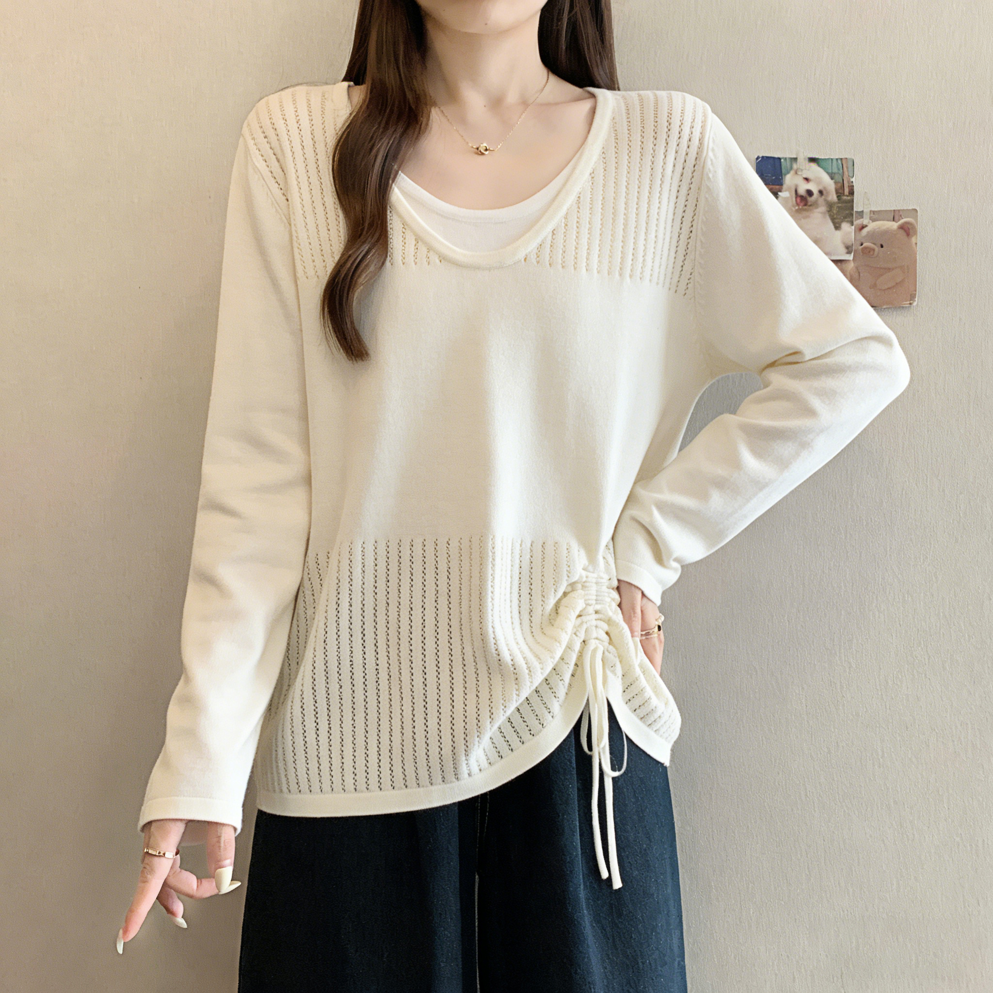실사 2026 봄 빅 사이즈 여성 의류 지방 mm 페이크 레이어드 니트 스웨터 디자인 센스 펌프 로프 표지 고기 슬림해 보이는 기본 셔츠