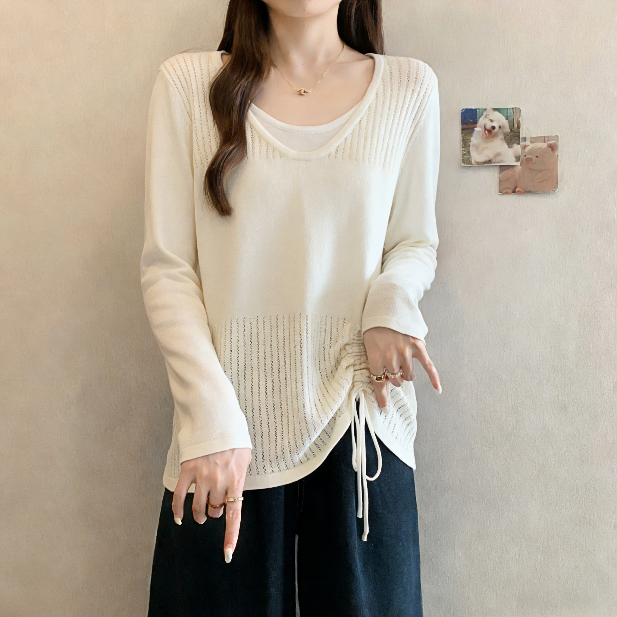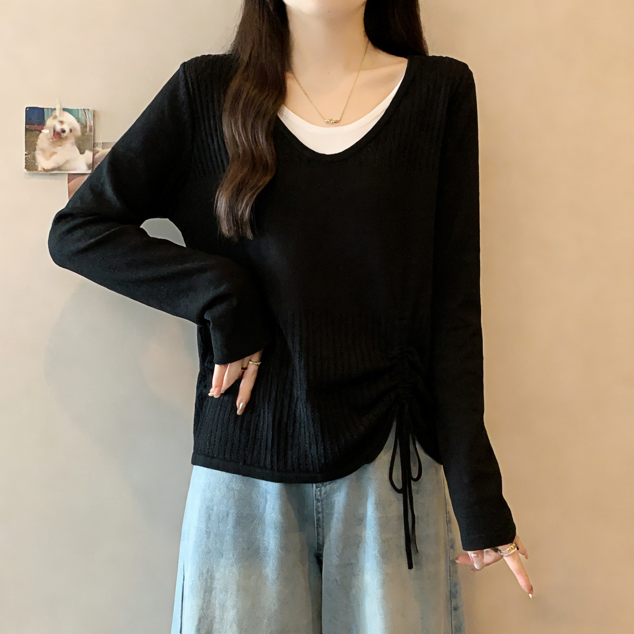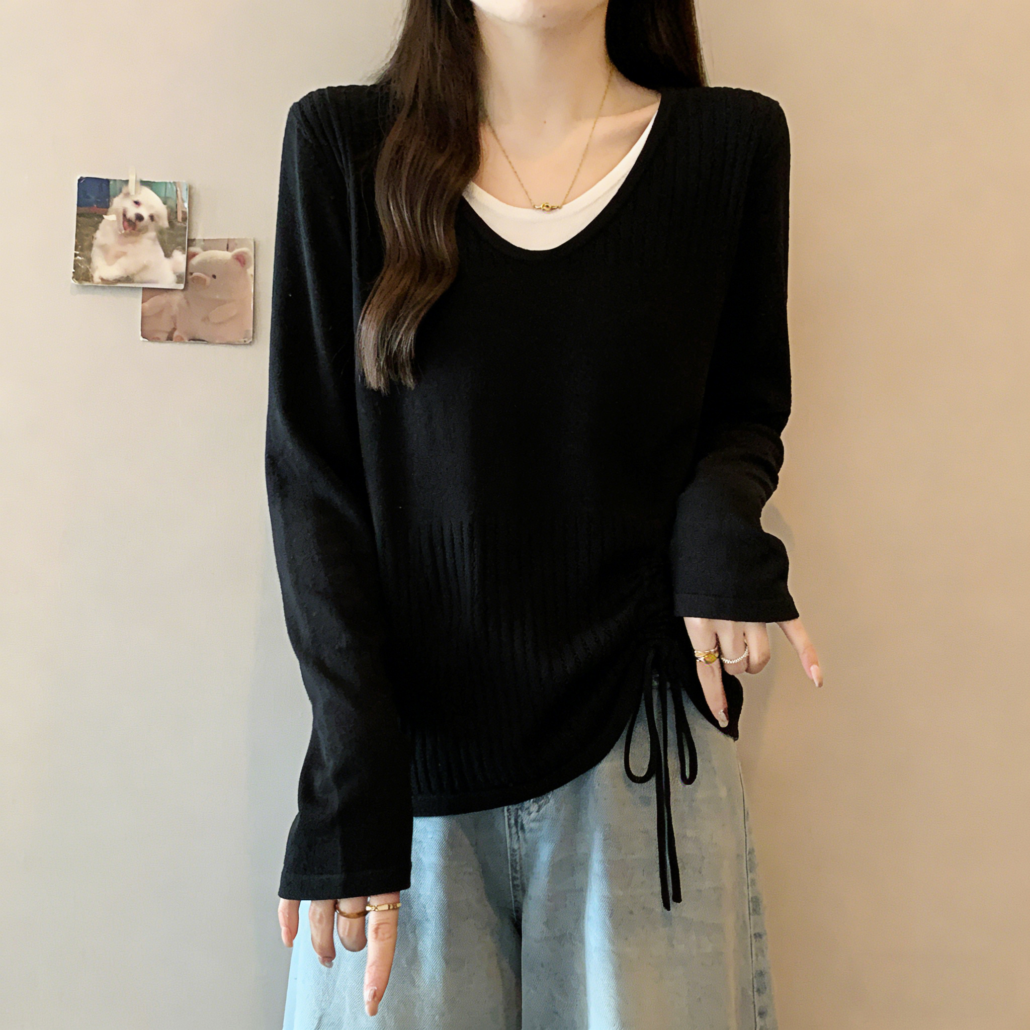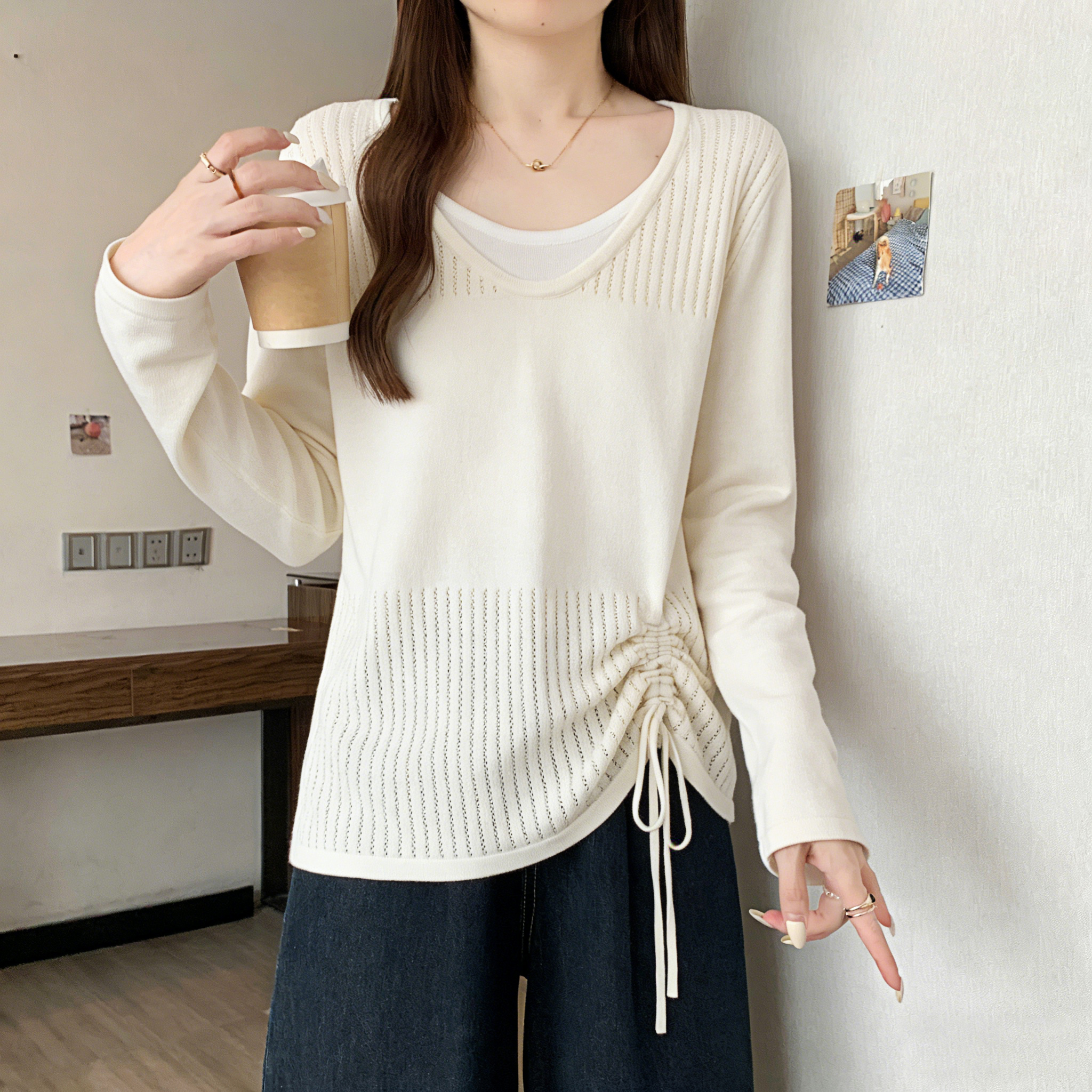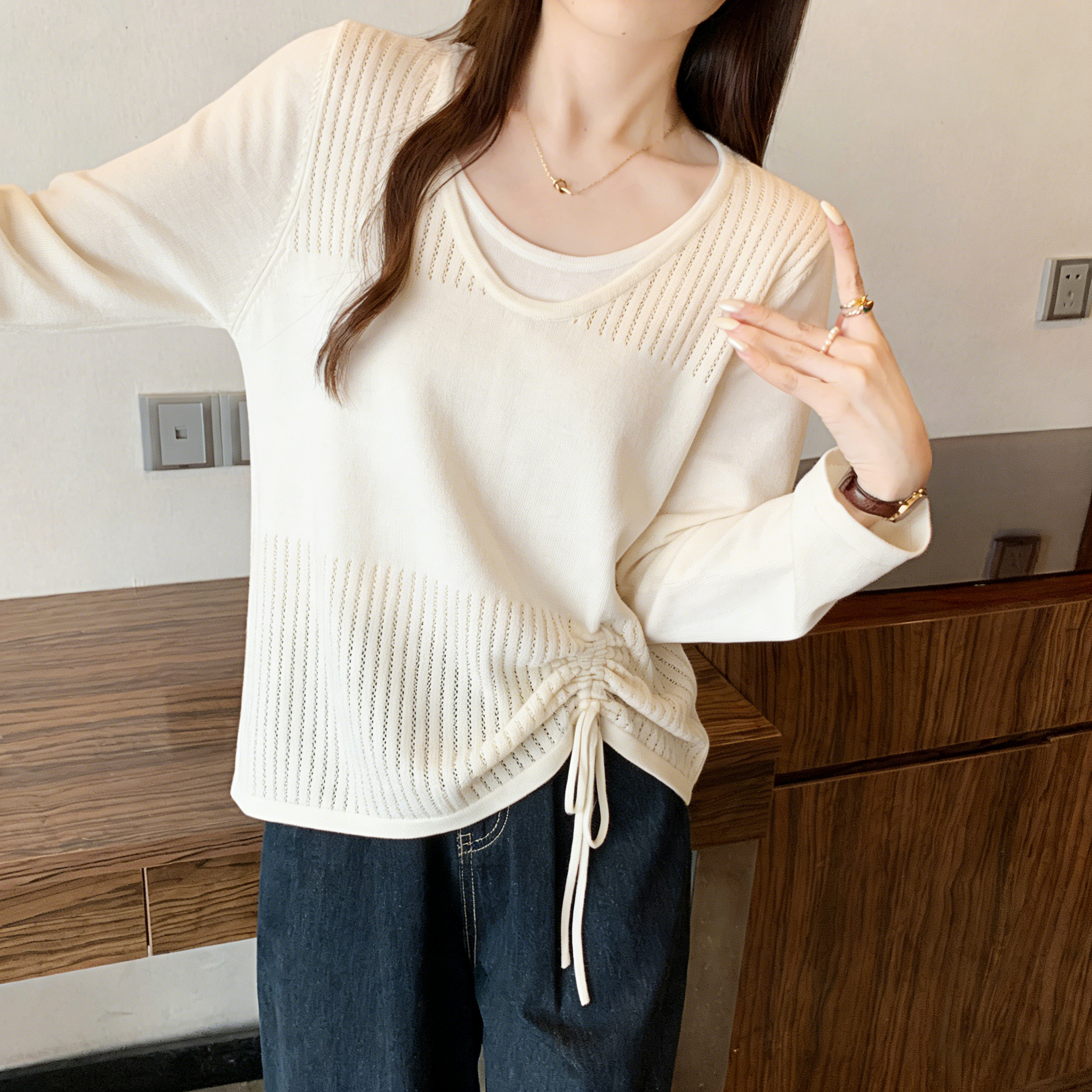 실사 2026 봄 빅 사이즈 여성 의류 지방 mm 페이크 레이어드 니트 스웨터 디자인 센스 펌프 로프 표지 고기 슬림해 보이는 기본 셔츠