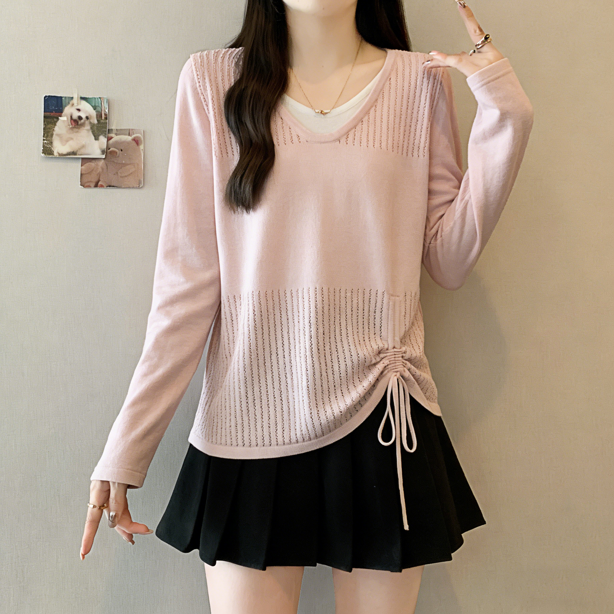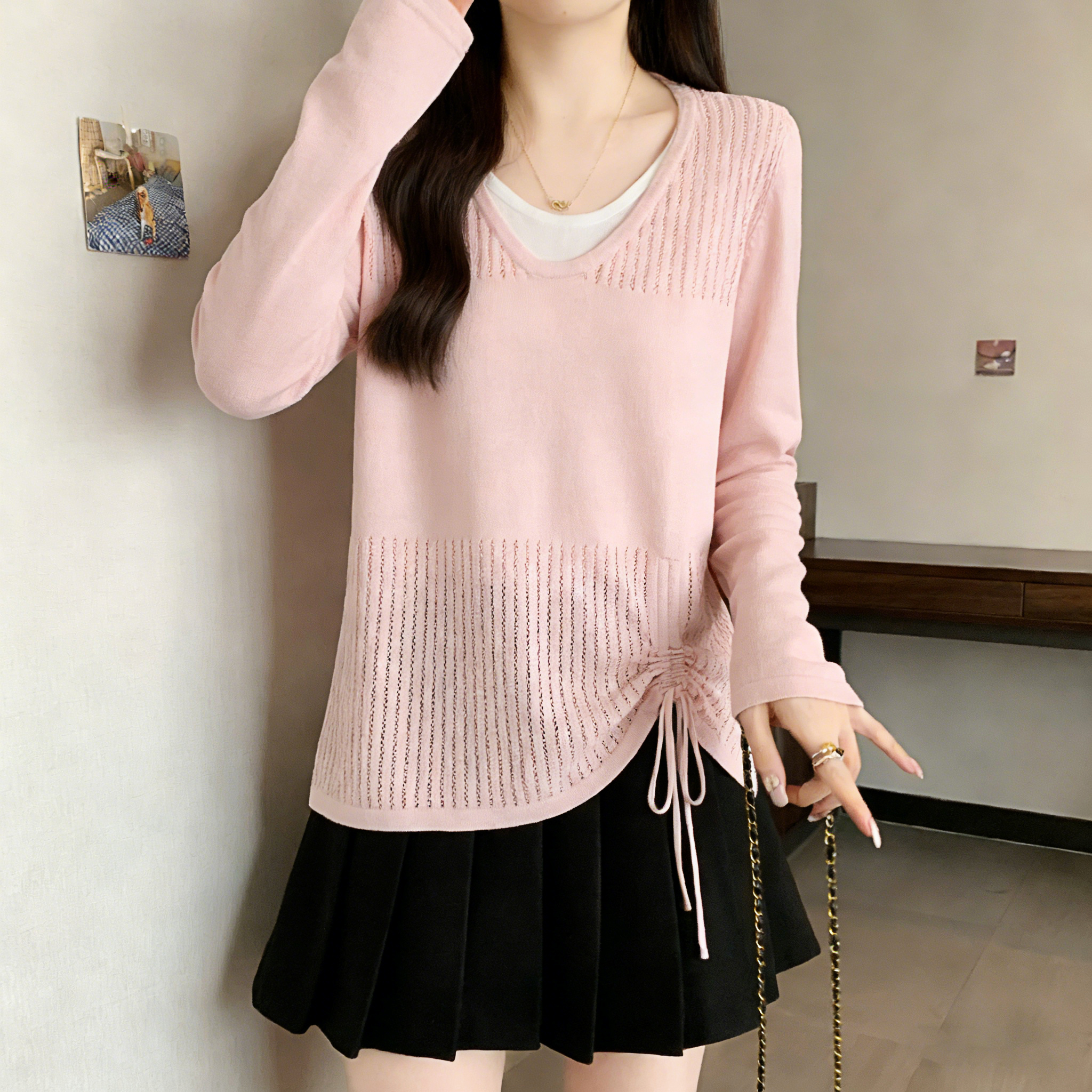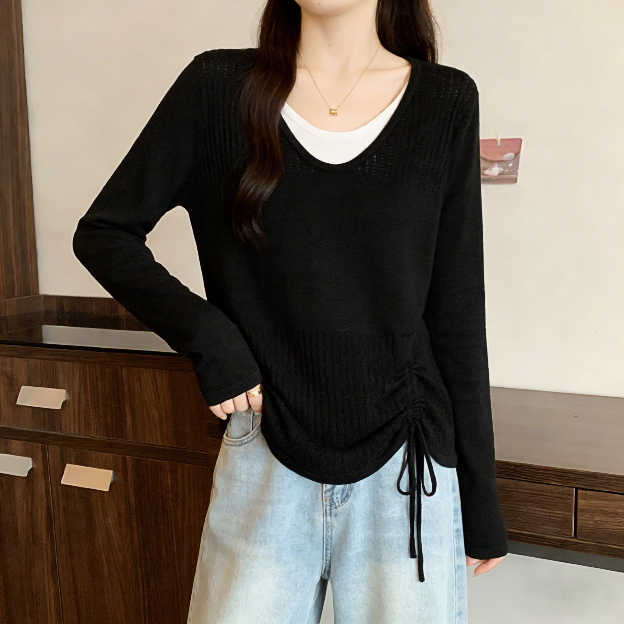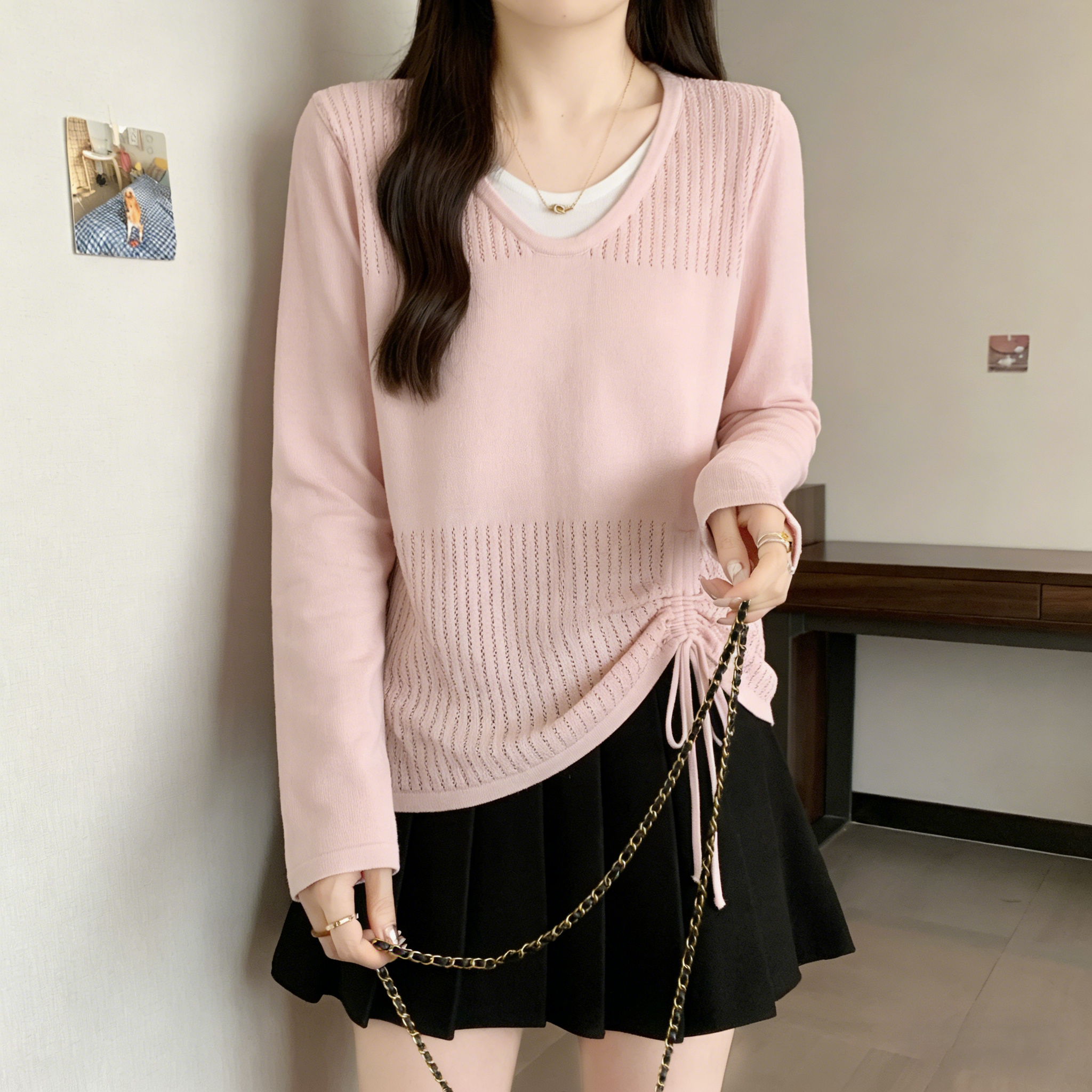 실사 2026 봄 빅 사이즈 여성 의류 지방 mm 페이크 레이어드 니트 스웨터 디자인 센스 펌프 로프 표지 고기 슬림해 보이는 기본 셔츠