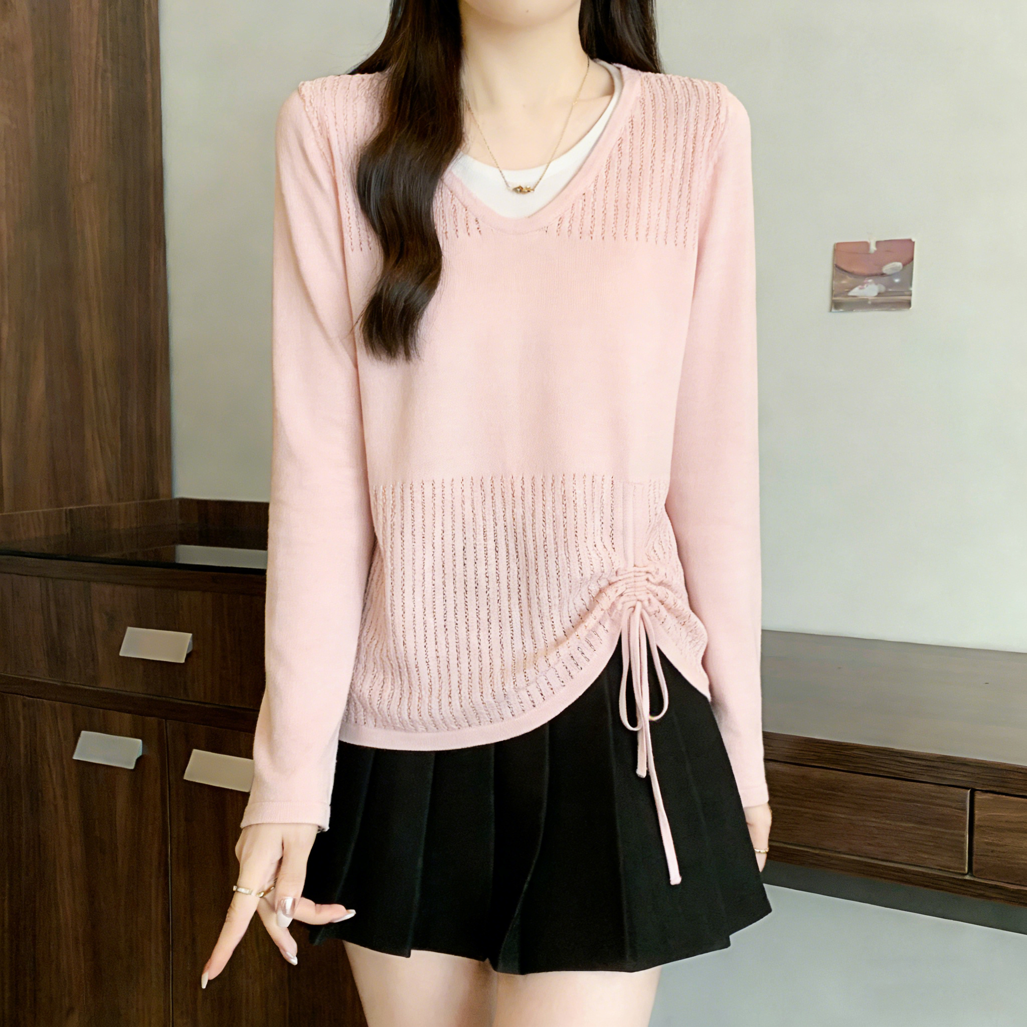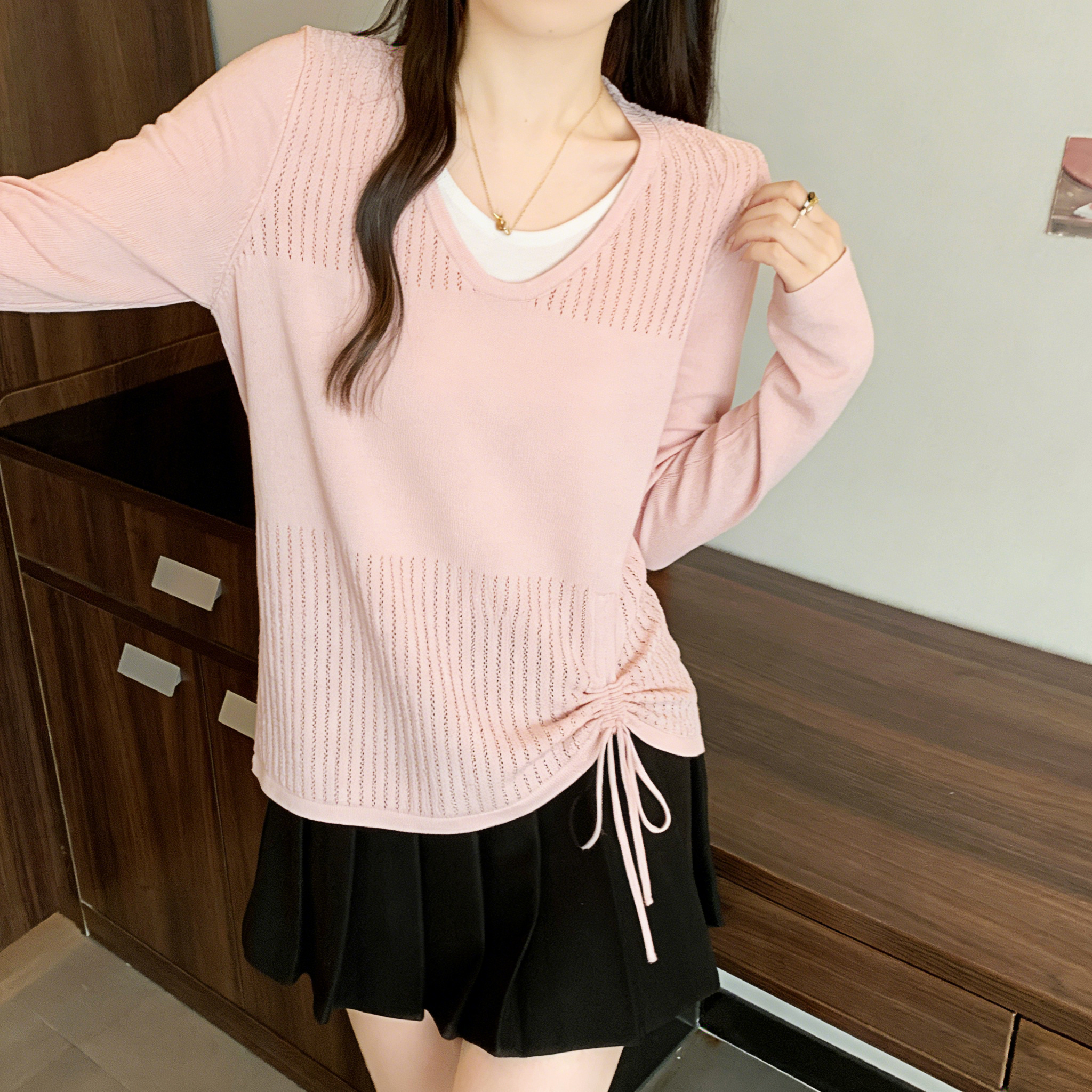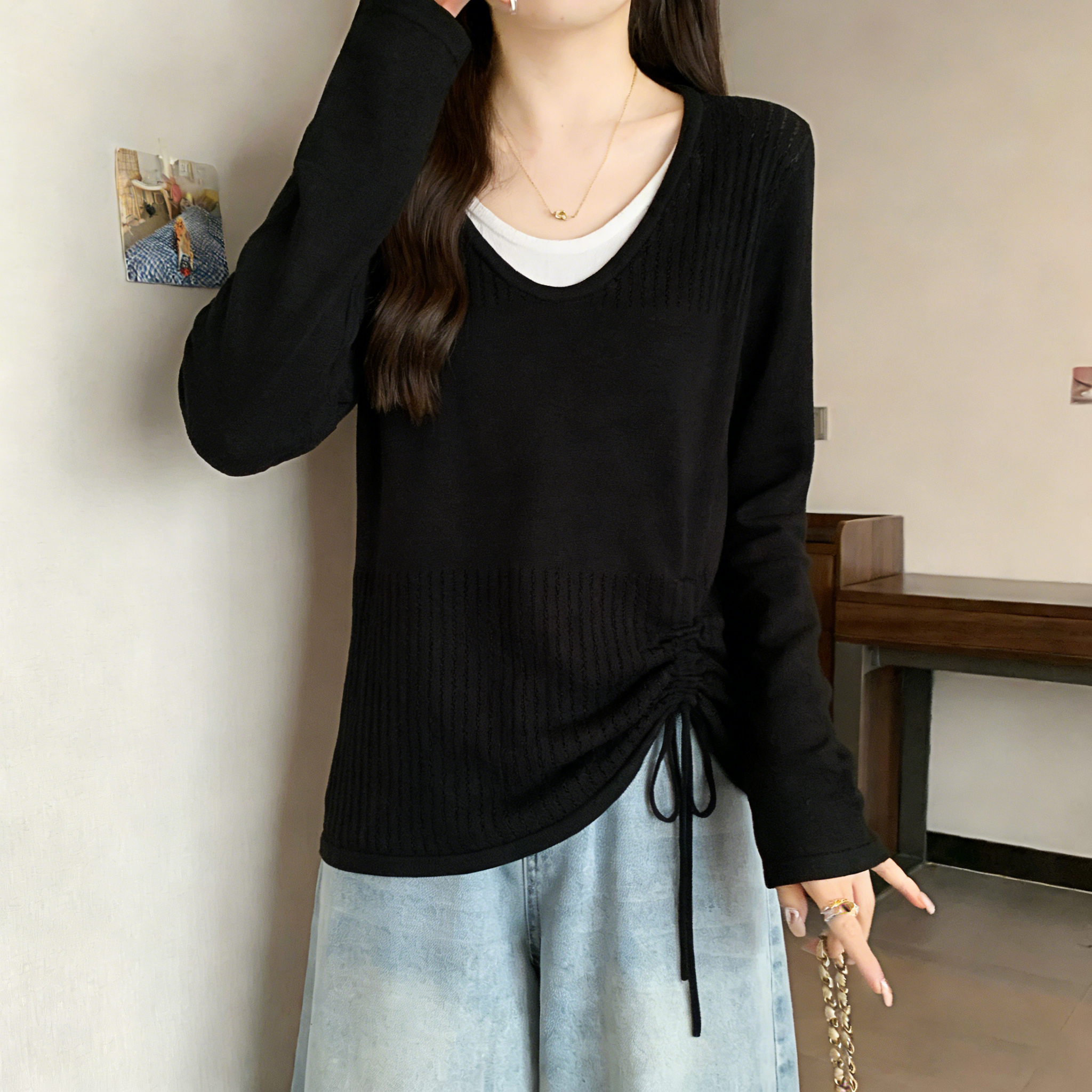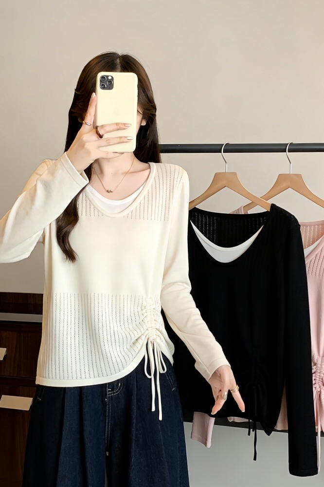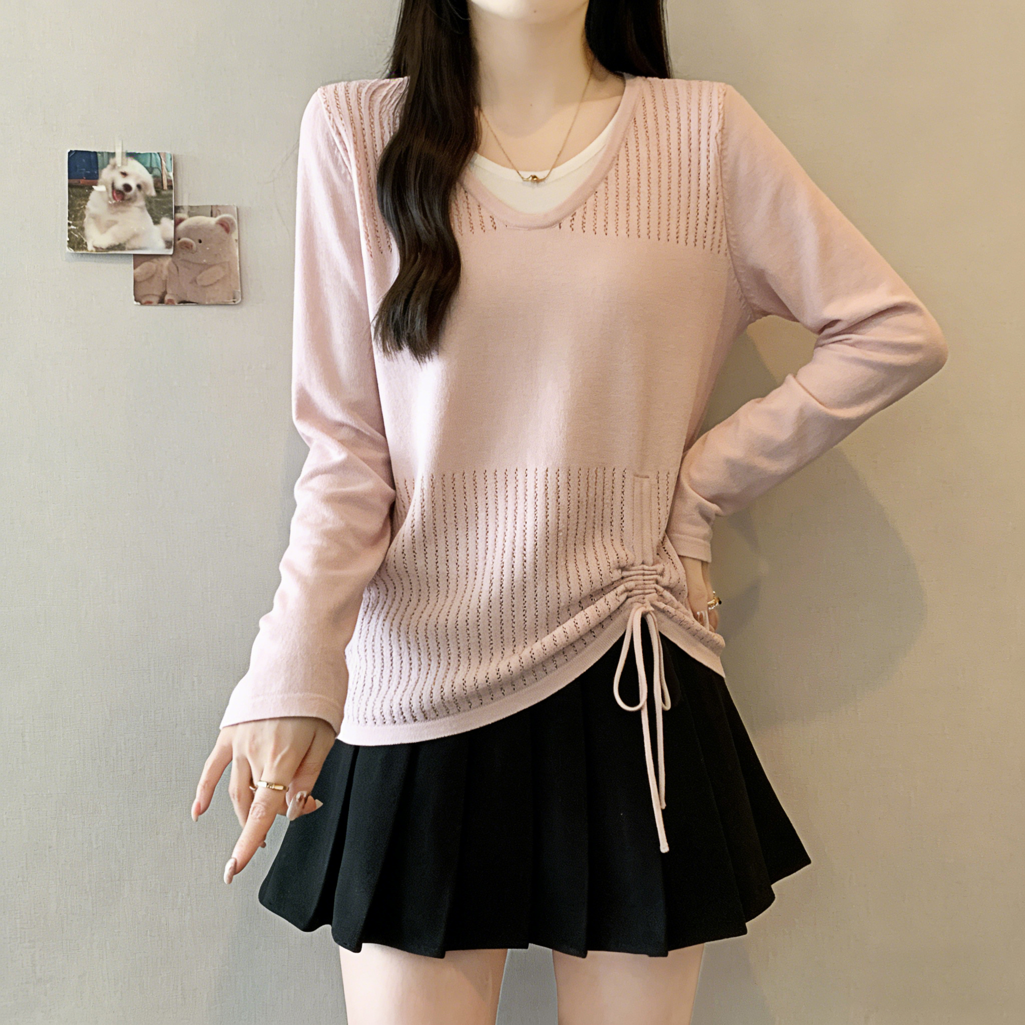 실사 2026 봄 빅 사이즈 여성 의류 지방 mm 페이크 레이어드 니트 스웨터 디자인 센스 펌프 로프 표지 고기 슬림해 보이는 기본 셔츠