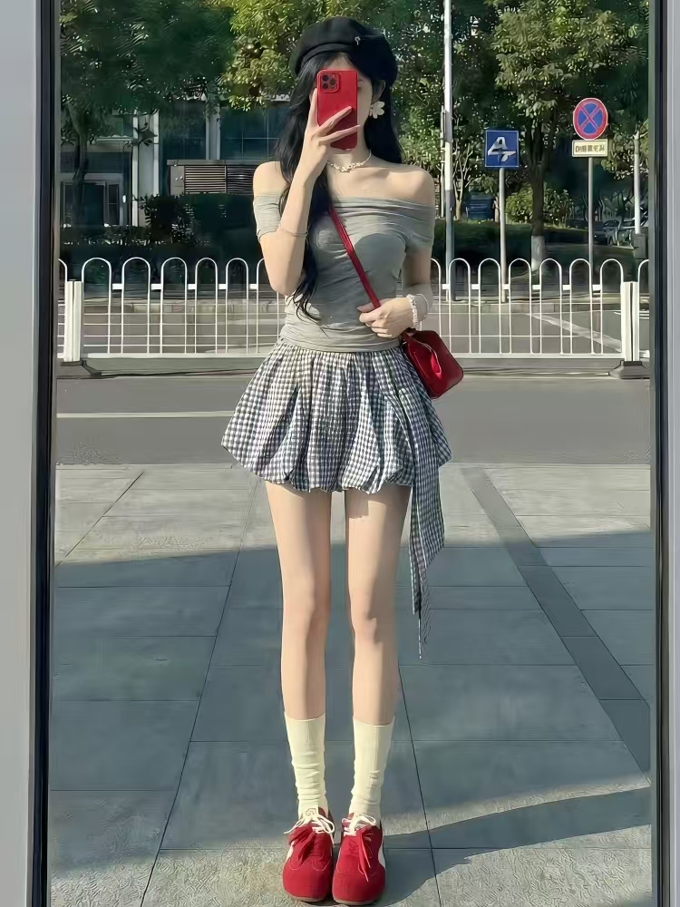 초여름 착용 가져 가라. 한 바람 chic 여성 2026 여름 새로운 오프숄더 맨위 체크무늬 반신 스커트 투피스 슈트