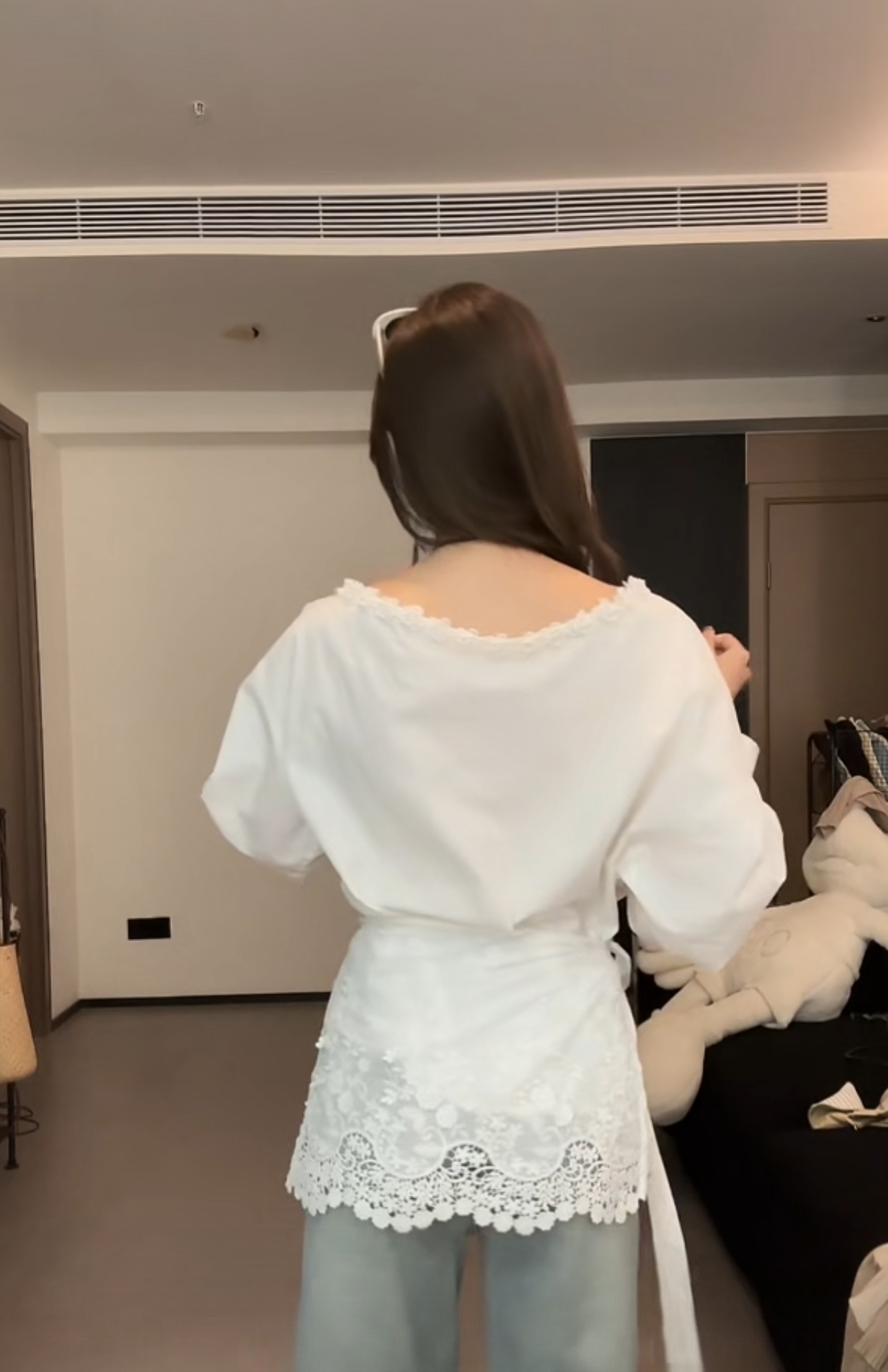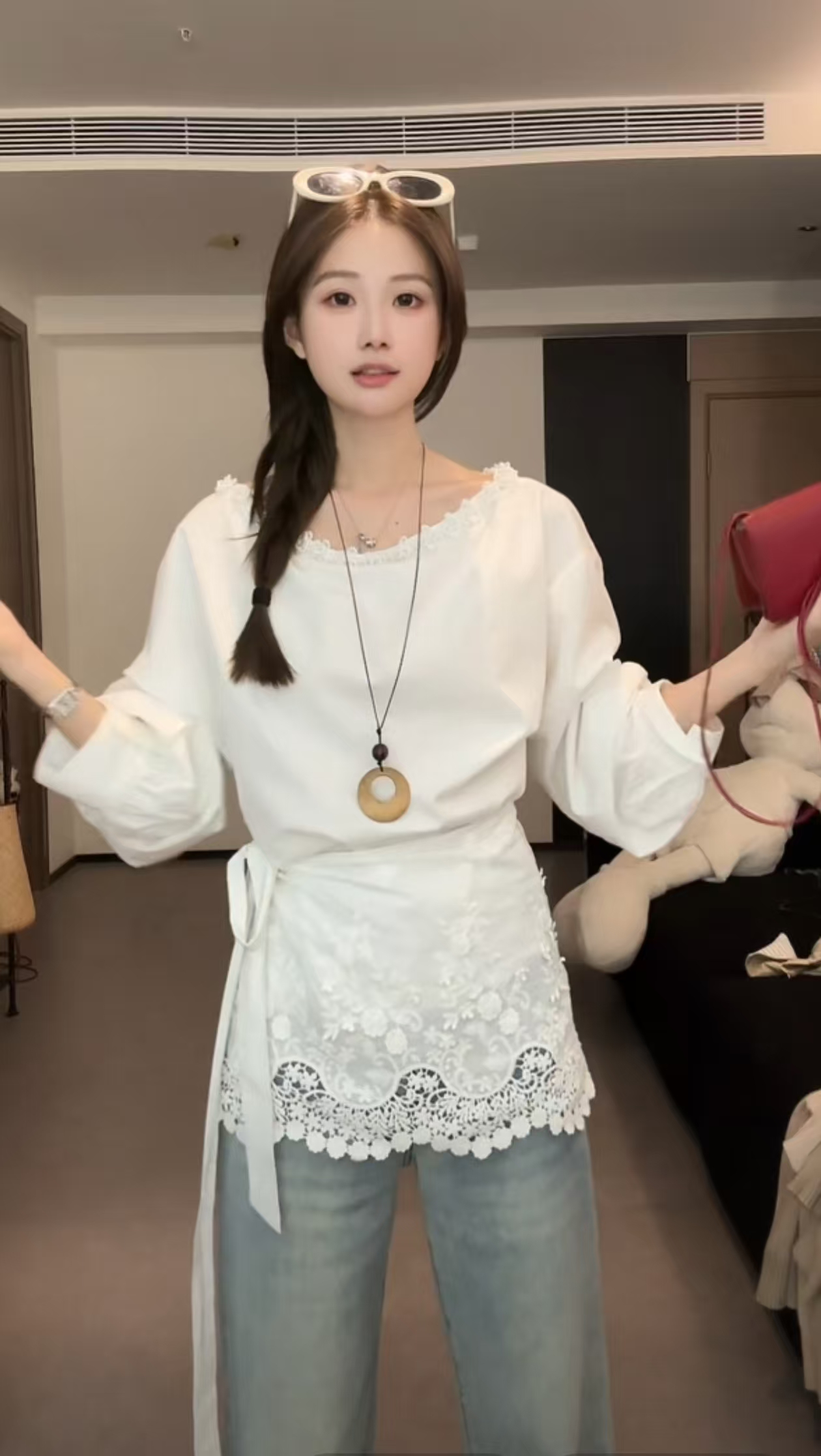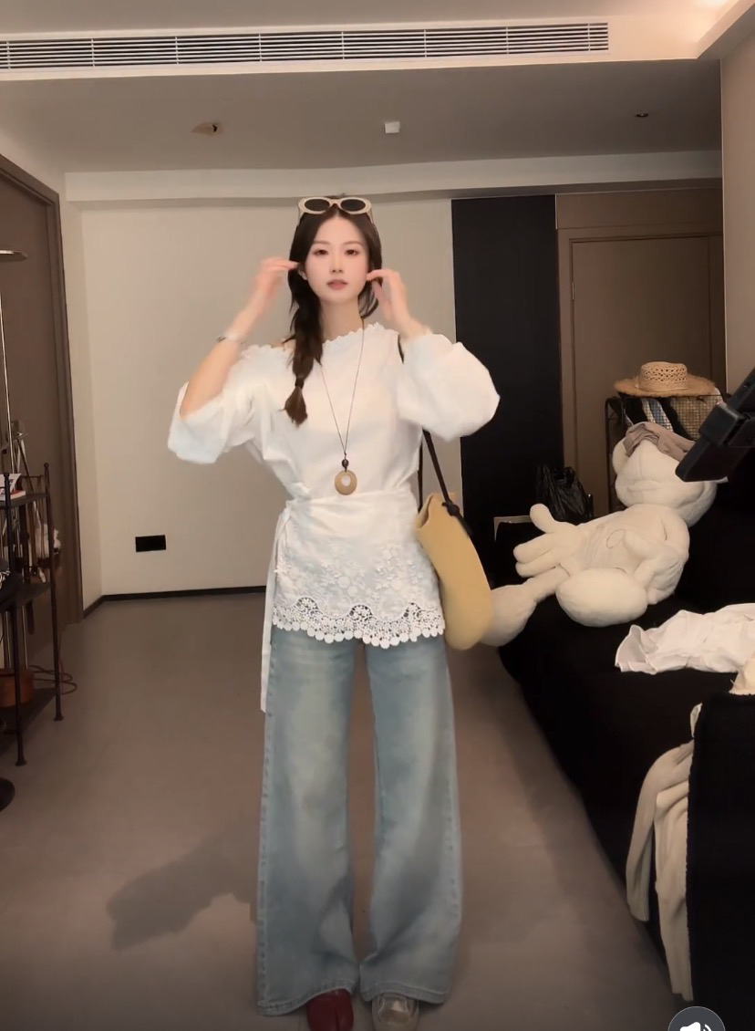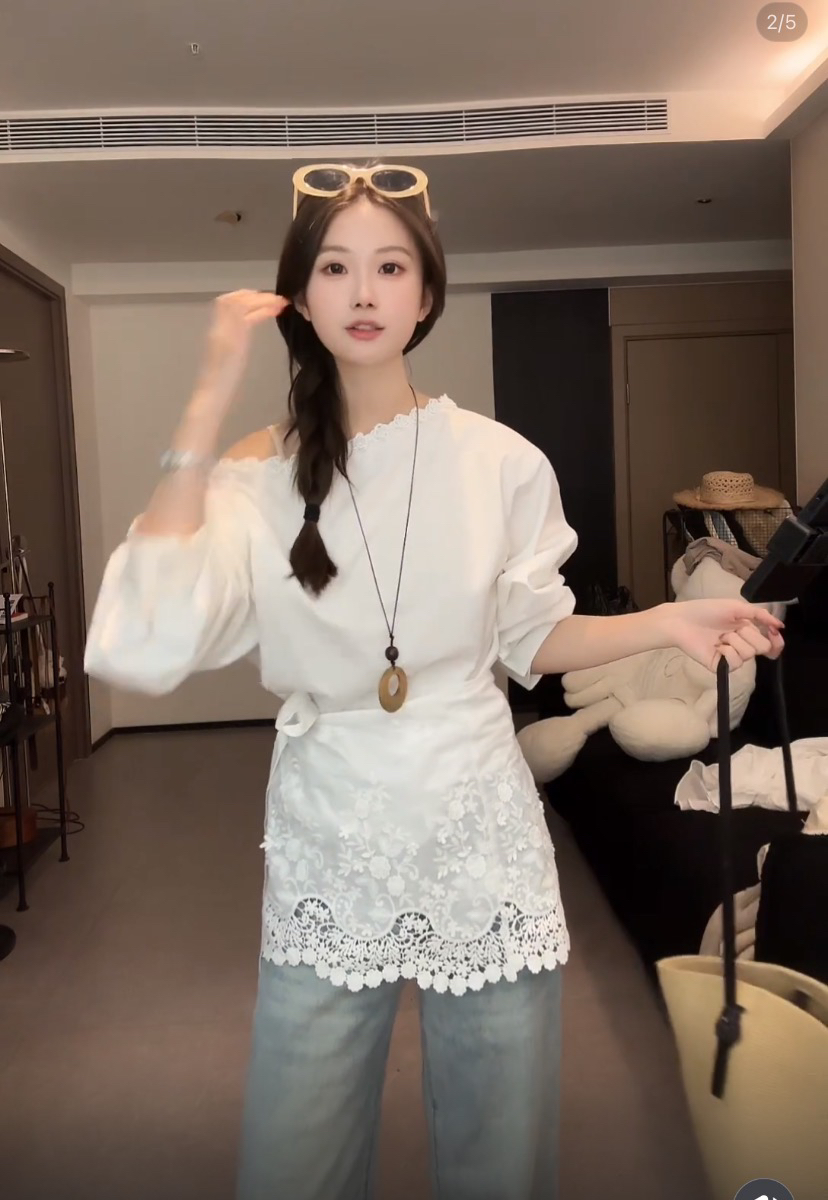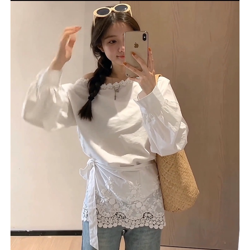 봄 새로운 꽃 네클라인 레이스 디자인 비스듬한 어깨 긴팔 셔츠 탈착식 방귀 커튼 코디