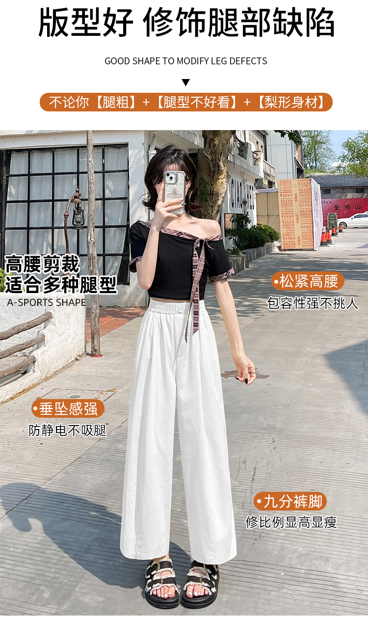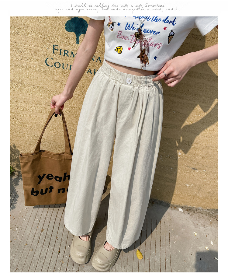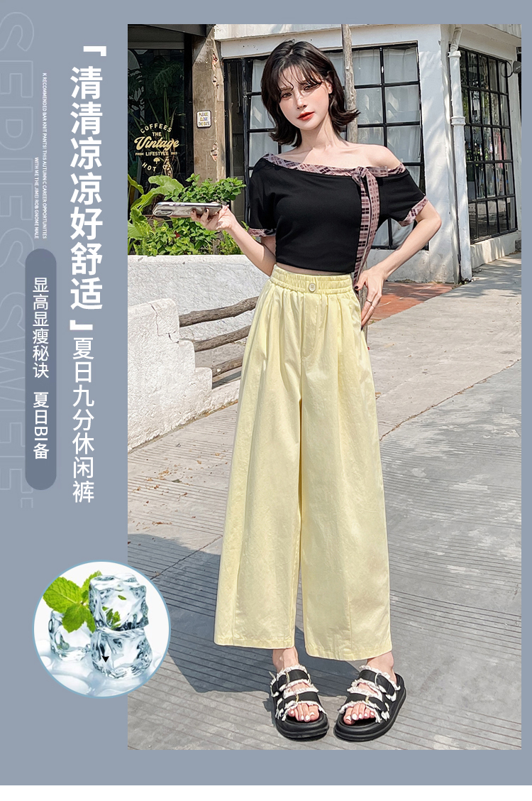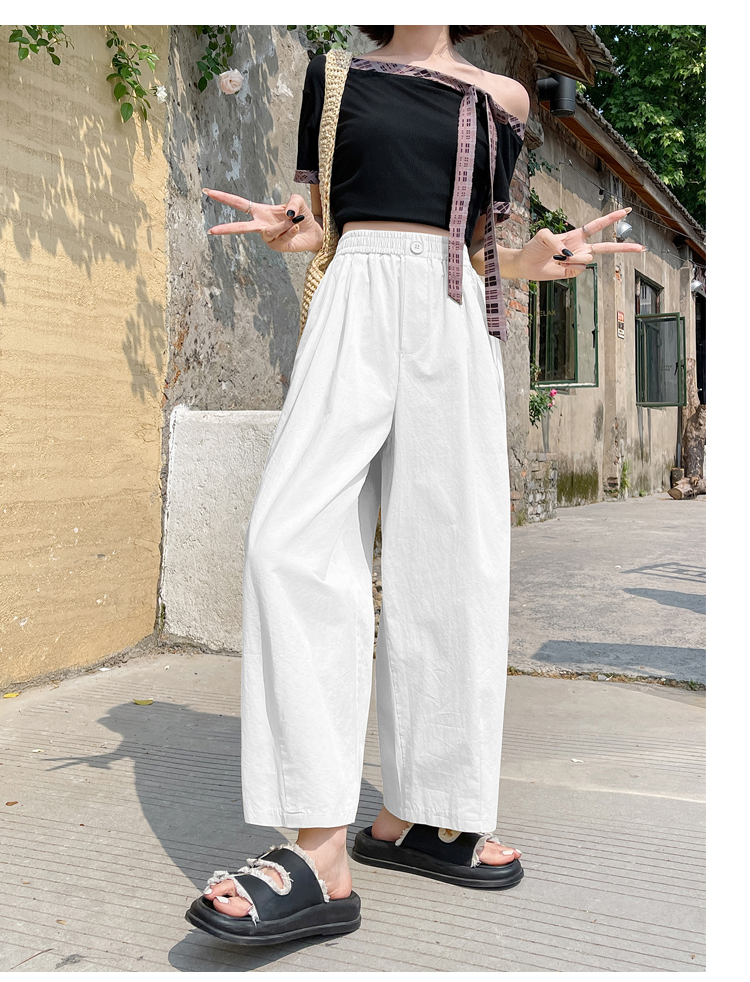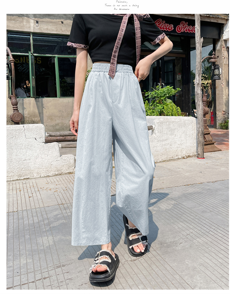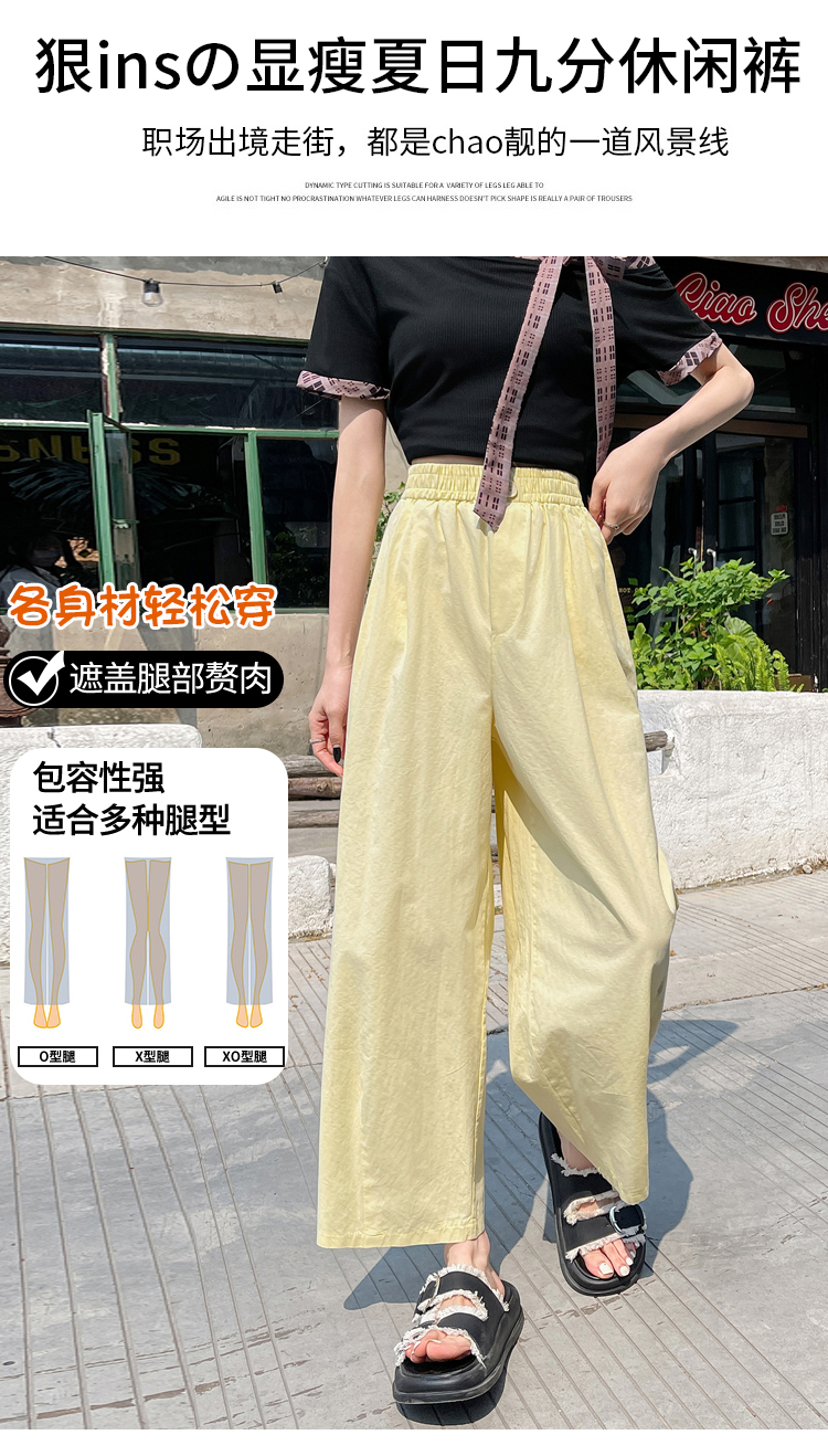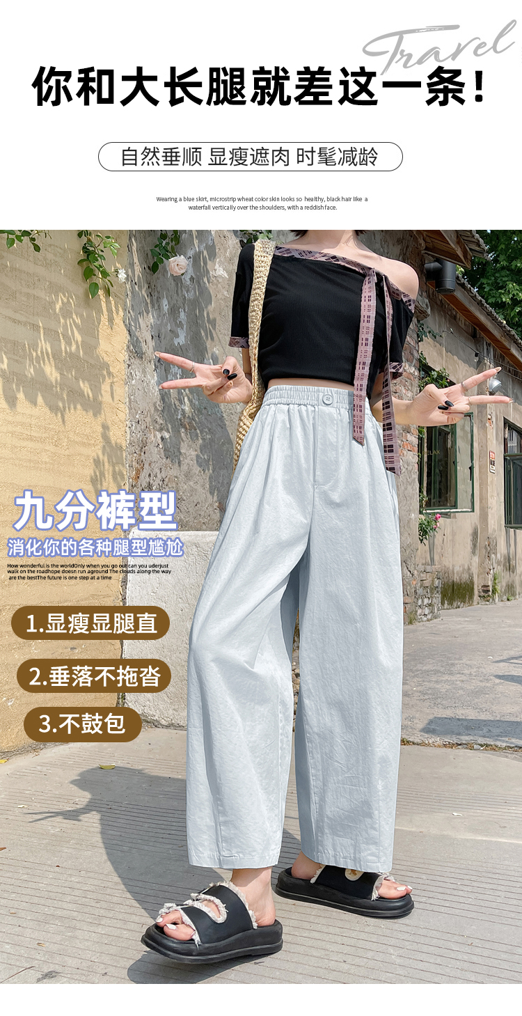 실사 여름 새로운 워시 물 면 밴딩 하이웨이스트 슬림해 보이는 루즈핏 캐주얼 스트레이트 도루 센스 와이드 레그 팬츠 9부 바지 여성