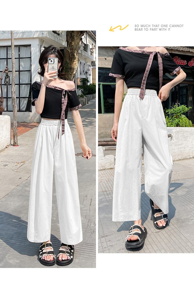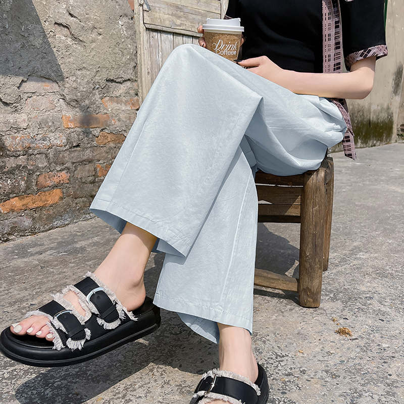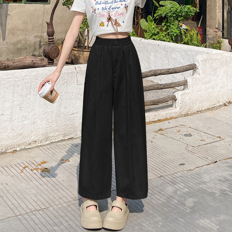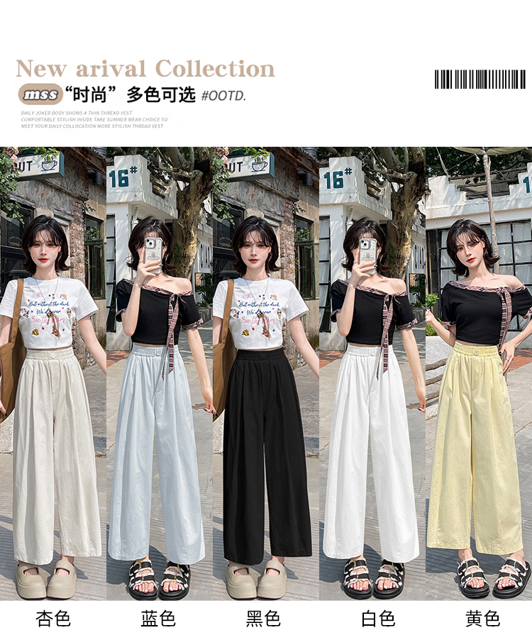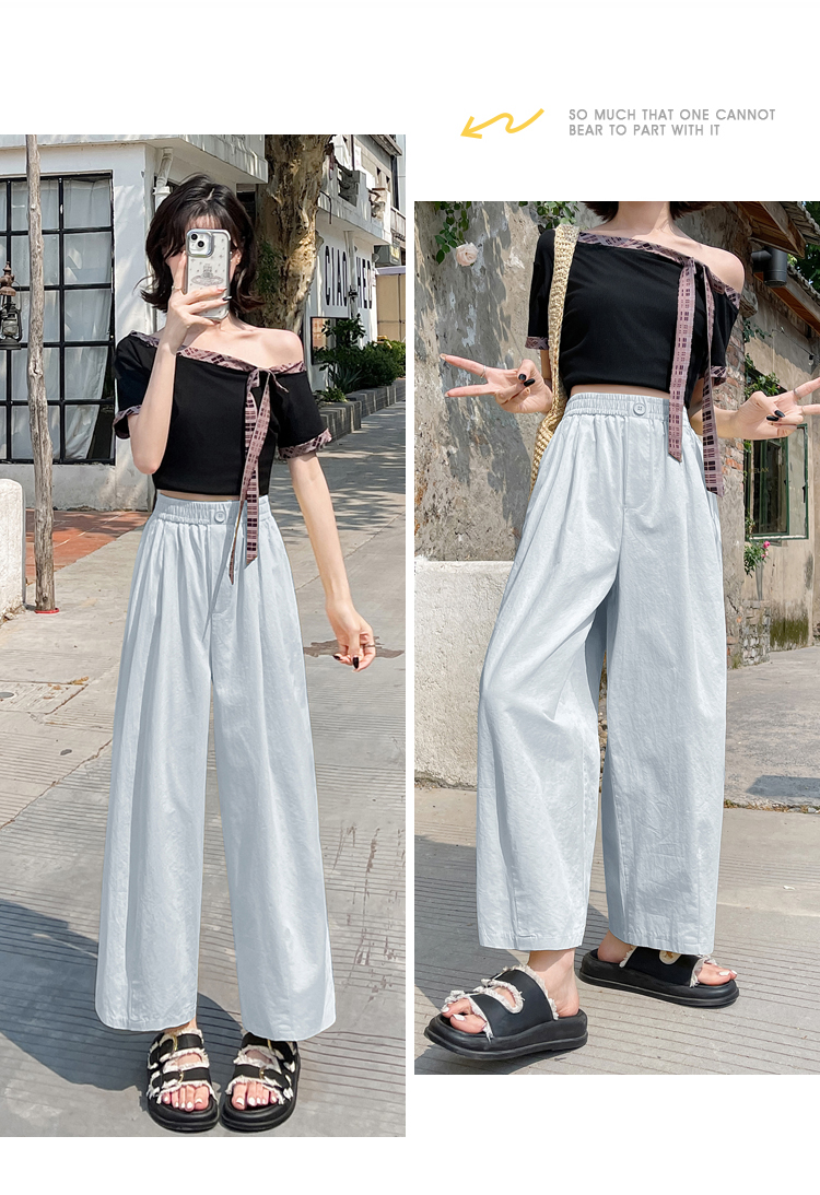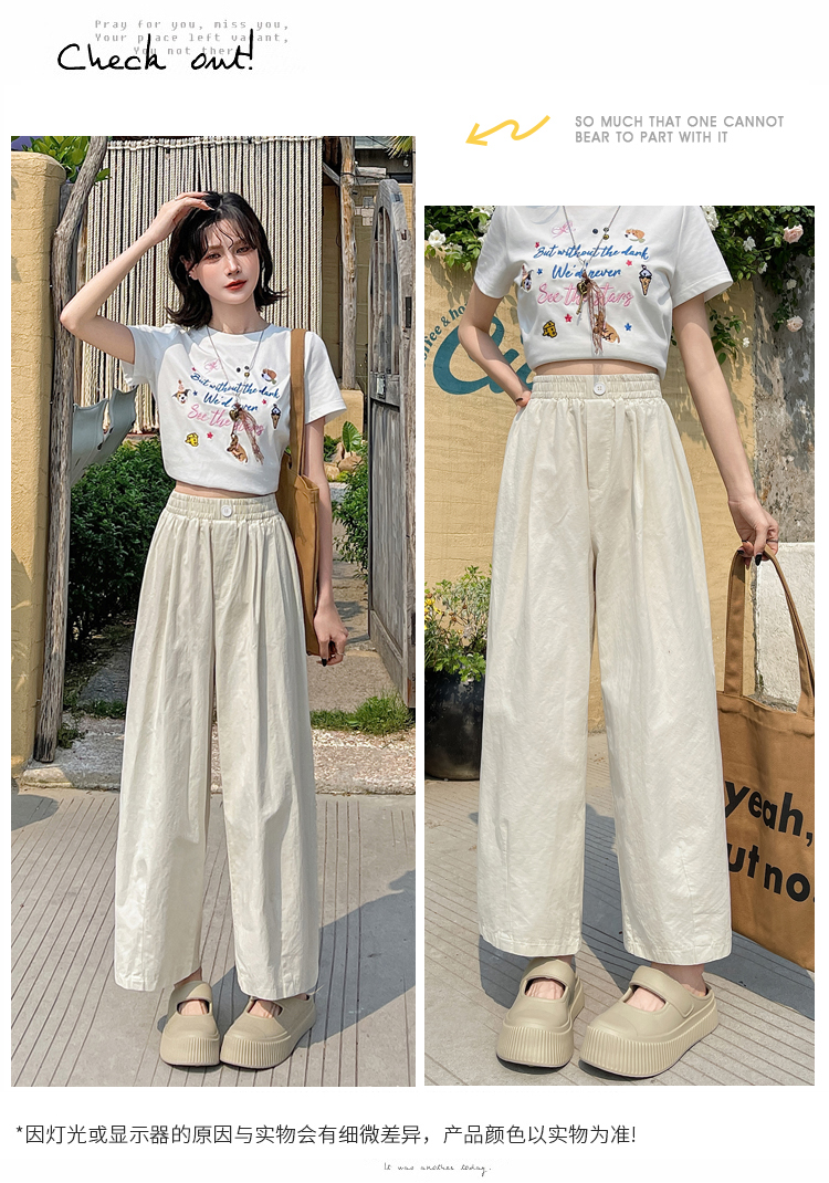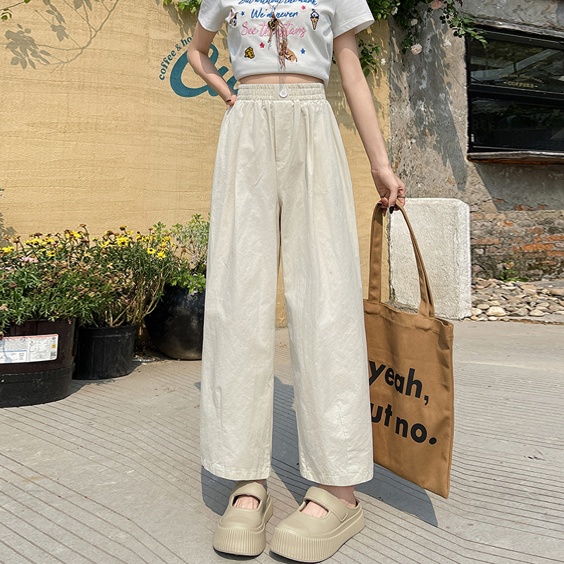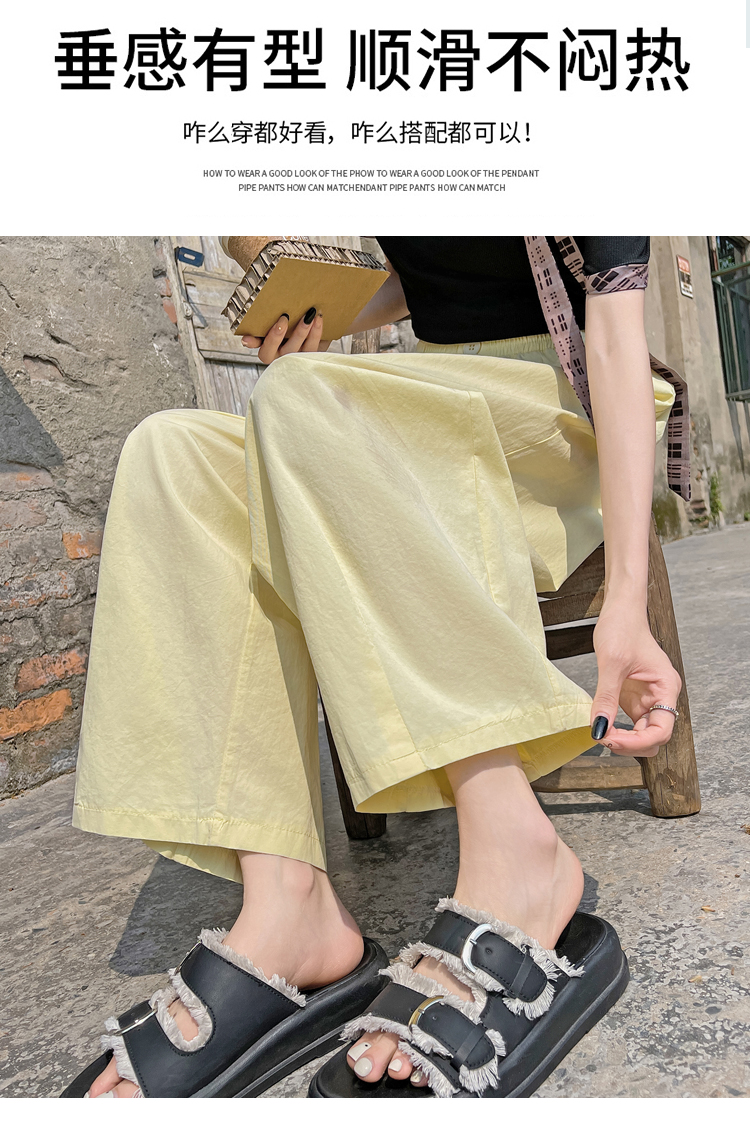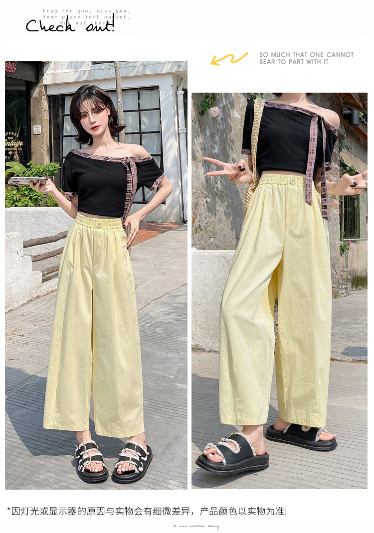실사 여름 새로운 워시 물 면 밴딩 하이웨이스트 슬림해 보이는 루즈핏 캐주얼 스트레이트 도루 센스 와이드 레그 팬츠 9부 바지 여성