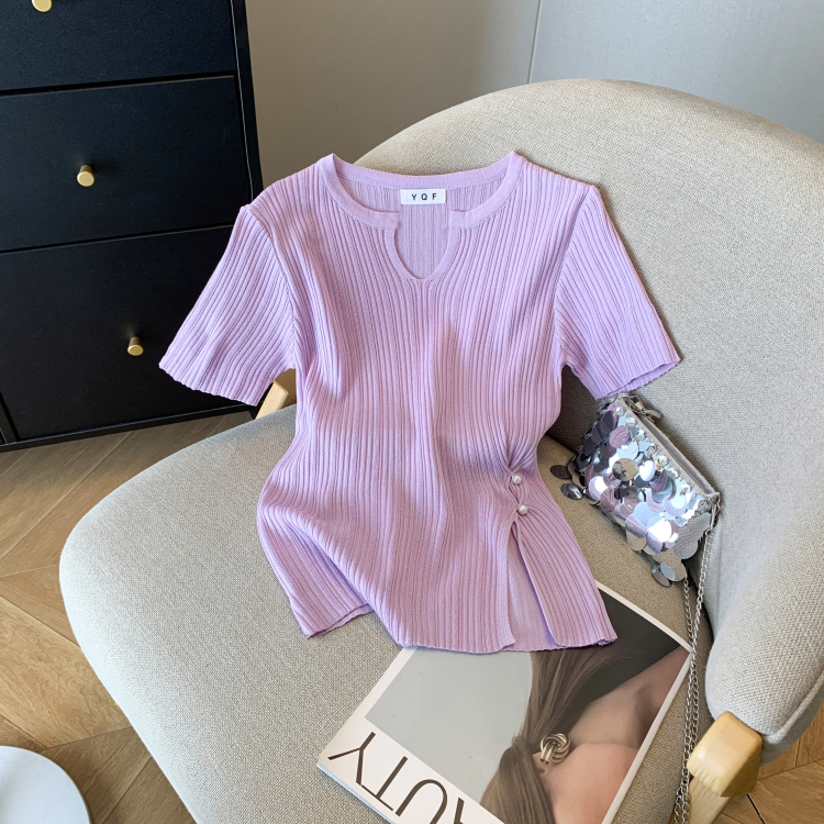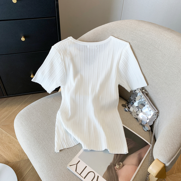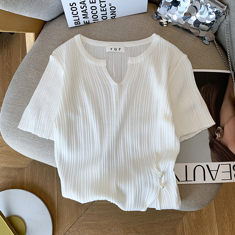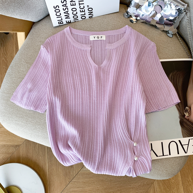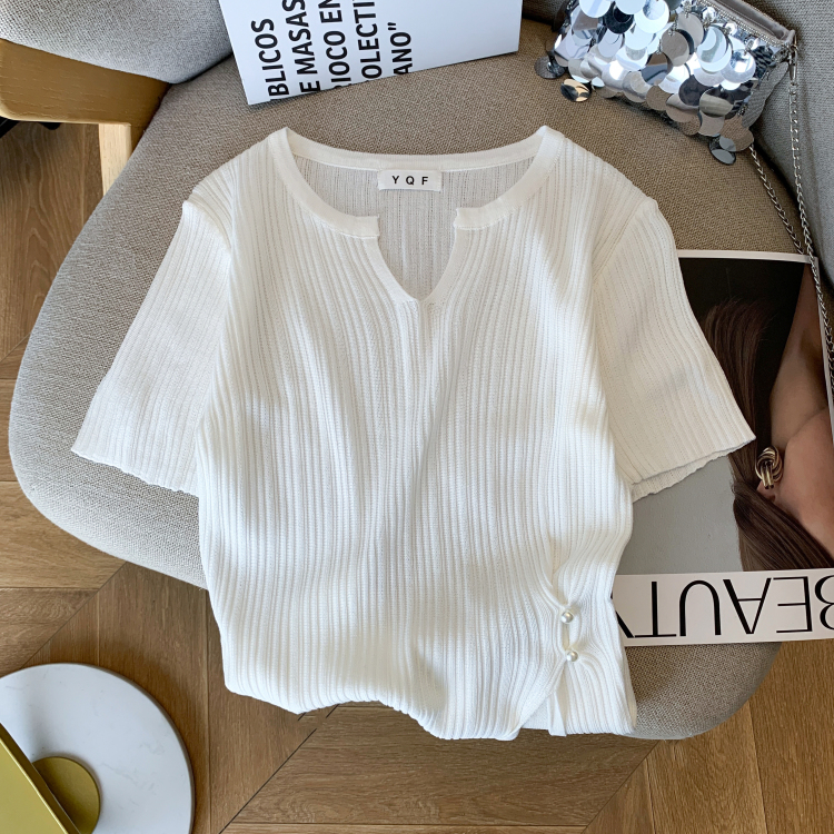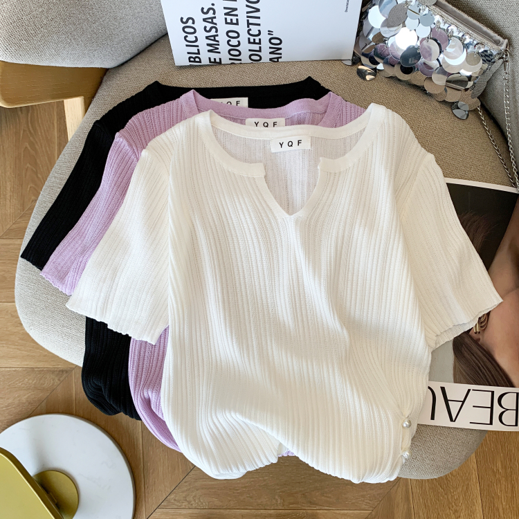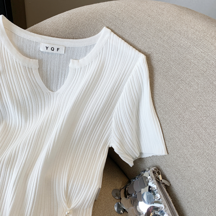 실사 대 물품 2026 여름 새로운 디자인 센스 슬림 피트 순수한 욕망 바람 반팔 티셔츠 얼음 실크 니트 스웨터 여성