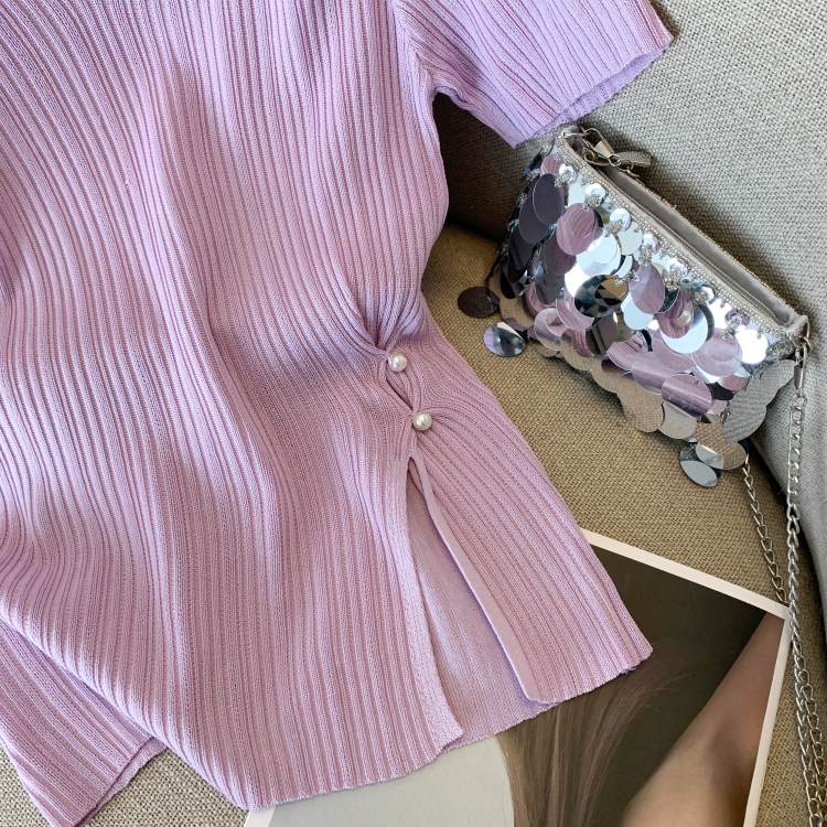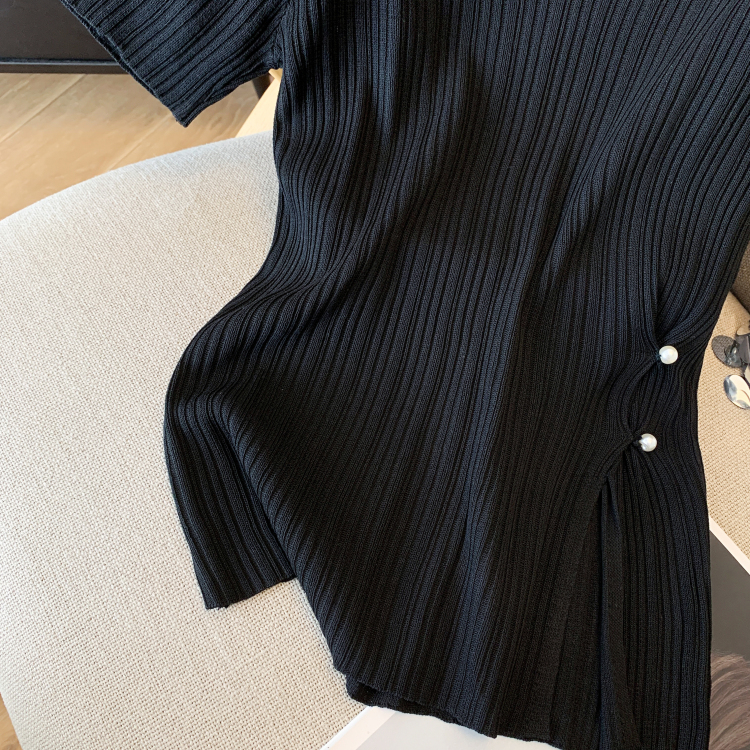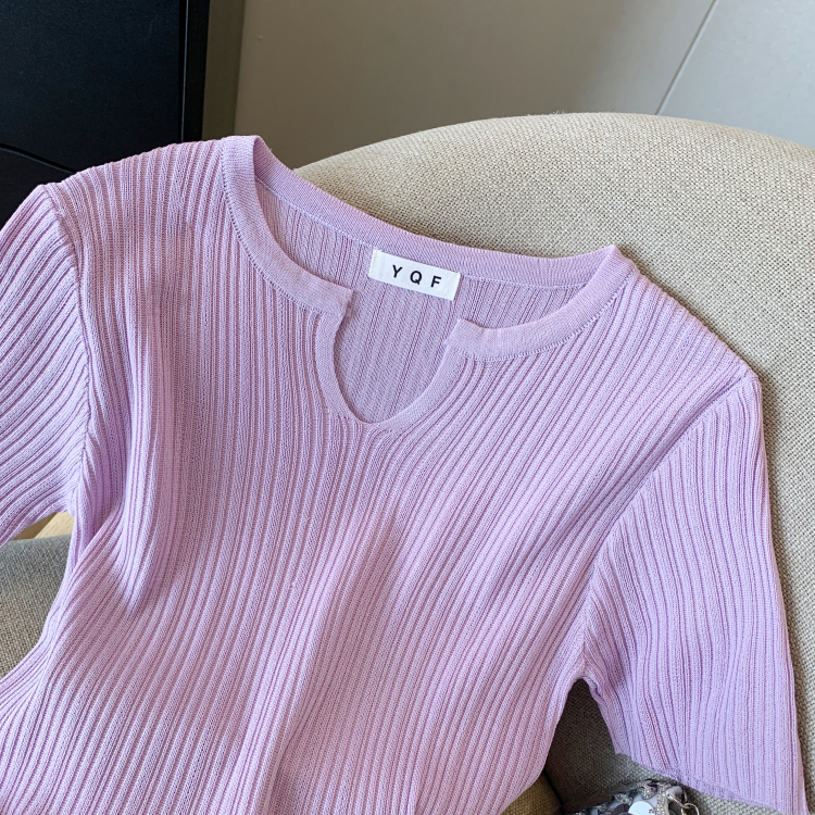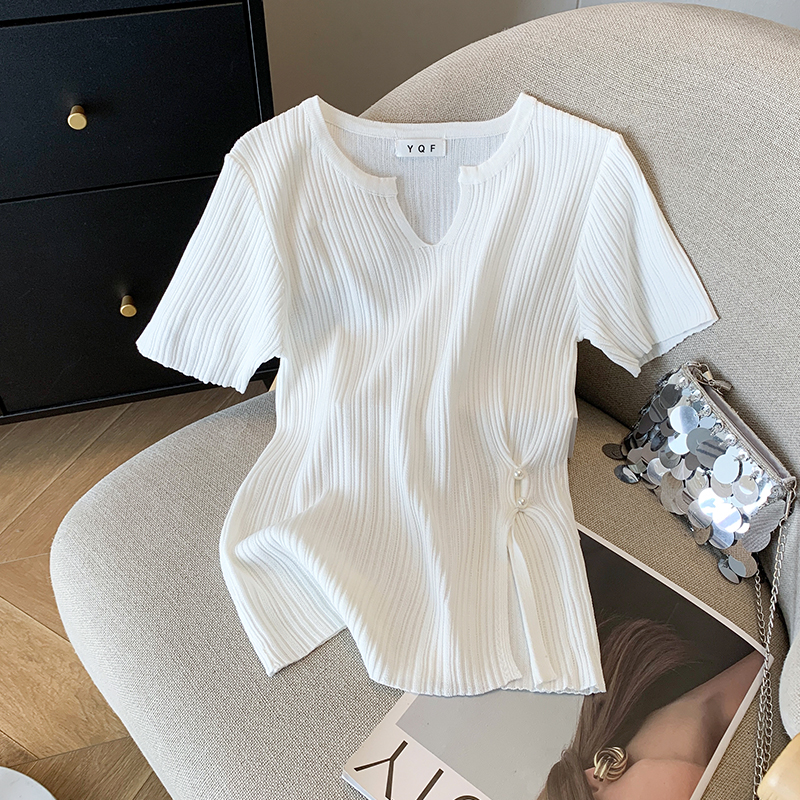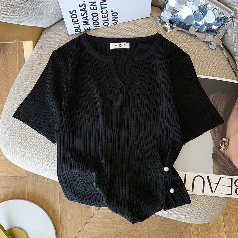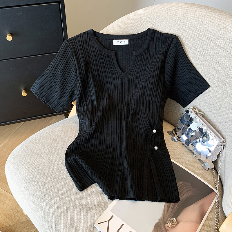 실사 대 물품 2026 여름 새로운 디자인 센스 슬림 피트 순수한 욕망 바람 반팔 티셔츠 얼음 실크 니트 스웨터 여성