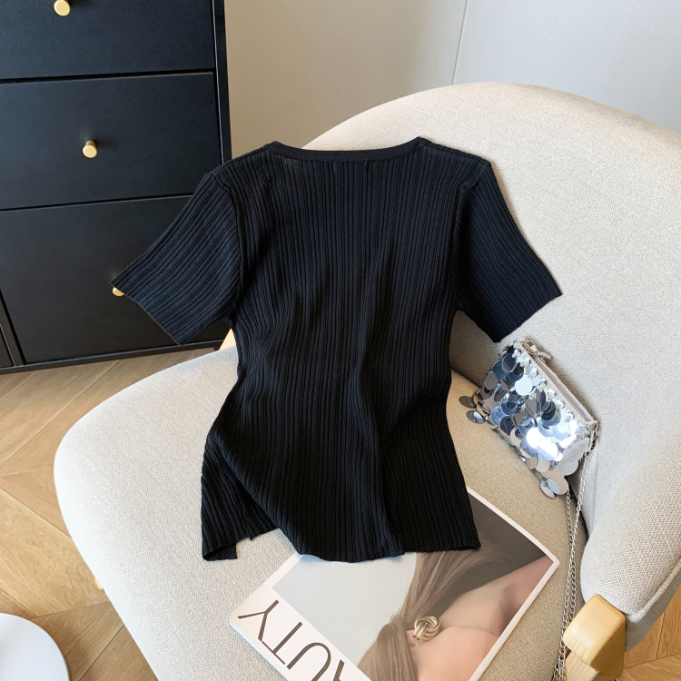 실사 대 물품 2026 여름 쇼트 스타일 이슬 쇄골 광장 칼라 몸매 가꾸기 티셔츠 반팔 얼음 실크 니트 맨위 여성