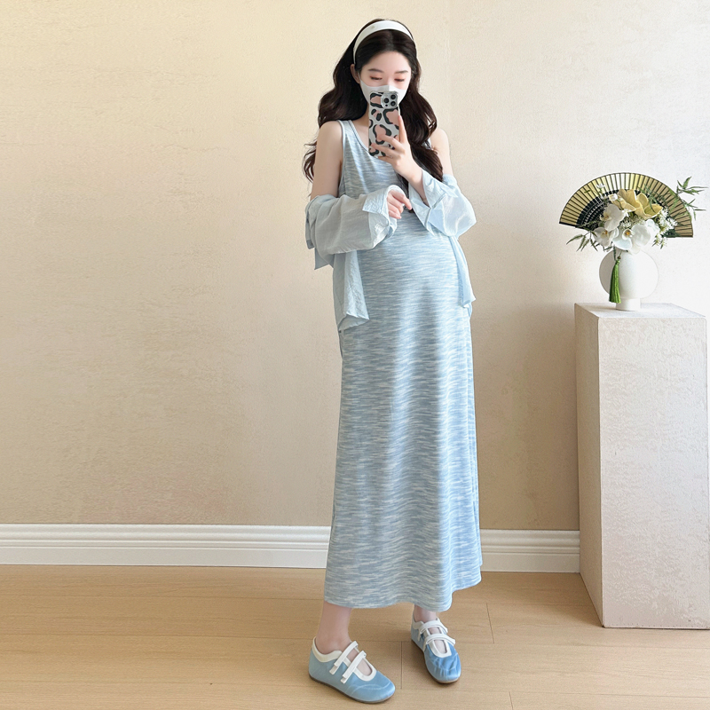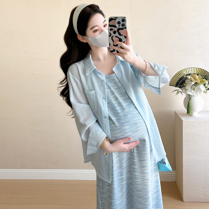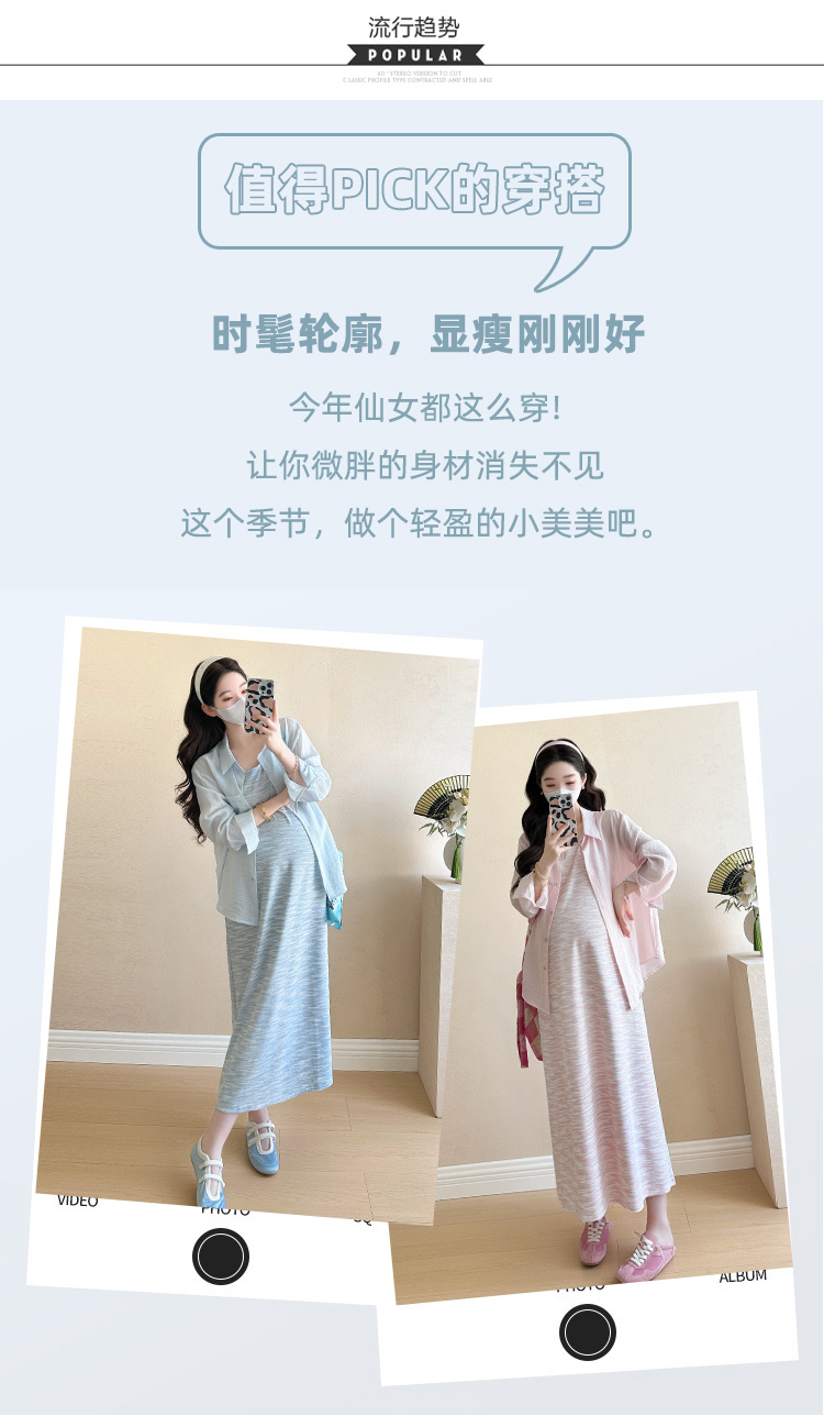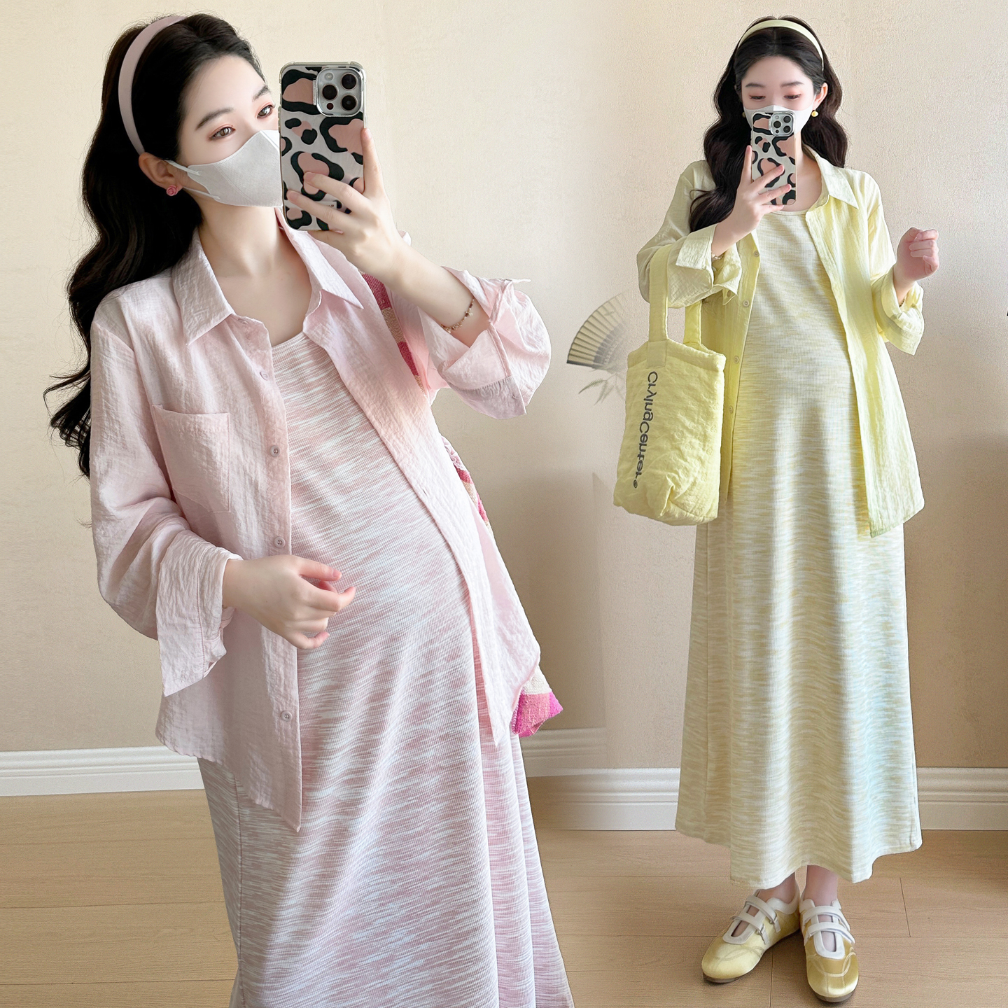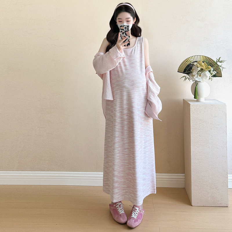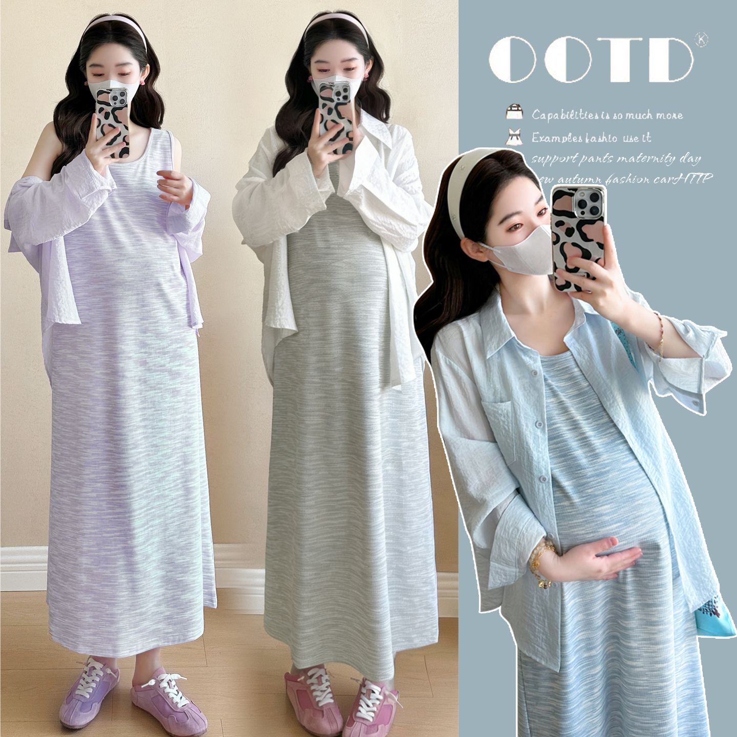 지금 실사 2026 임산부 여름 스트라이프 조끼 스커트 중간 소매 자외선 차단 셔츠 세트 슬림해 보이는 루즈핏 감기