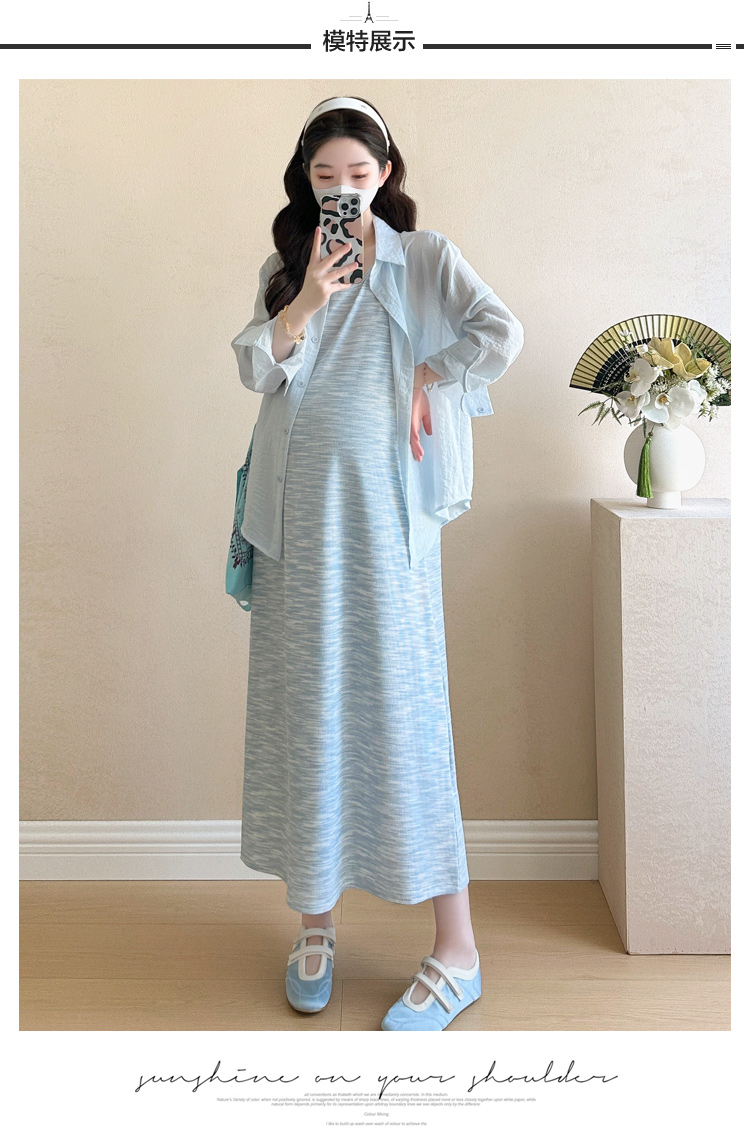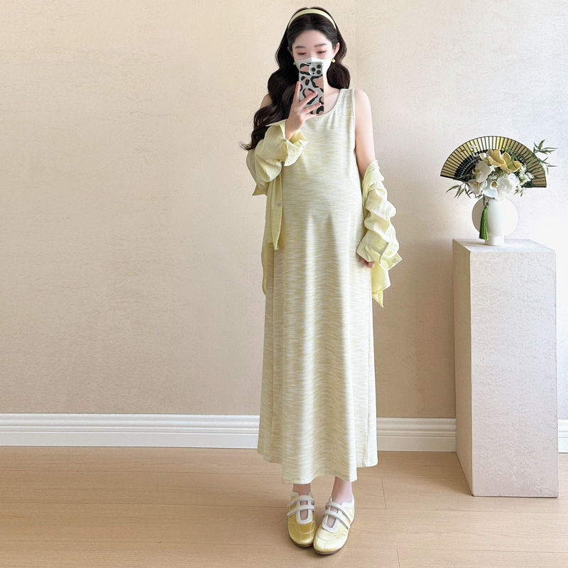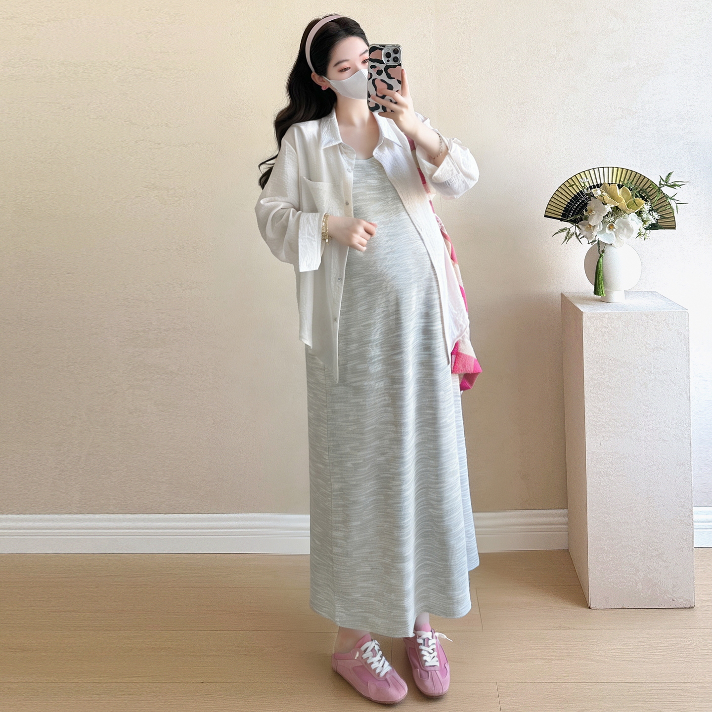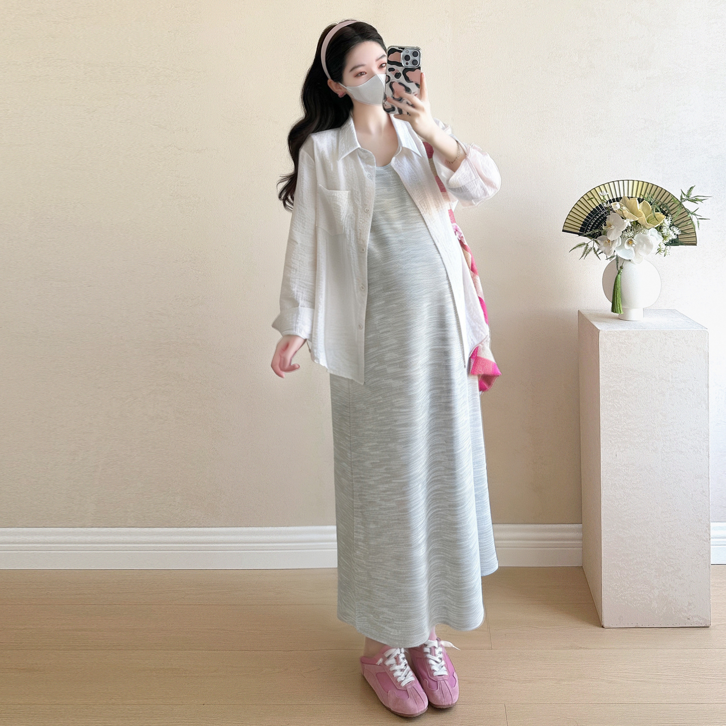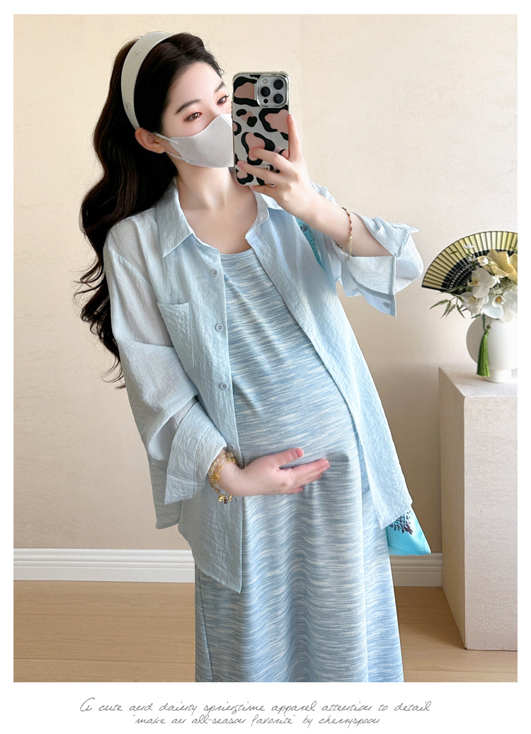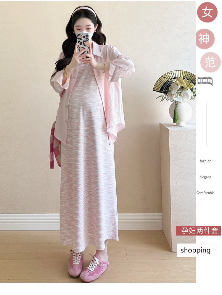 지금 실사 2026 임산부 여름 스트라이프 조끼 스커트 중간 소매 자외선 차단 셔츠 세트 슬림해 보이는 루즈핏 감기