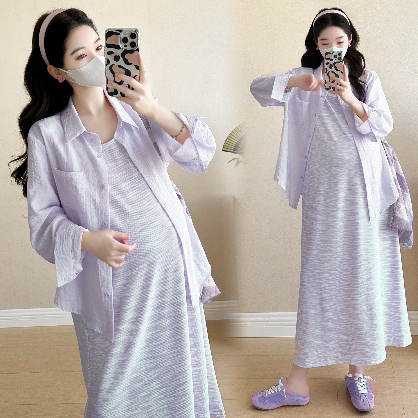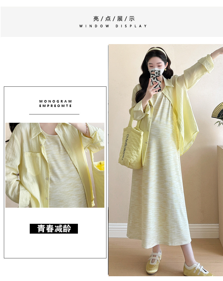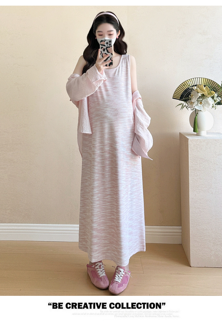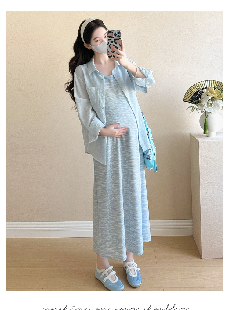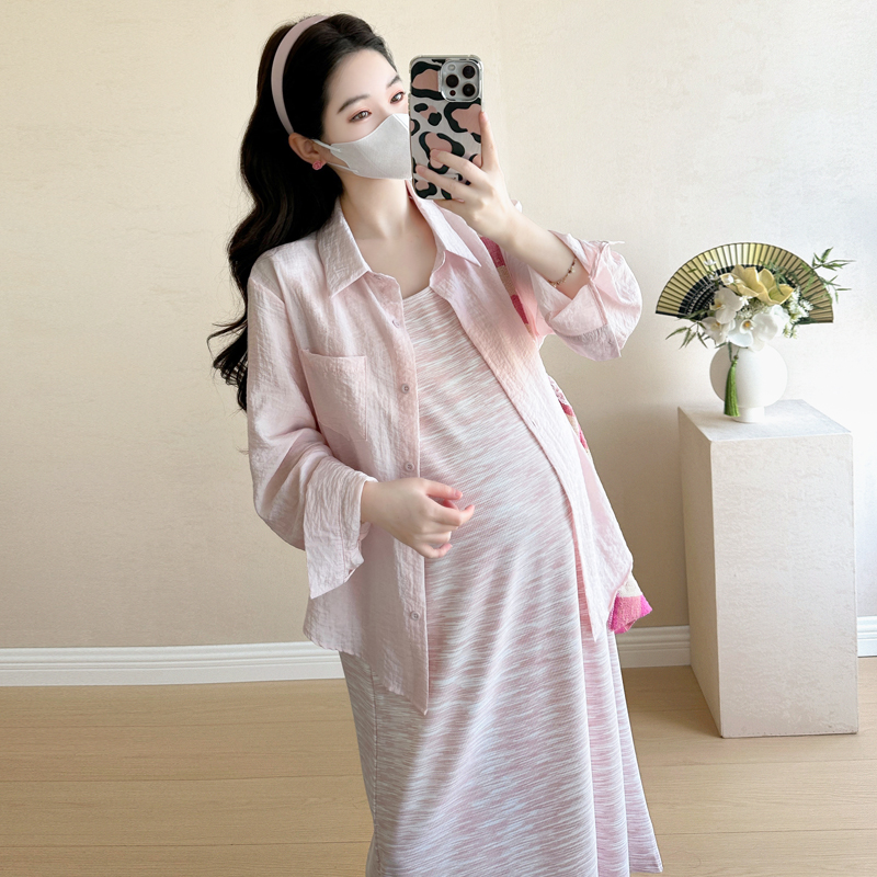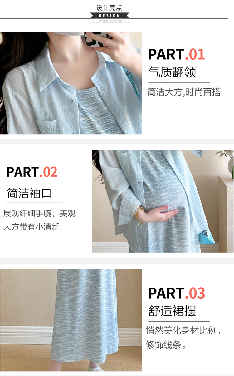 지금 실사 2026 임산부 여름 스트라이프 조끼 스커트 중간 소매 자외선 차단 셔츠 세트 슬림해 보이는 루즈핏 감기