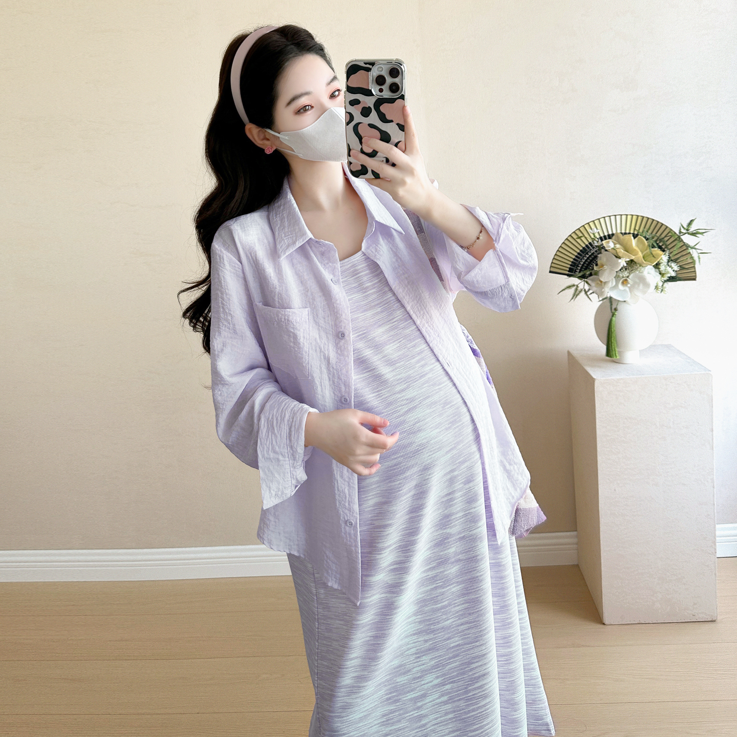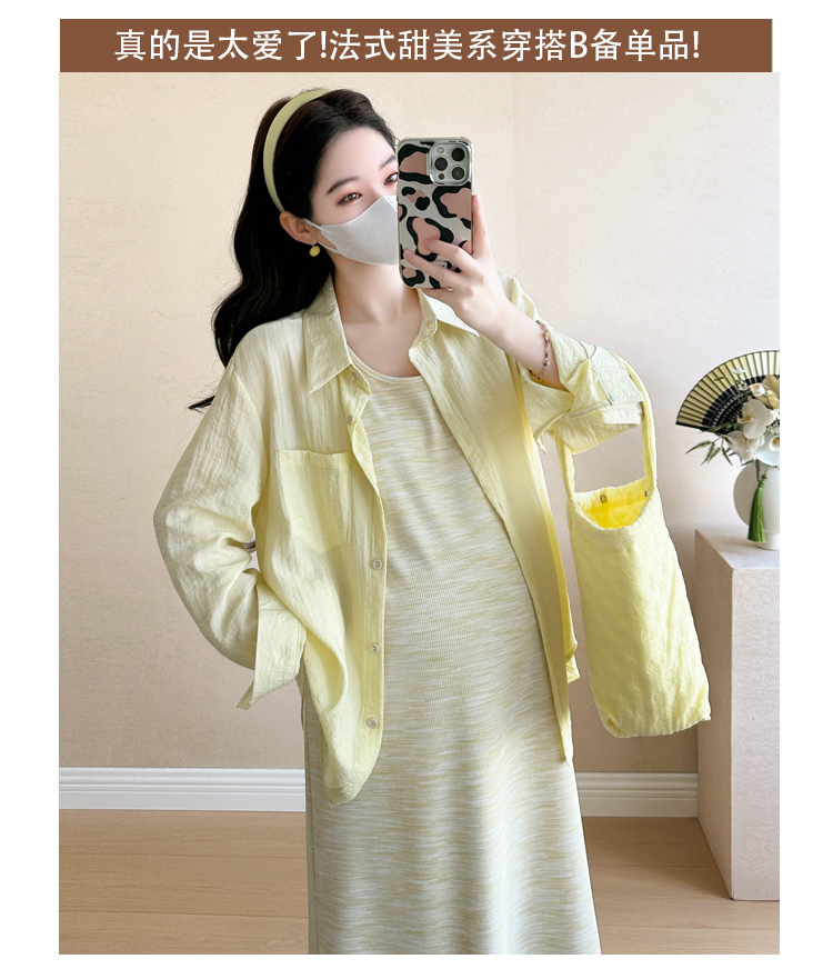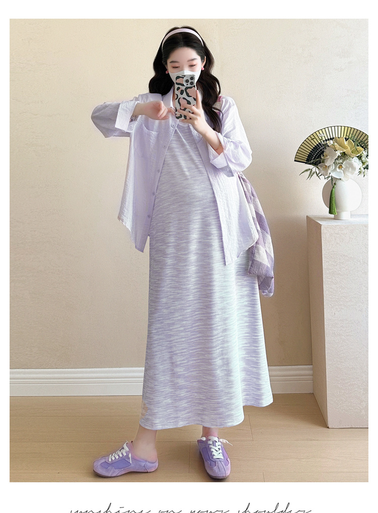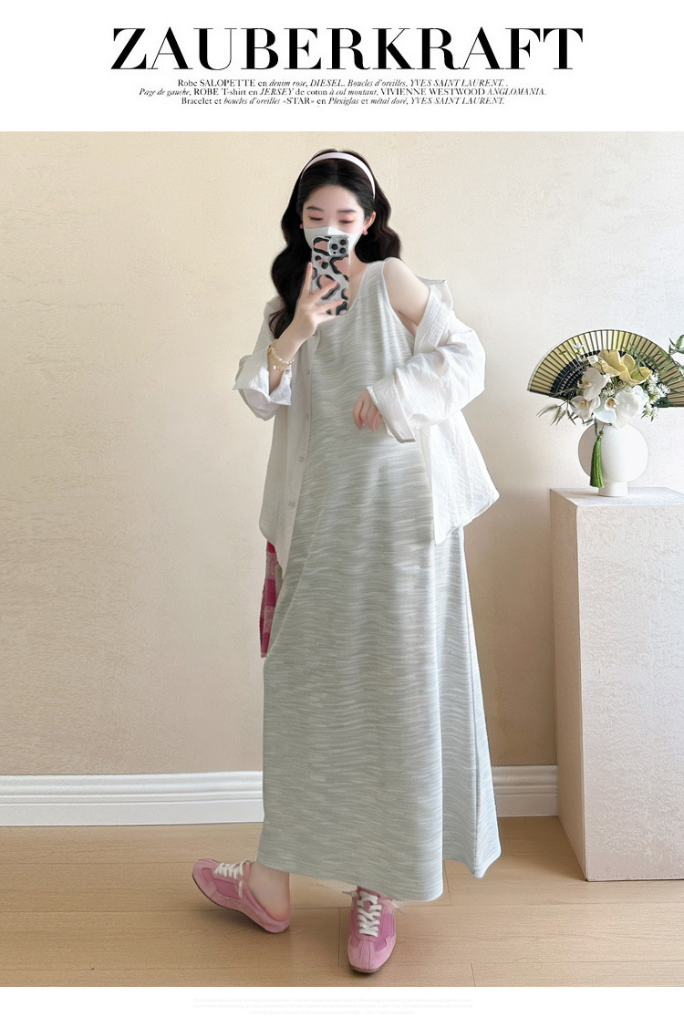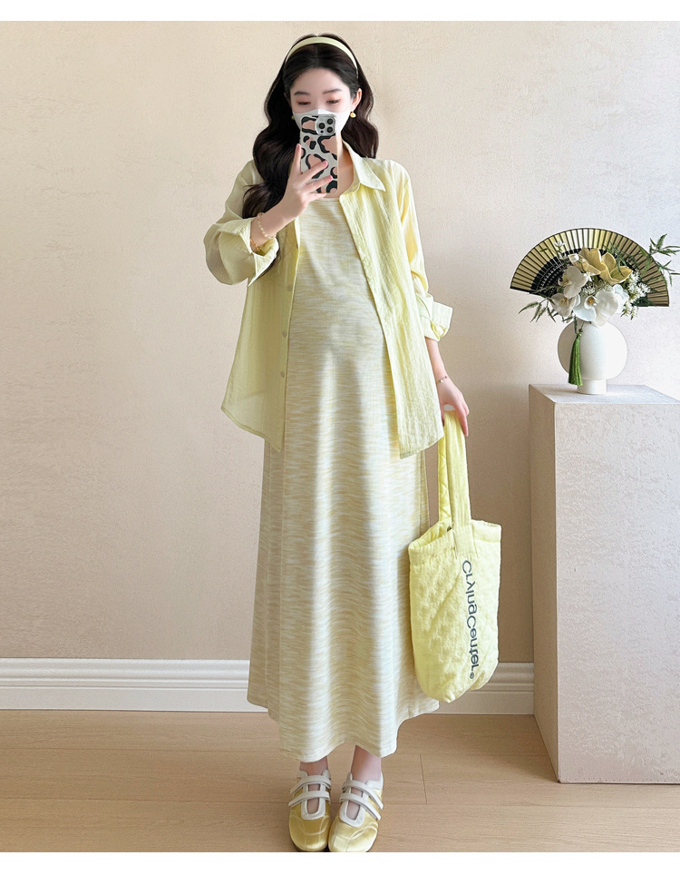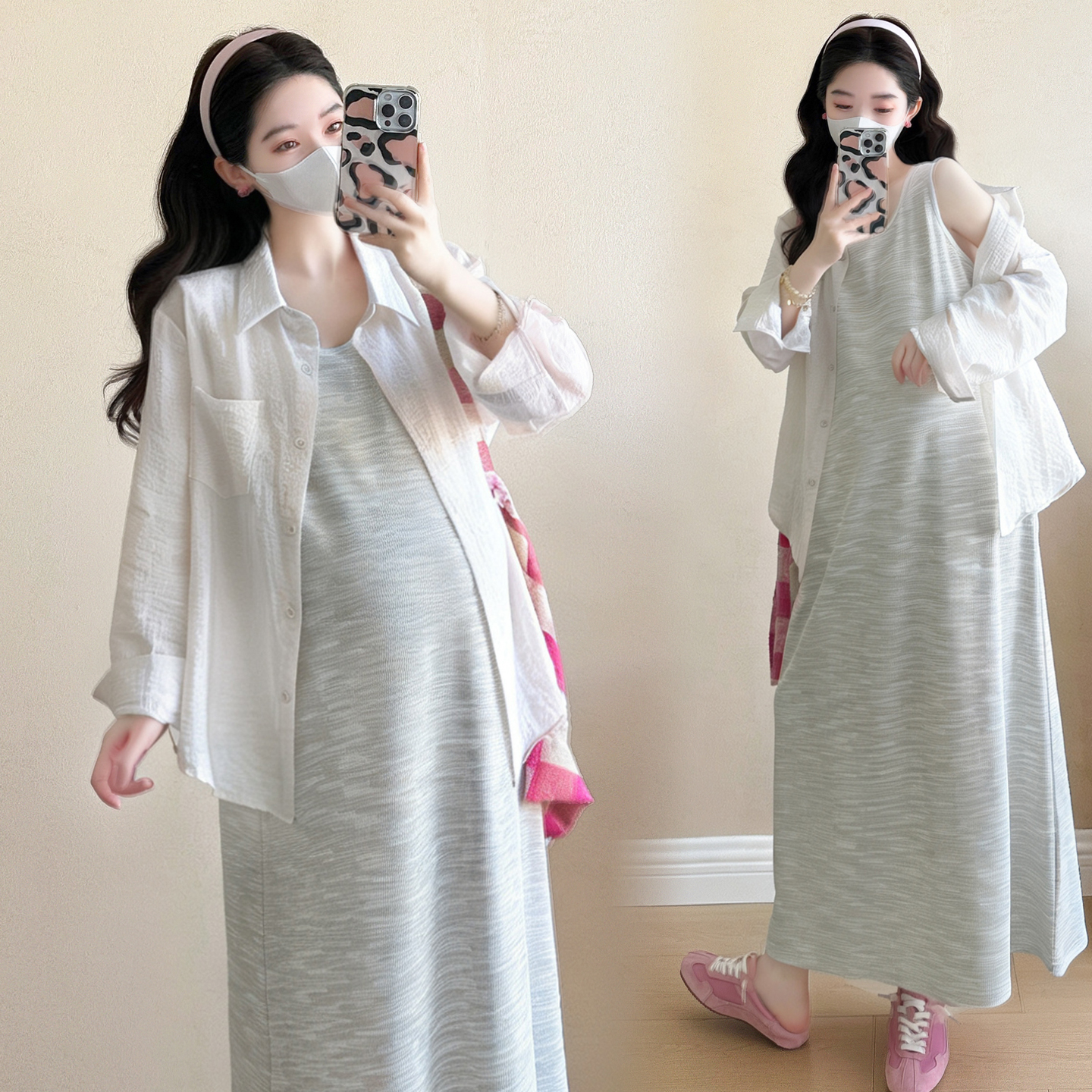 지금 실사 2026 임산부 여름 스트라이프 조끼 스커트 중간 소매 자외선 차단 셔츠 세트 슬림해 보이는 루즈핏 감기