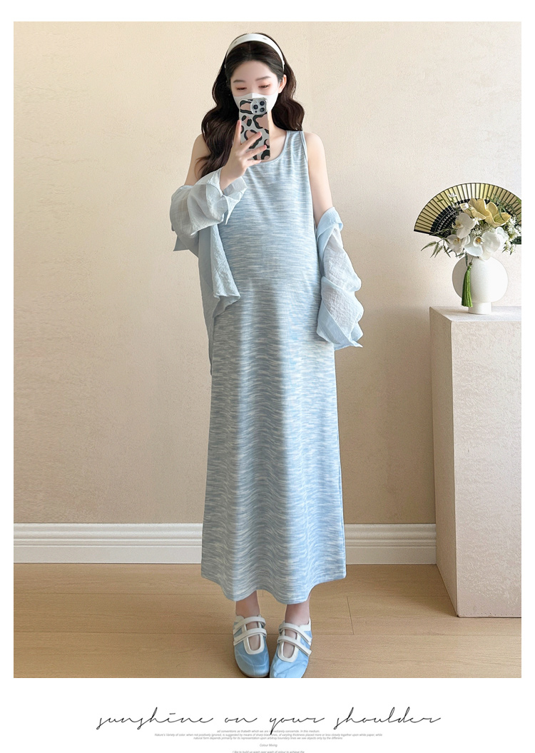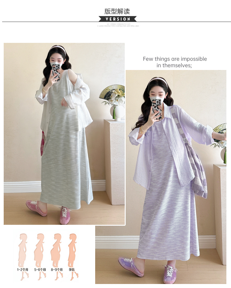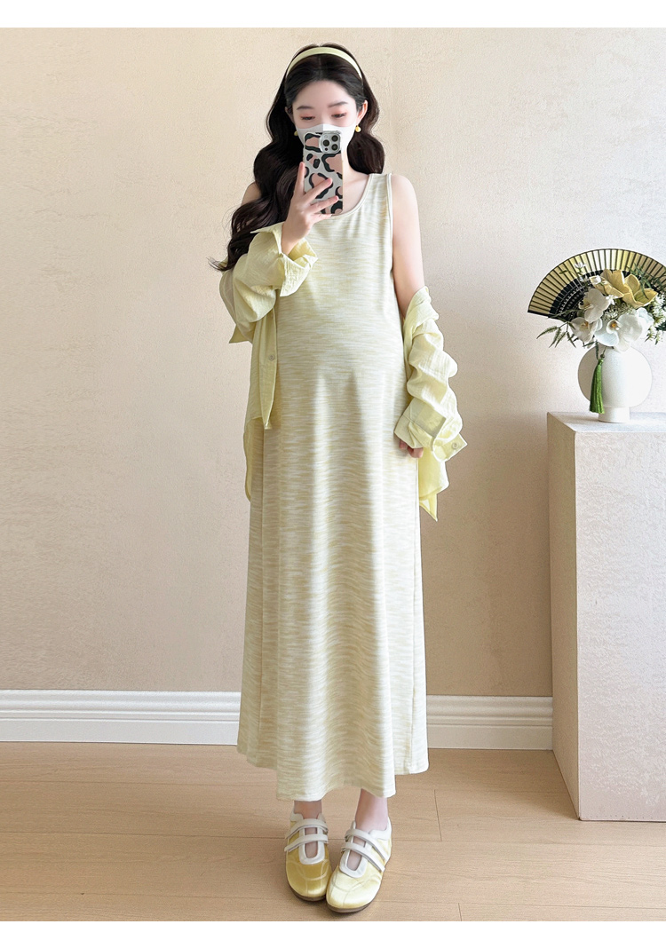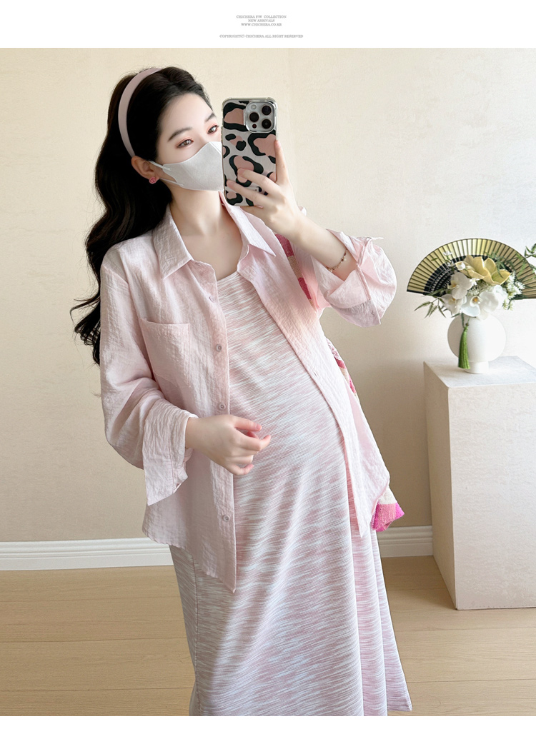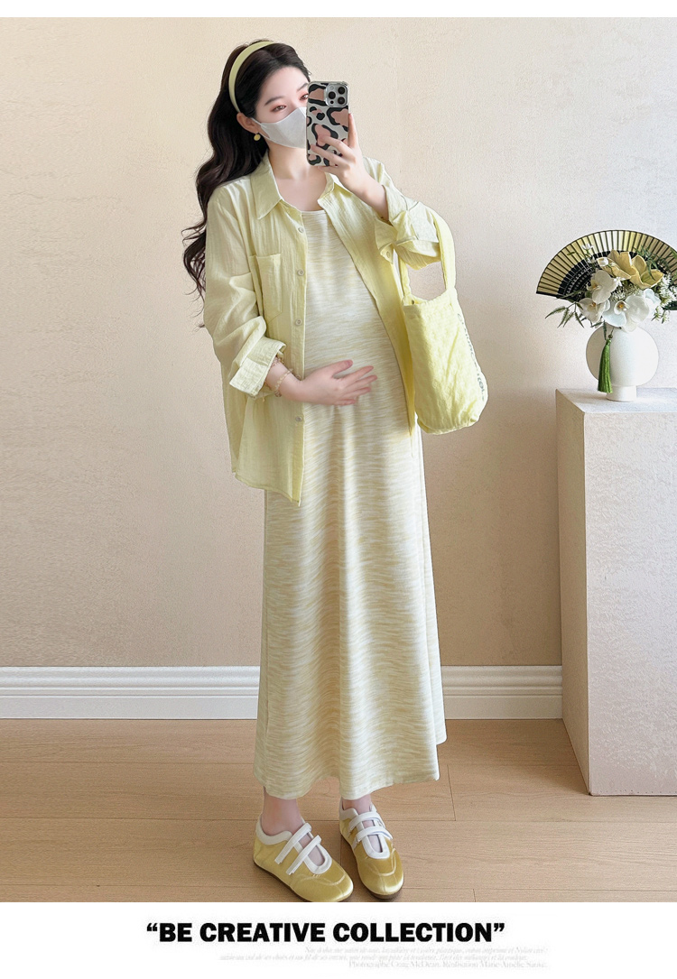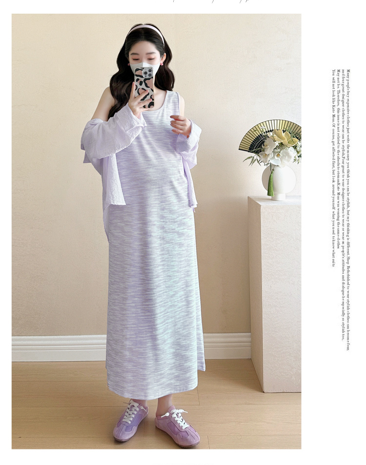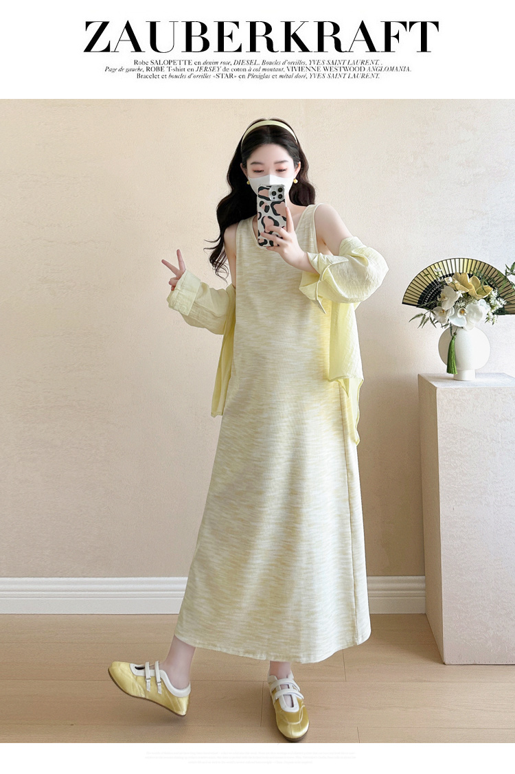 지금 실사 2026 임산부 여름 스트라이프 조끼 스커트 중간 소매 자외선 차단 셔츠 세트 슬림해 보이는 루즈핏 감기