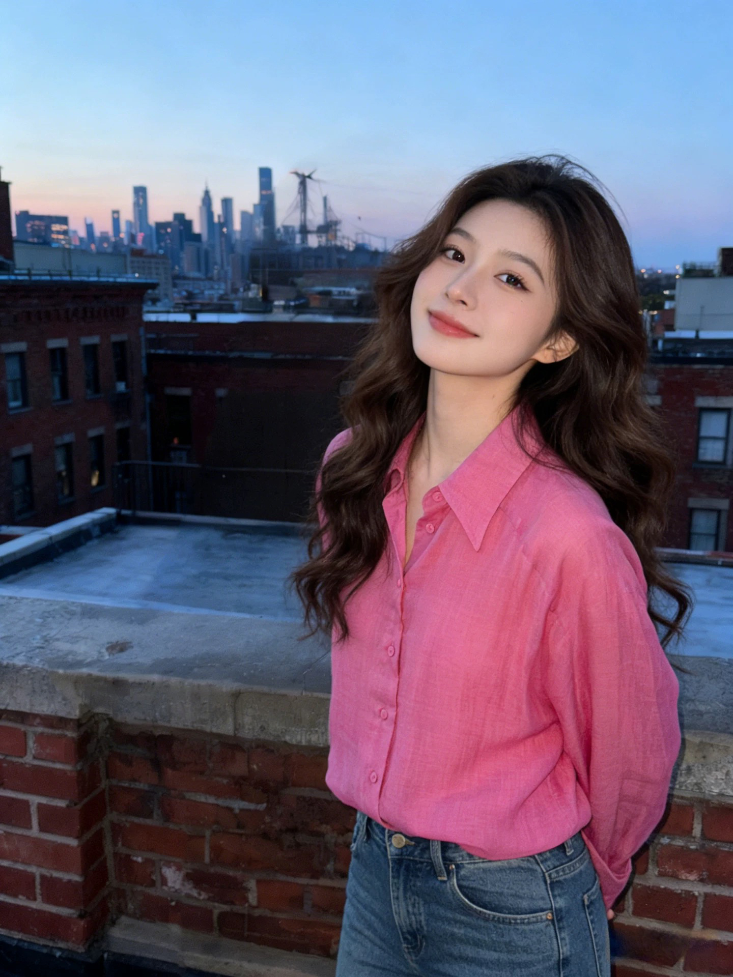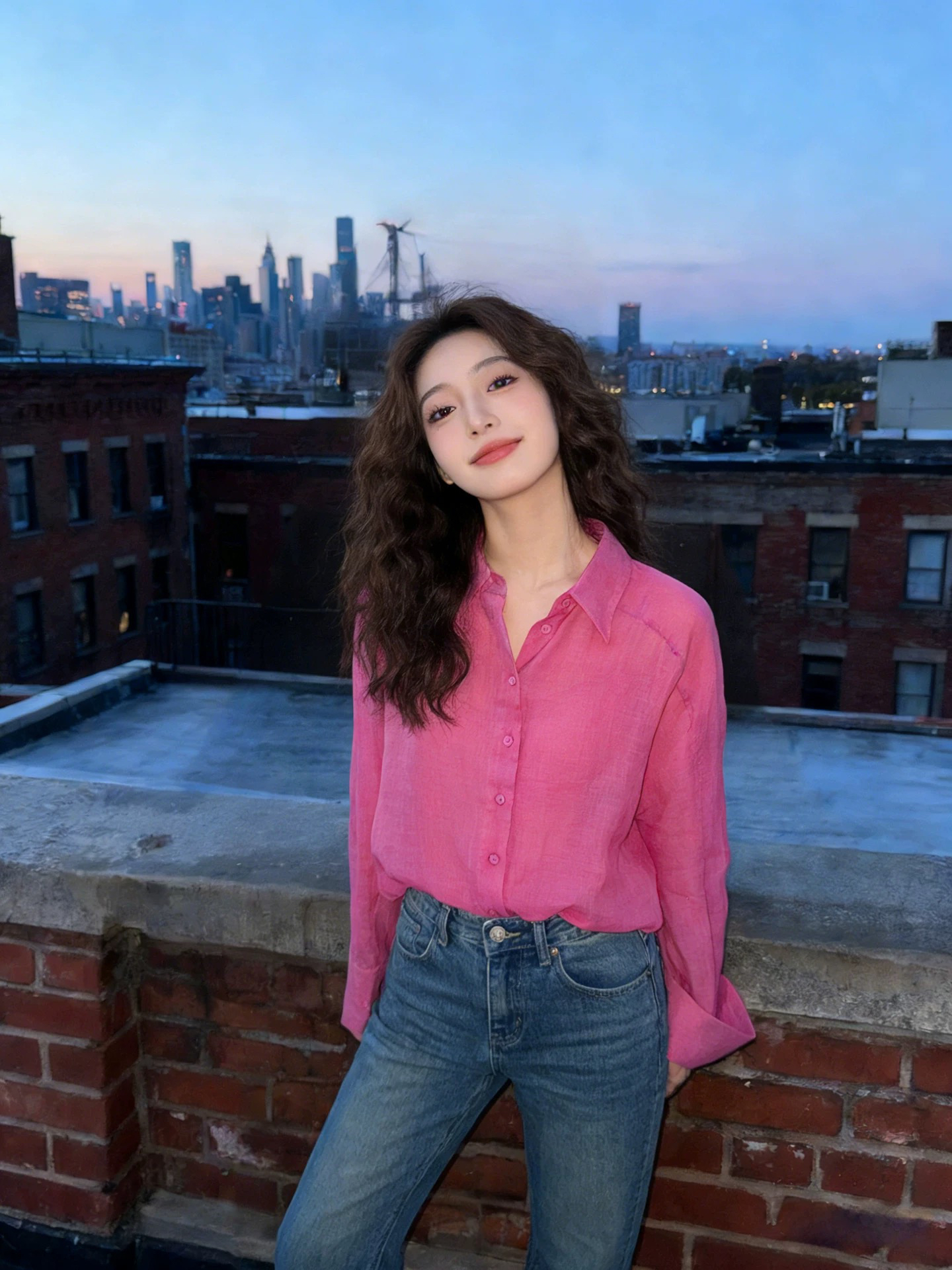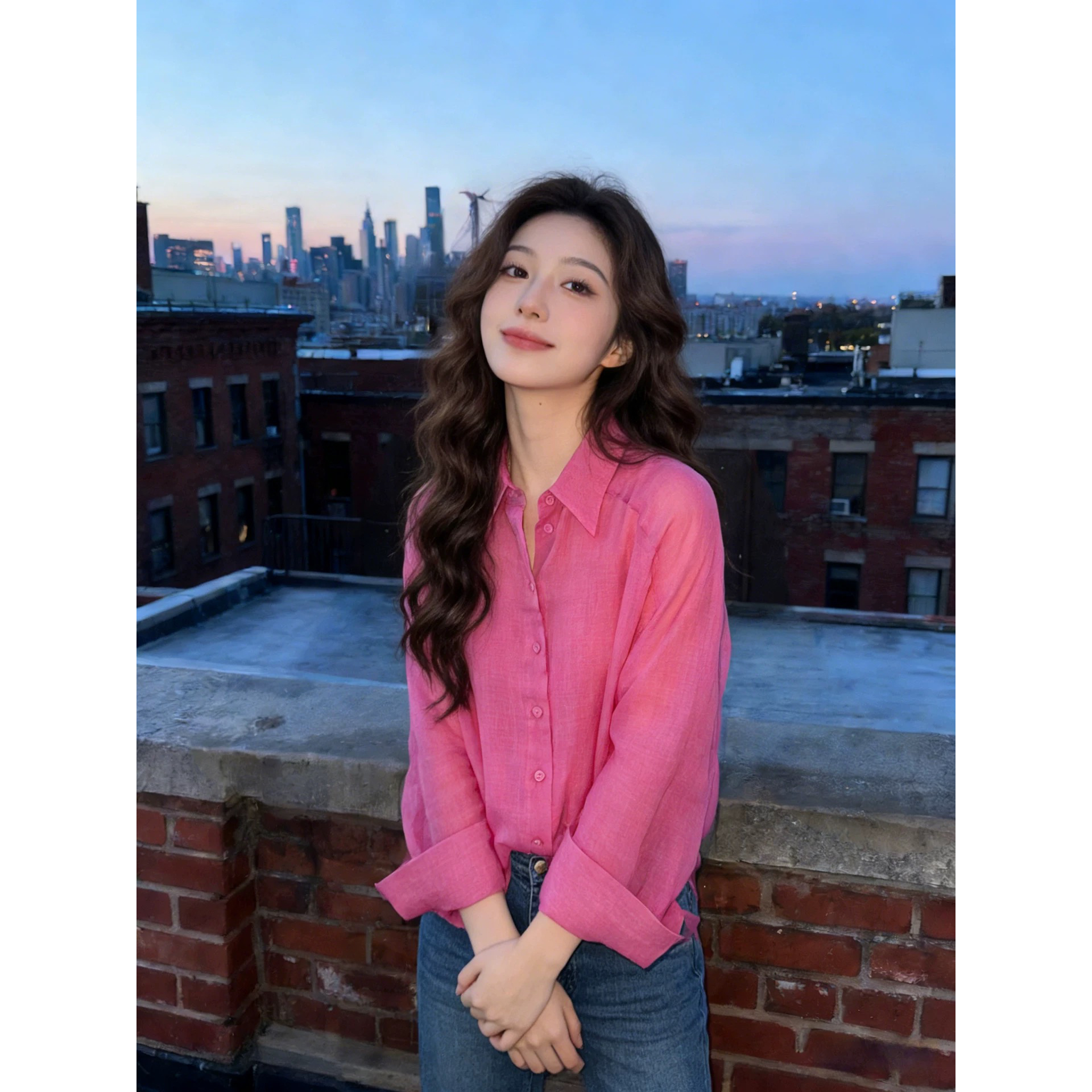 미니멀리즘 바람 장미 핑크색 아마 폴로 칼라 단추 품격 여성 셔츠 레트로 출퇴근 루즈핏 슬림해 보이는 느긋한 맨위