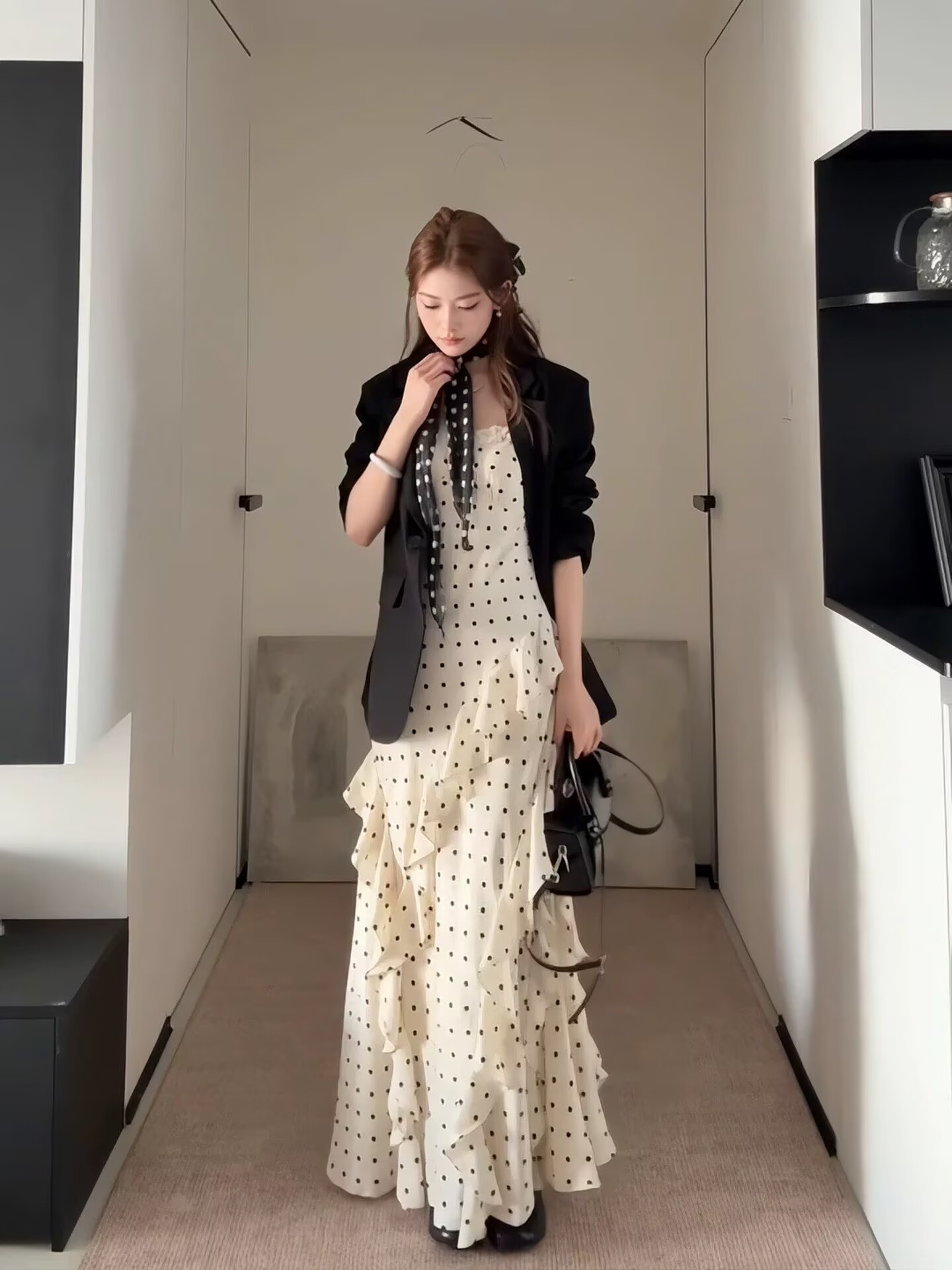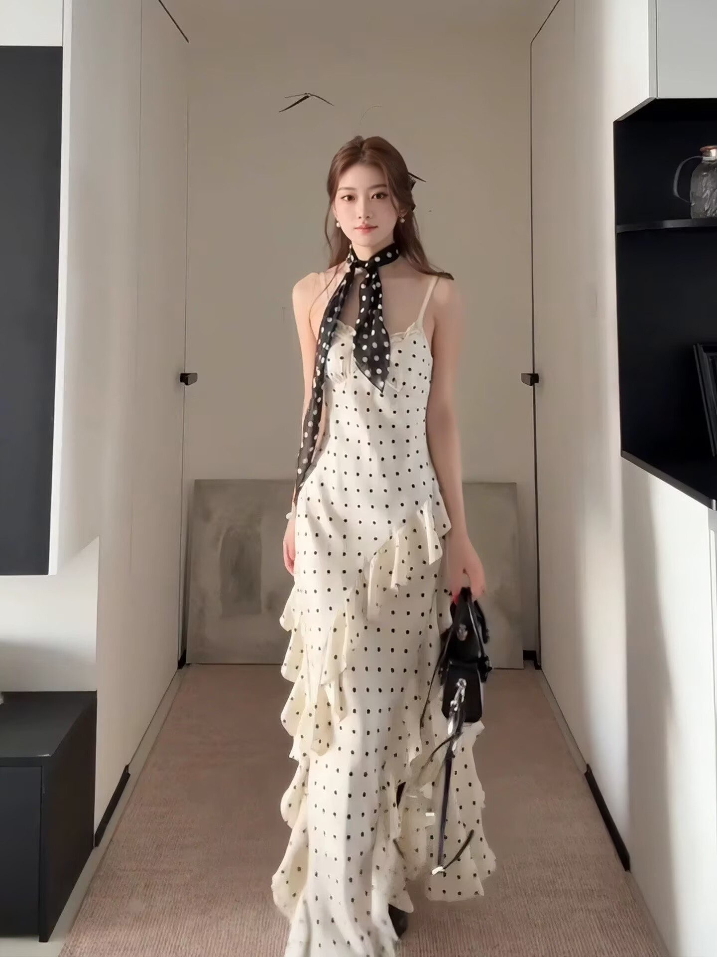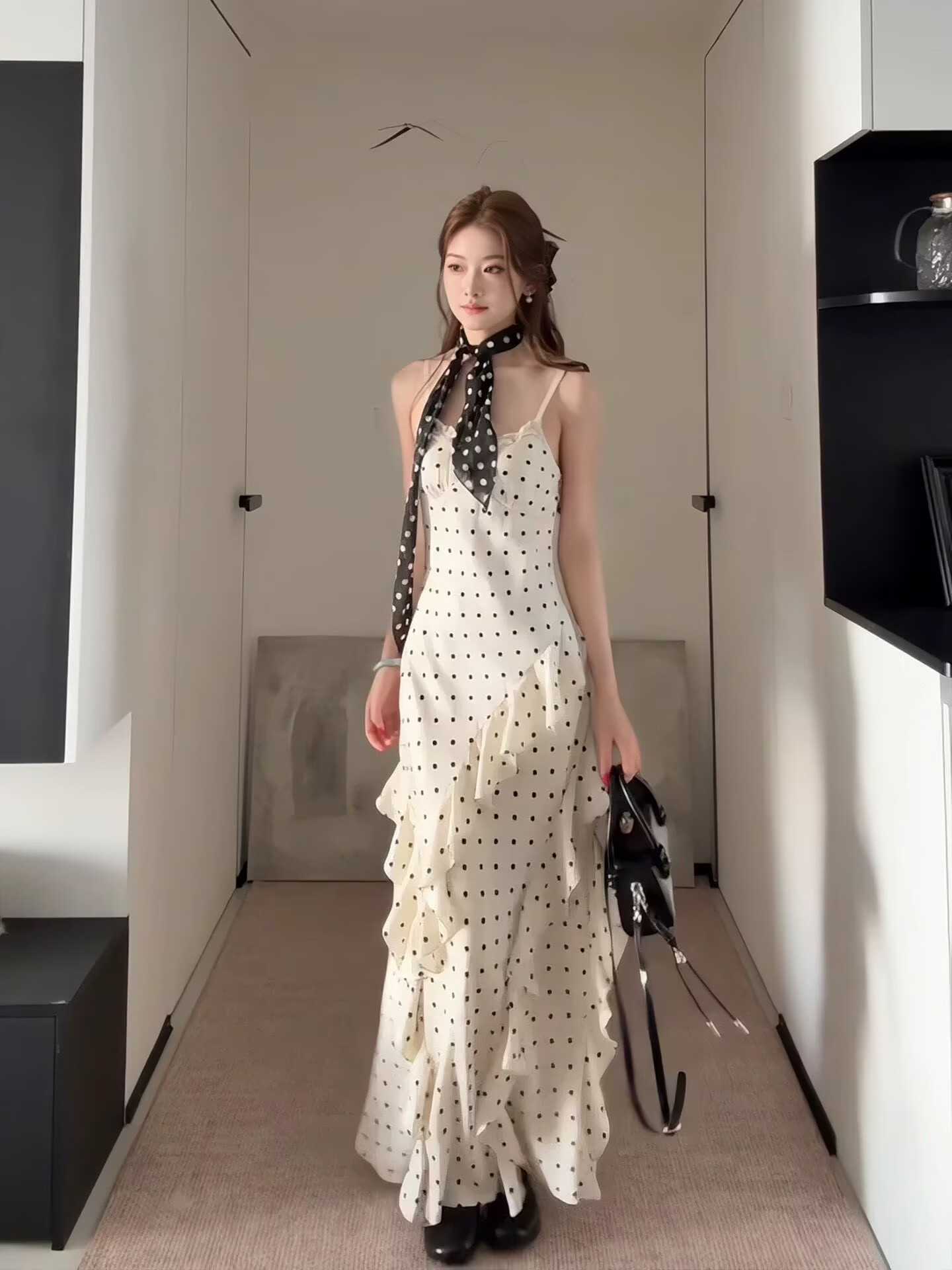 디자인 센스 작은 대중 도트 무늬 슬립 여성 드레스 2026 봄 새로운 프랑스식 하이웨이스트 프릴 인어 꼬리 스커트