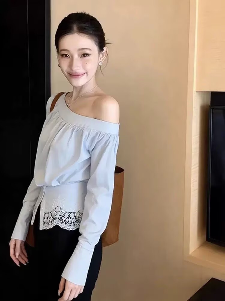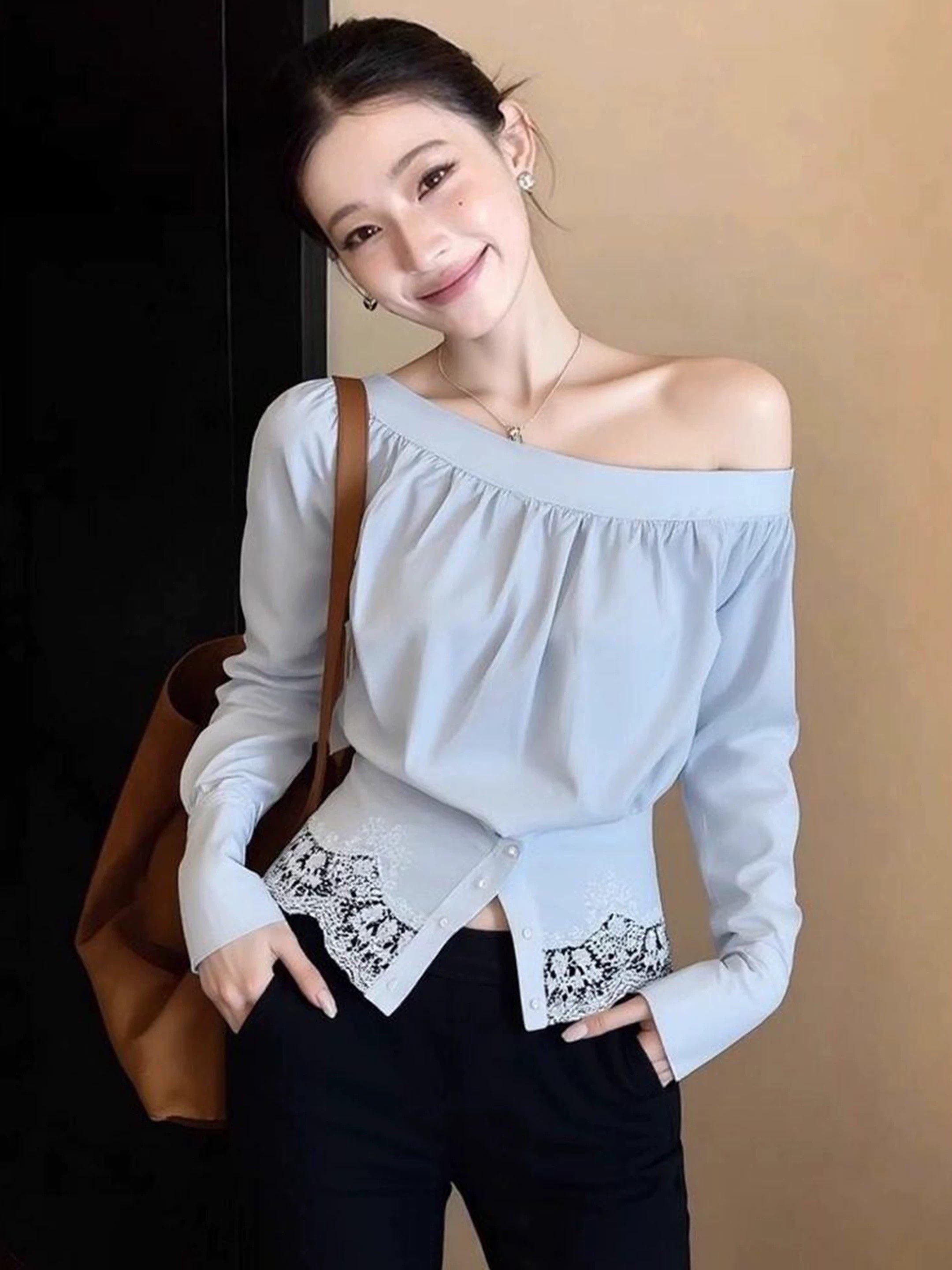 프랑스식 고급 센스 패치워크 레이스 비스듬한 어깨 긴팔 여성 셔츠 가을 작은 대중 고유 한 허리 수축 슬림해 보이는 오프숄더 맨위