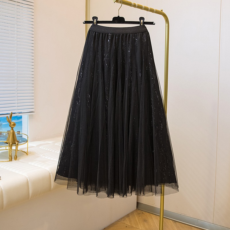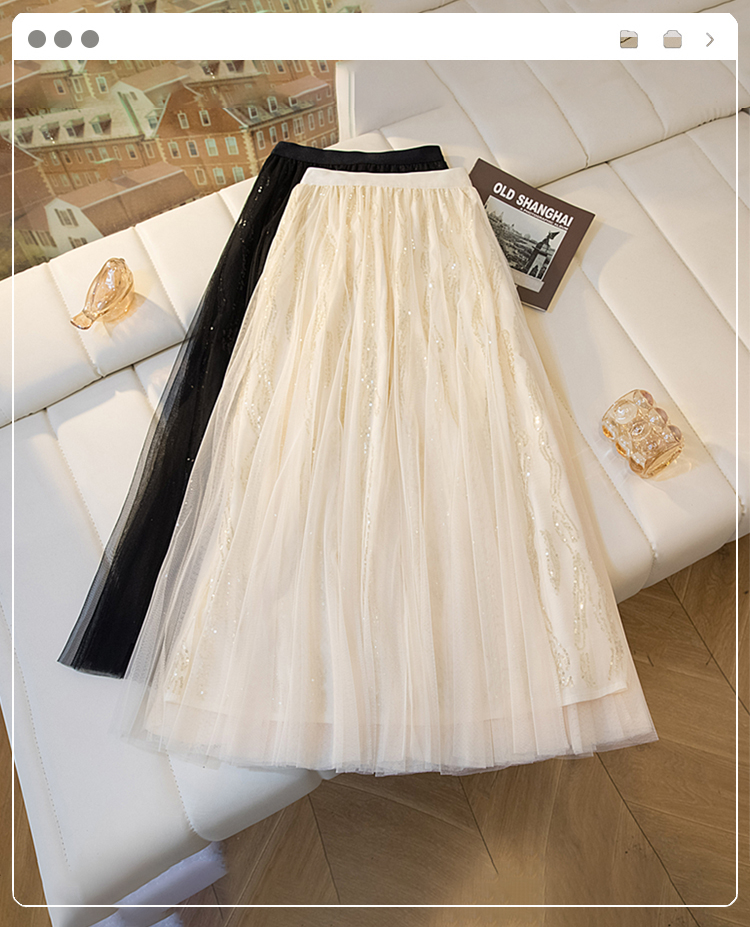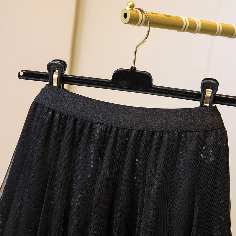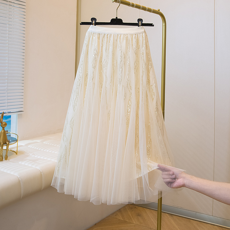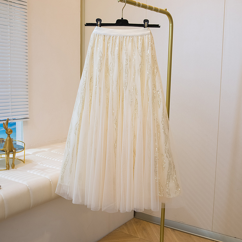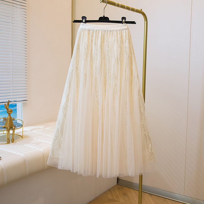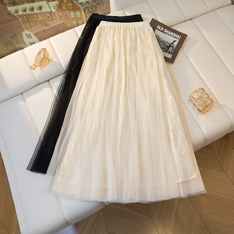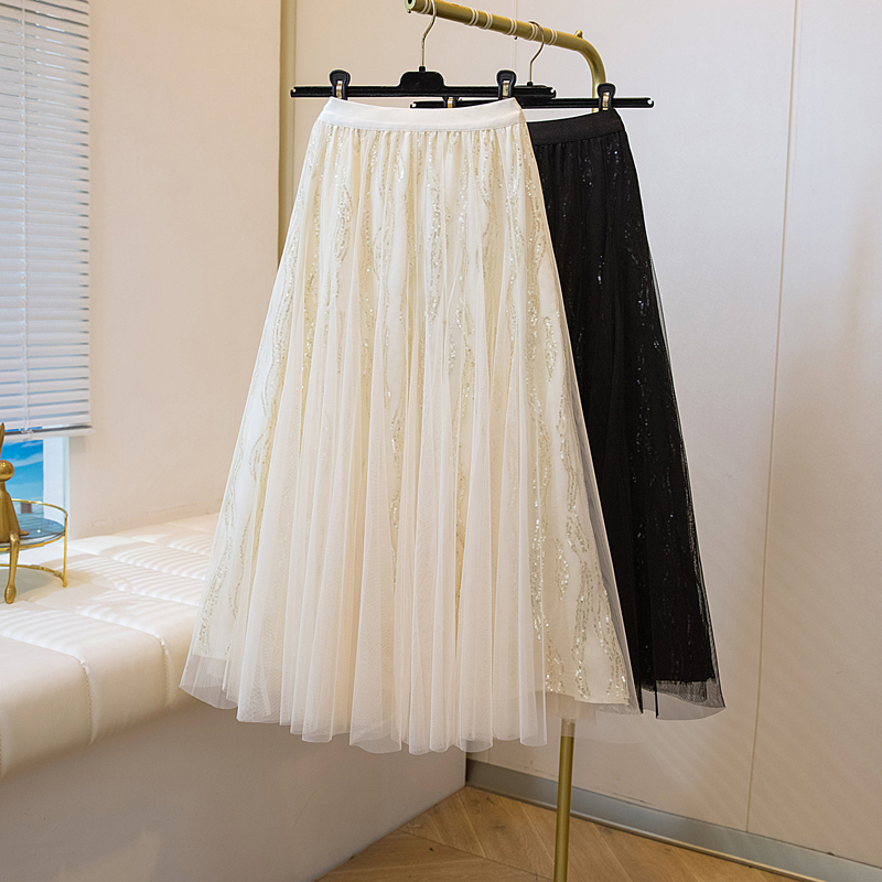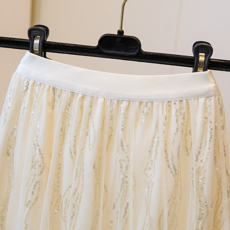 실사 여름 새로운 스팽글 망사 롱 코트 반신 스커트 자수 무거운 작업 빅 사이즈 반신 스커트