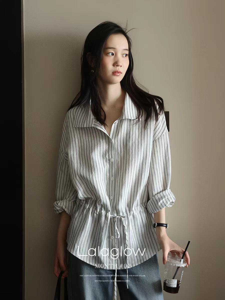 한 부서 디자인 센스 면 린넨 펌프 로프 허리 수축 스트라이프 여성 셔츠 봄 미니멀리즘 다용도 품격 다용도 루즈핏 맨위