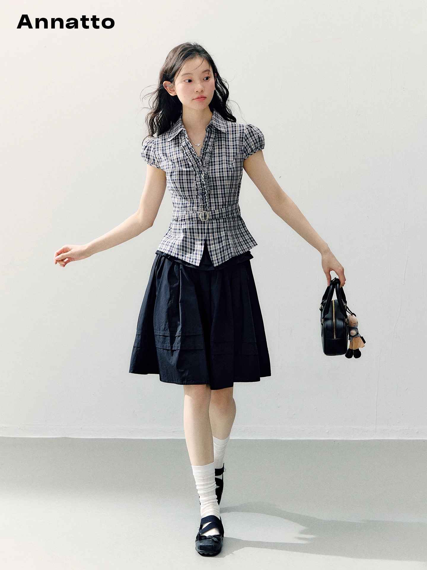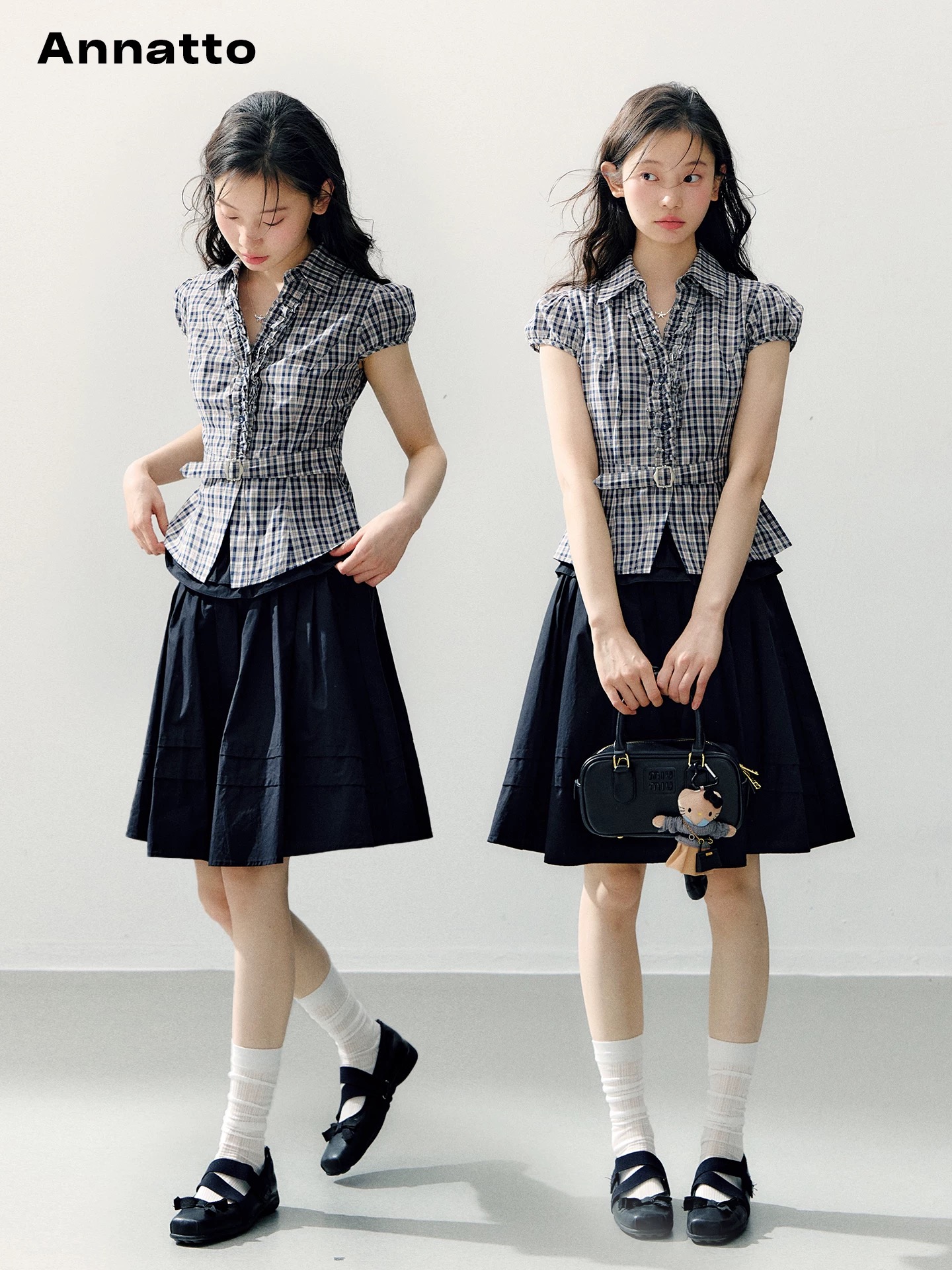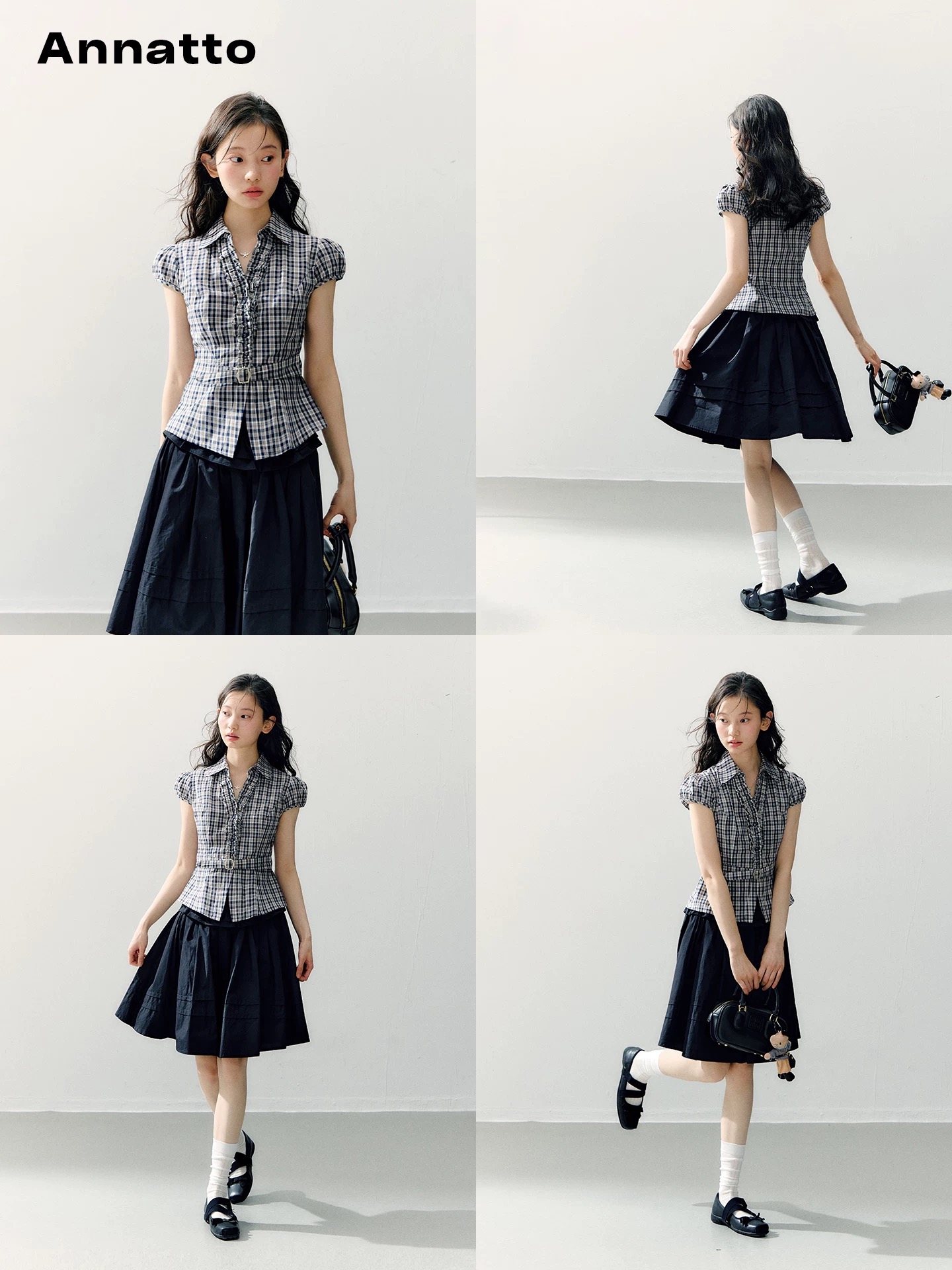 3 월 23 일 신제품 annatto 레트로 학원 스타일 체크무늬 V넥 허리 수축 레이스업 반팔 여성 셔츠 여름