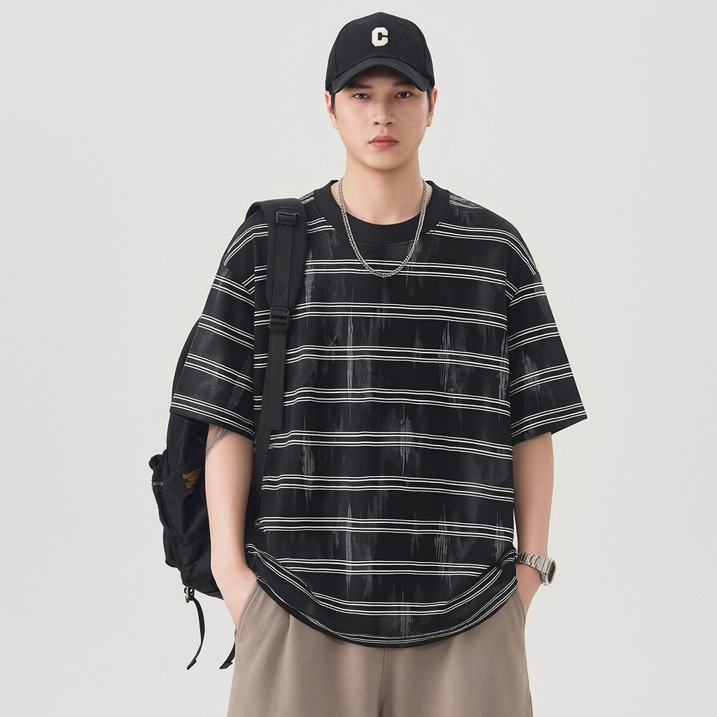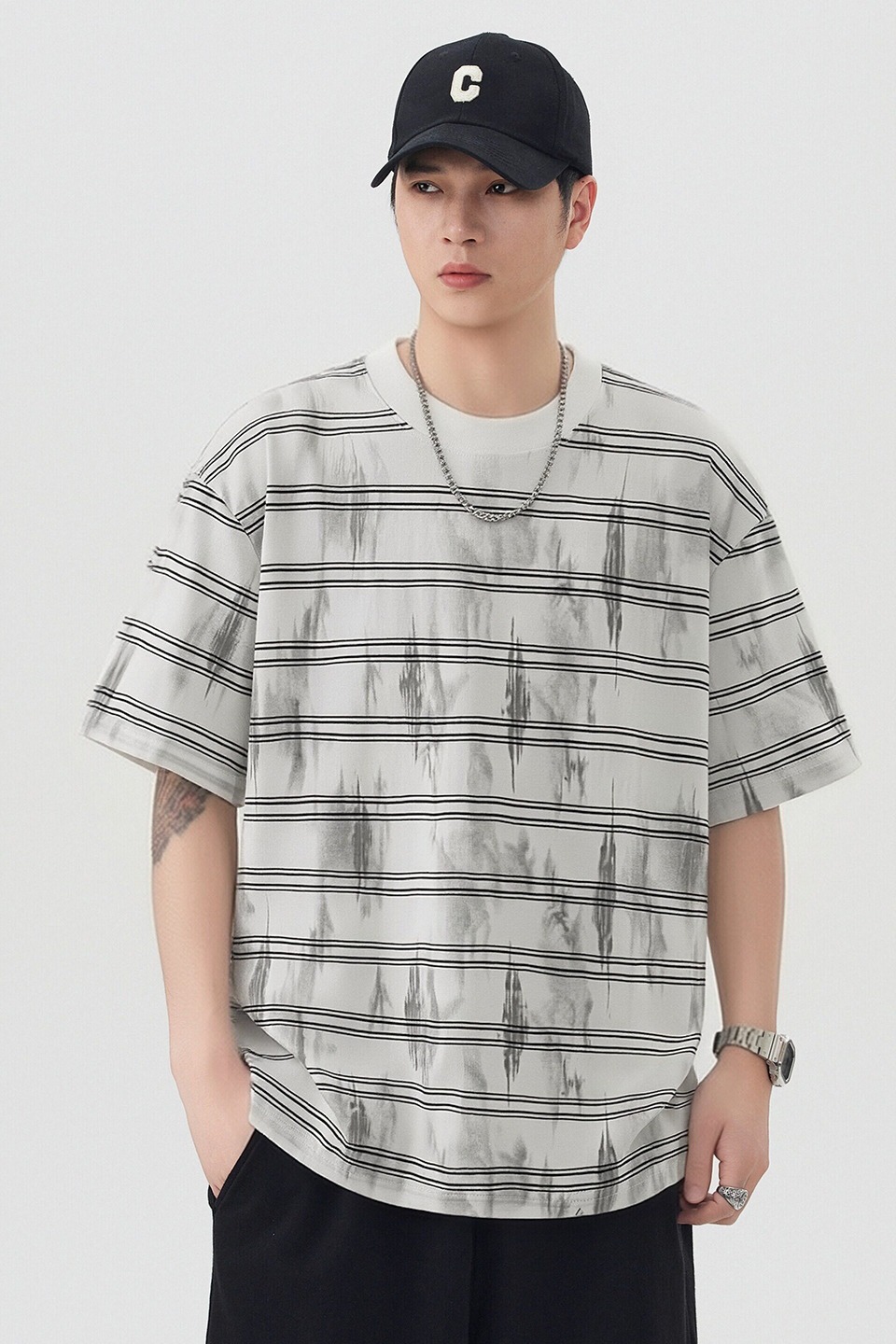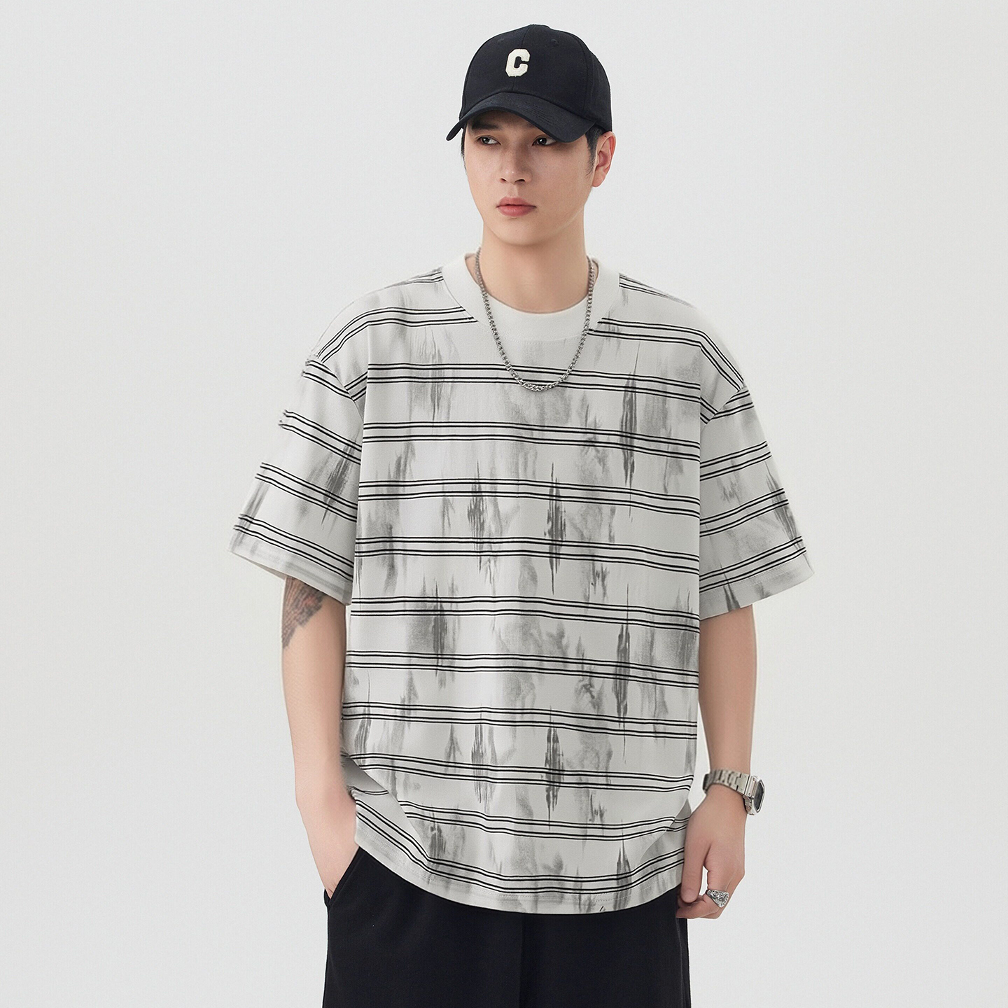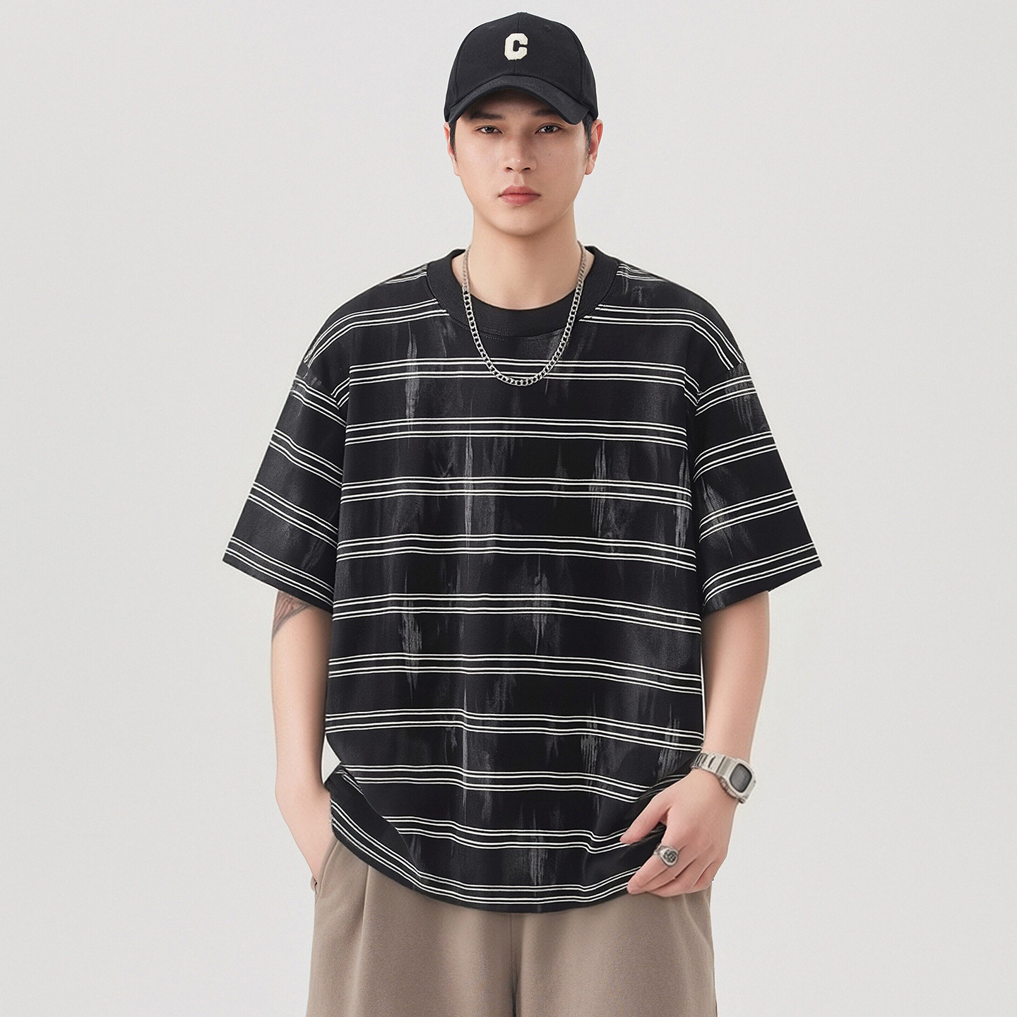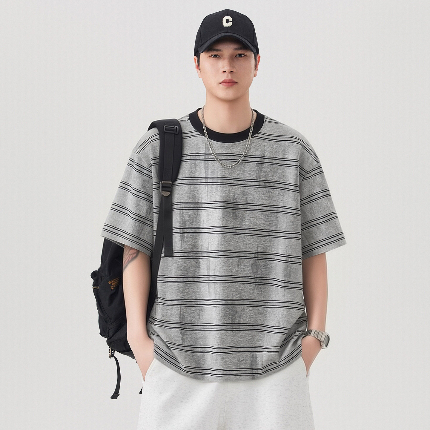 실사 2026 여름 새로운 조수 브랜드 아메리칸 반팔 티셔츠 남자 스트라이프 다용도 라운드 넥 반소매 동정