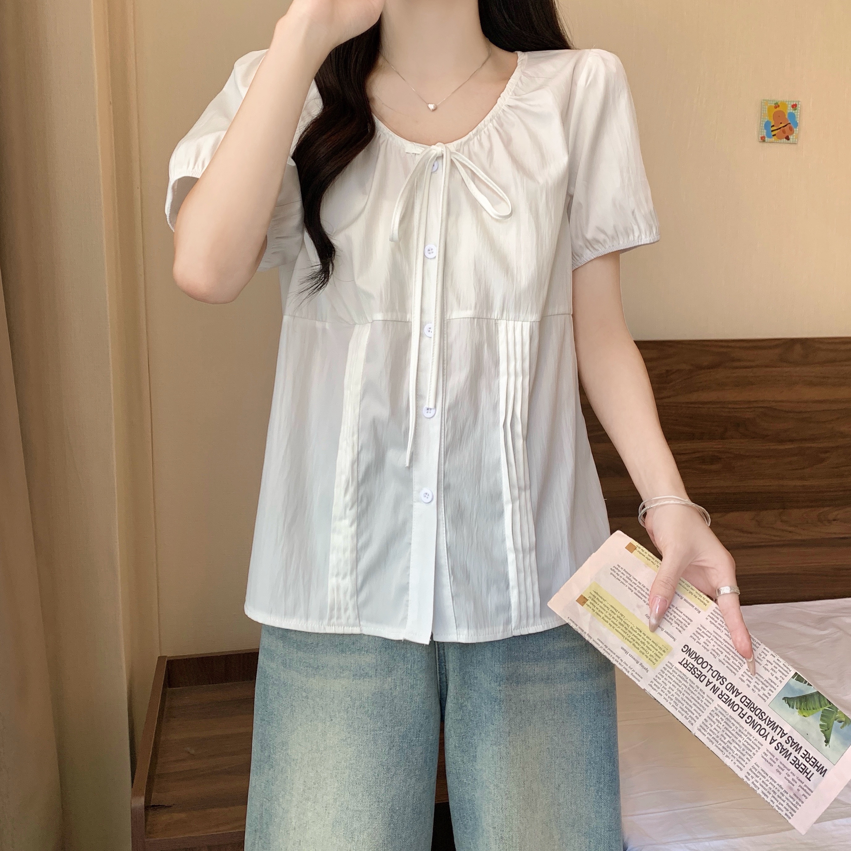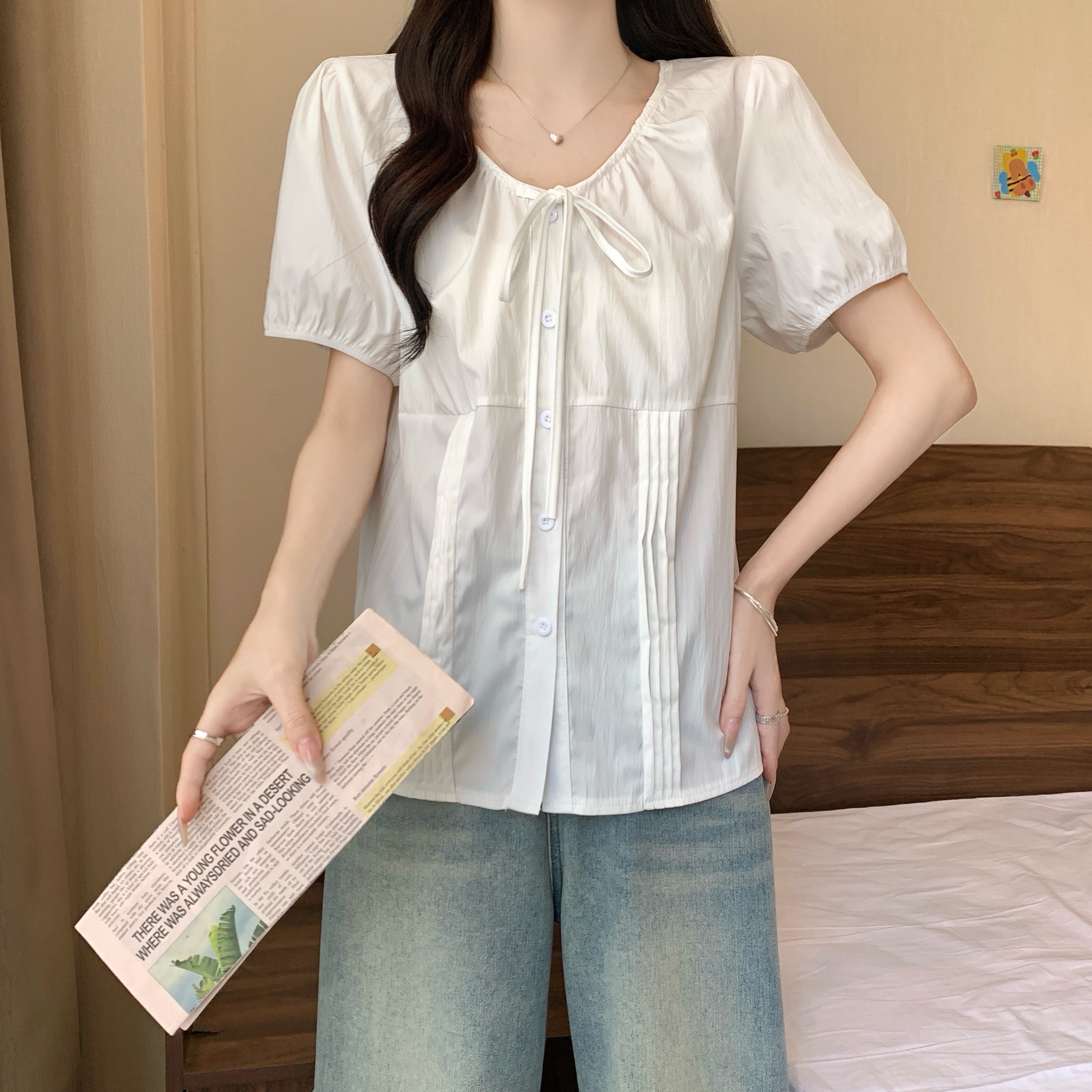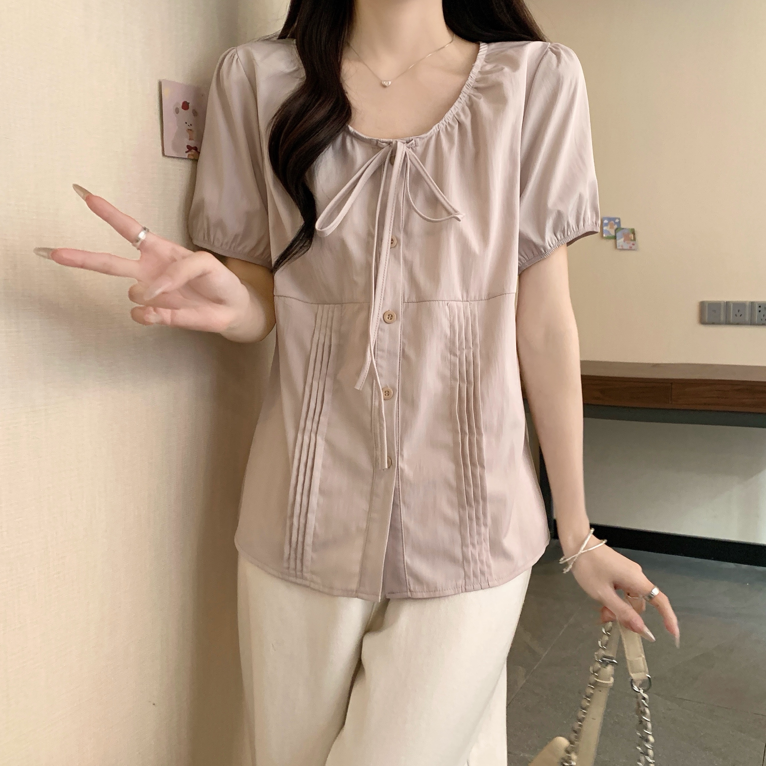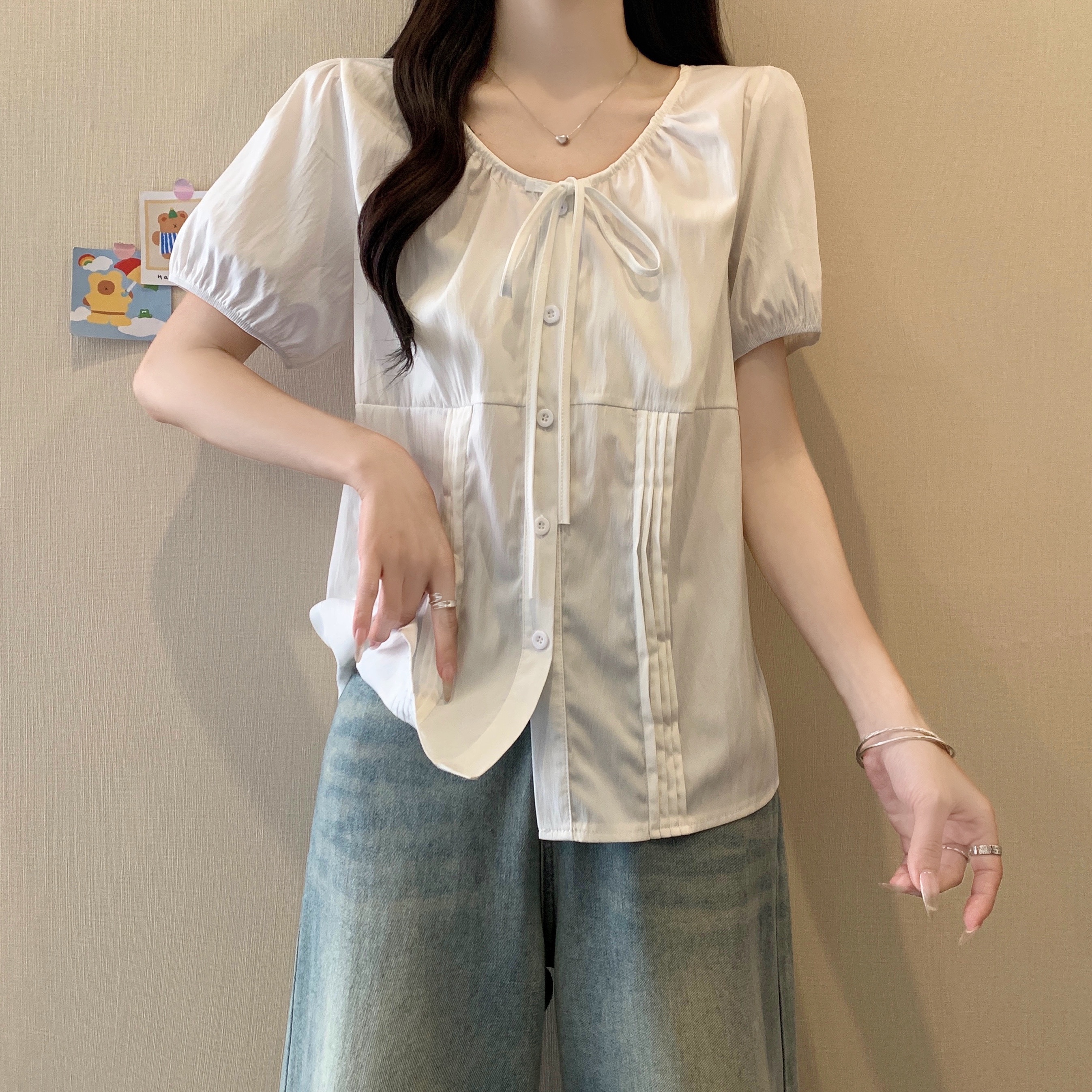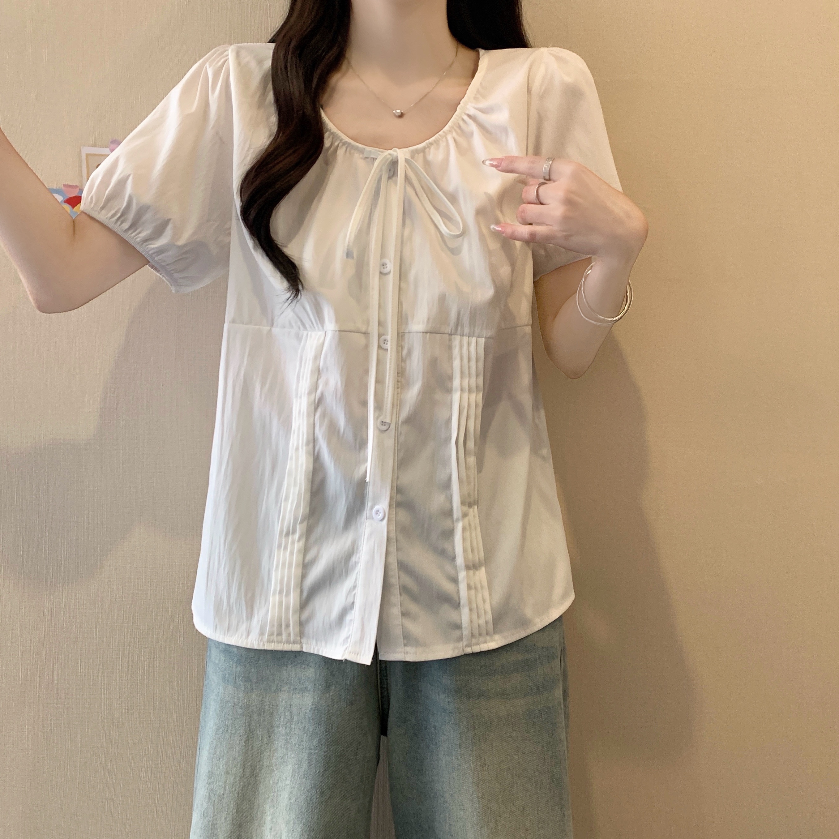실사 정가 2026 빅 사이즈 여성 의류 새로운 디자인 센스 레이스업 플리츠 거품 소매 반팔 셔츠