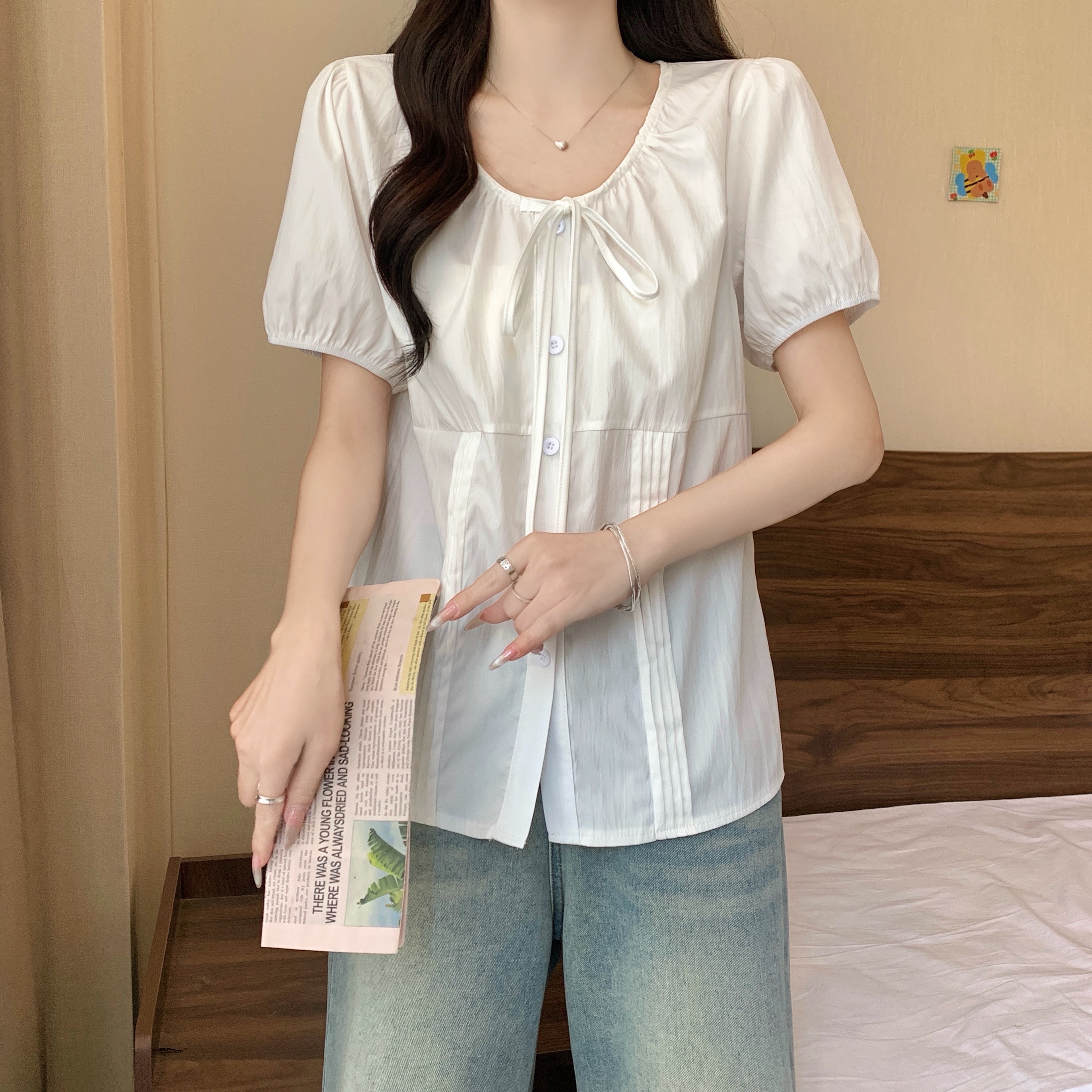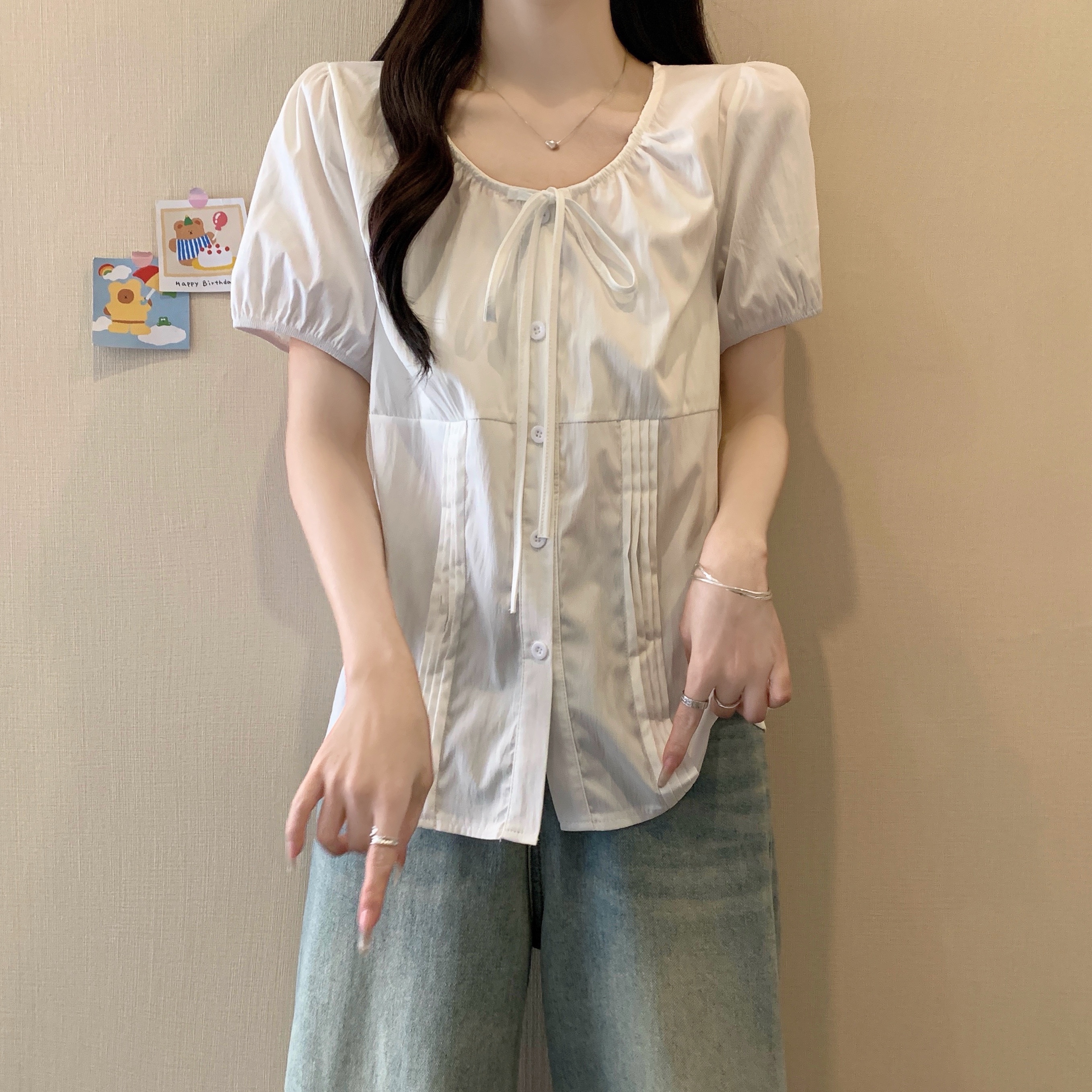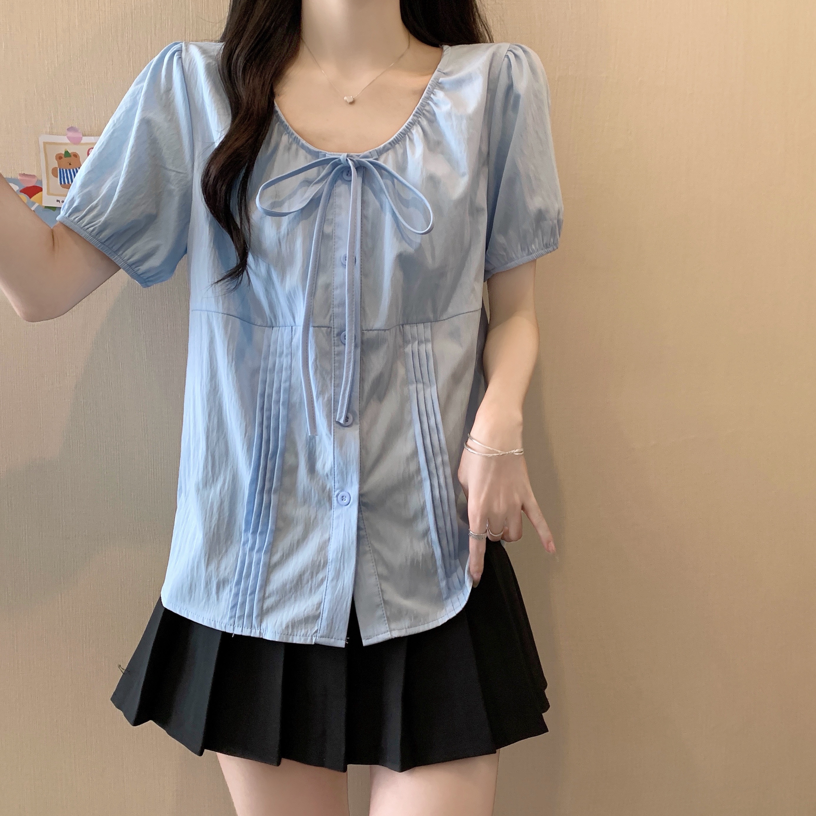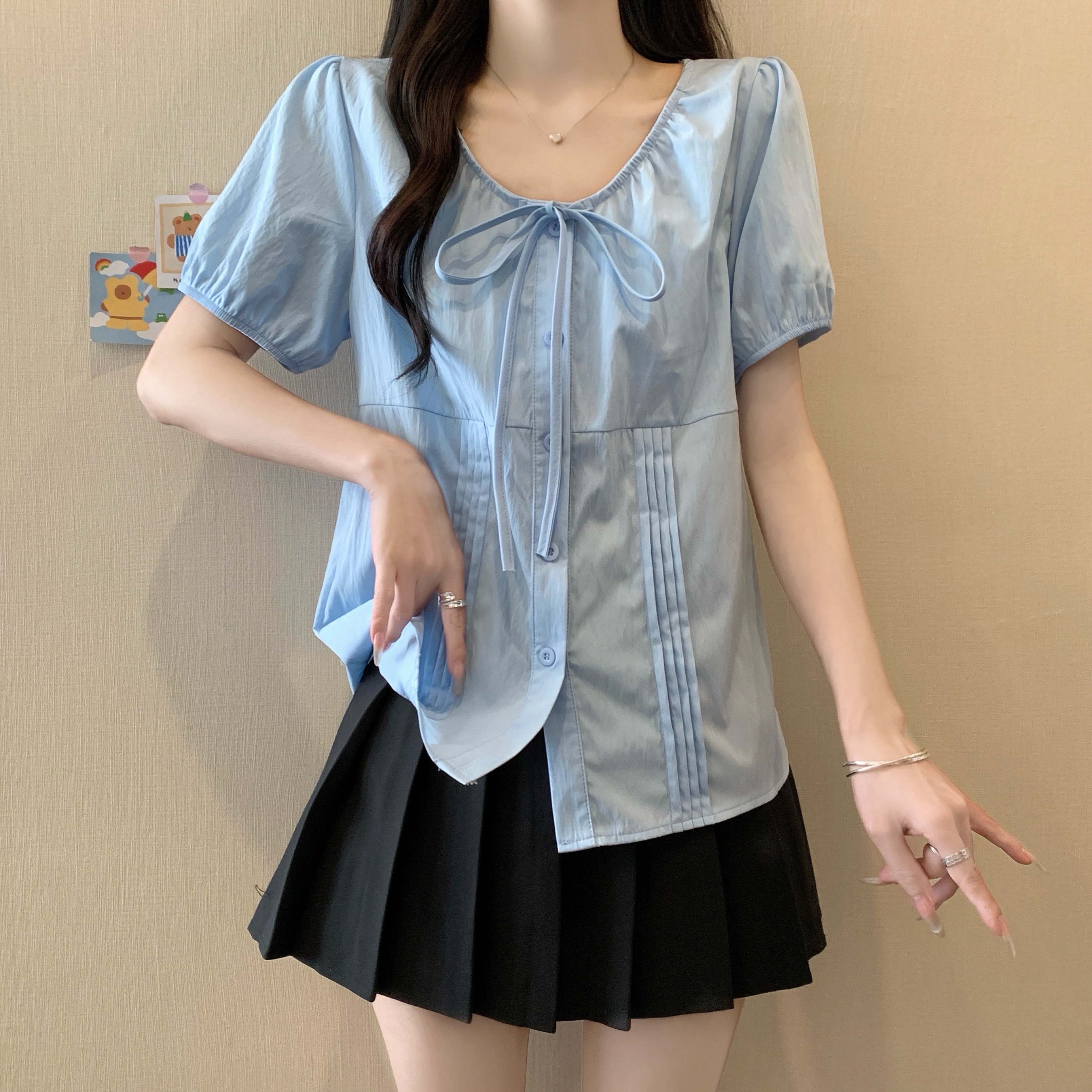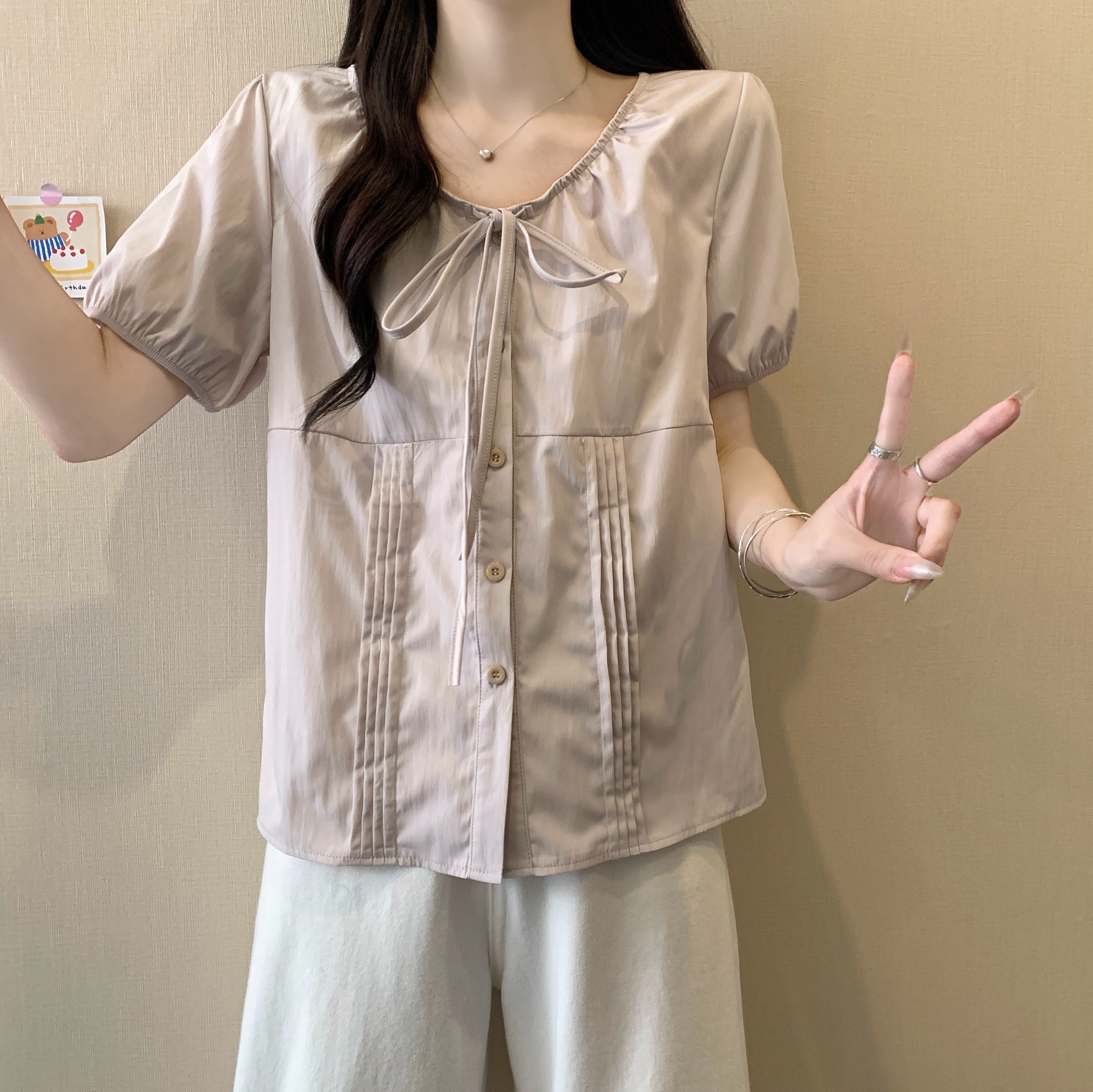 실사 정가 2026 빅 사이즈 여성 의류 새로운 디자인 센스 레이스업 플리츠 거품 소매 반팔 셔츠