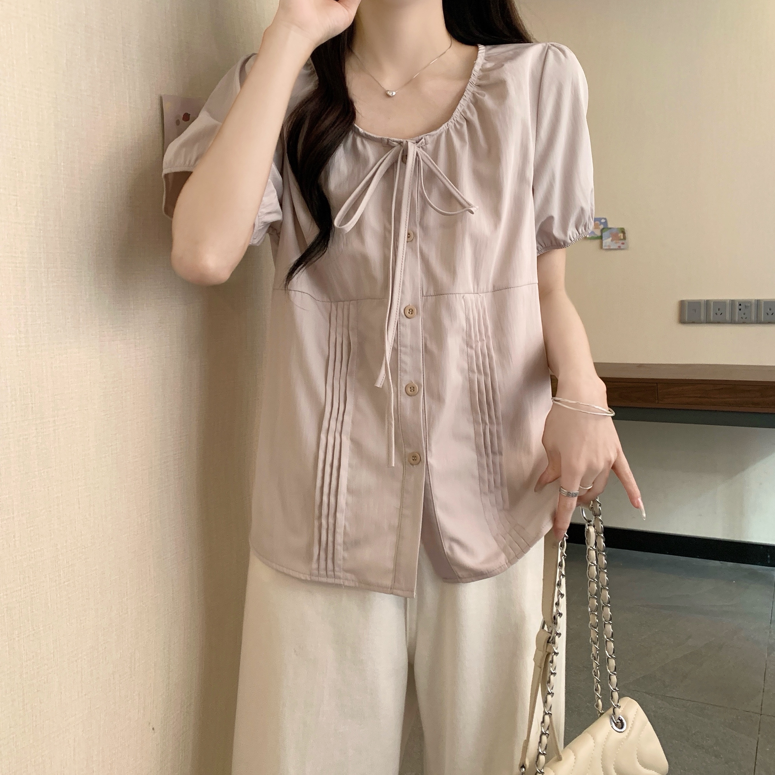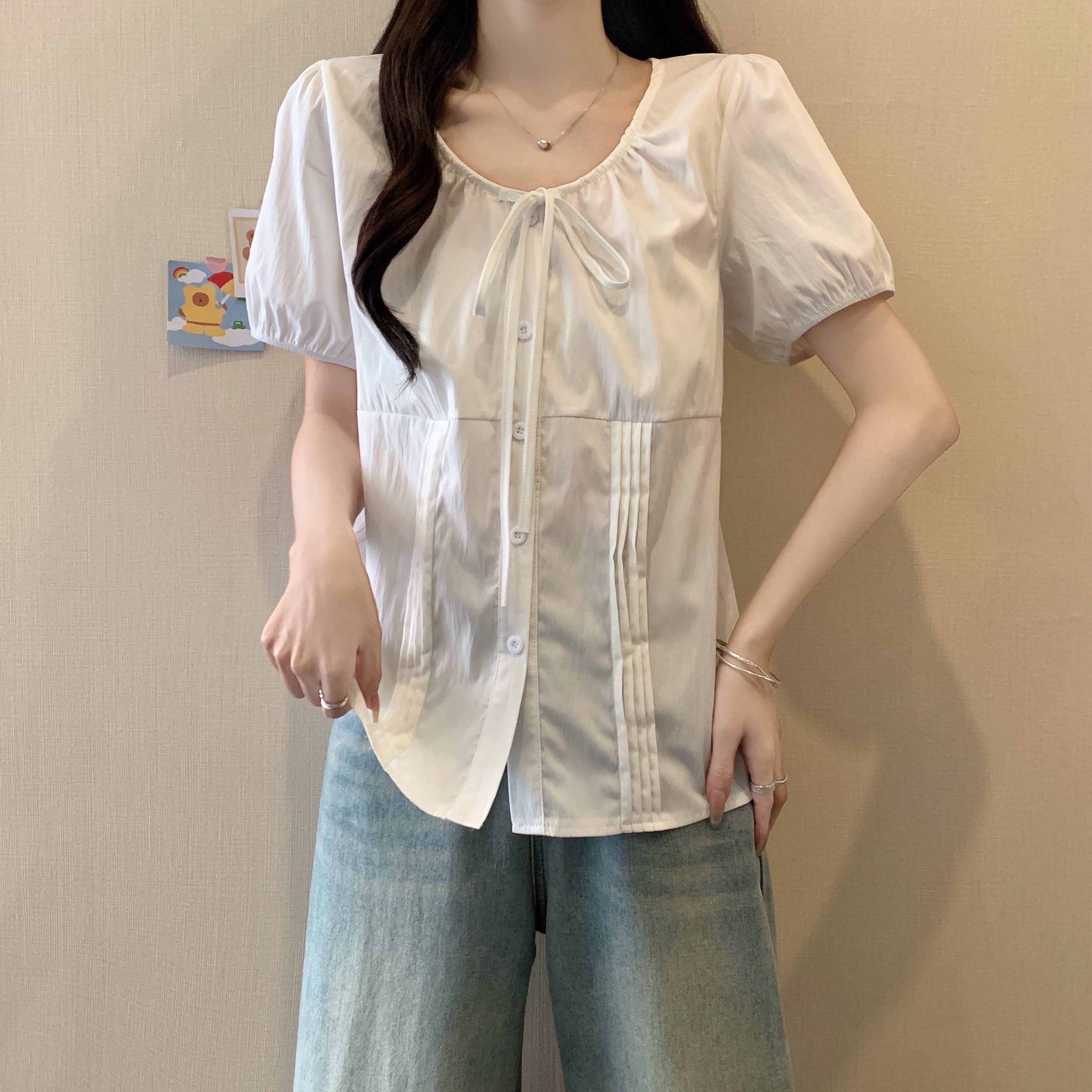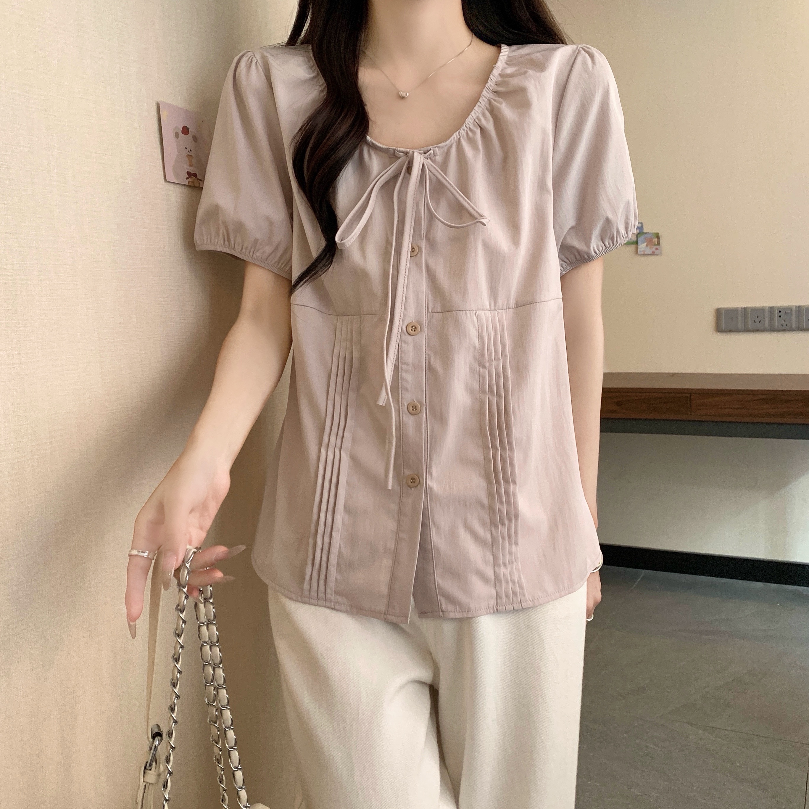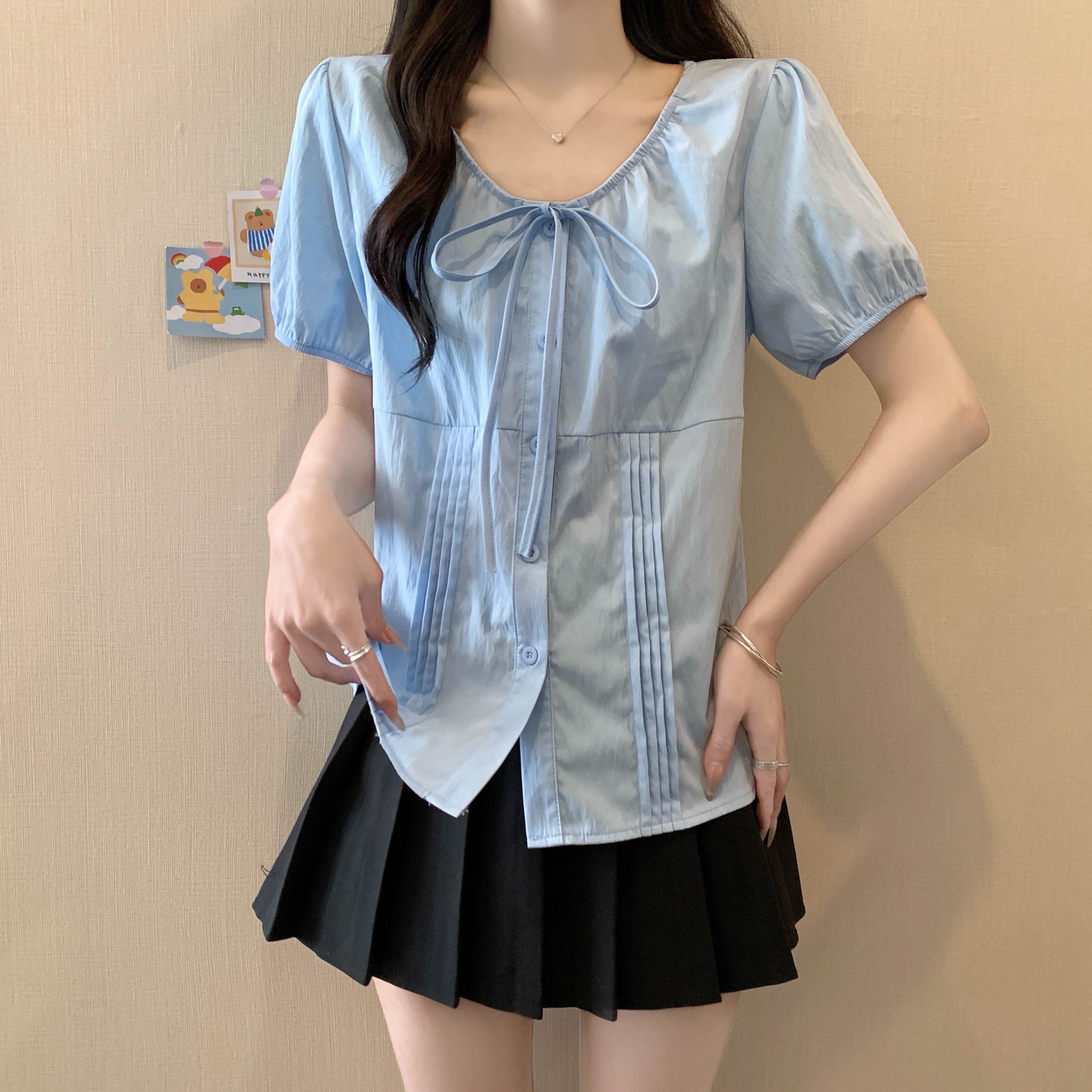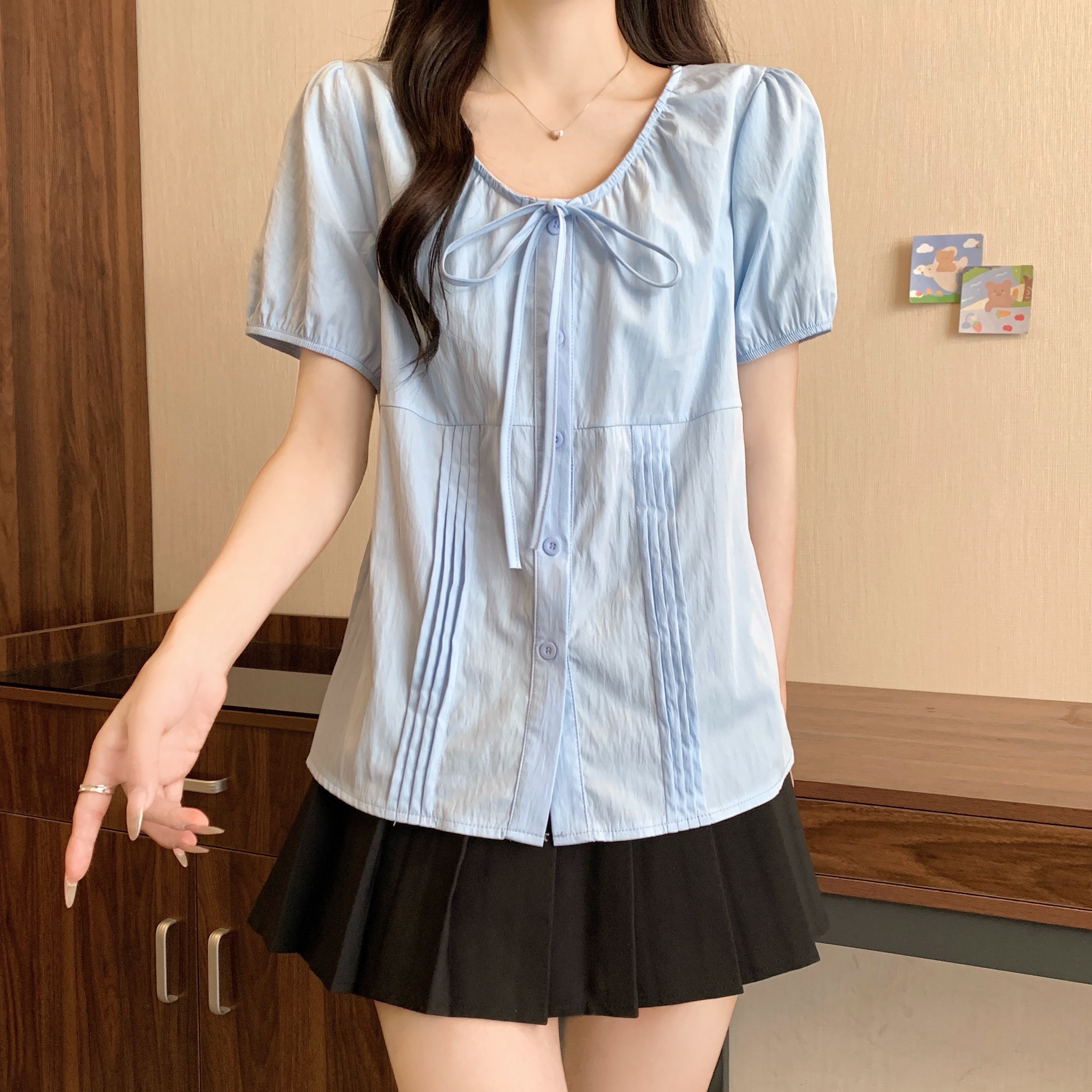 실사 정가 2026 빅 사이즈 여성 의류 새로운 디자인 센스 레이스업 플리츠 거품 소매 반팔 셔츠