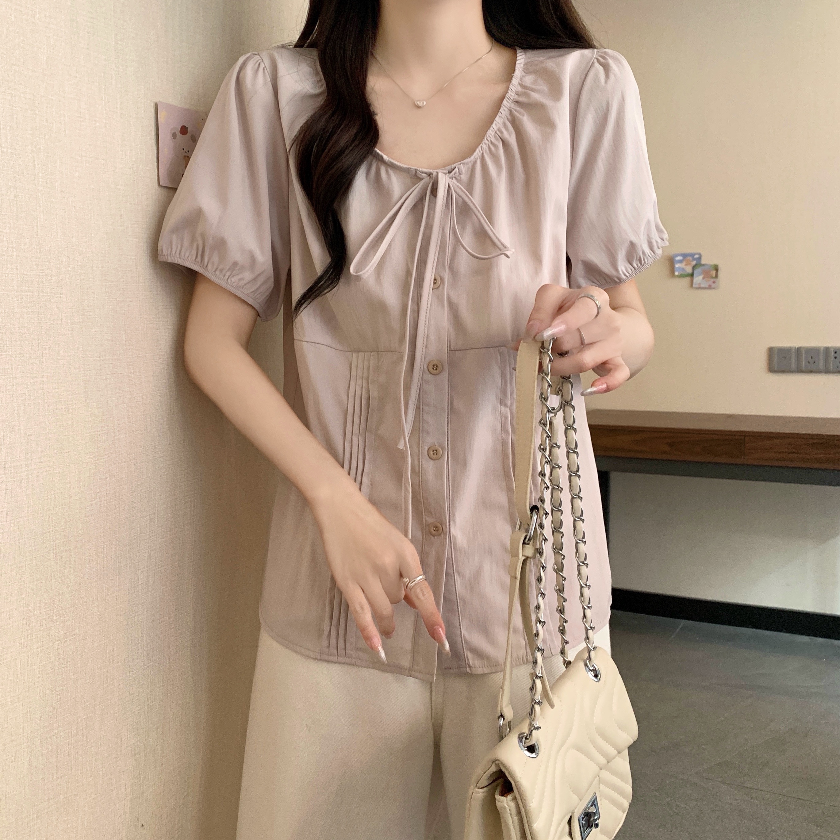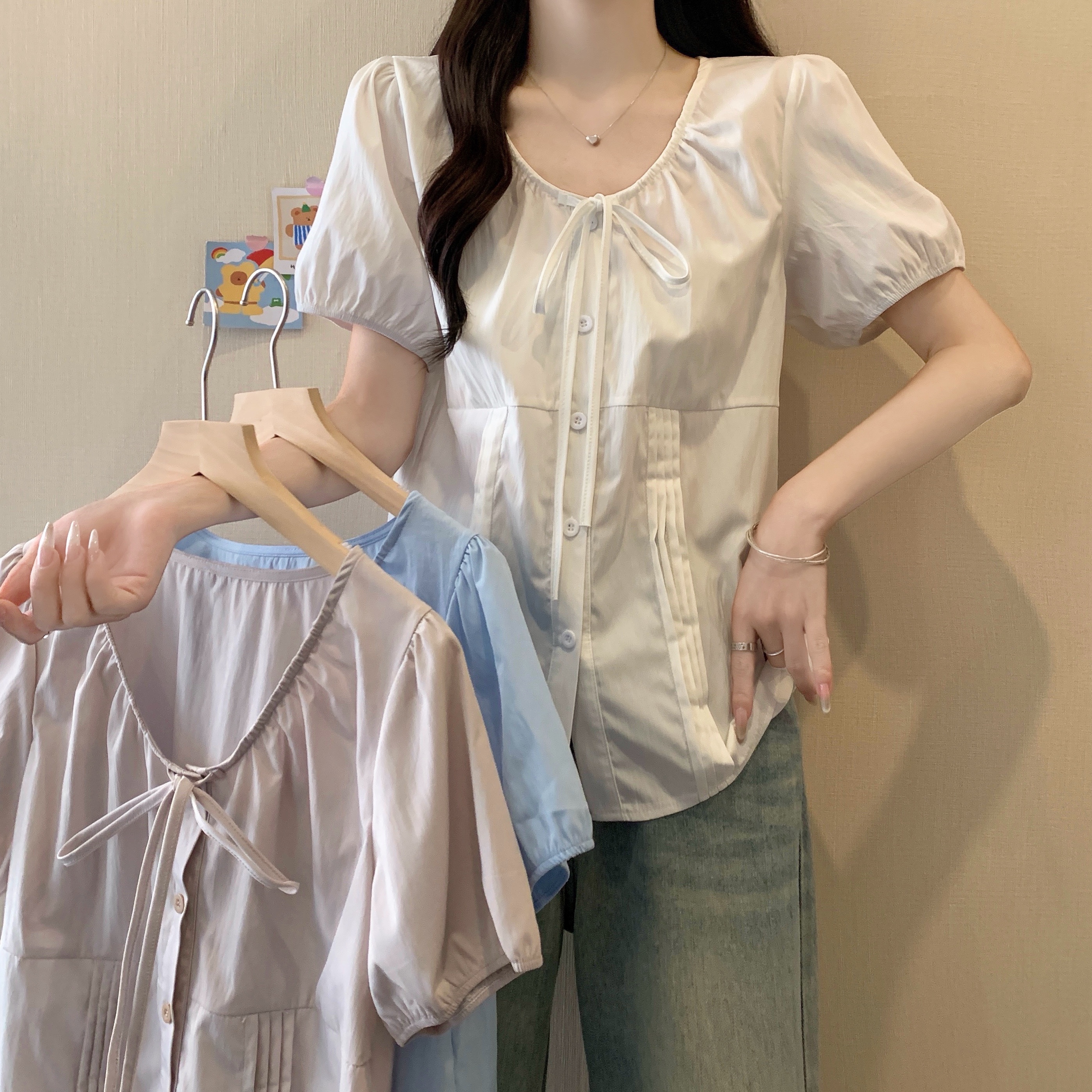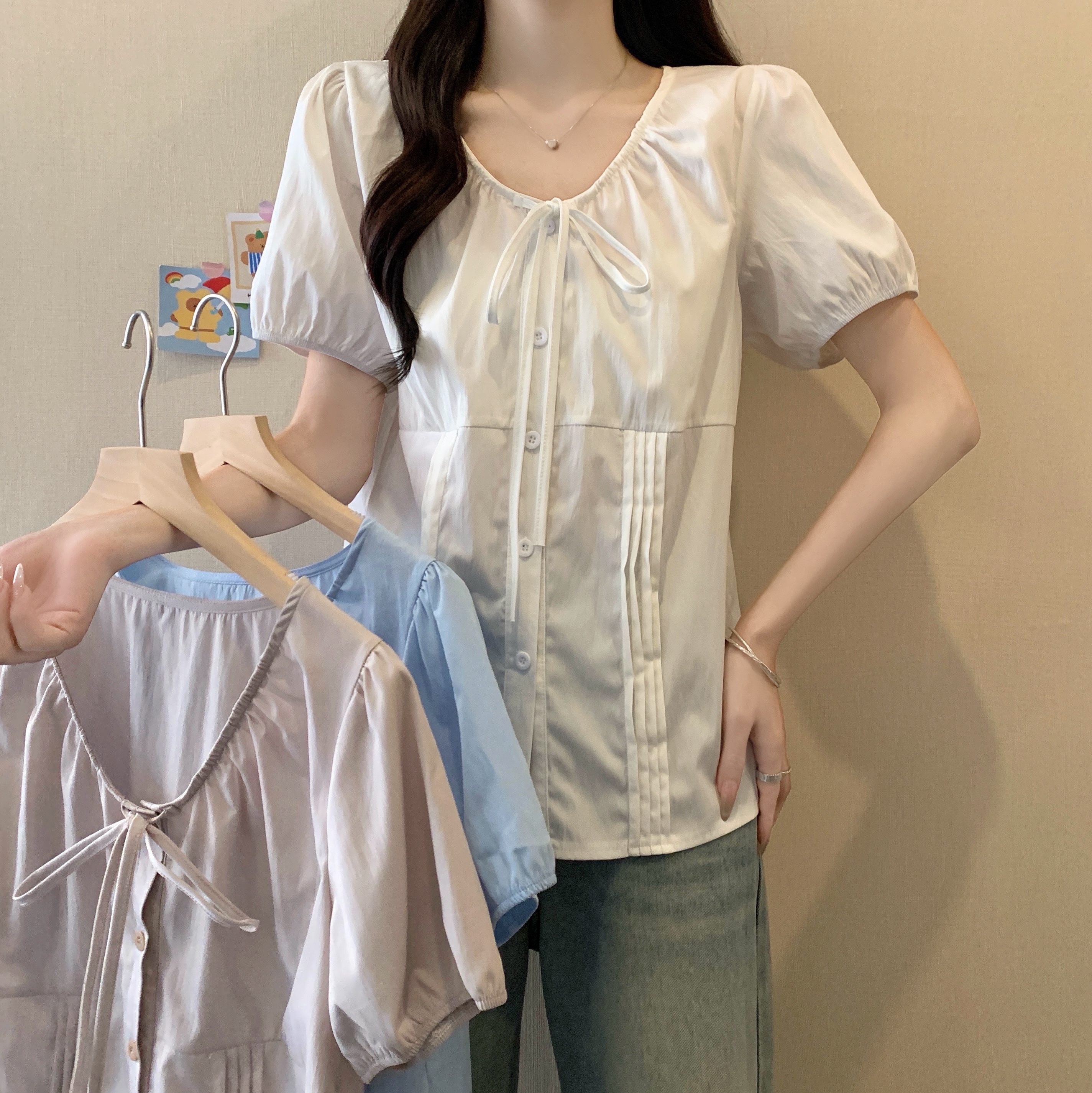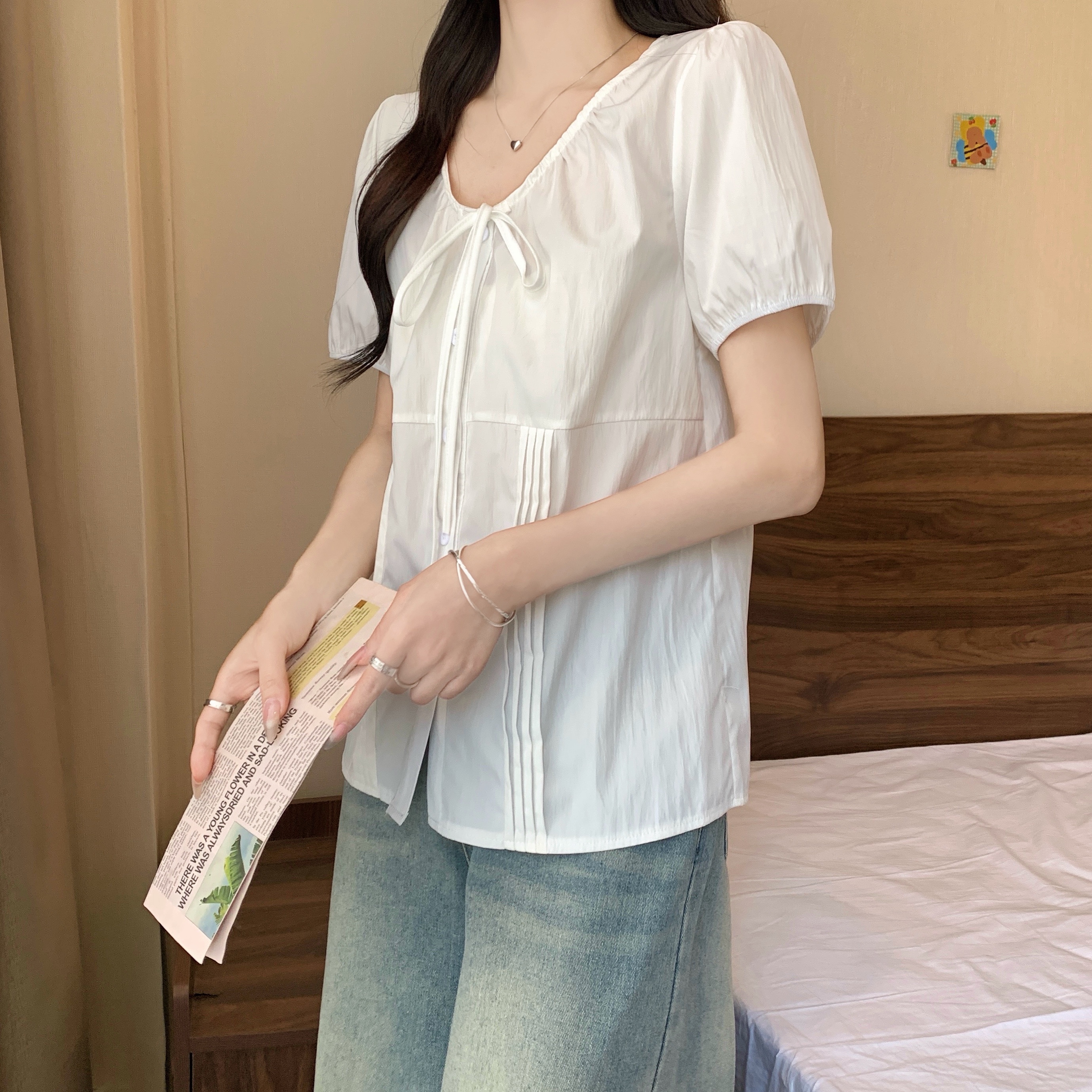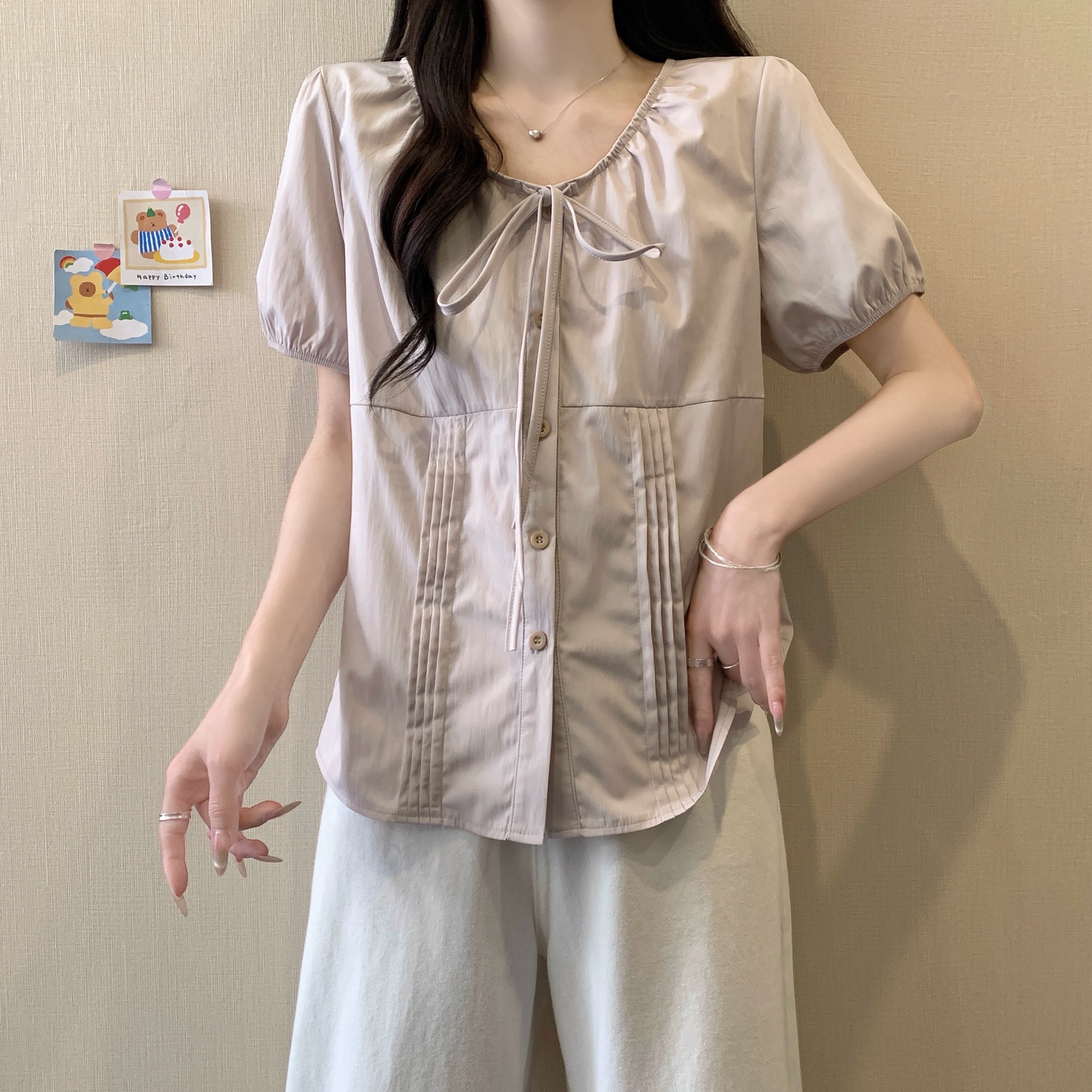 실사 정가 2026 빅 사이즈 여성 의류 새로운 디자인 센스 레이스업 플리츠 거품 소매 반팔 셔츠