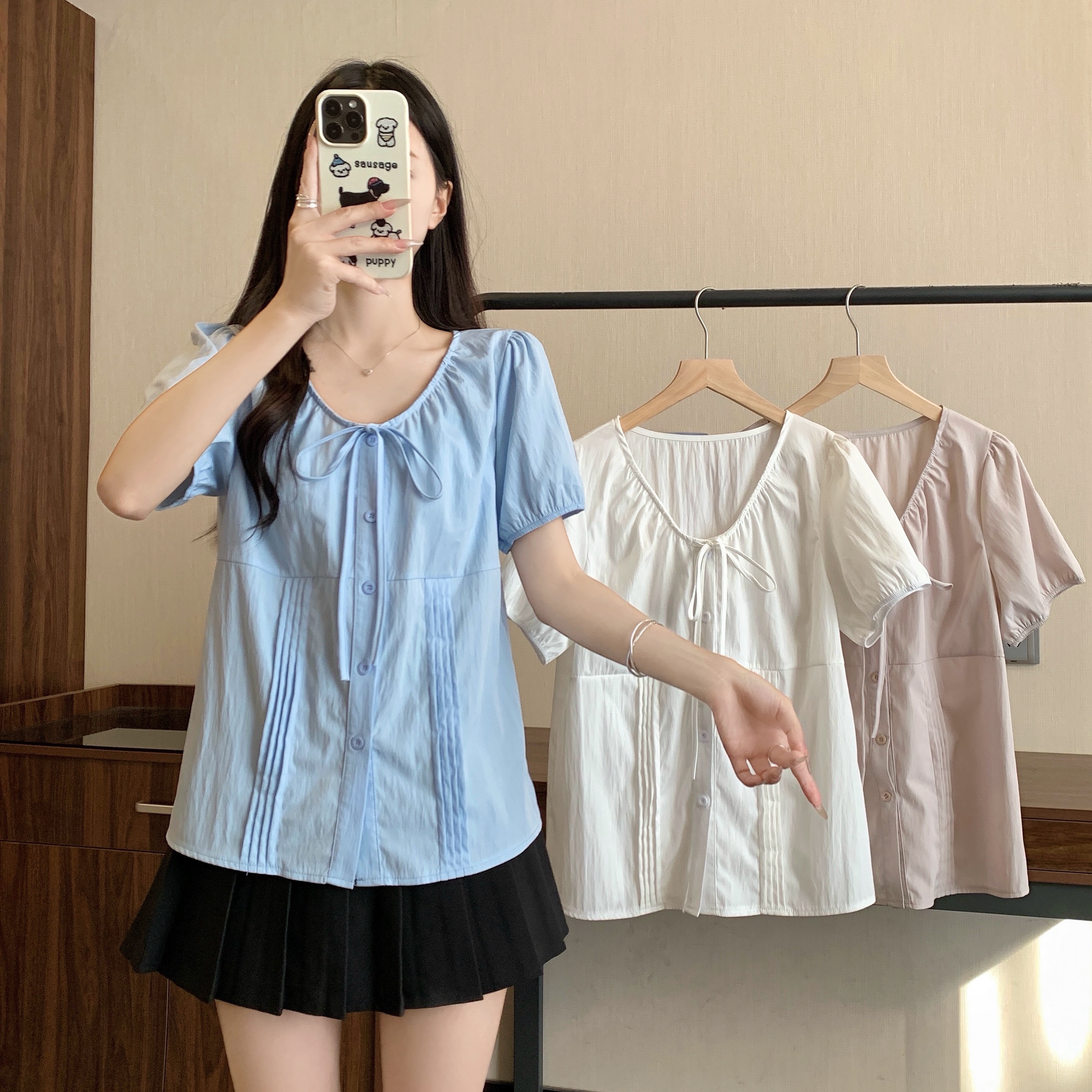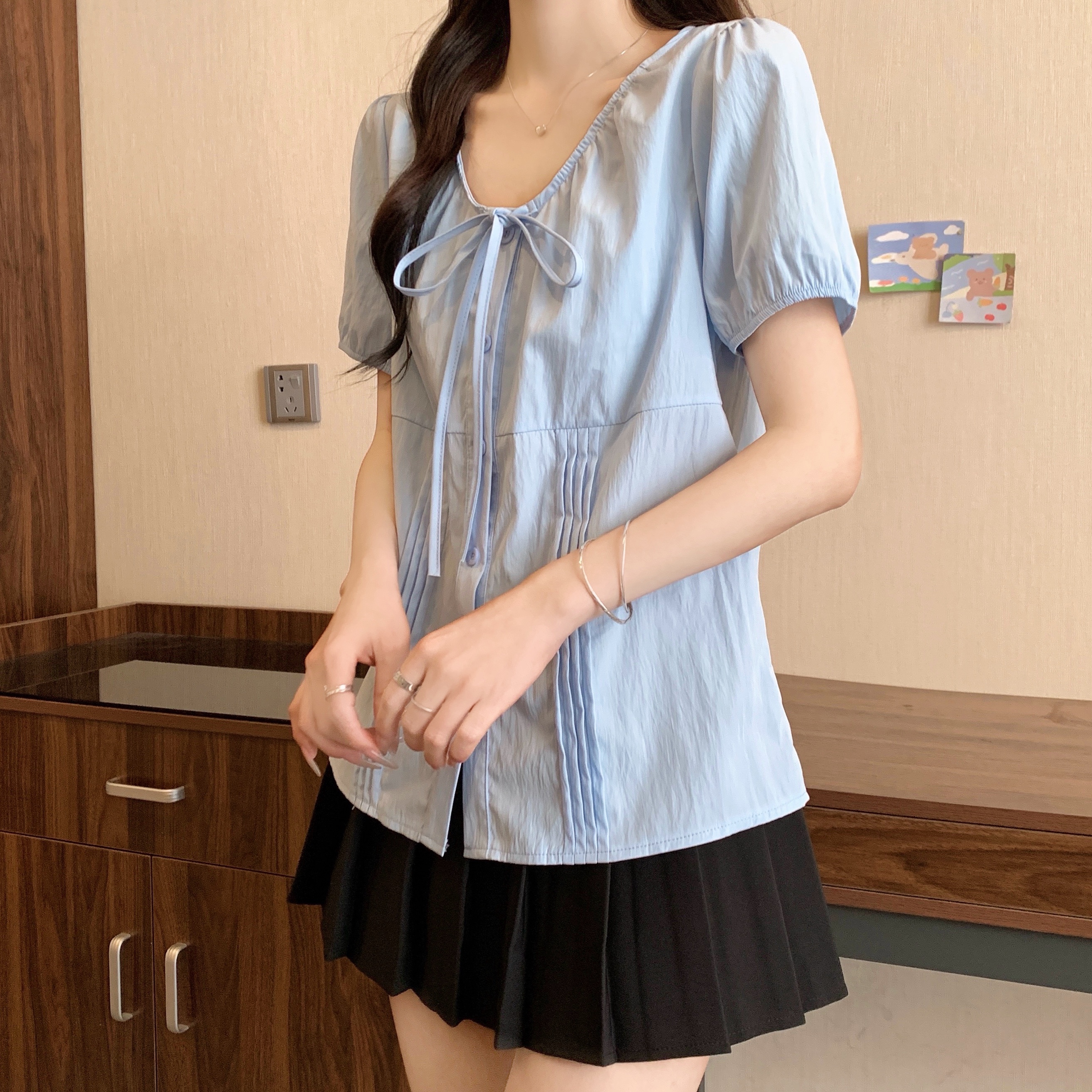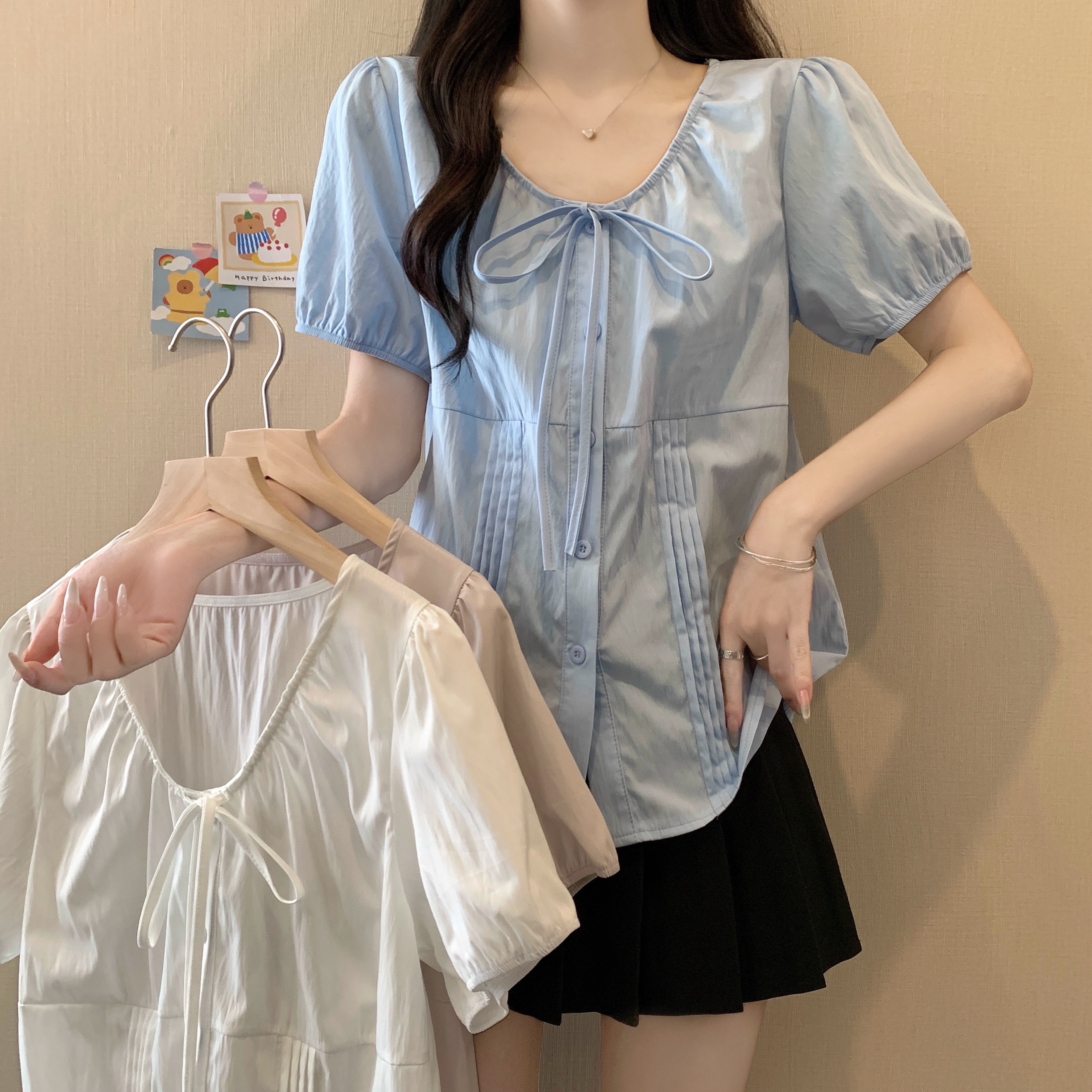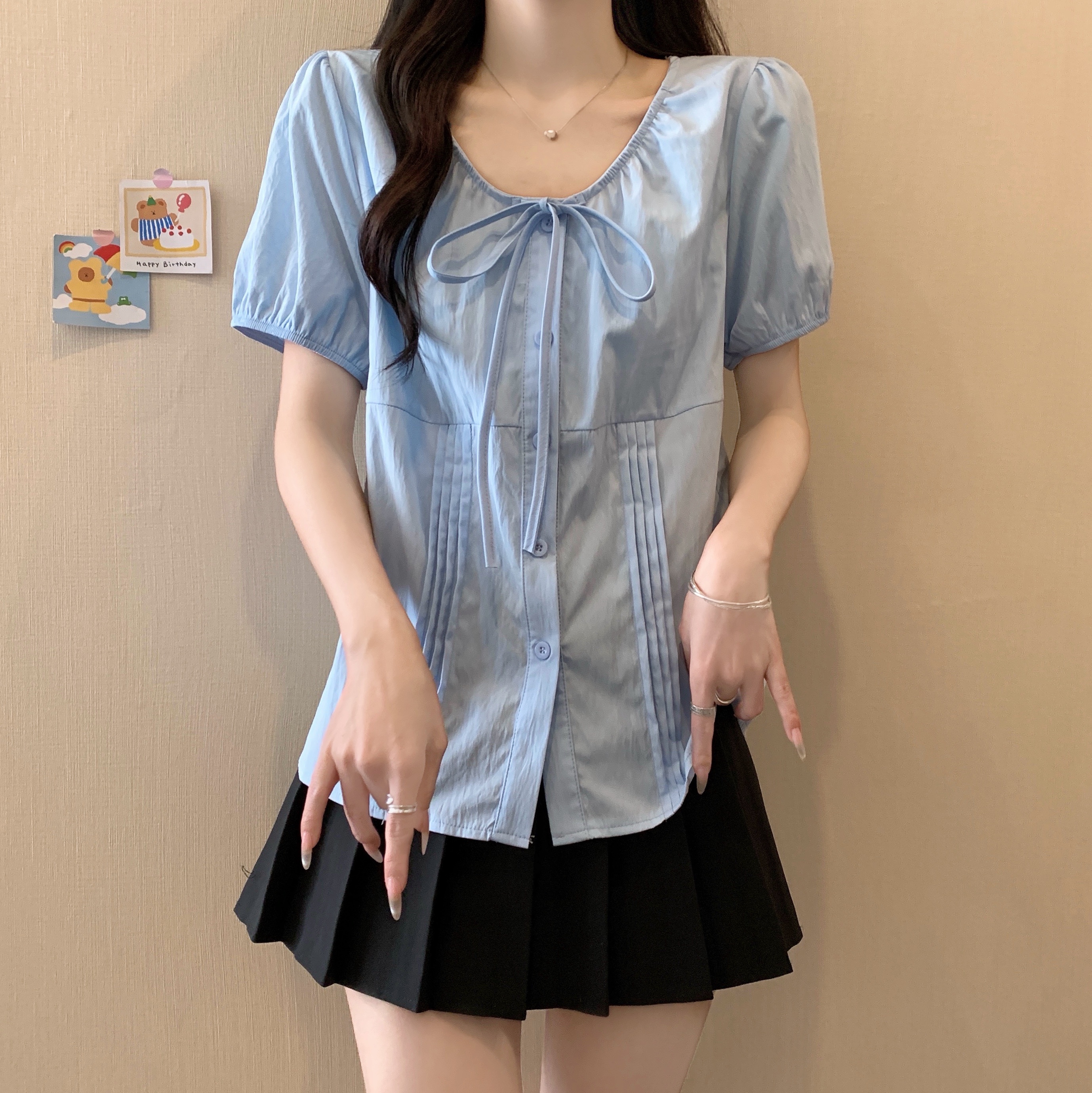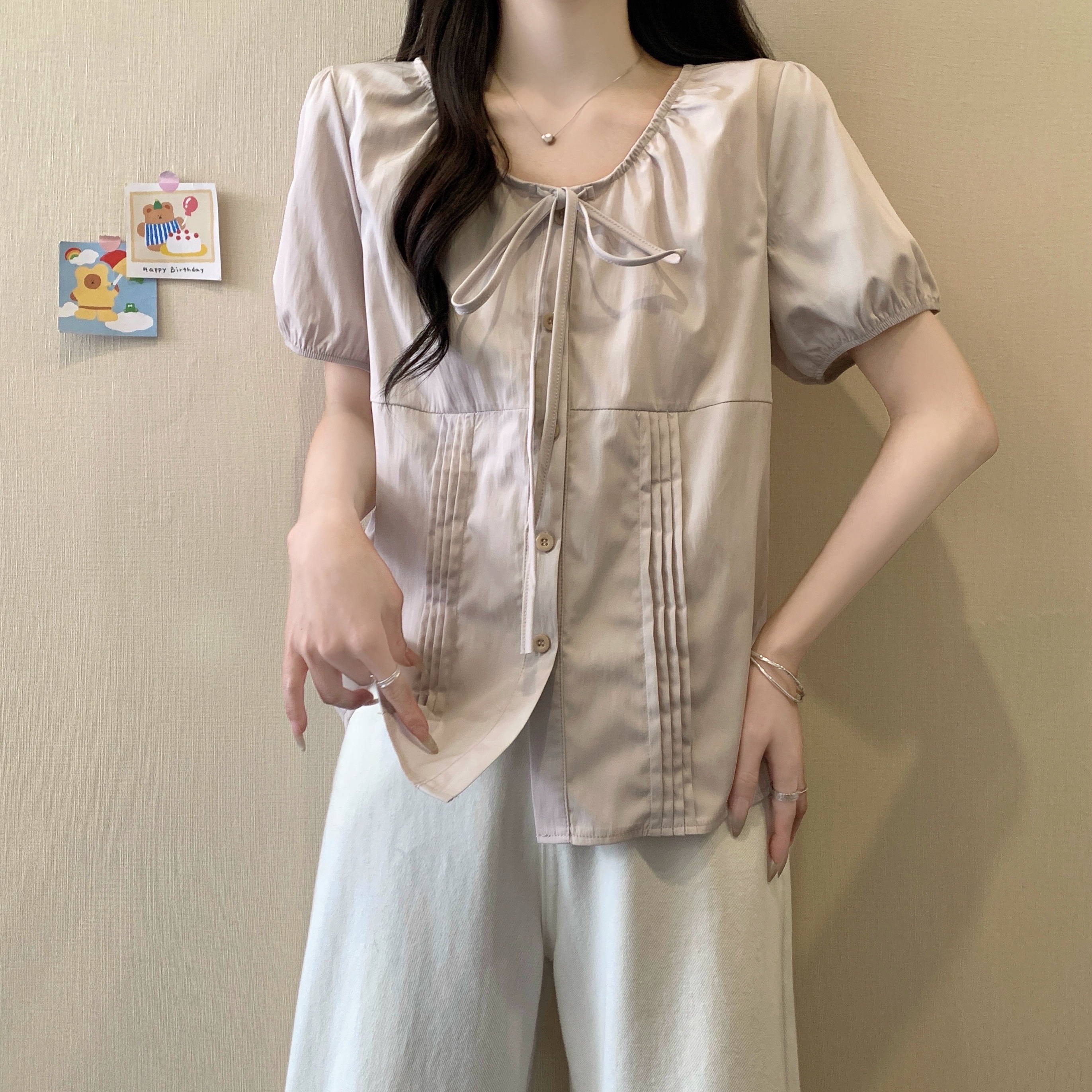 실사 정가 2026 빅 사이즈 여성 의류 새로운 디자인 센스 레이스업 플리츠 거품 소매 반팔 셔츠