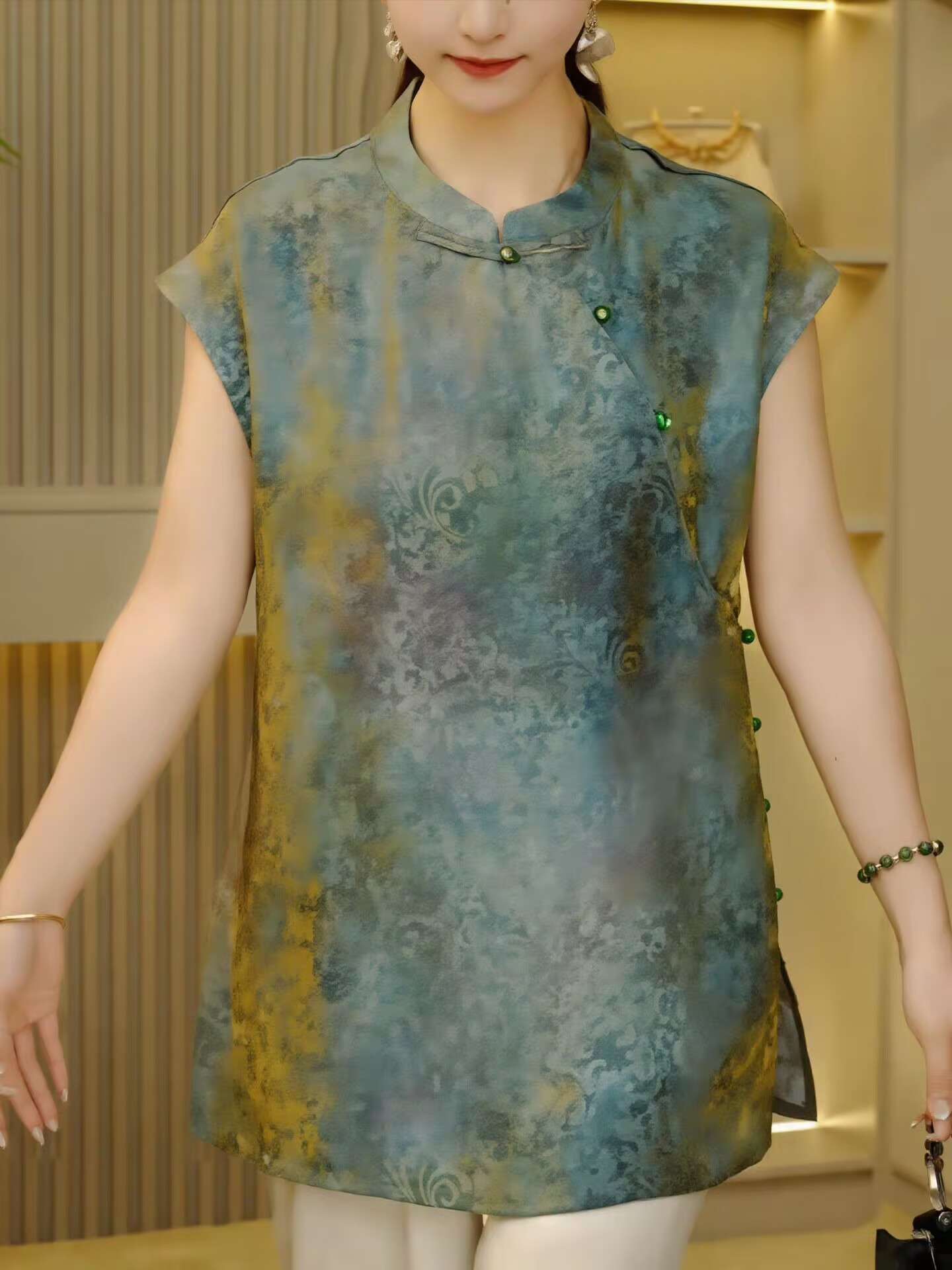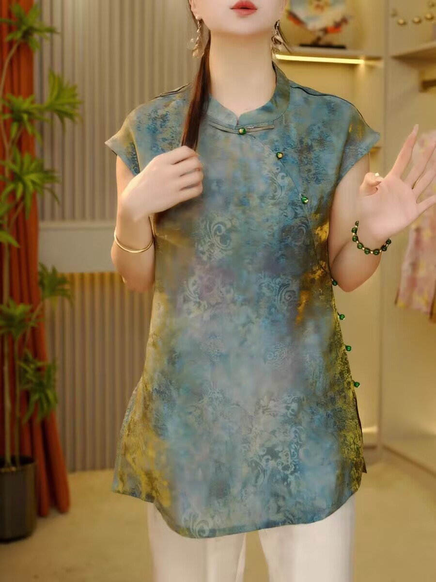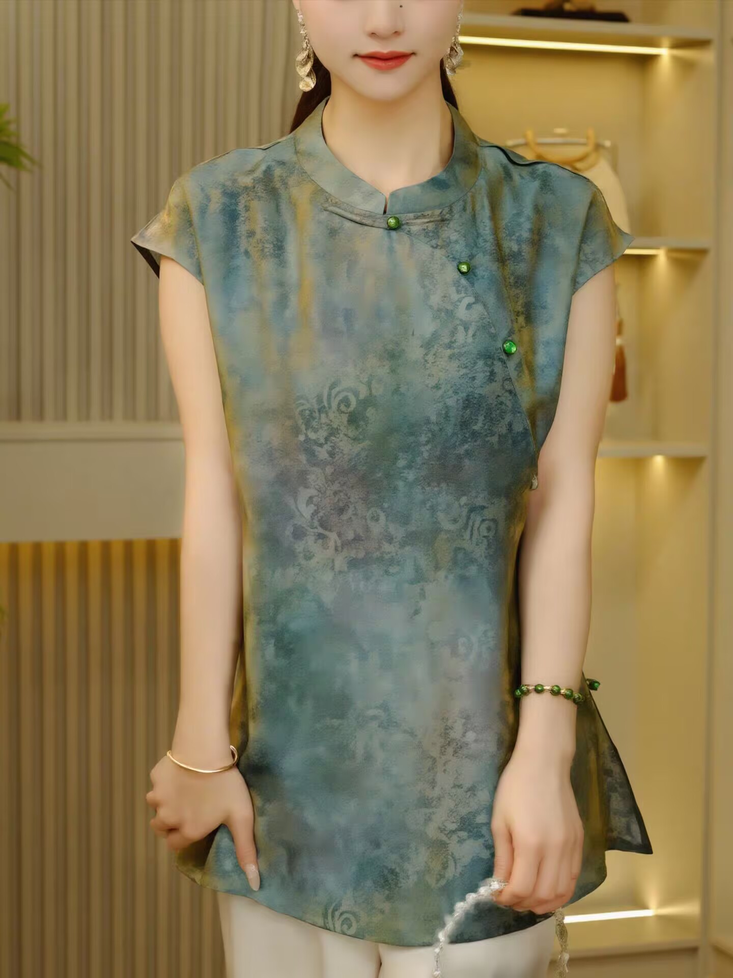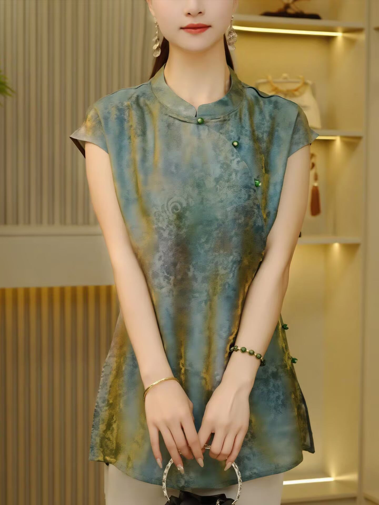 새로운 중식 국풍 스탠드 칼라 7부 소매 녹색 맨위 여성 고급 센스 작은 대중 Chic 품격 루즈핏 다용도 셔츠