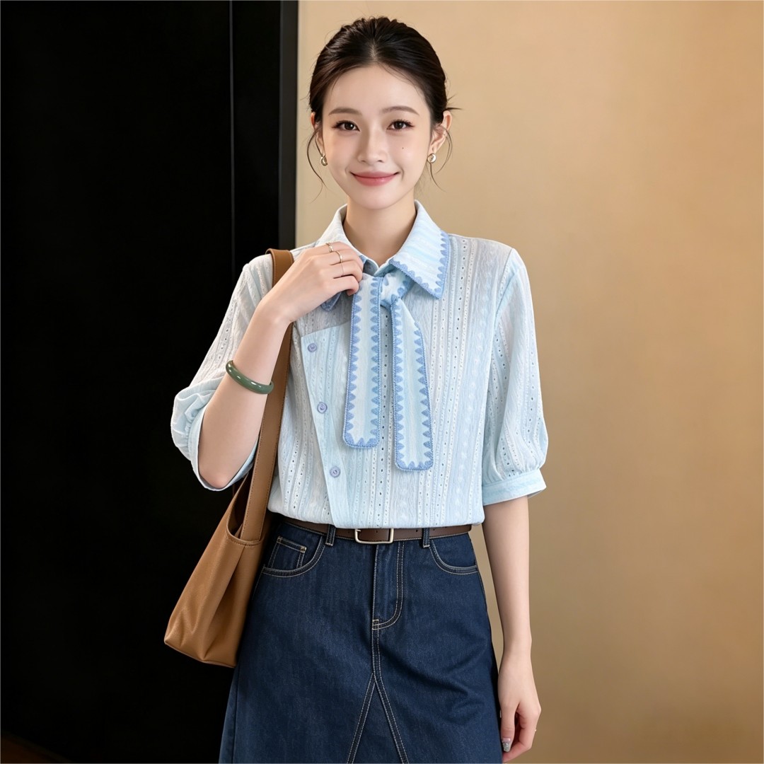 실사 프랑스식 질감 센스 리본 반팔 셔츠 여성 2026 여름 디자인 맨위 셔츠