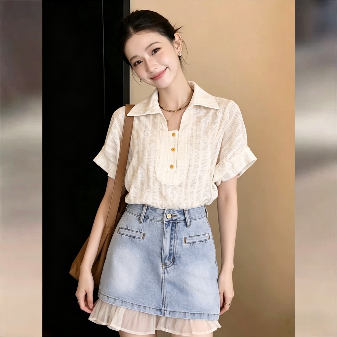 실사 프랑스식 패션 통기성 얇고 가벼운 자카드 POLO 칼라 반팔 여성 셔츠 2026 여름 다용도 맨위
