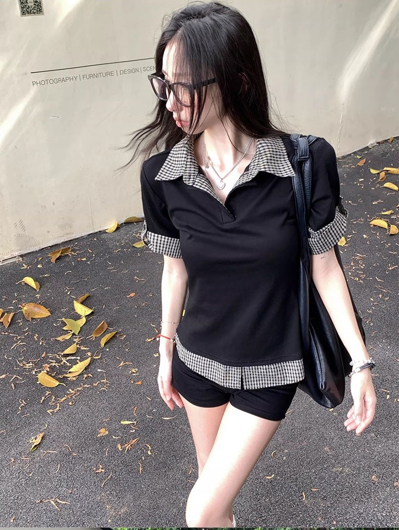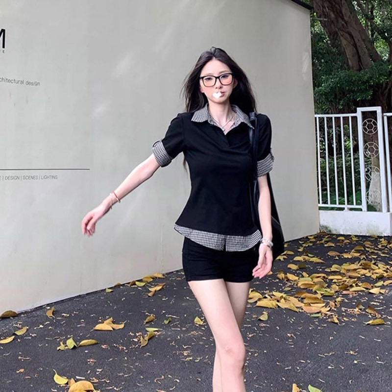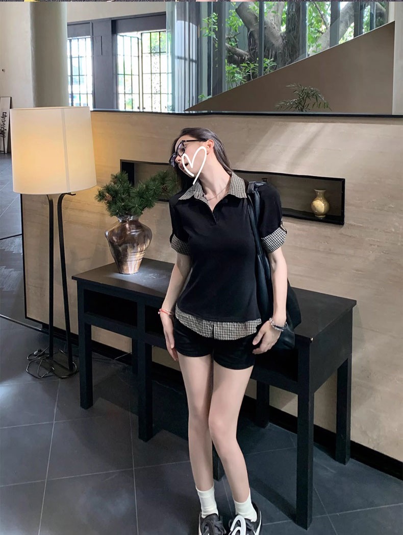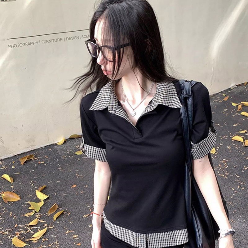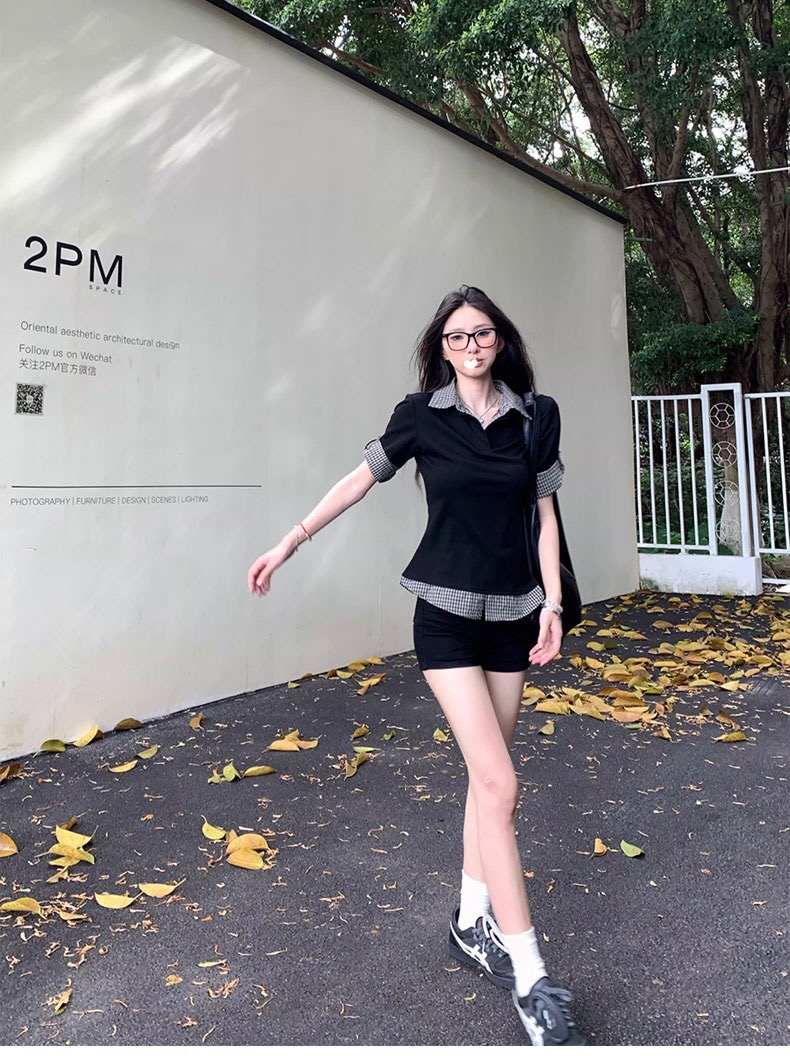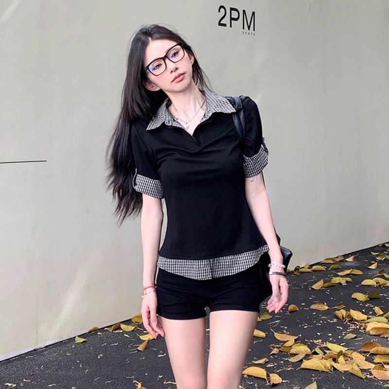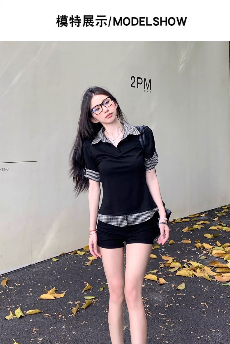 2026 여름 학원 스타일 반팔 여성 여름 배색 체크무늬 페이크 레이어드 몸매 가꾸기 티셔츠 달콤한 매운맛 맨위 트렌디 스웨터