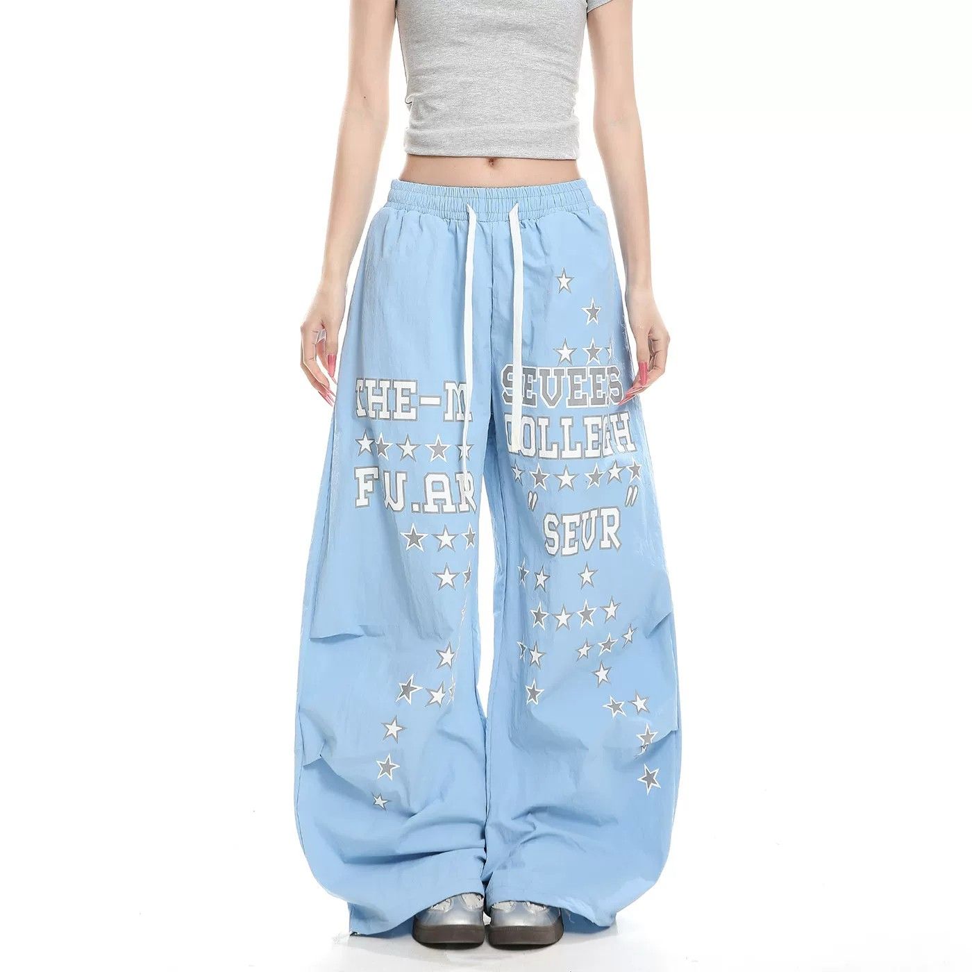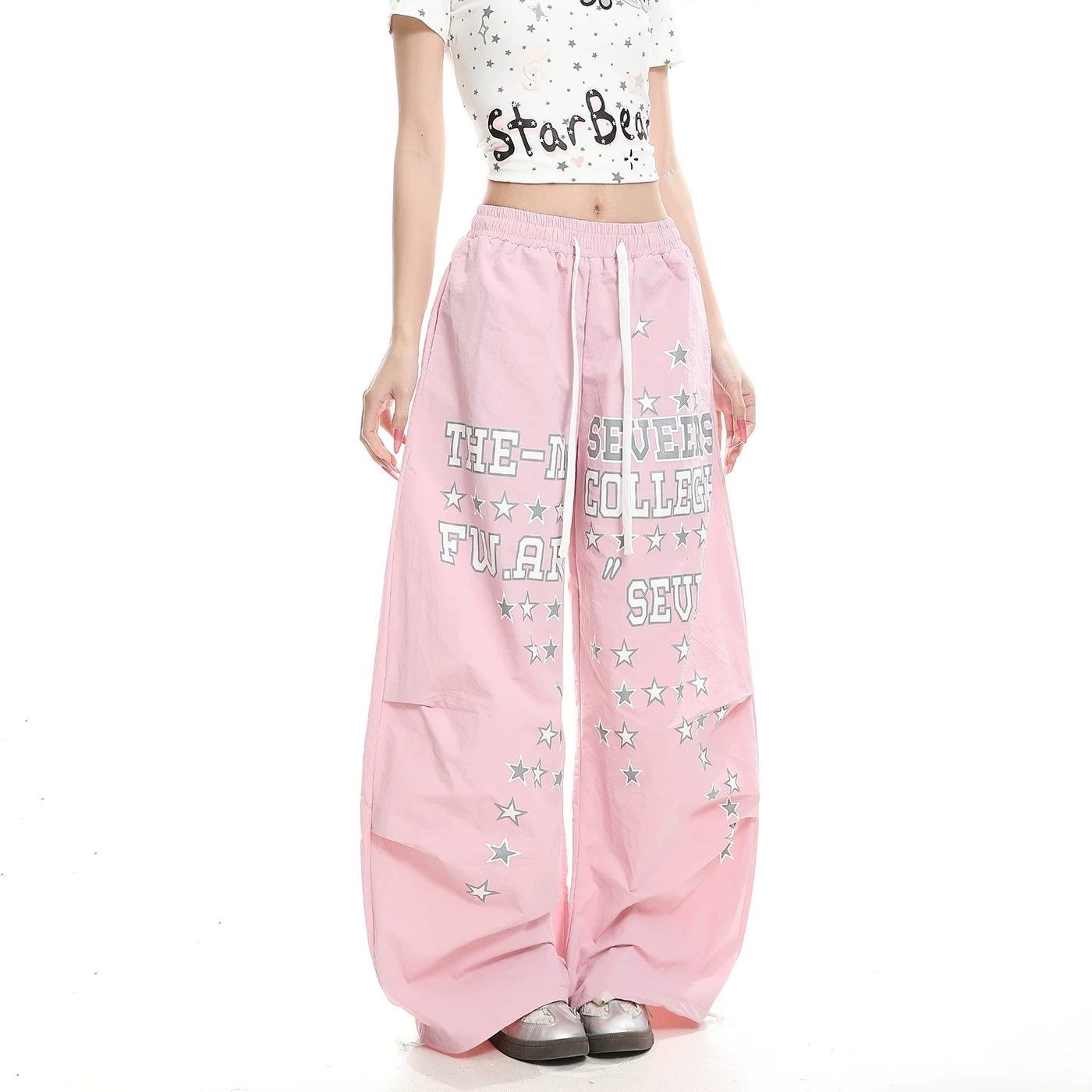 아메리칸 레트로 거리 바람 별 알파벳 프린트 와이드 레깅스 바지 봄 루즈핏 레이스업 작은 대중 디자인 모통이 칼 바지