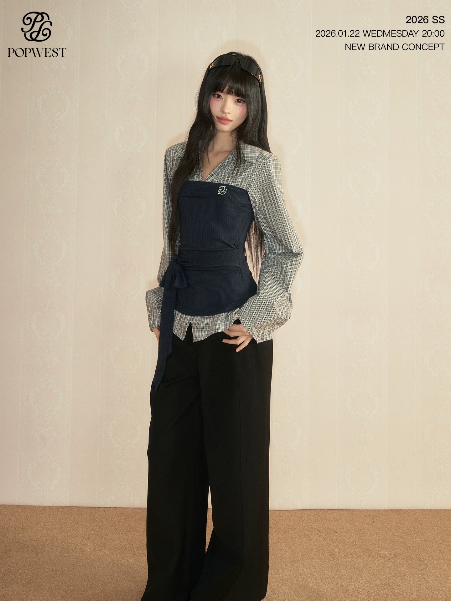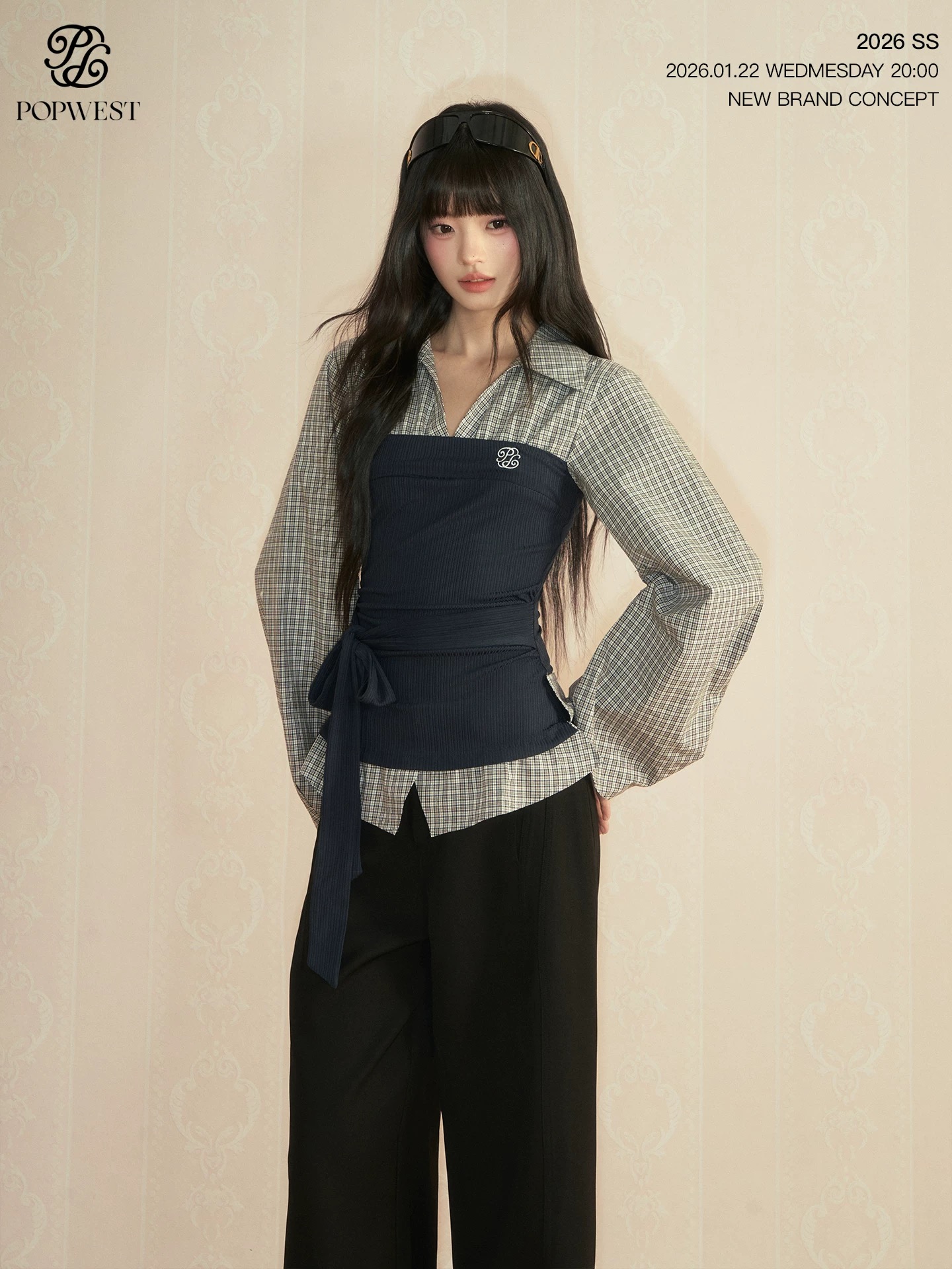 popwest 丨 패치워크 페이크 레이어드 셔츠 작은 대중 배색 셔츠 허리 수축 긴팔 맨위 와이드 레그 팬츠 세트 여성